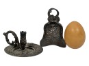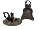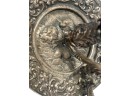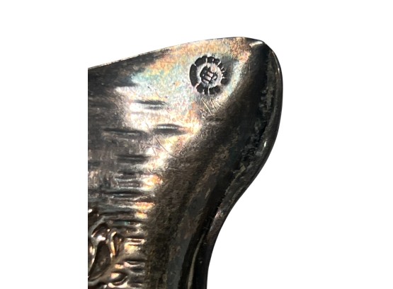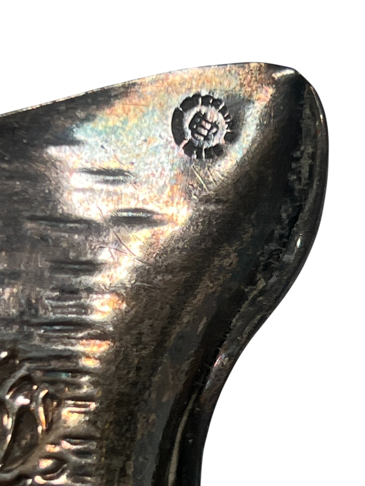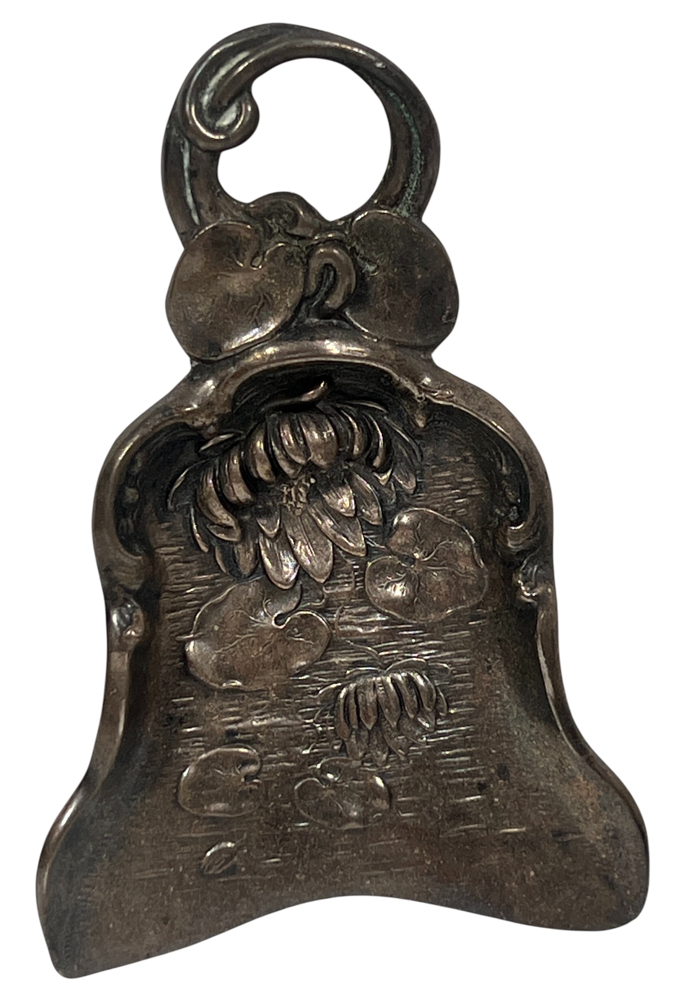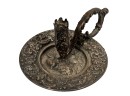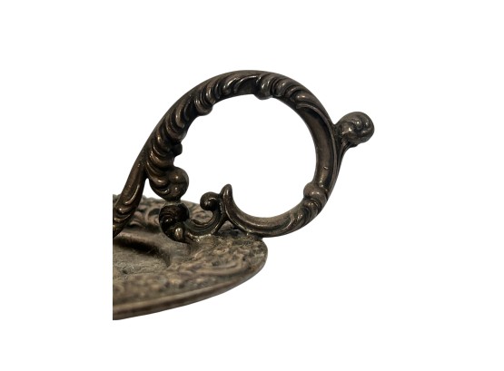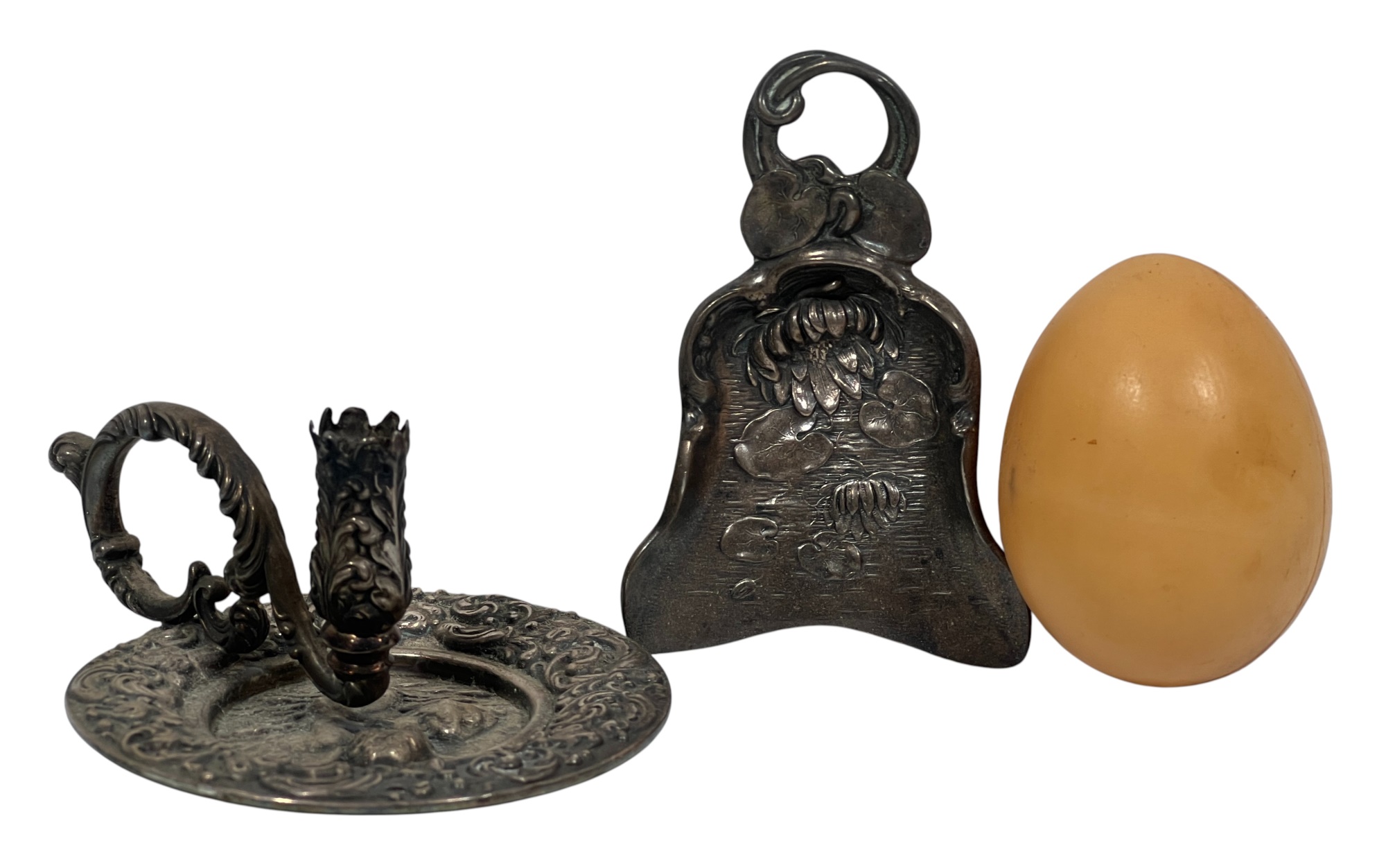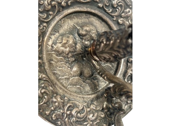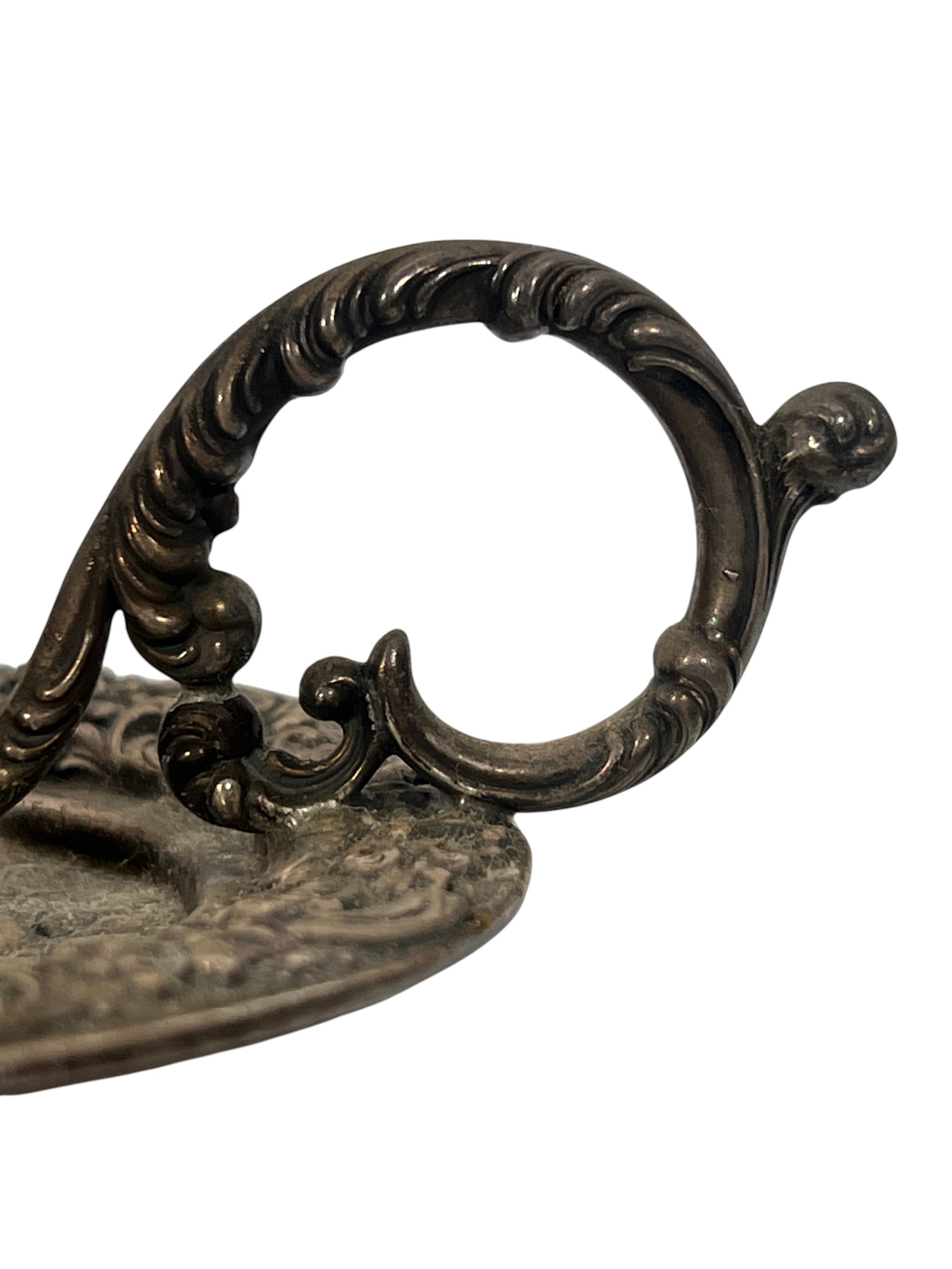 Miniature Art Nouveau sterling crumb tray with lotus motif and chamberstick with cherubs. 1 1/4 x 3 inches. 1.16 ozt. Condition: Good. Temp No 8590