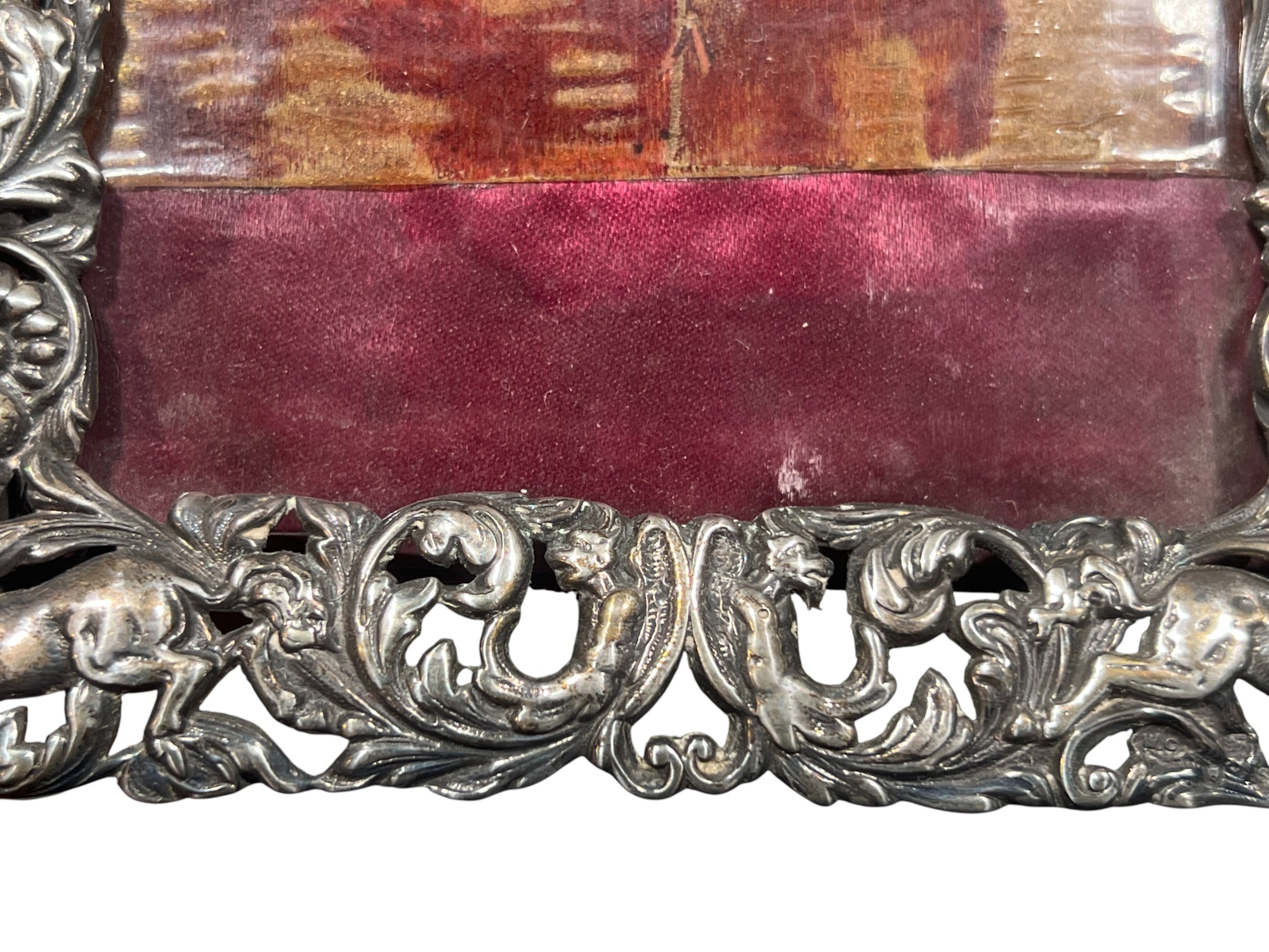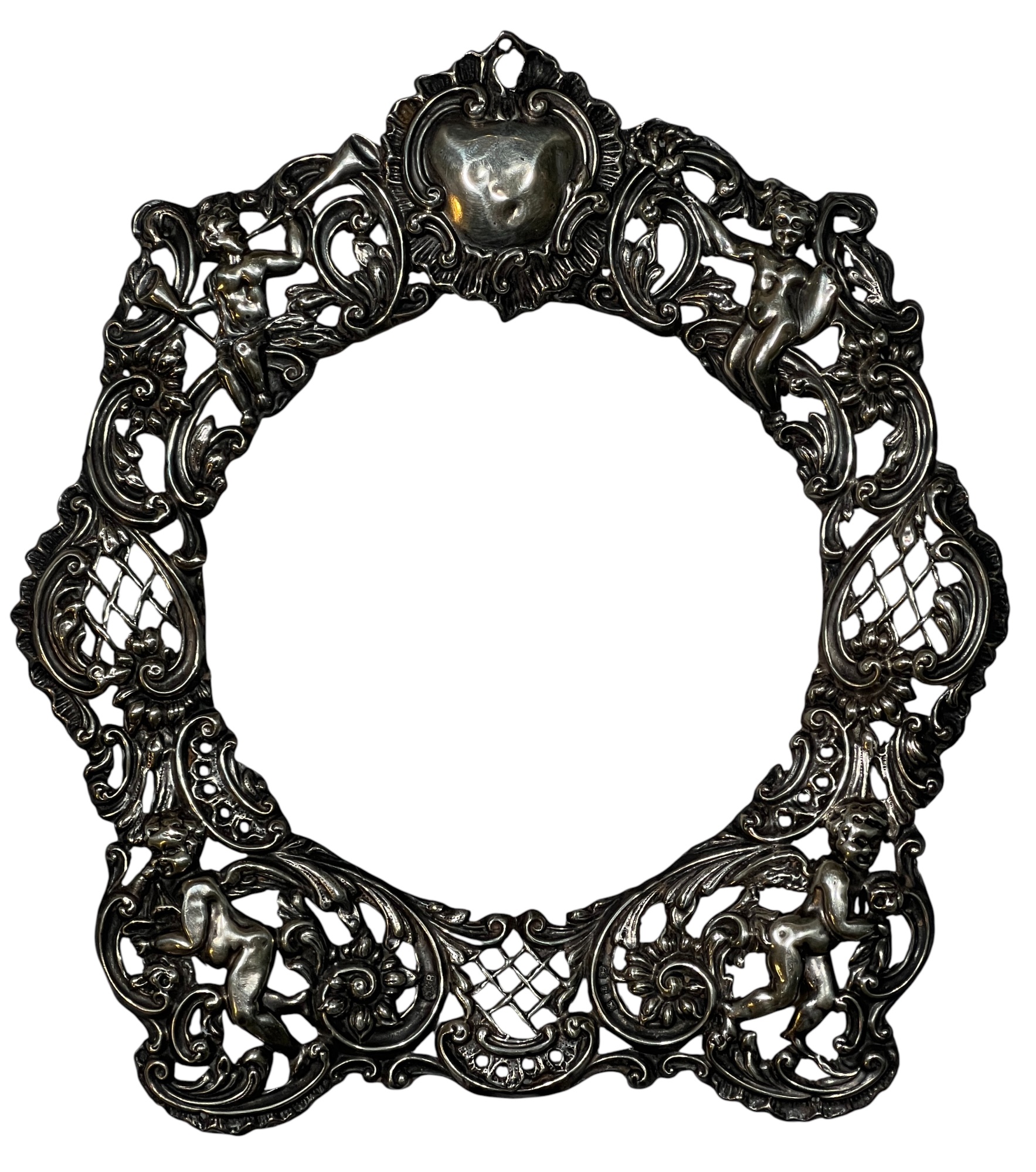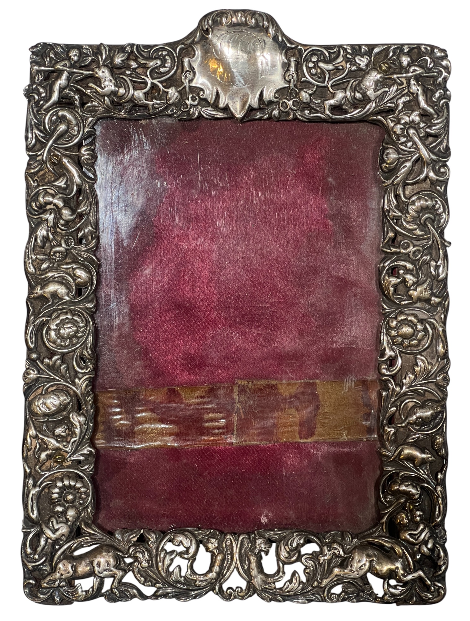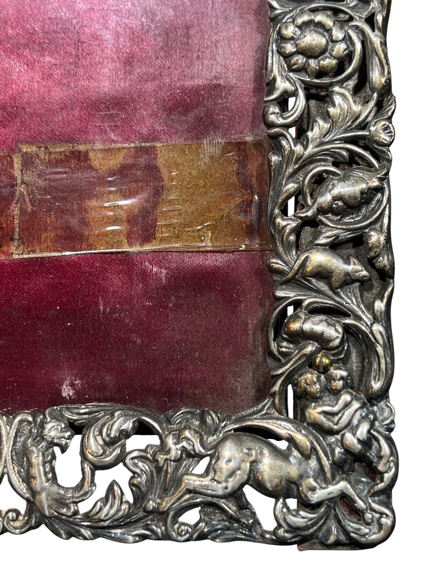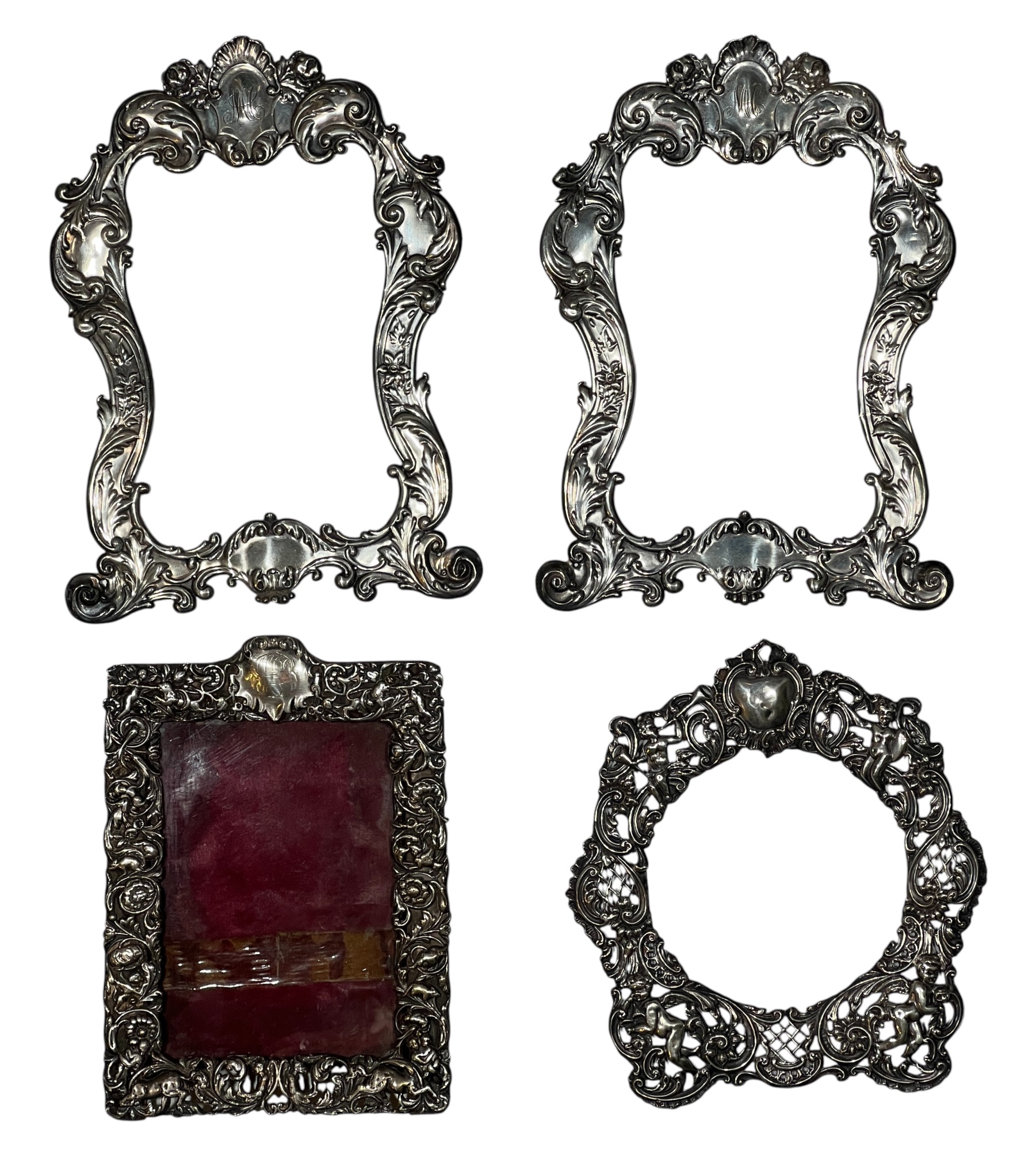 A beautiful Art Nouveau sterling picture frame with hidden figures including centaurs, harpy, cherubs, squirrel, and lion hunter. Along with (3) Art Nouveau sterling mirror/frame covers including a pair. 8 1/4 x 6 inches. 2.75 ozt weighable silver.