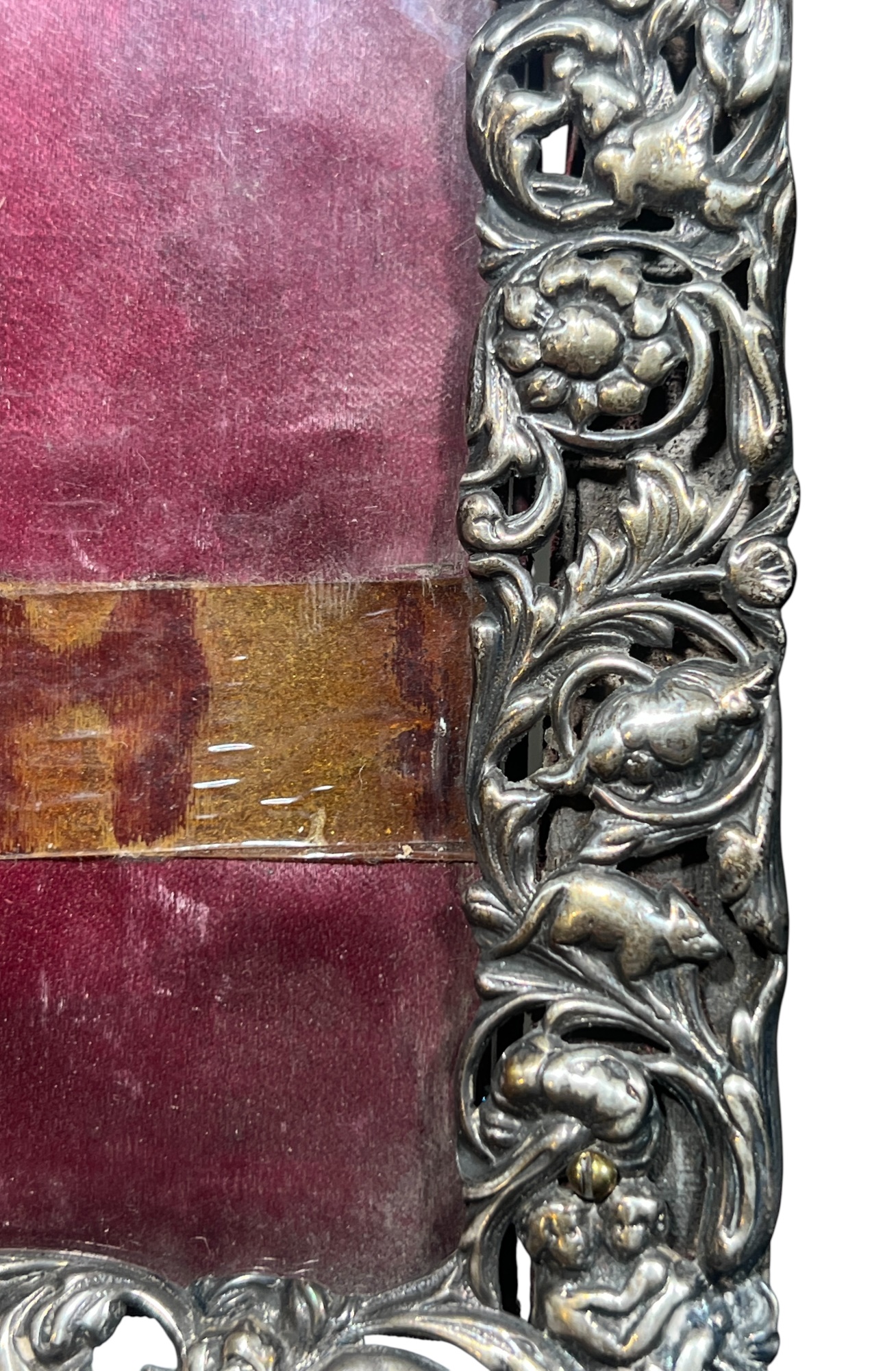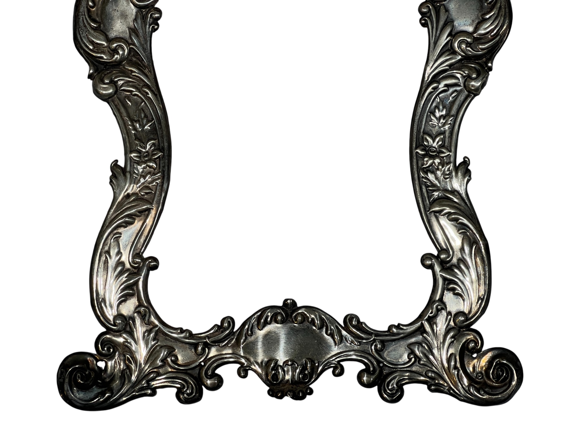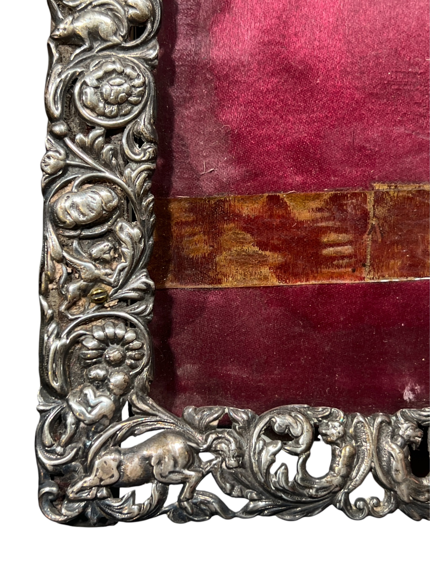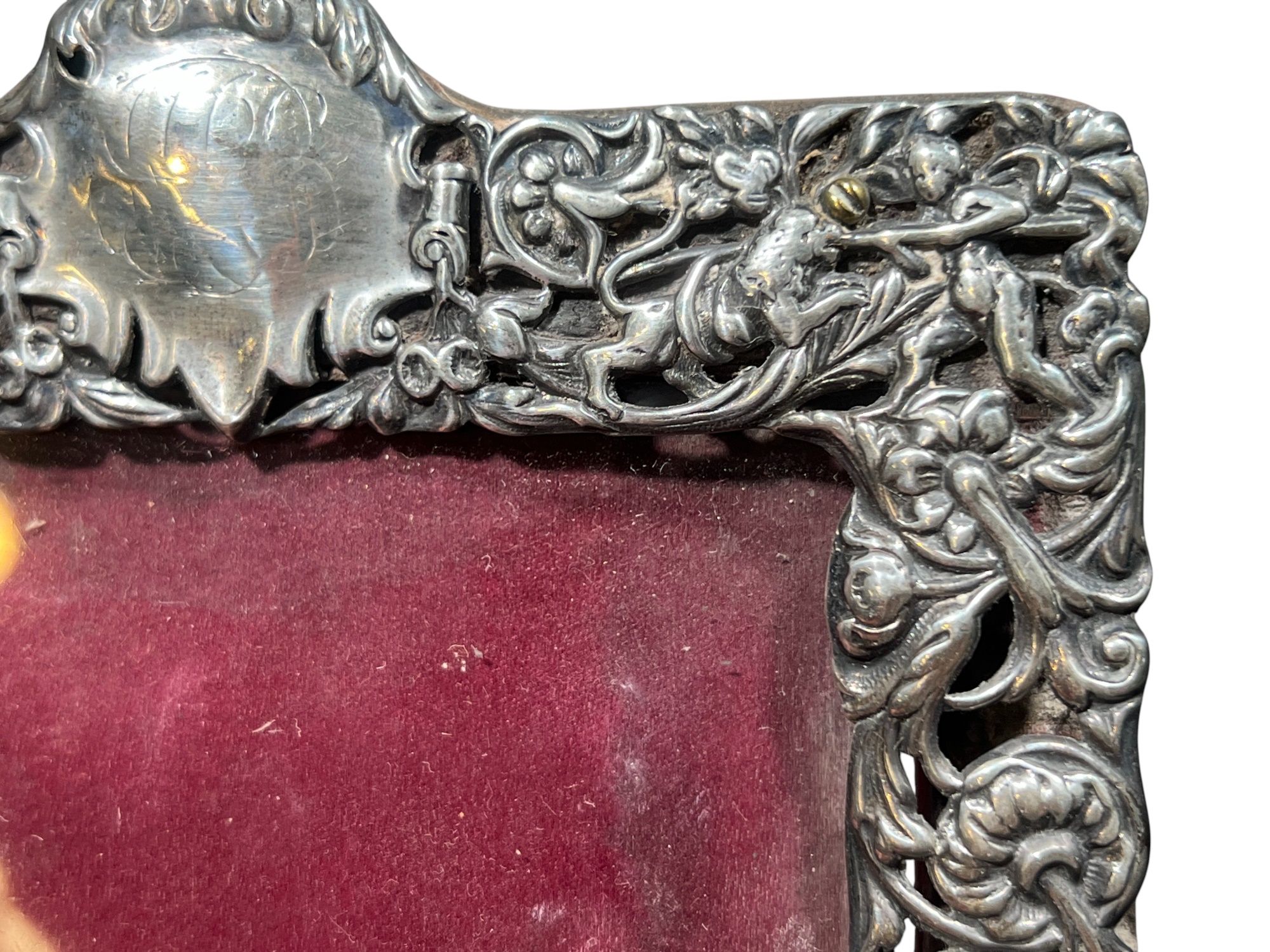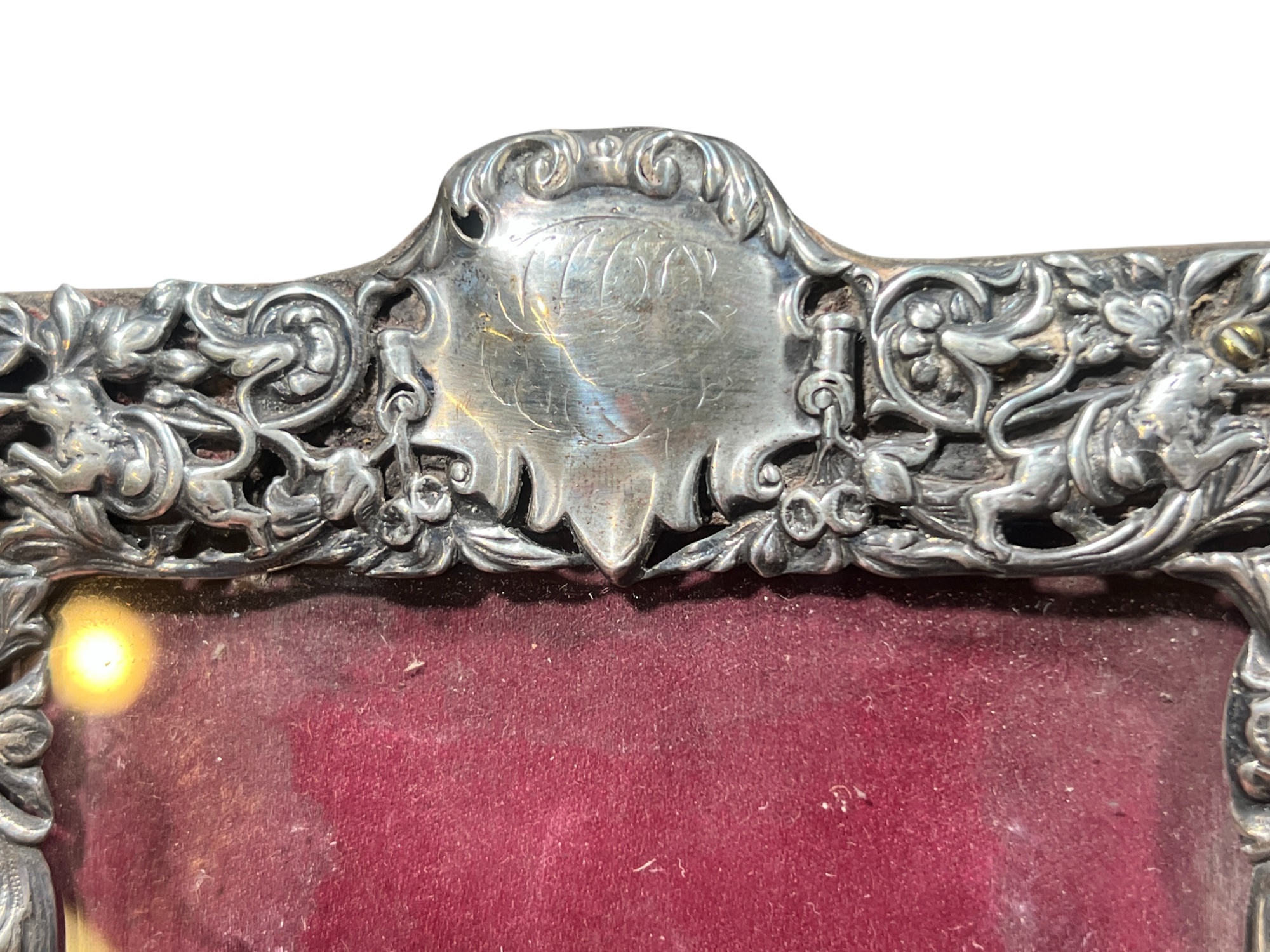 A beautiful Art Nouveau sterling picture frame with hidden figures including centaurs, harpy, cherubs, squirrel, and lion hunter. Along with (3) Art Nouveau sterling mirror/frame covers including a pair. 8 1/4 x 6 inches. 2.75 ozt weighable silver.