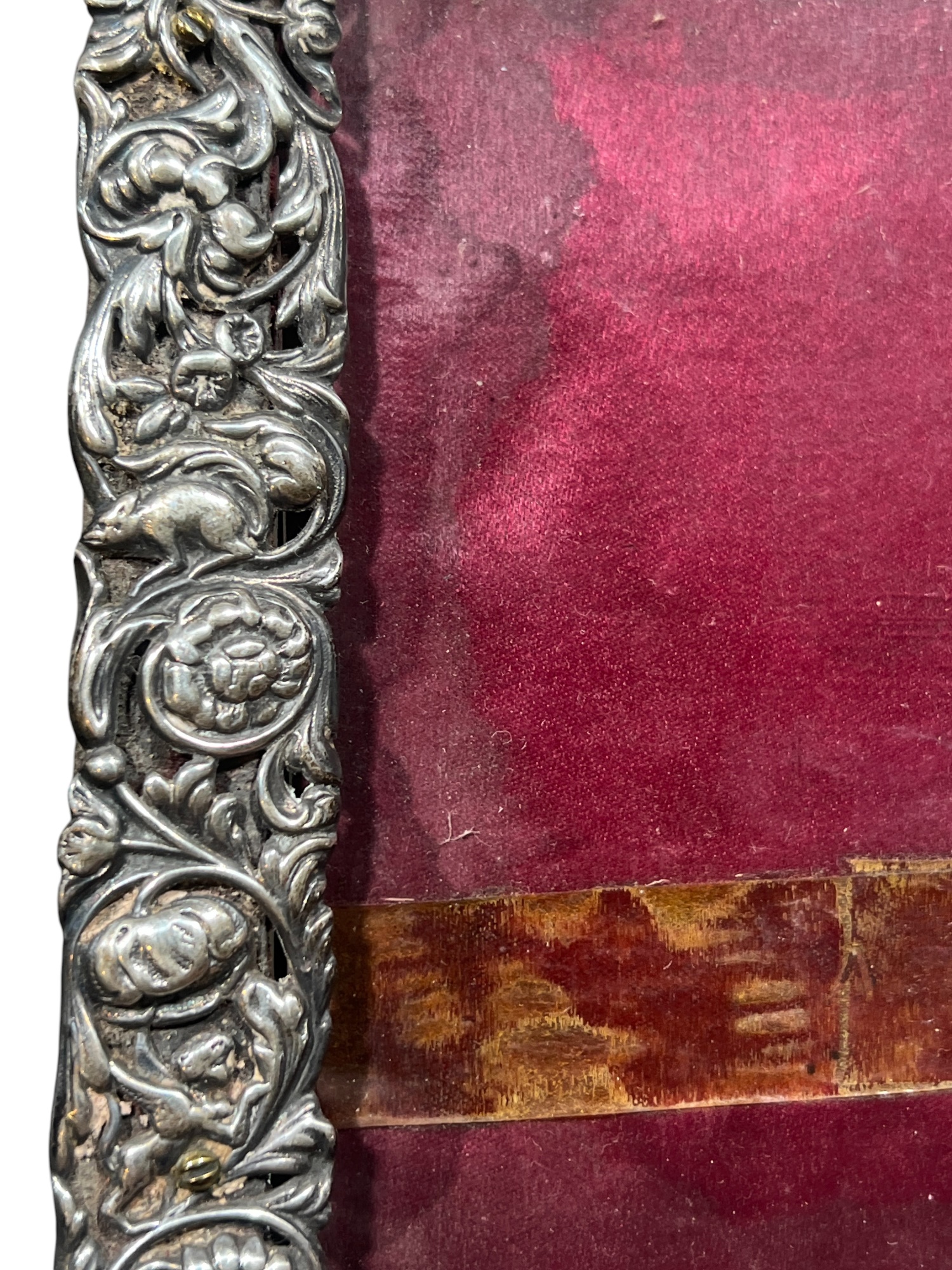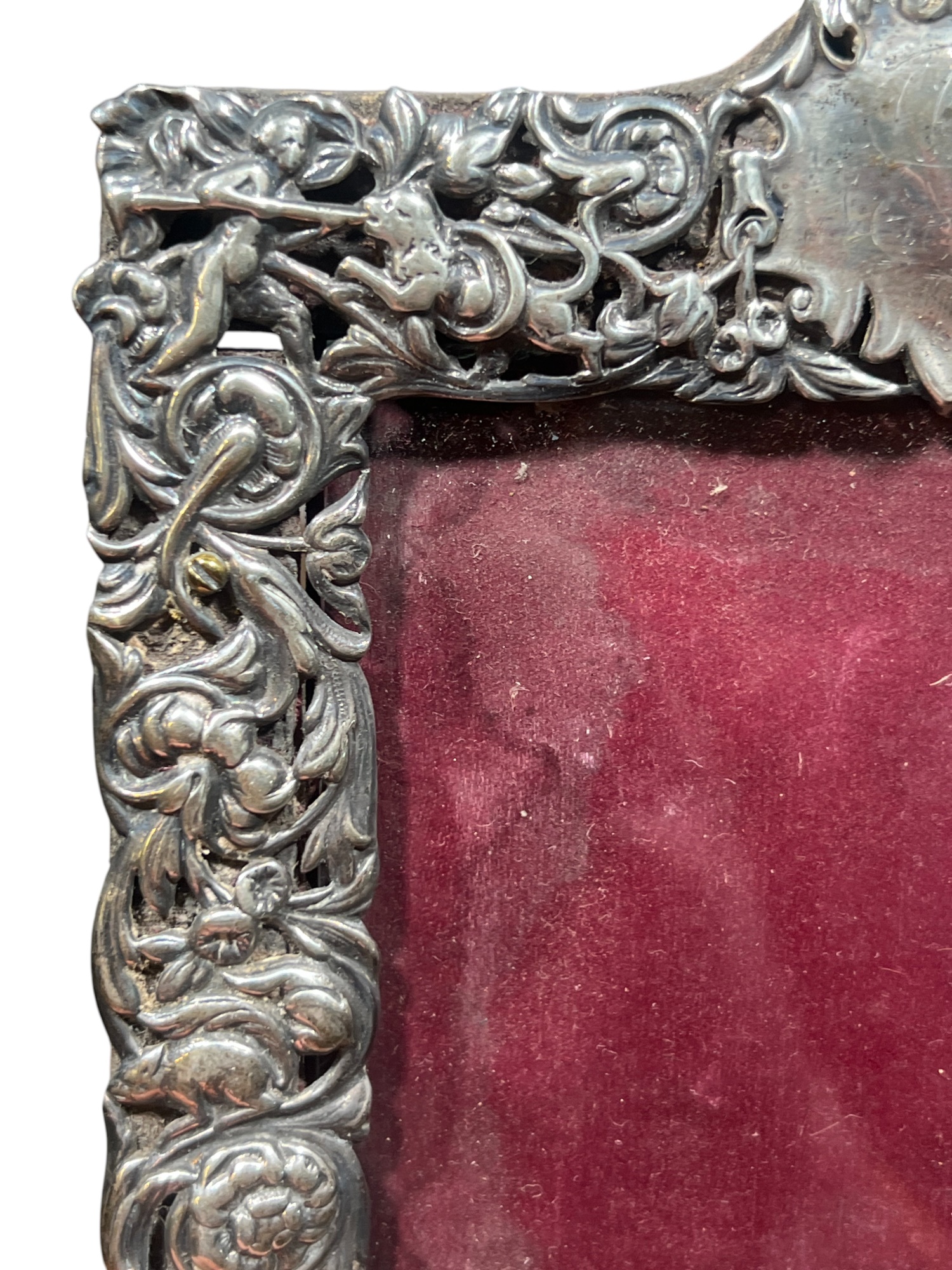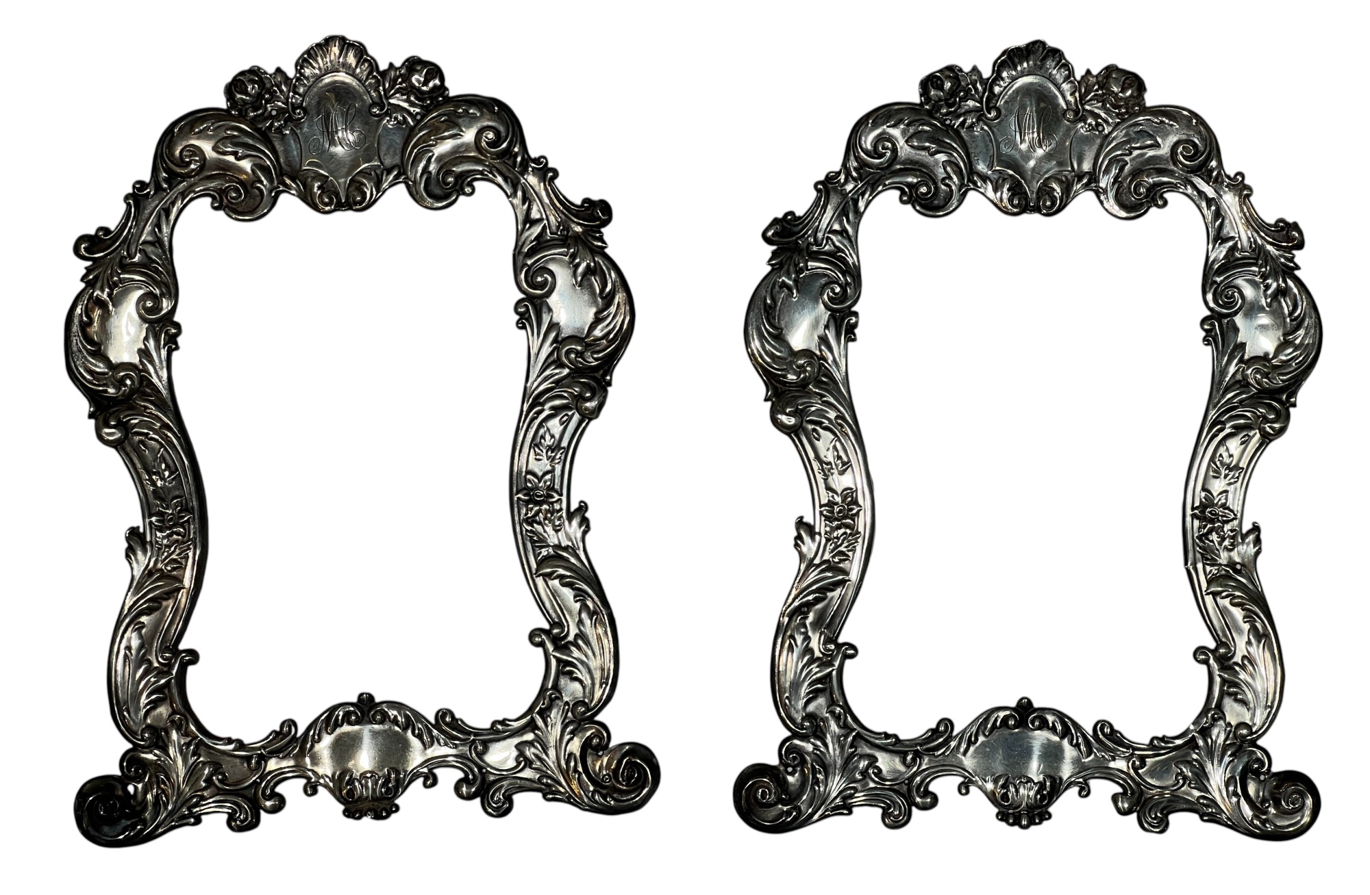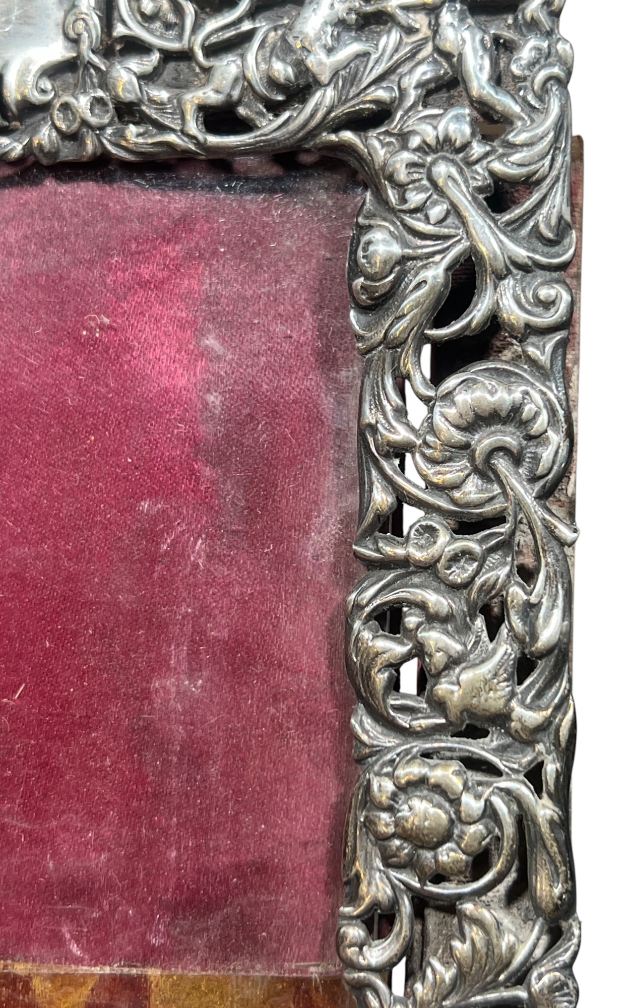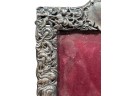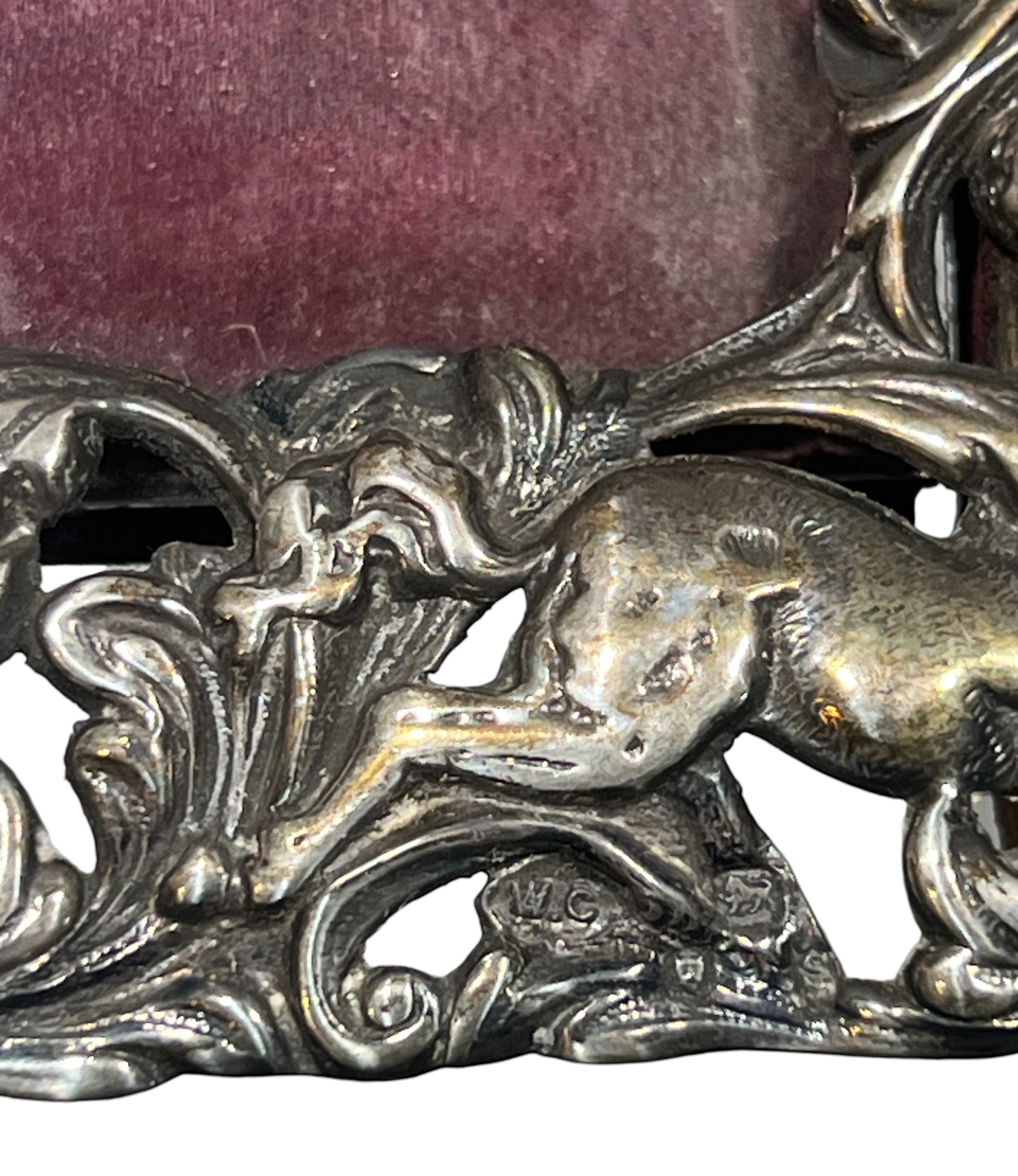 A beautiful Art Nouveau sterling picture frame with hidden figures including centaurs, harpy, cherubs, squirrel, and lion hunter. Along with (3) Art Nouveau sterling mirror/frame covers including a pair. 8 1/4 x 6 inches. 2.75 ozt weighable silver.