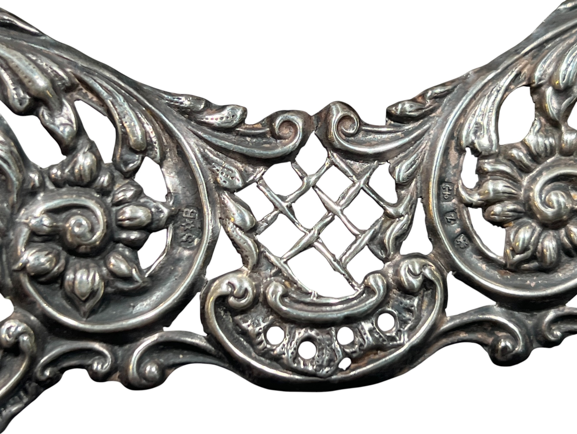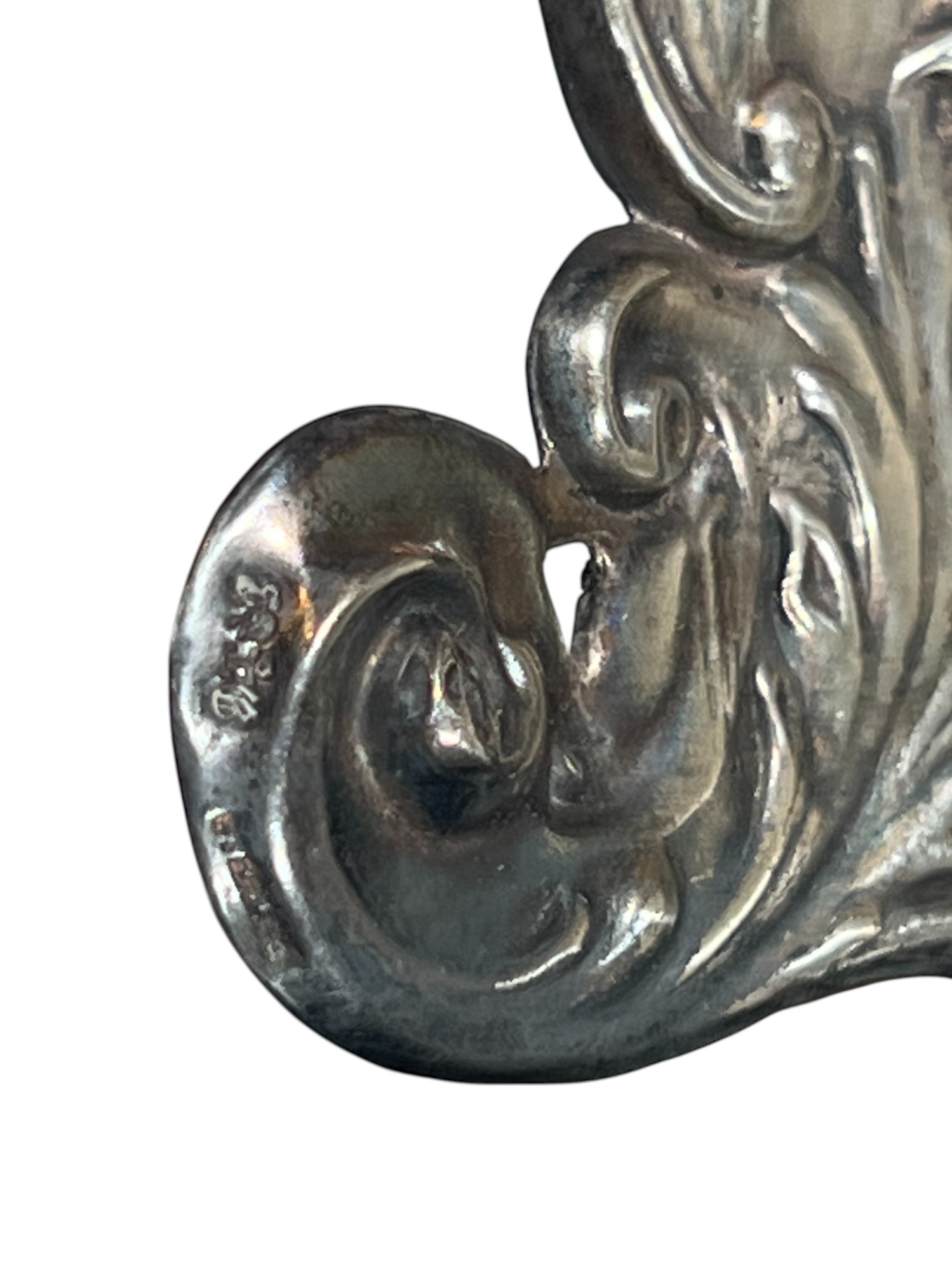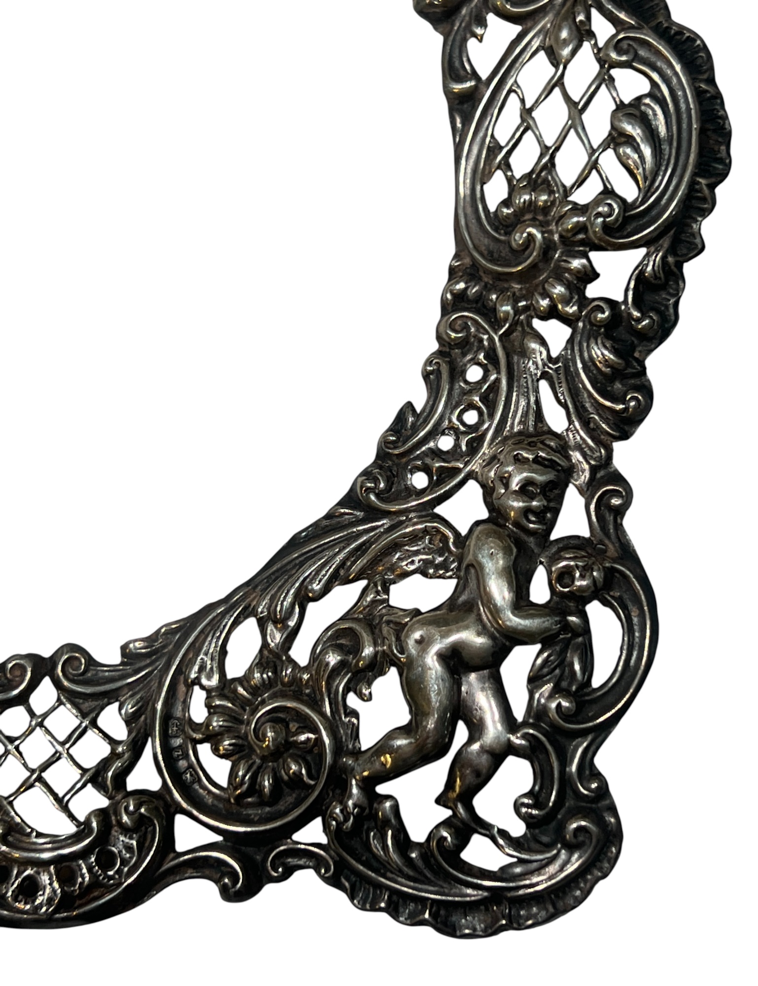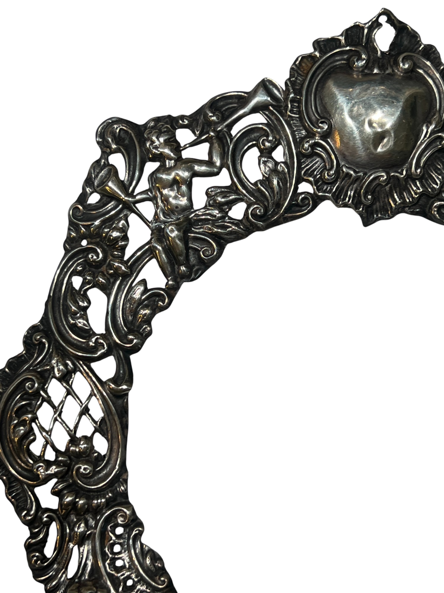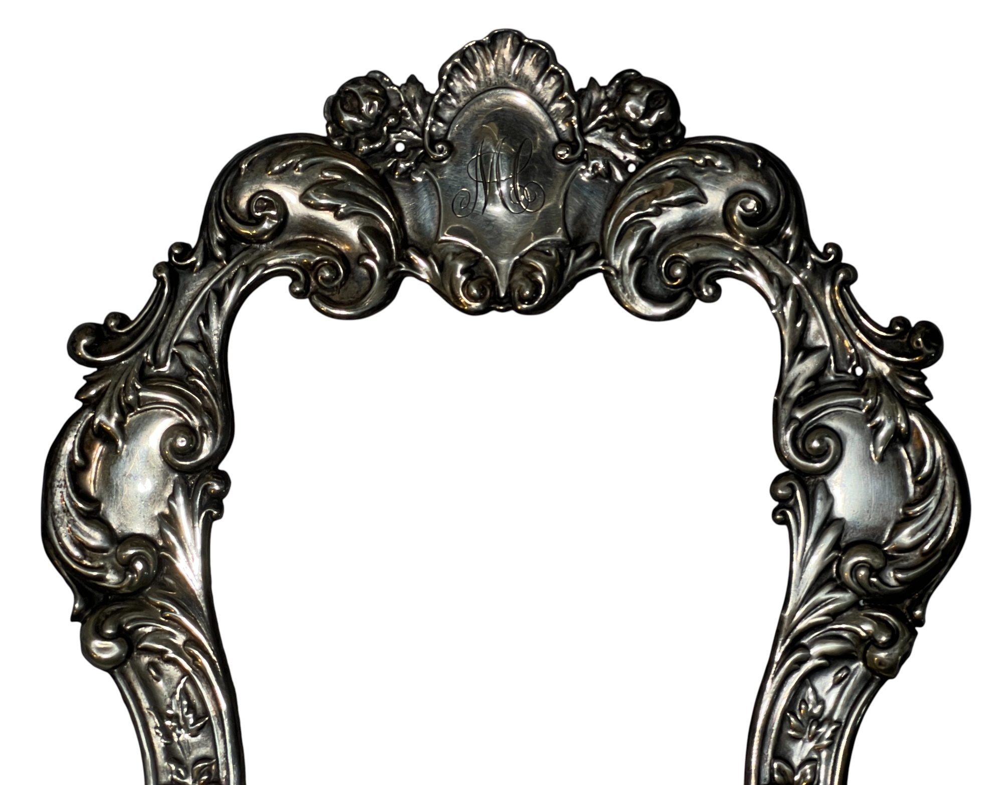 A beautiful Art Nouveau sterling picture frame with hidden figures including centaurs, harpy, cherubs, squirrel, and lion hunter. Along with (3) Art Nouveau sterling mirror/frame covers including a pair. 8 1/4 x 6 inches. 2.75 ozt weighable silver.