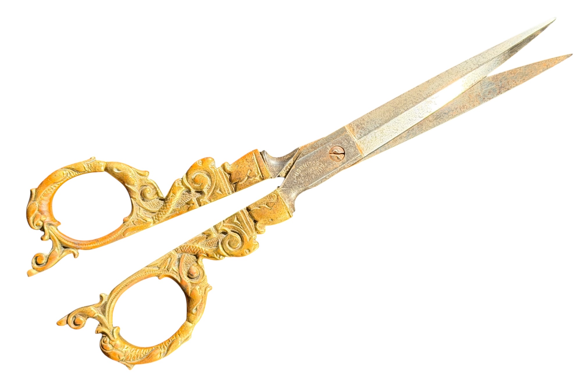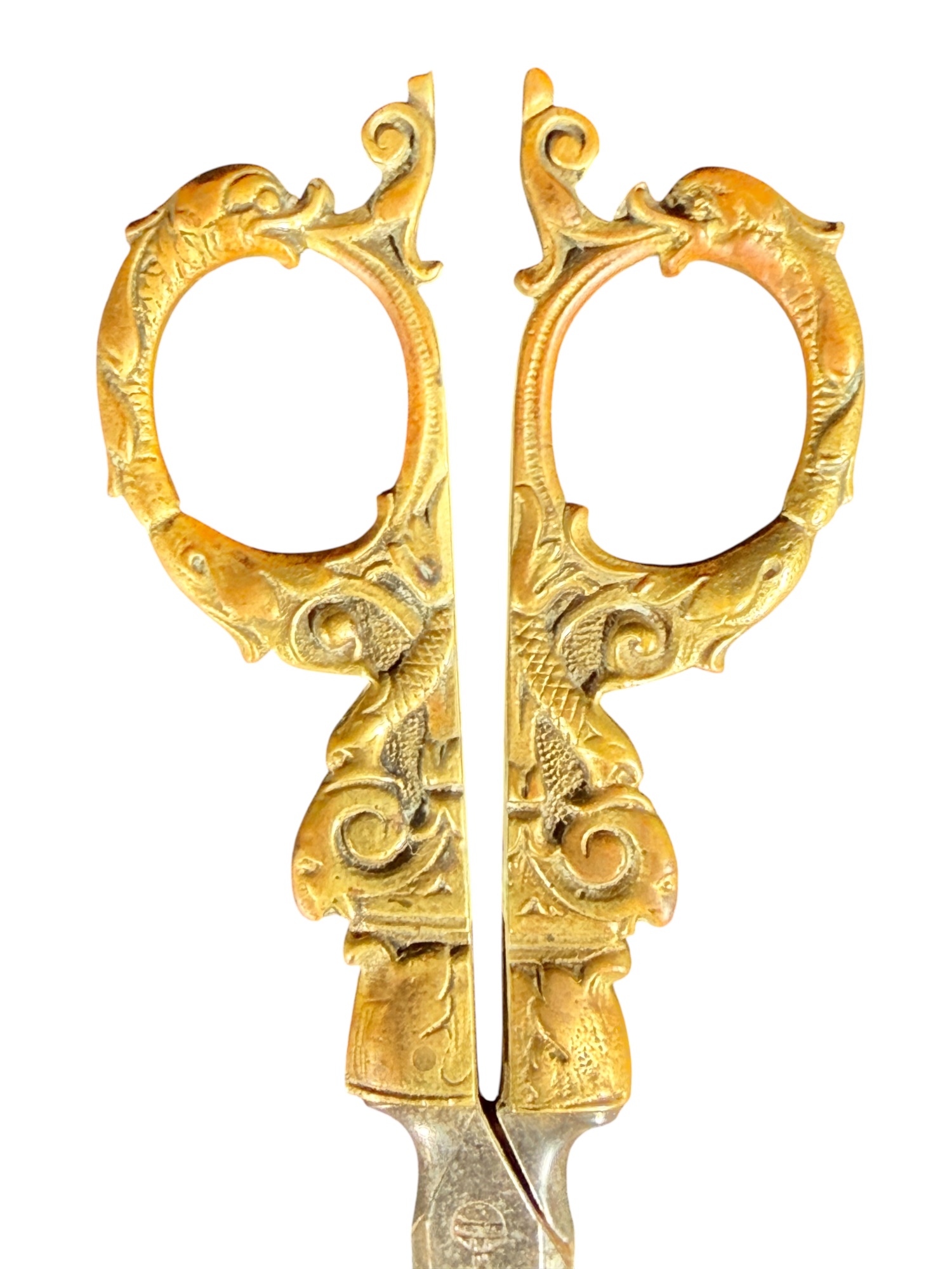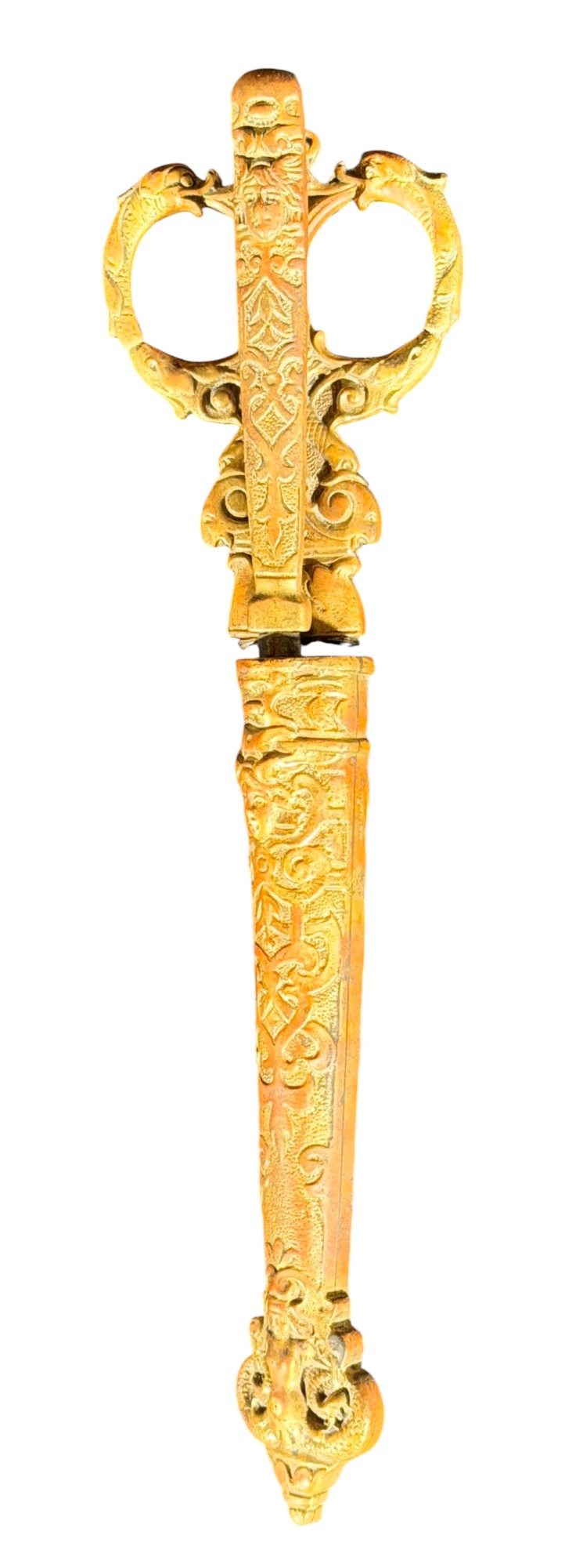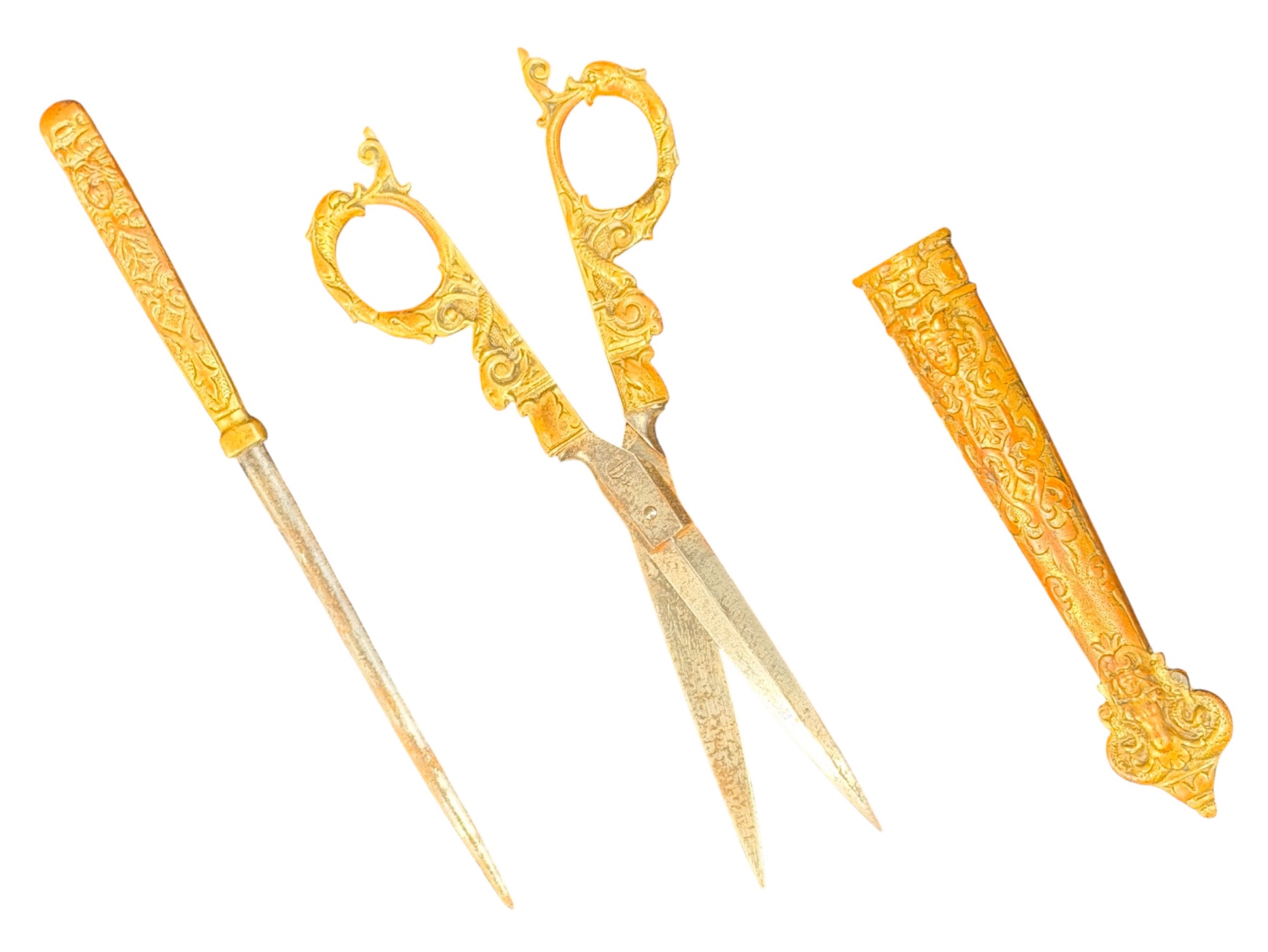 August Knecht brass & steel scissor set including letter opener & sheath, finely cast with Renaissance motifs including dolphins, mermaid, rams heads, and mascarons. 9 1/2 inches. Condition: Blades slightly warped.
