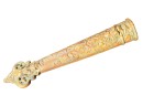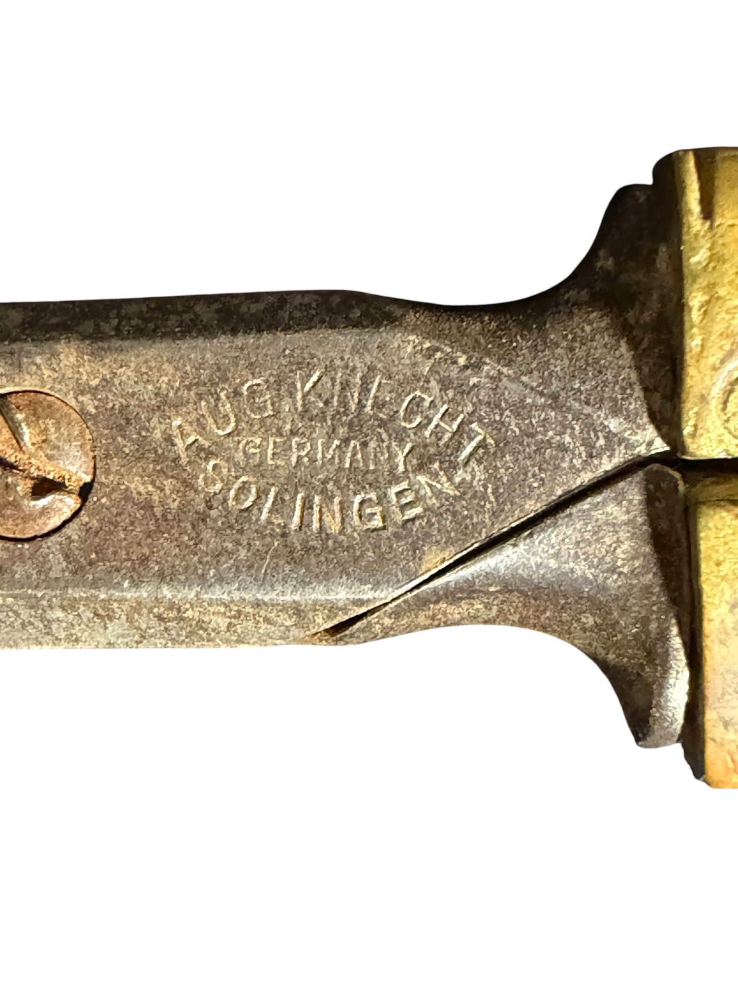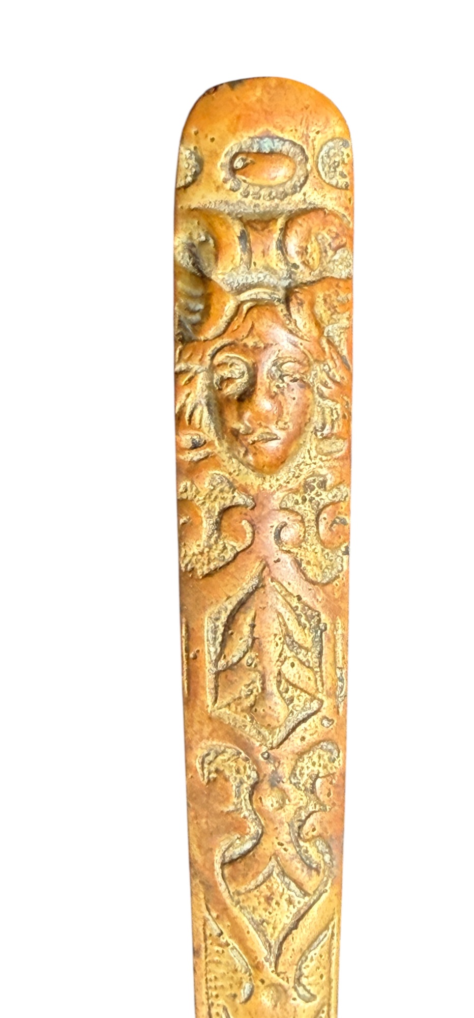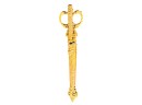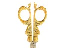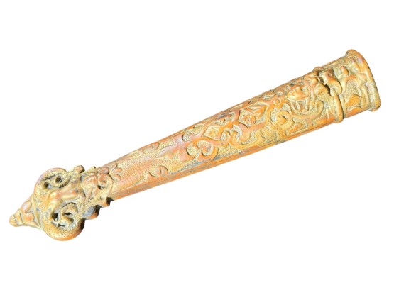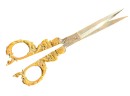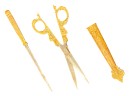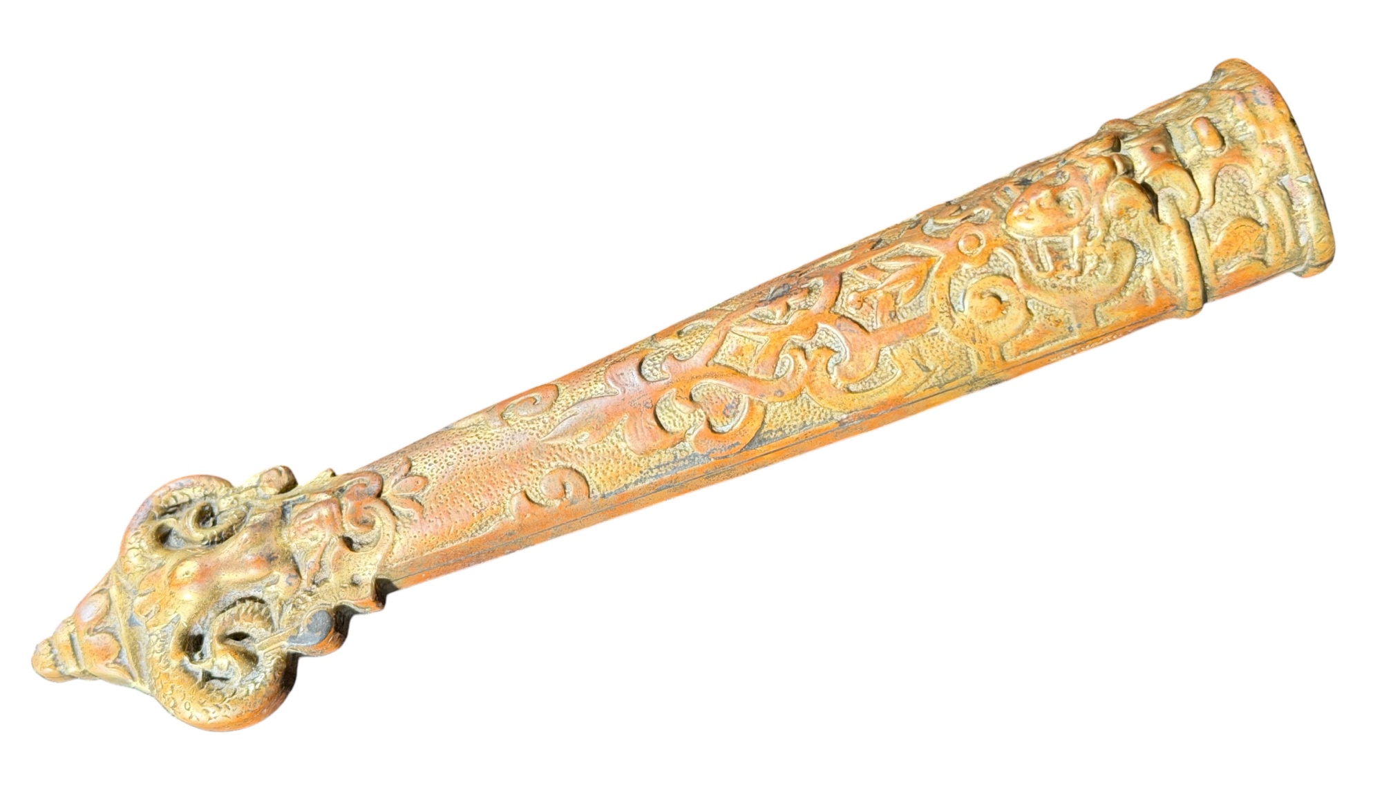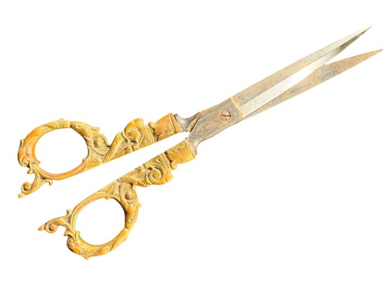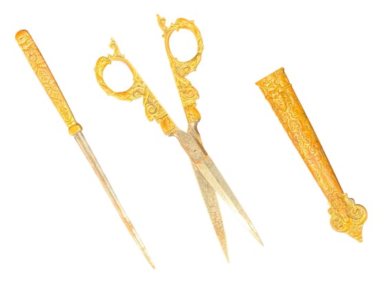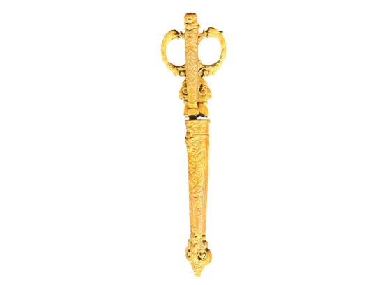 August Knecht brass & steel scissor set including letter opener & sheath, finely cast with Renaissance motifs including dolphins, mermaid, rams heads, and mascarons. 9 1/2 inches. Condition: Blades slightly warped.