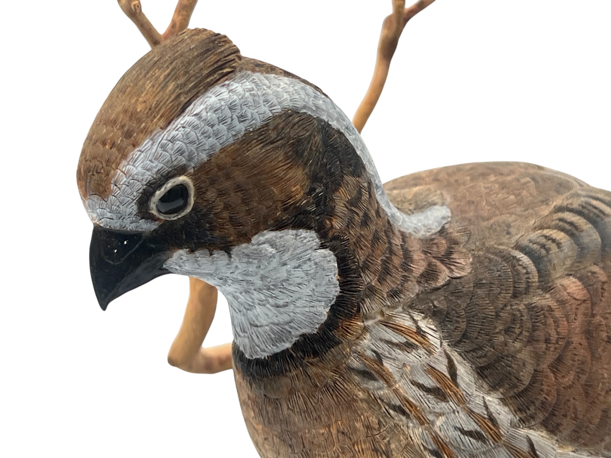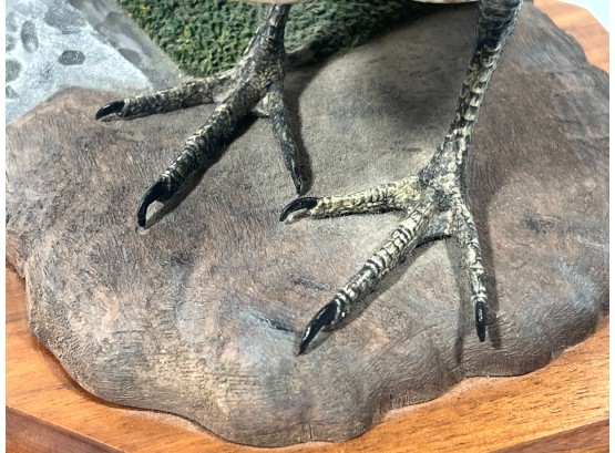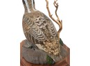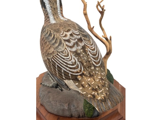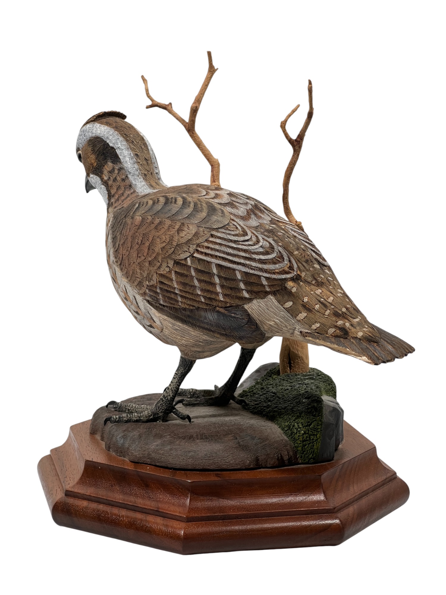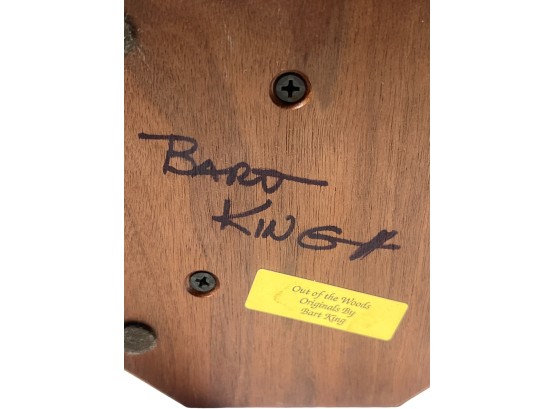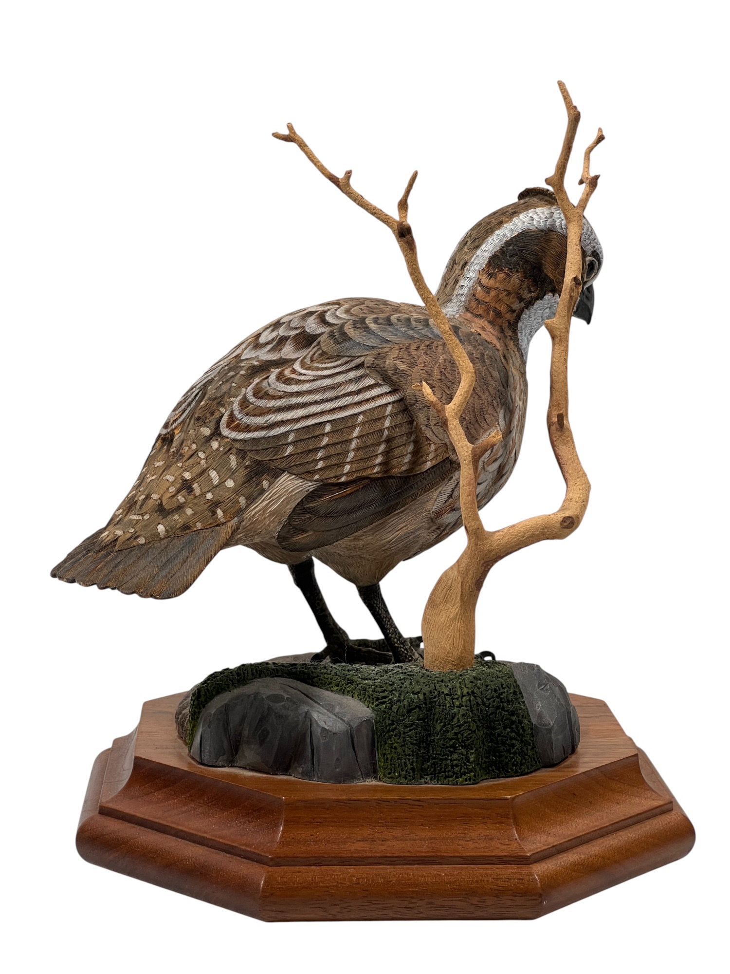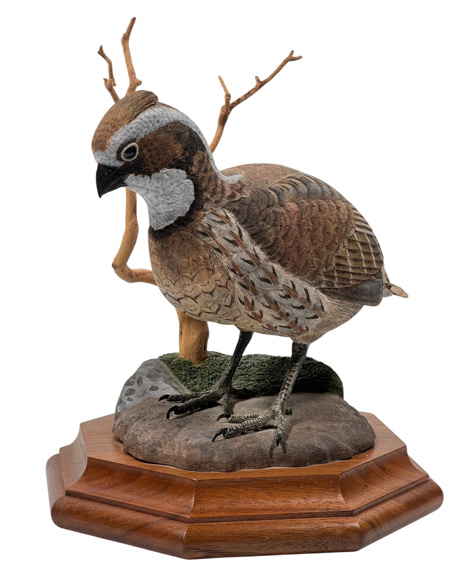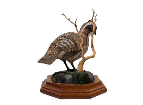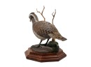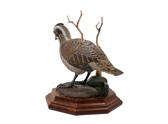 Fabulously detailed carved & painted Northern bobwhite on custom wooden base, signed, dated, & labeled under base. 9 inches. N.B. Bart King is son of carver Huber King. Condition: Tail in need of repair.