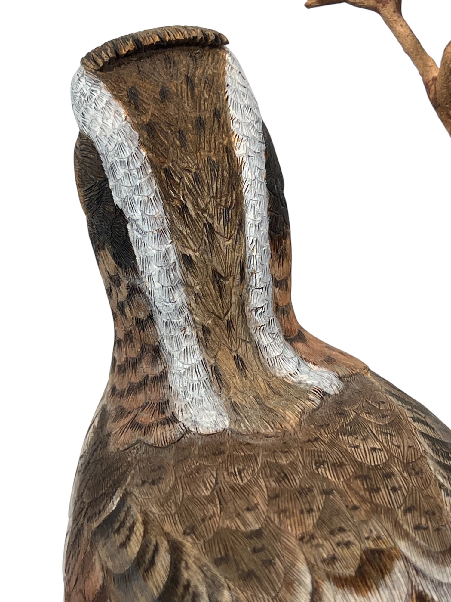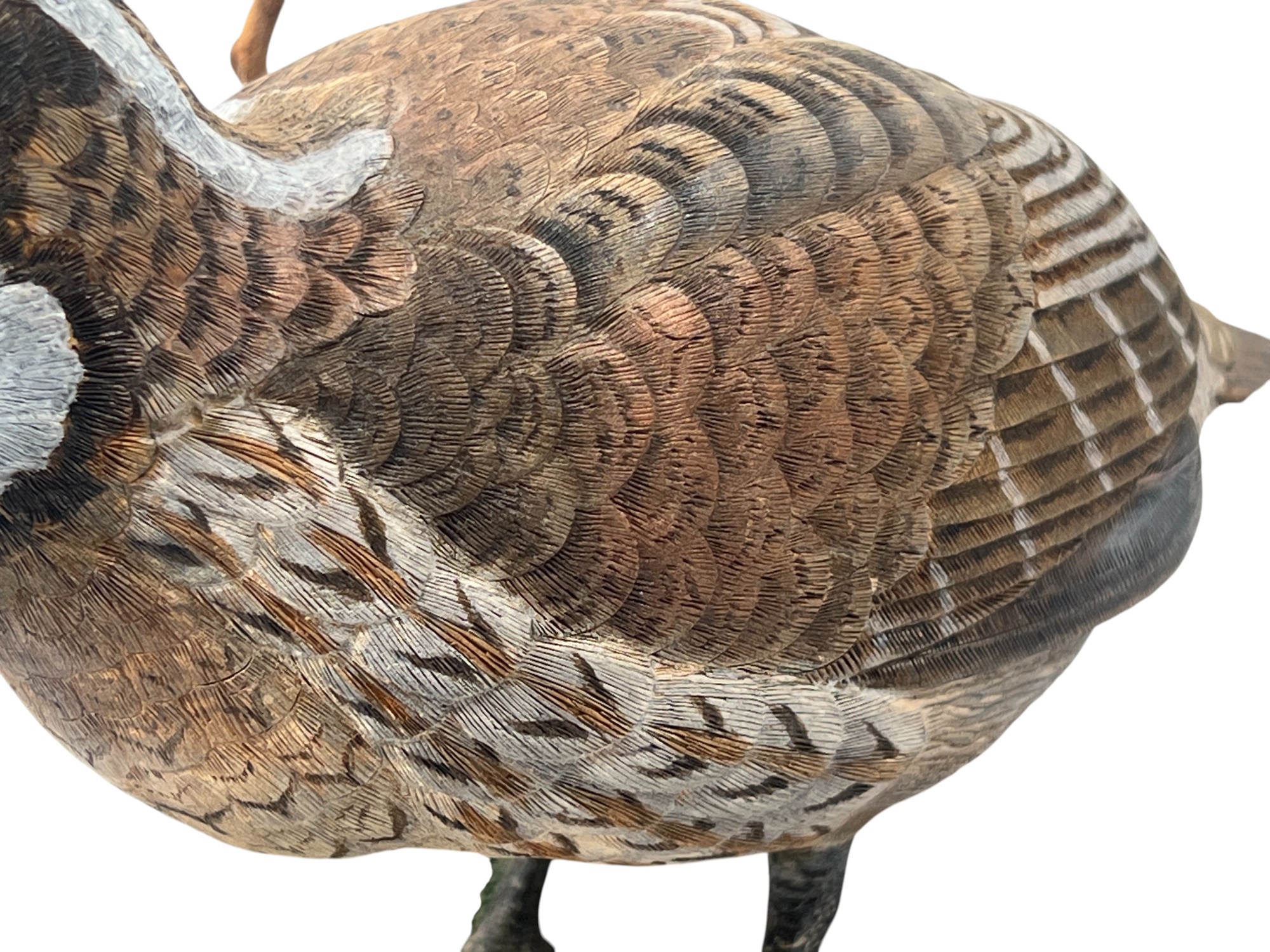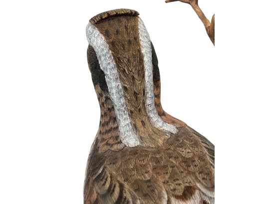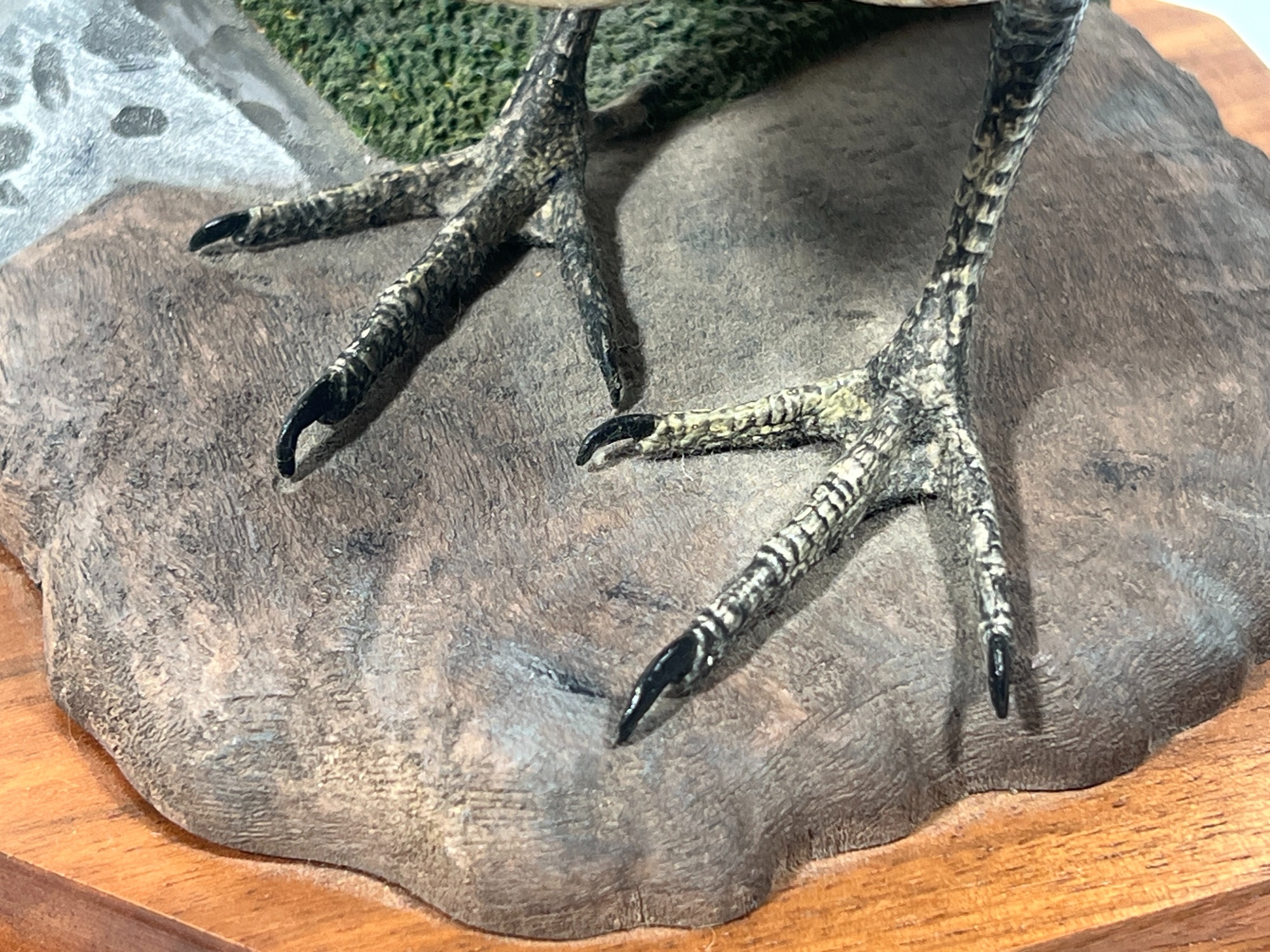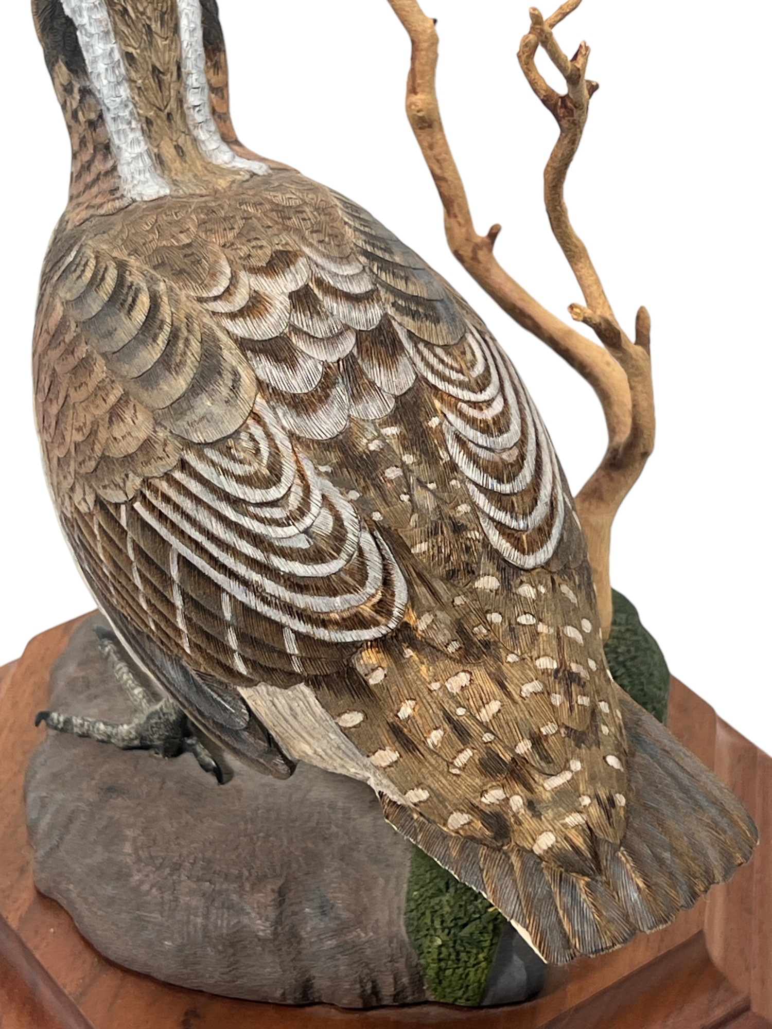 Fabulously detailed carved & painted Northern bobwhite on custom wooden base, signed, dated, & labeled under base. 9 inches. N.B. Bart King is son of carver Huber King. Condition: Tail in need of repair.