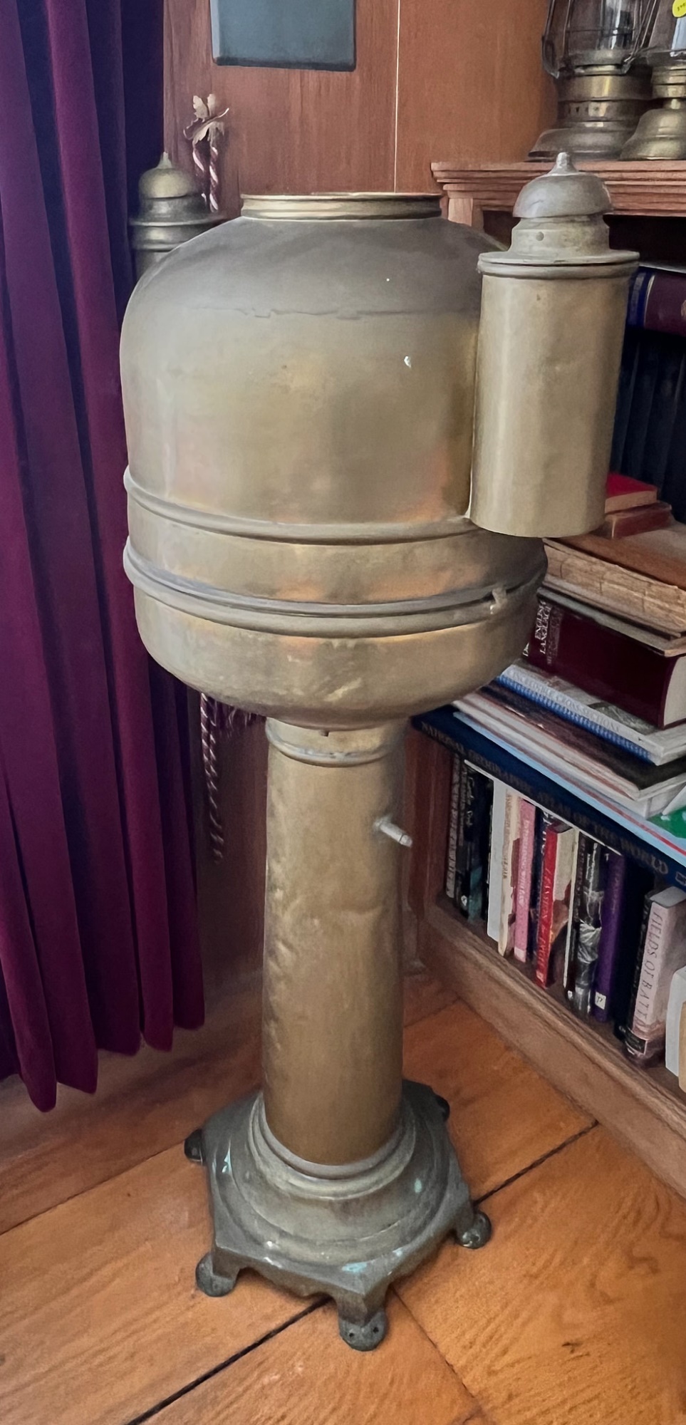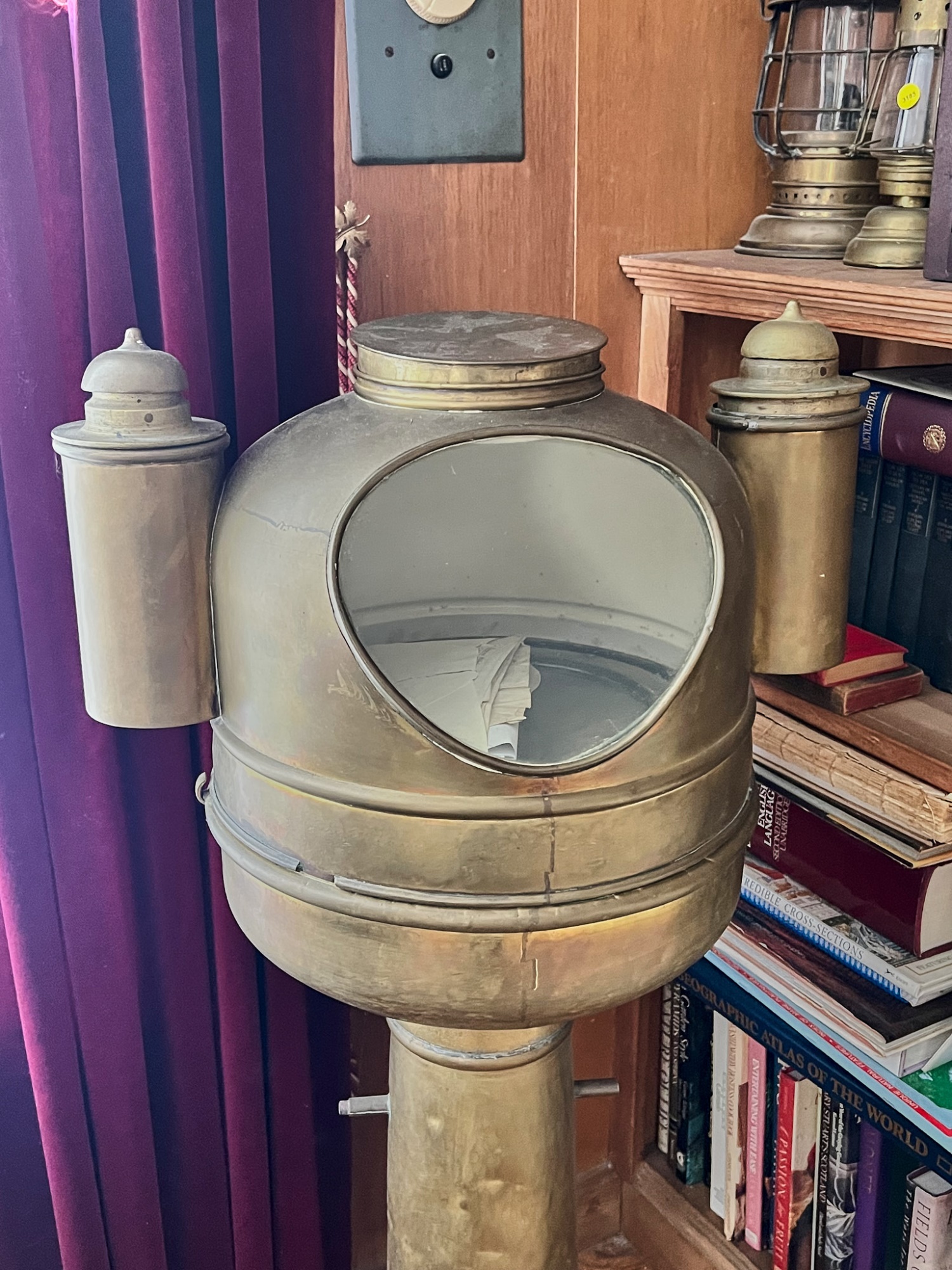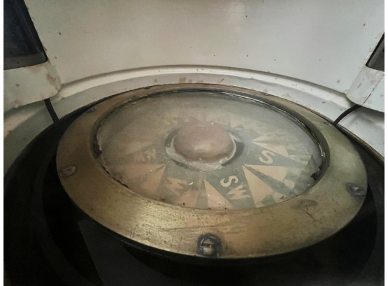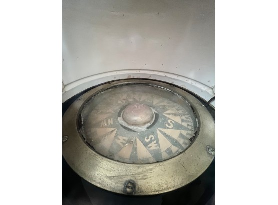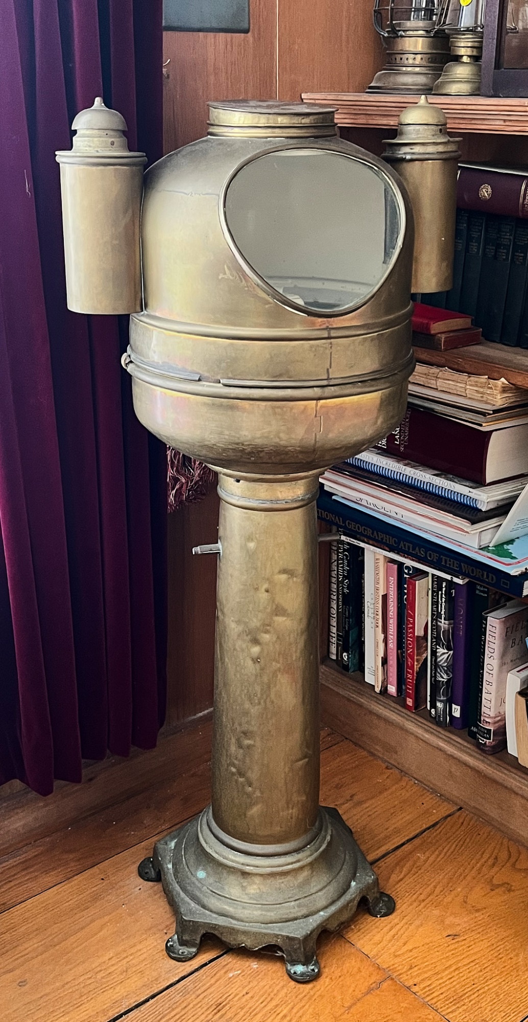 Gimbaled 8 inch wet compass housed in a (2) light binnacle raised on a footed pedestal. 44 inches. Provenance: The German raider, the Crown Prince Wilhelm was brought from Germany to the United States for dismantling to be displayed at the Philadelphia Centennial. This plan was not carried out, and the binnacle came into the possession of the late Captain James Crawford. Signed. Thomas L. VanDerslice.