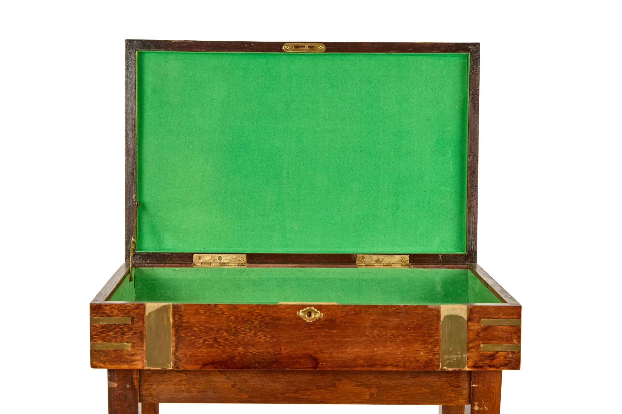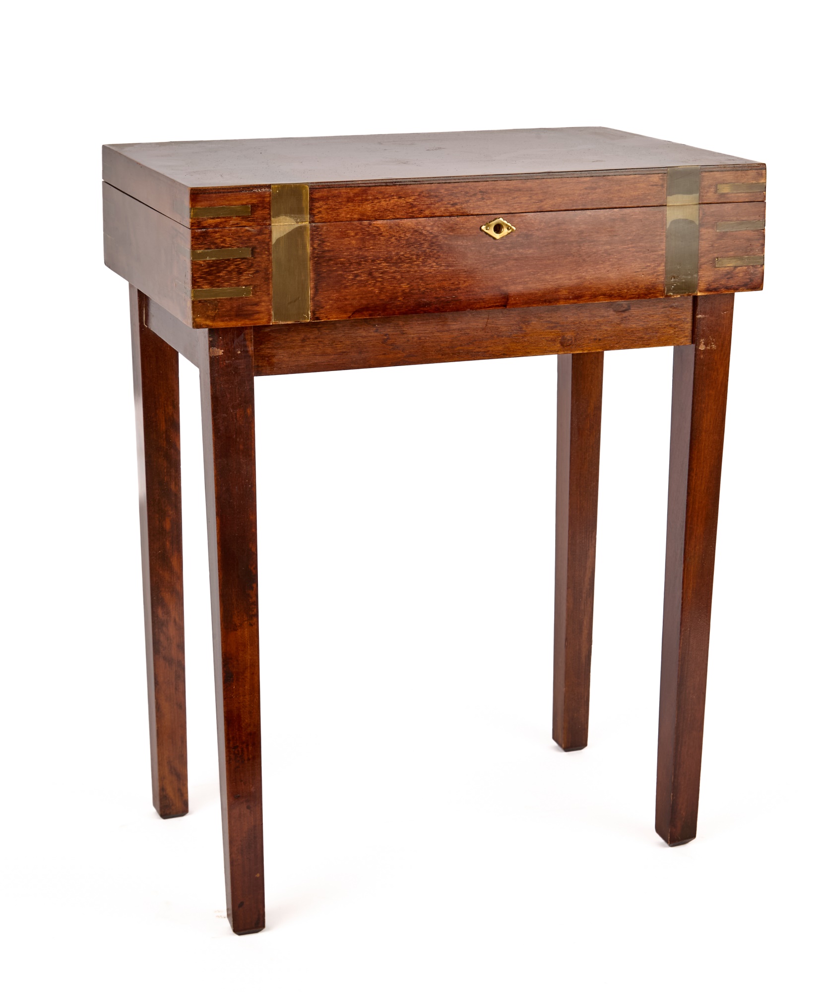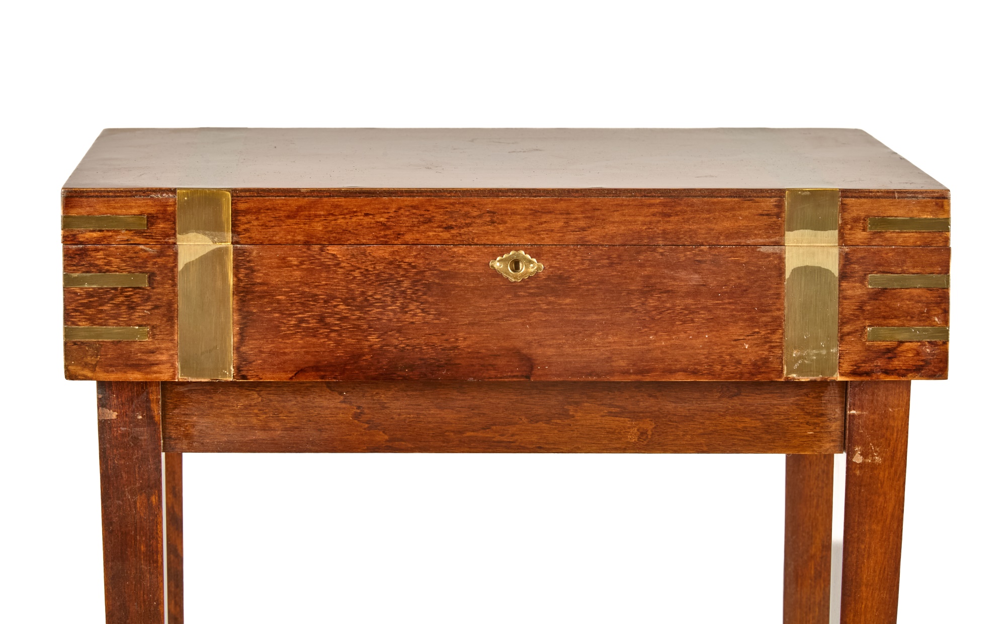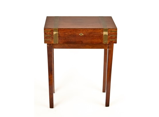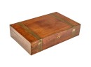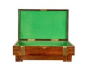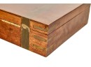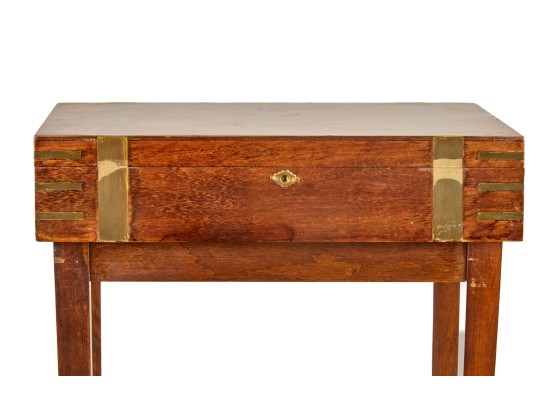 Felt-lined brass-bound and brass finger jointed box nests on stand. 20.5 x 16 x 10 inches Condition: Light scratches, key present for locking box Temp No 6074