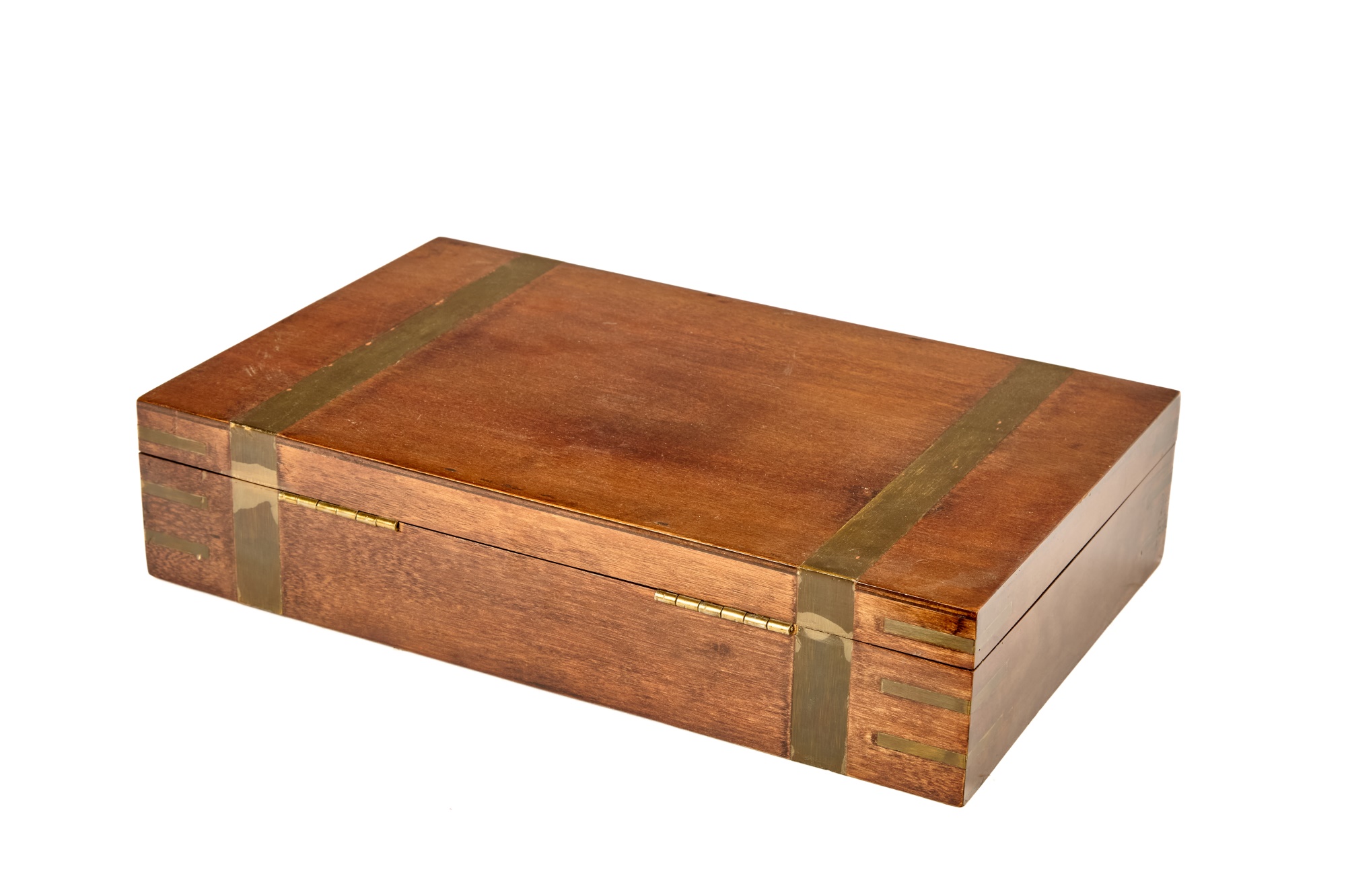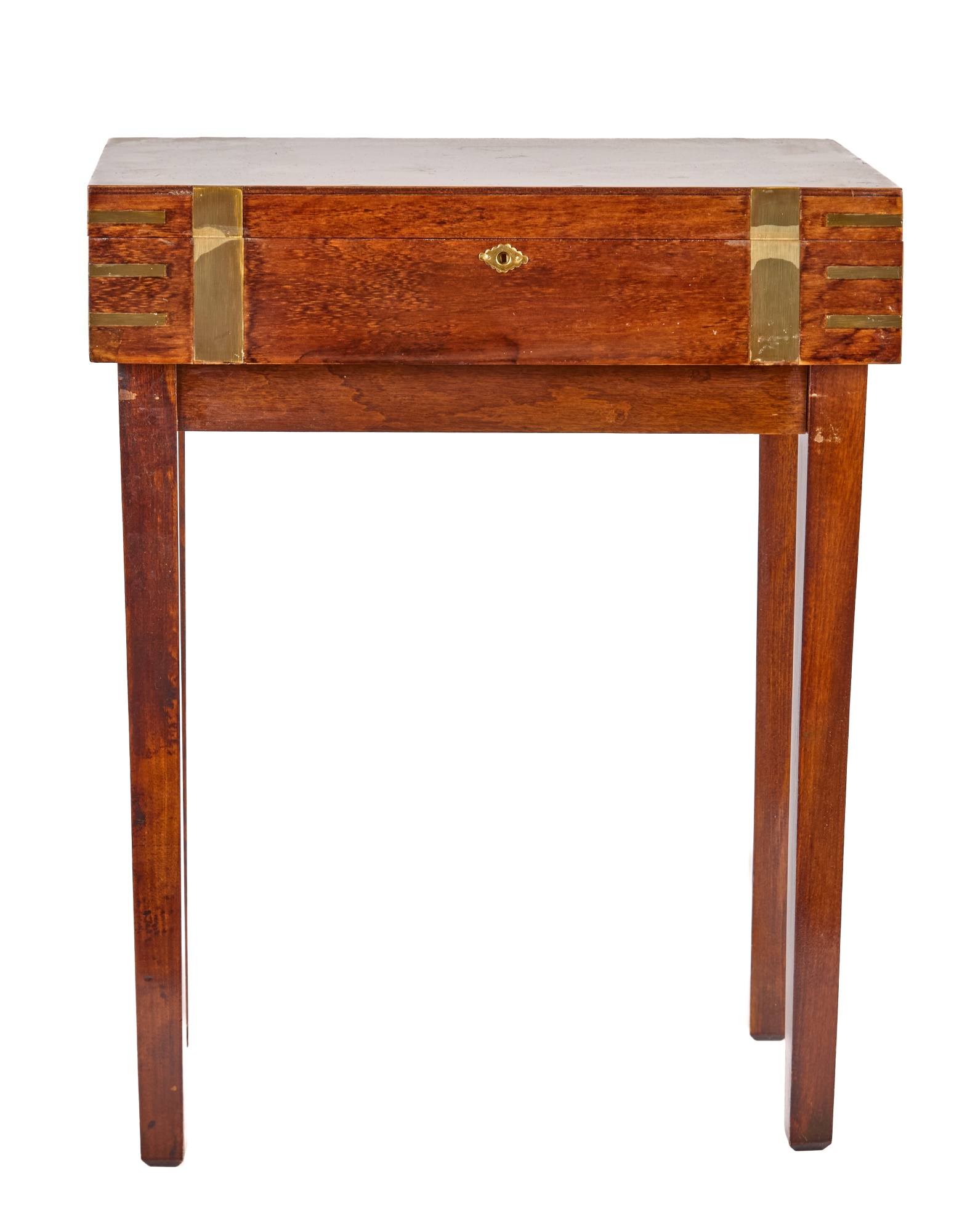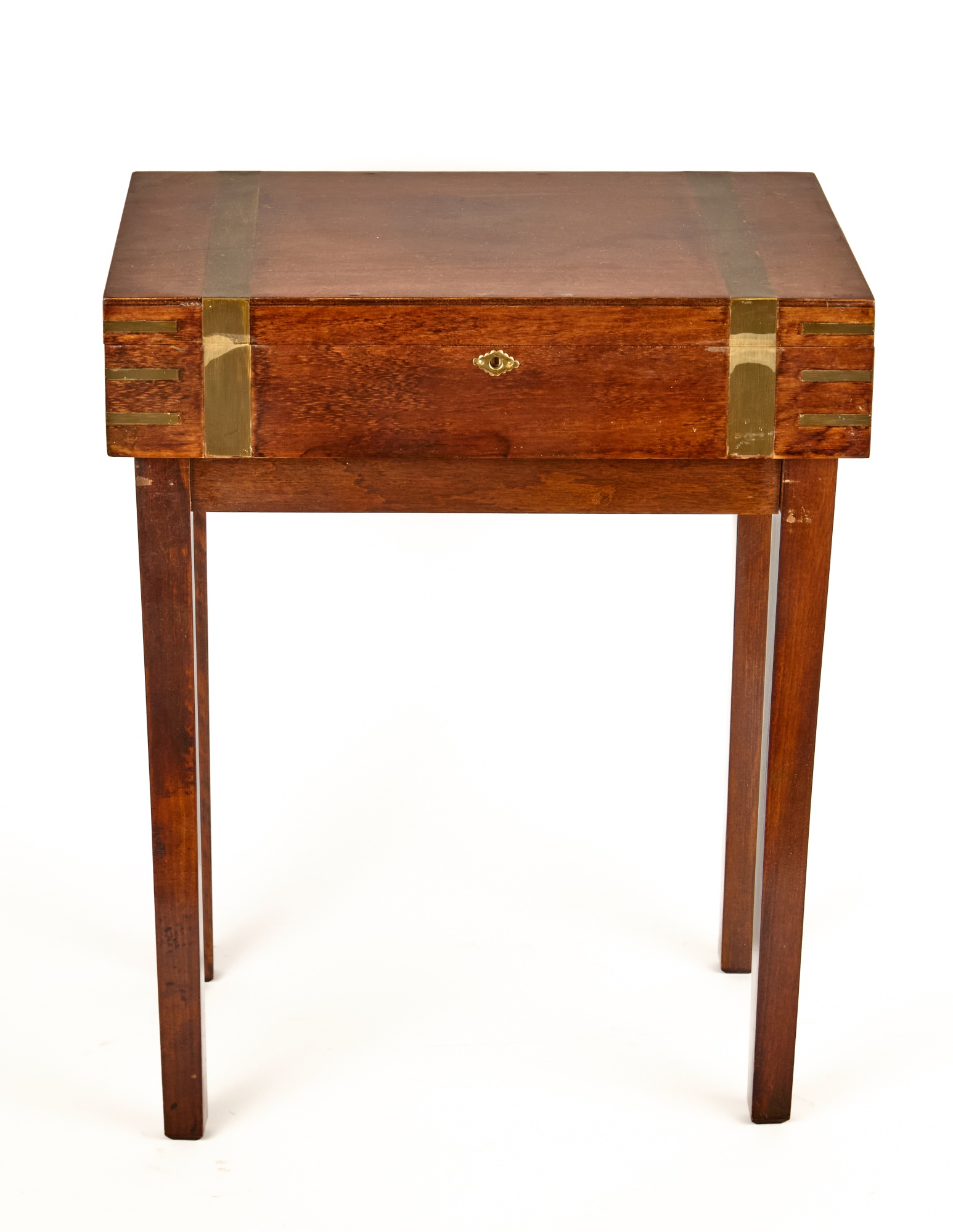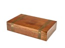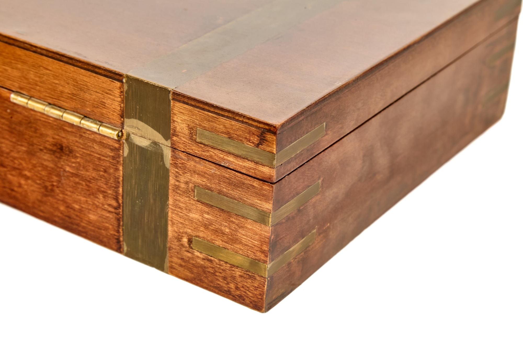 Felt-lined brass-bound and brass finger jointed box nests on stand. 20.5 x 16 x 10 inches Condition: Light scratches, key present for locking box Temp No 6074