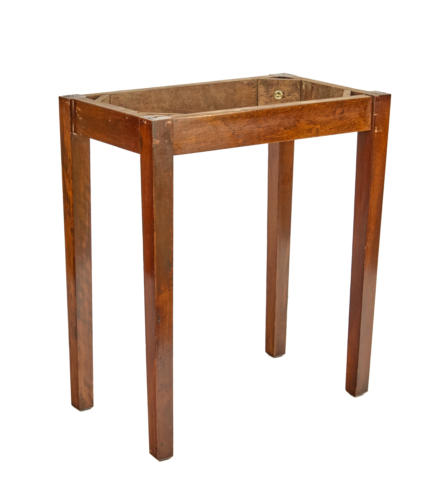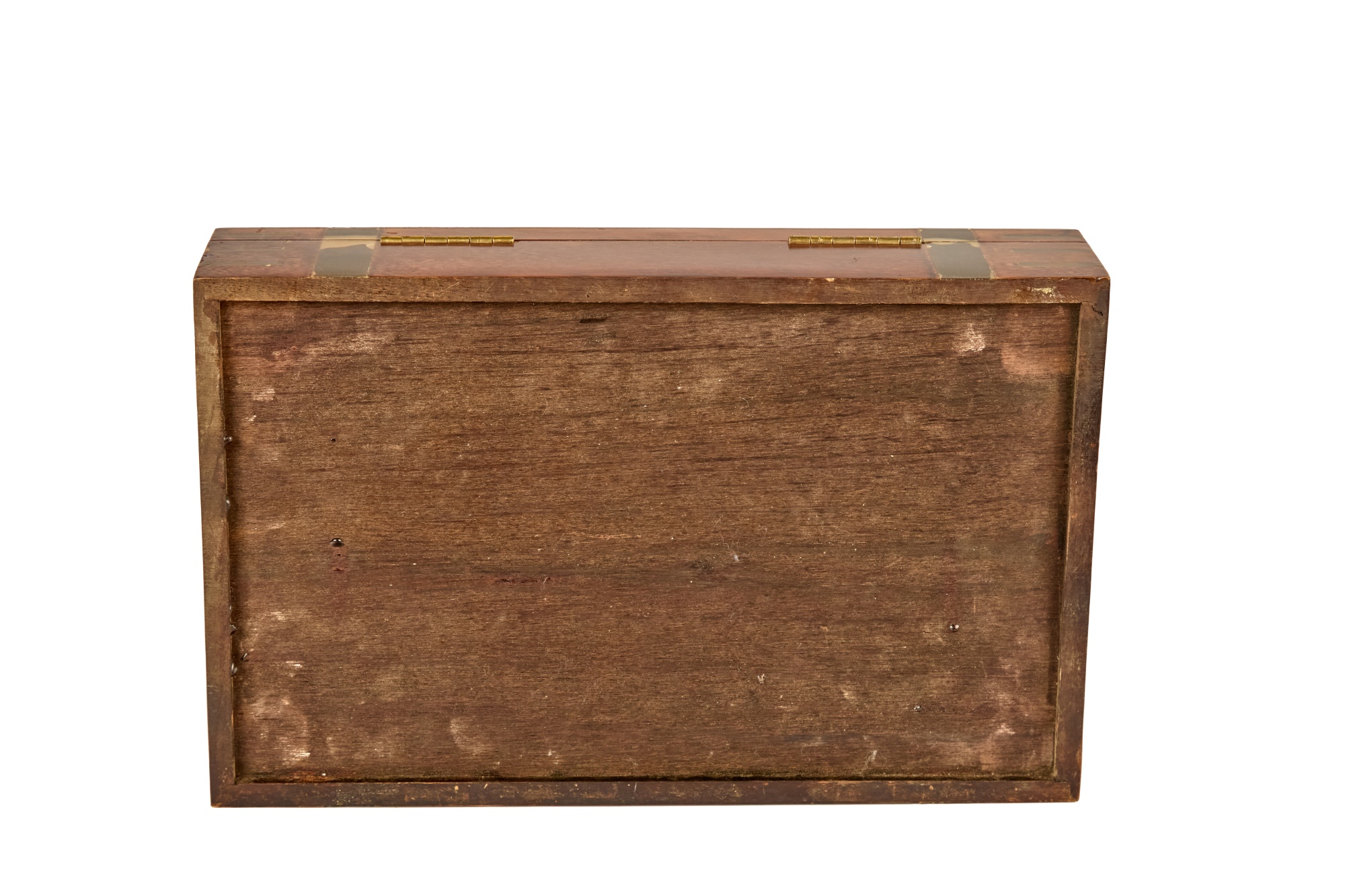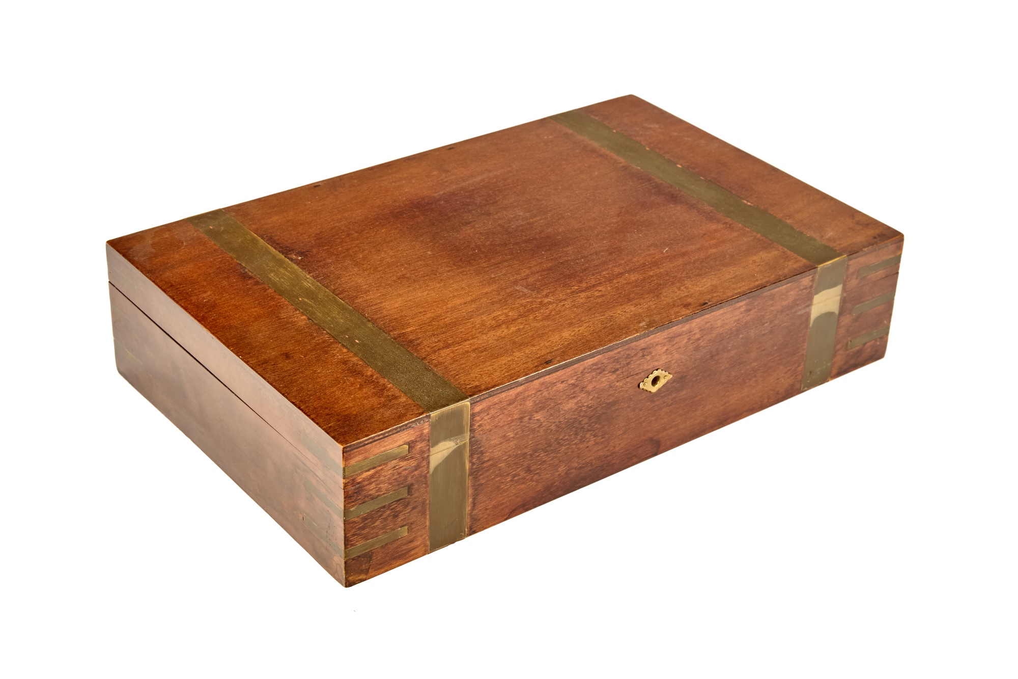 Felt-lined brass-bound and brass finger jointed box nests on stand. 20.5 x 16 x 10 inches Condition: Light scratches, key present for locking box Temp No 6074