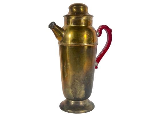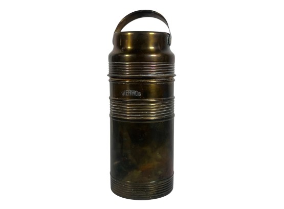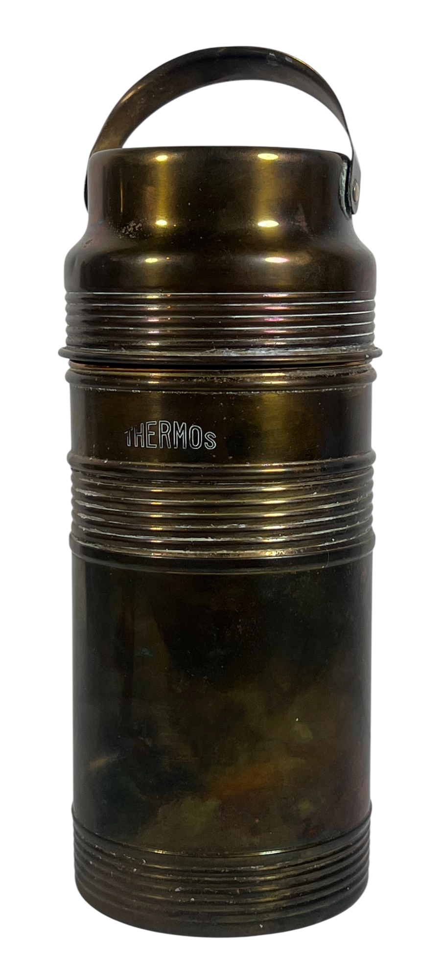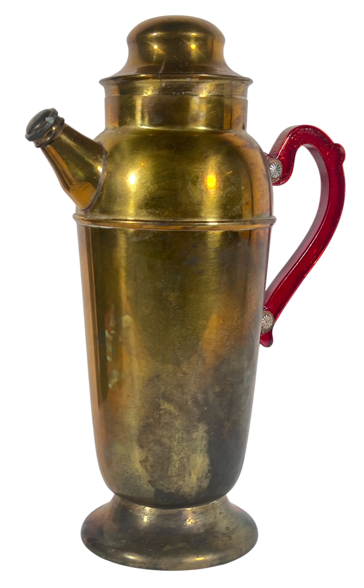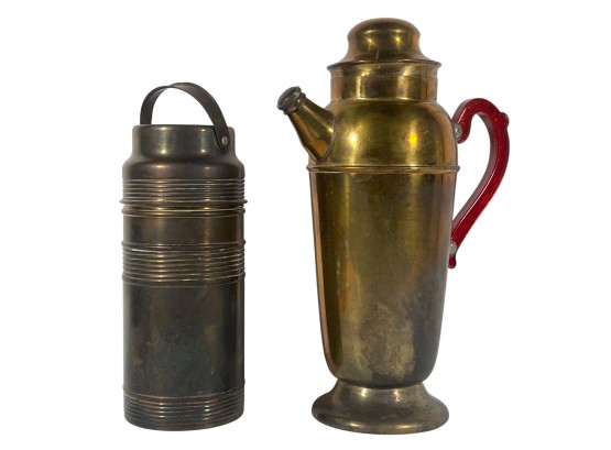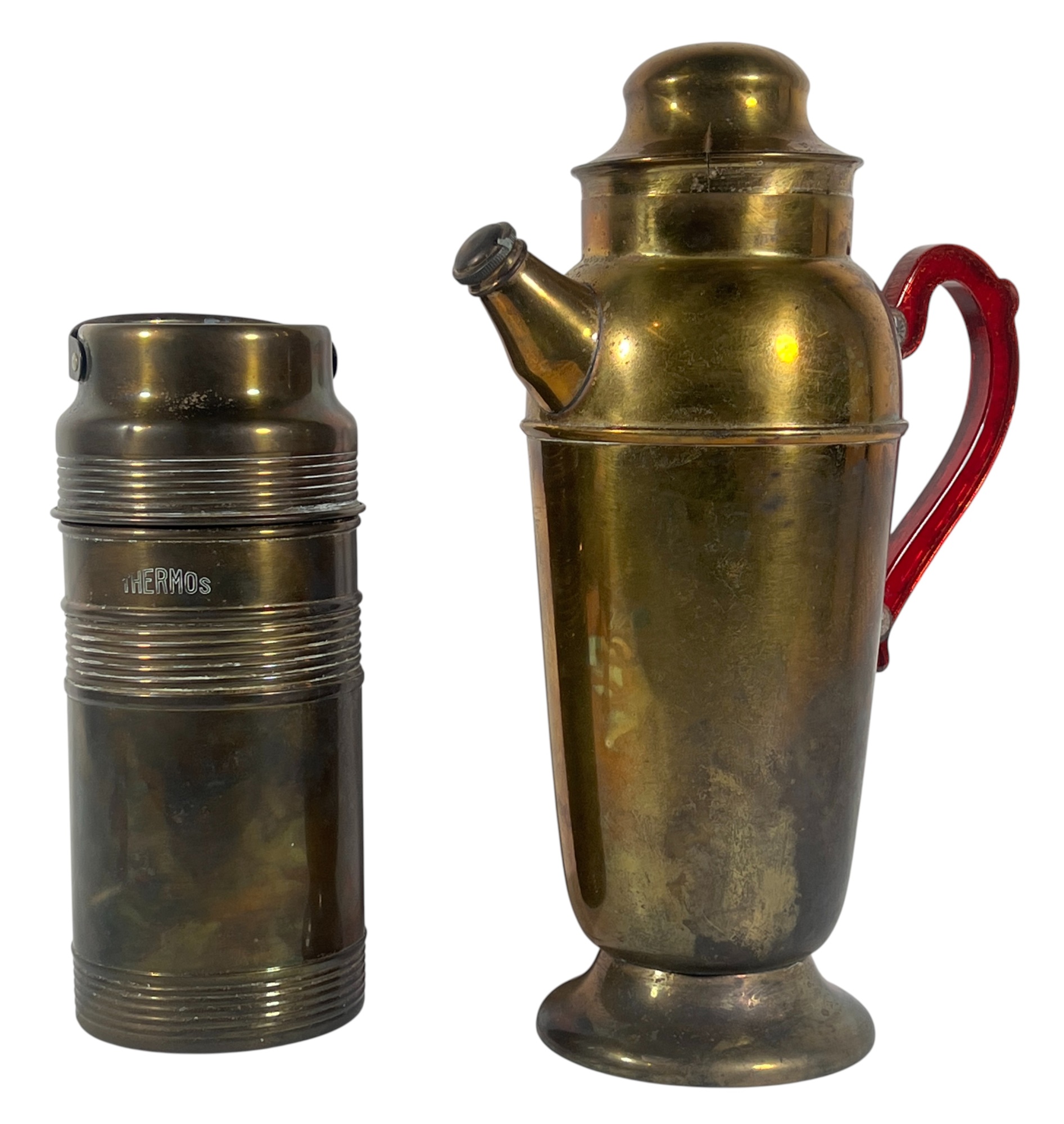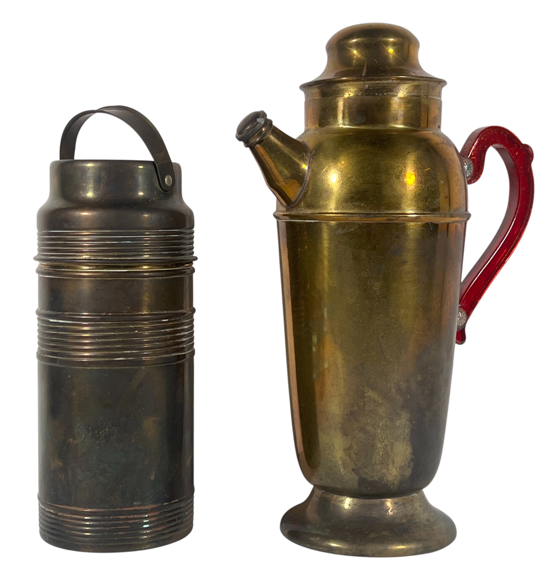 Great (2) piece Art Deco lot including brass Thermos no. 601 and cocktail shaker with bakelite handle. 11 1/2 inches. Condition: Some cracks to shaker cover. Temp No 8584