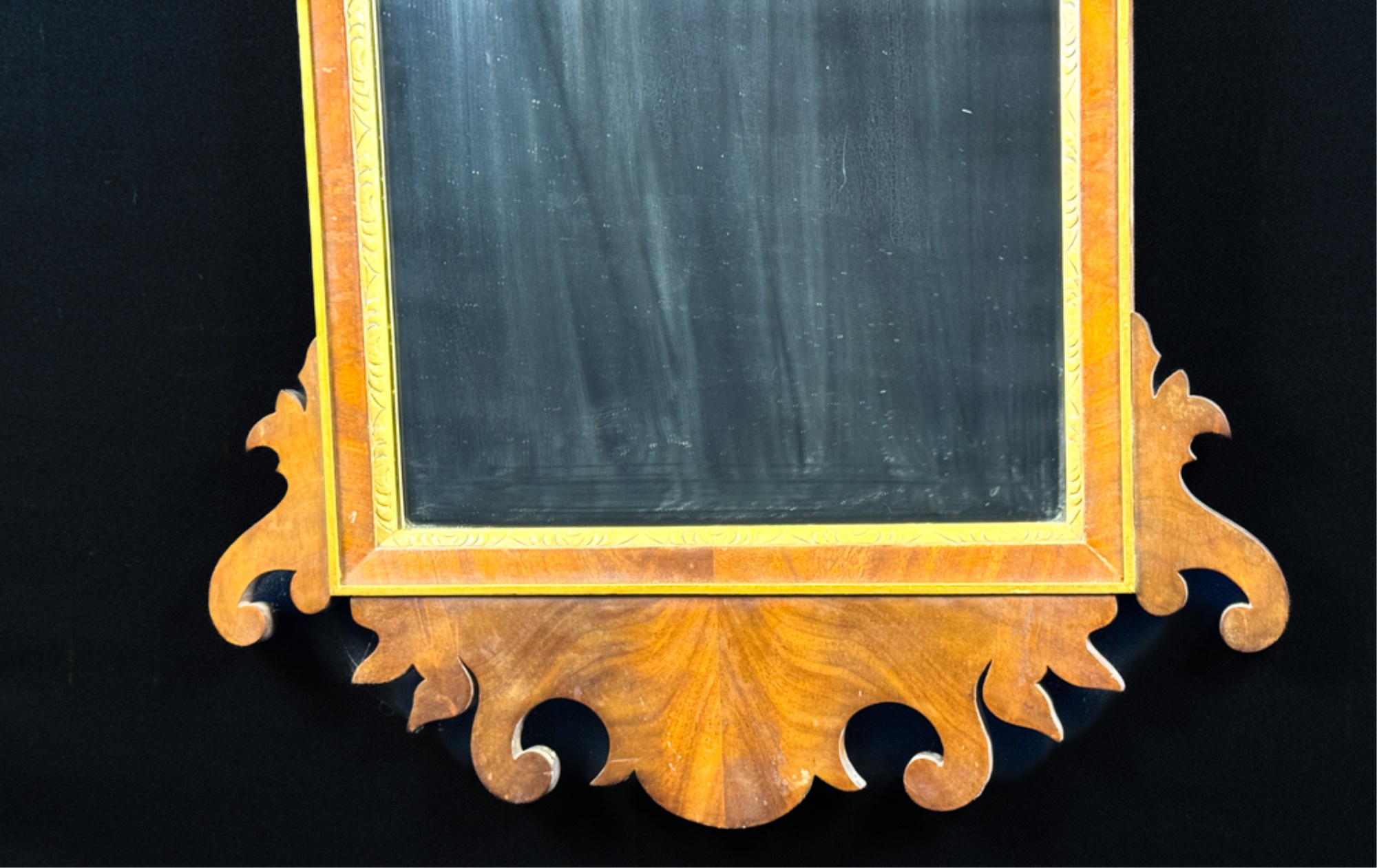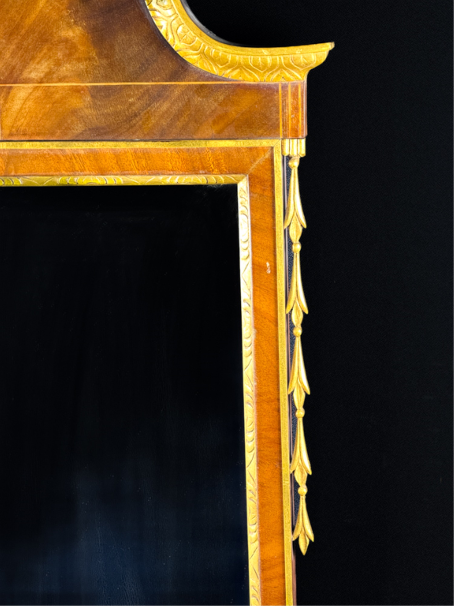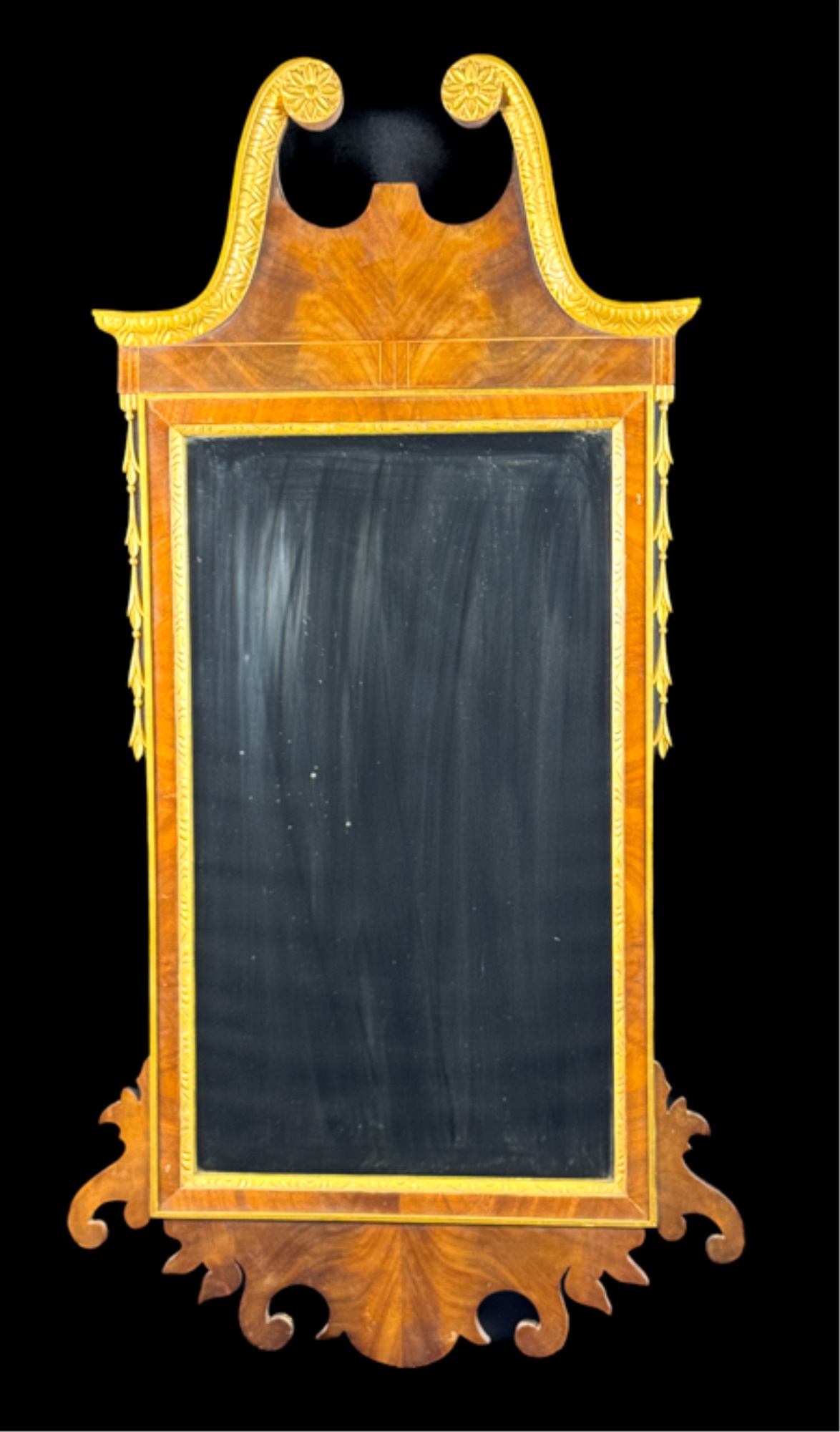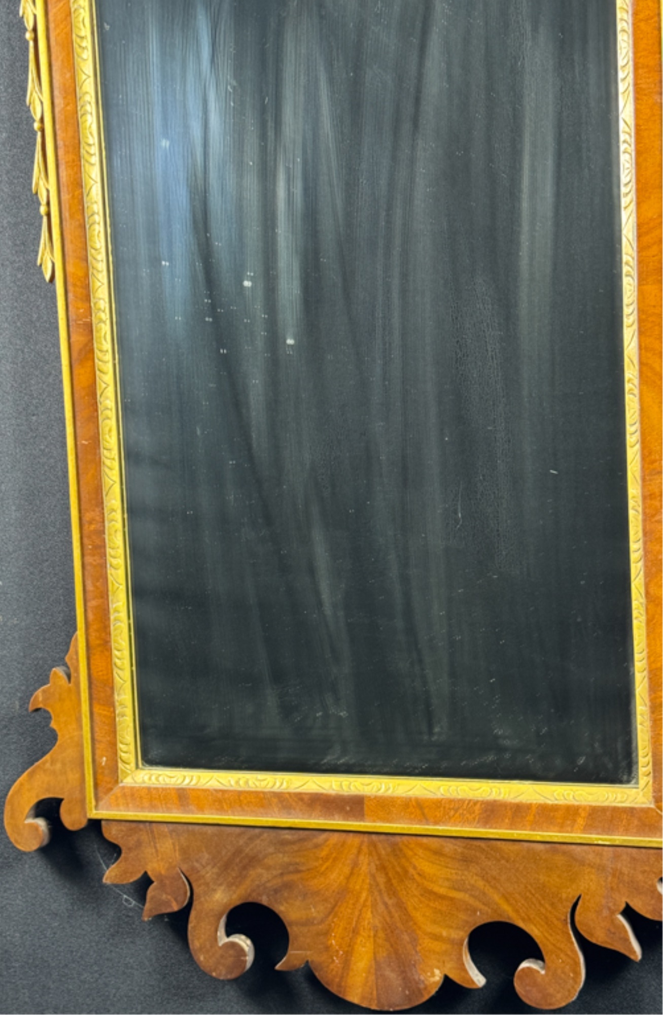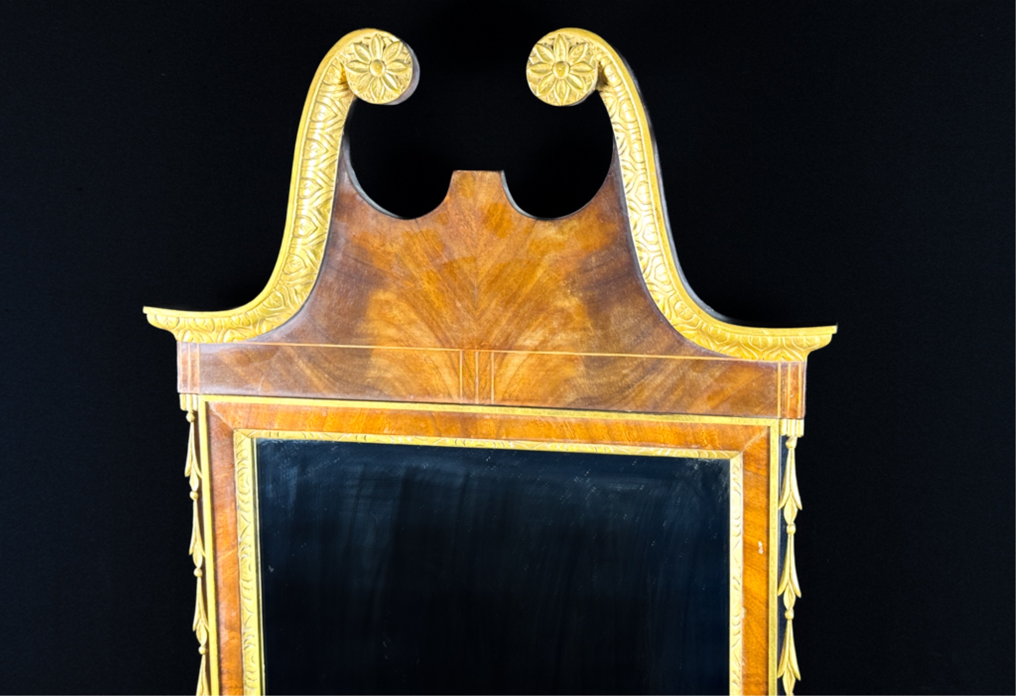 Mahogany construction. 44 x 23 inches. Condition: Missing finial.