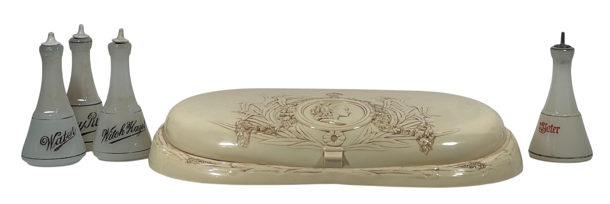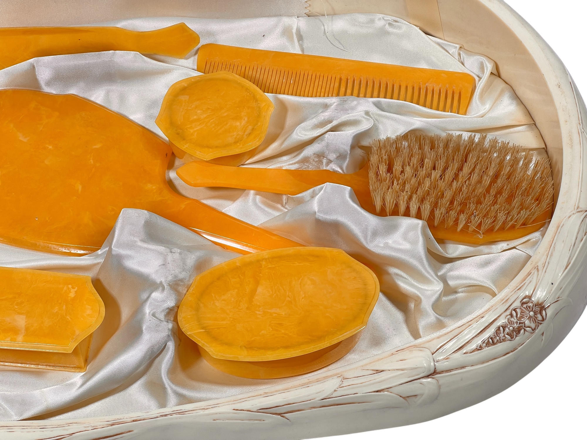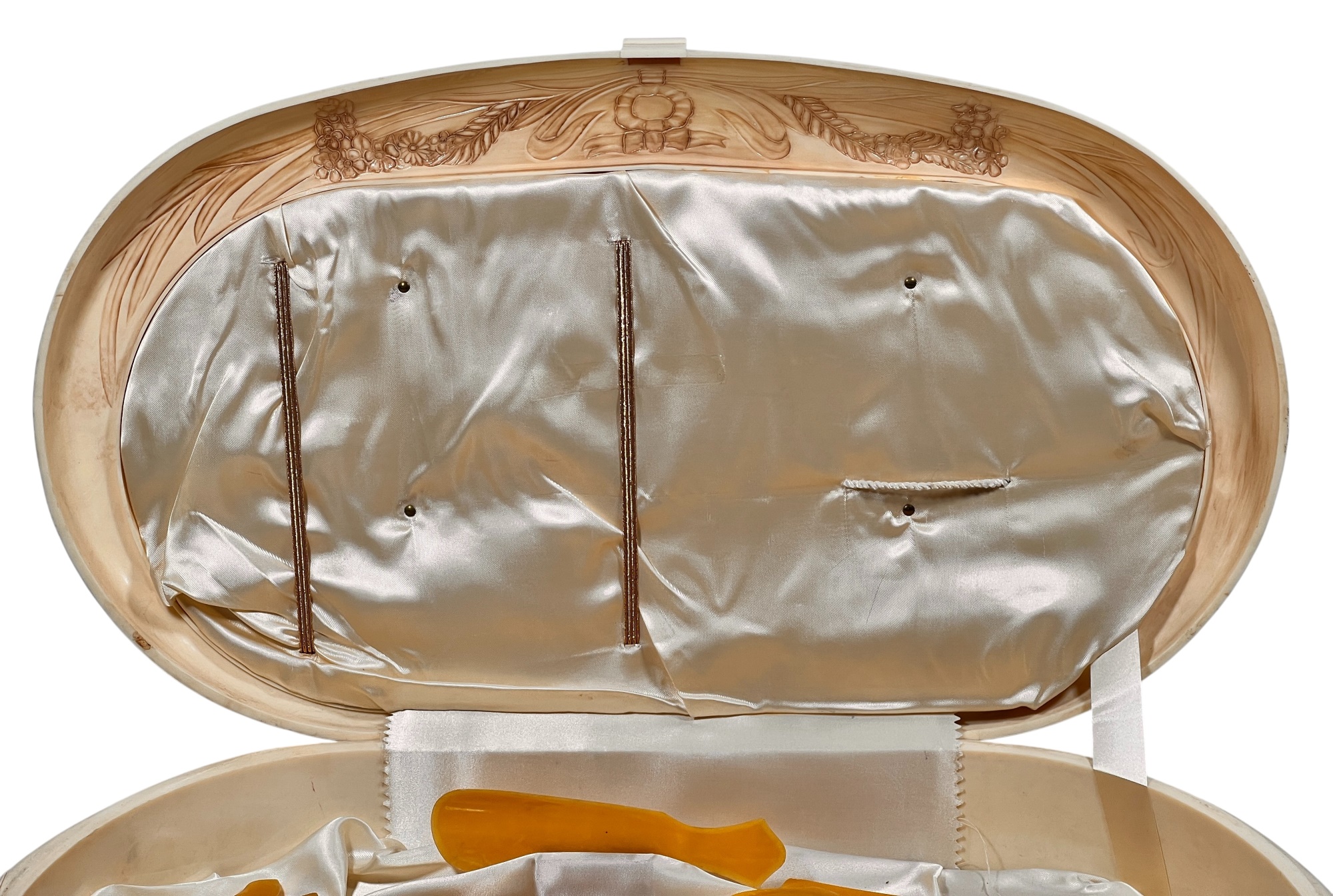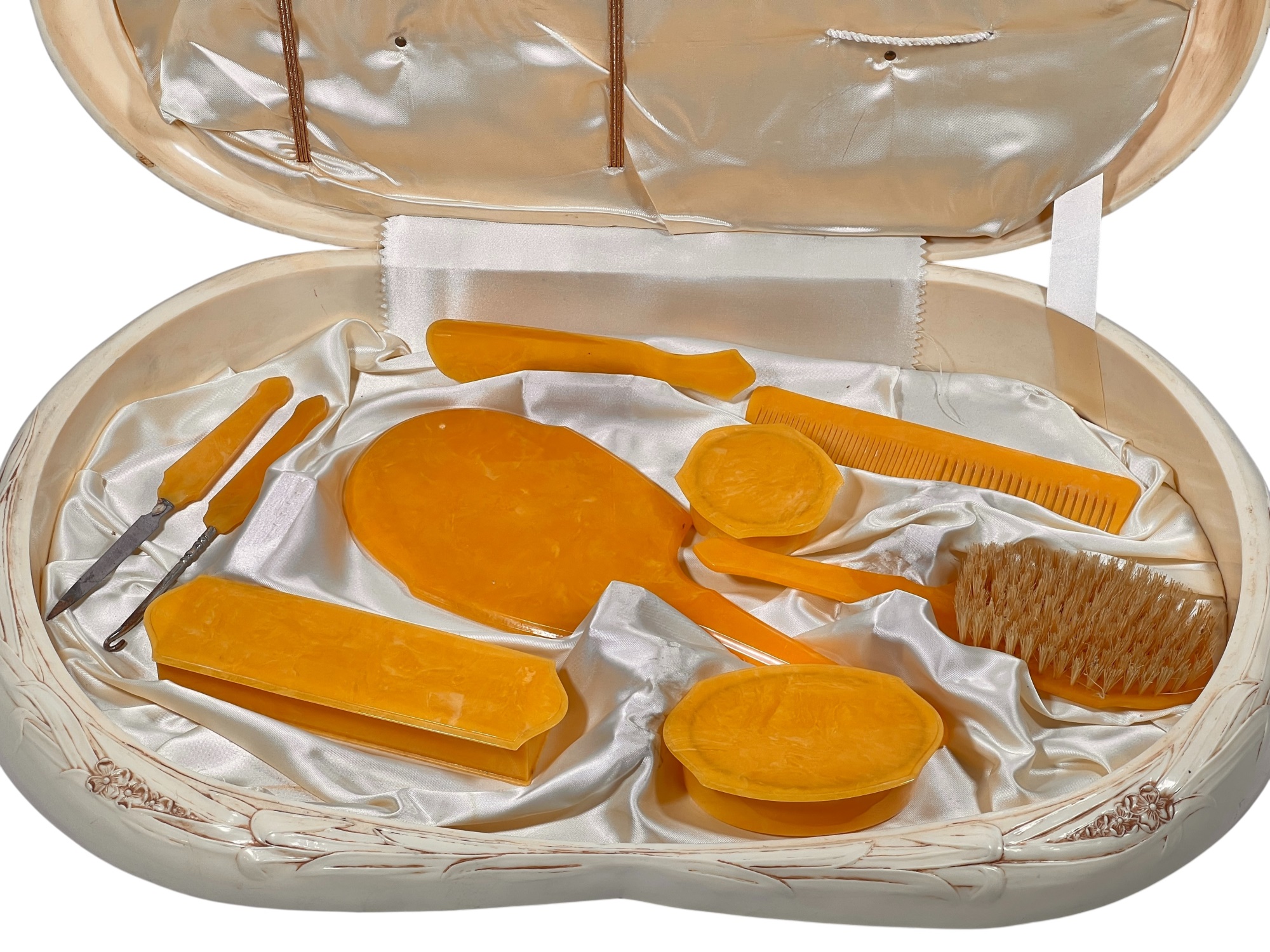Art Deco vanity set in molded celluloid case with bakelite vanity items along with (4) barber bottles. 3 x 21 x 12 inches. Condition: Some wear to paint. Temp No 8629