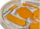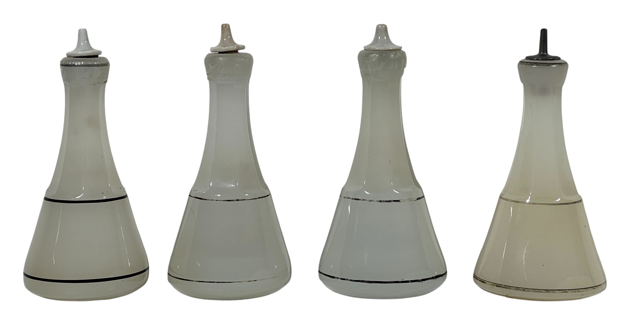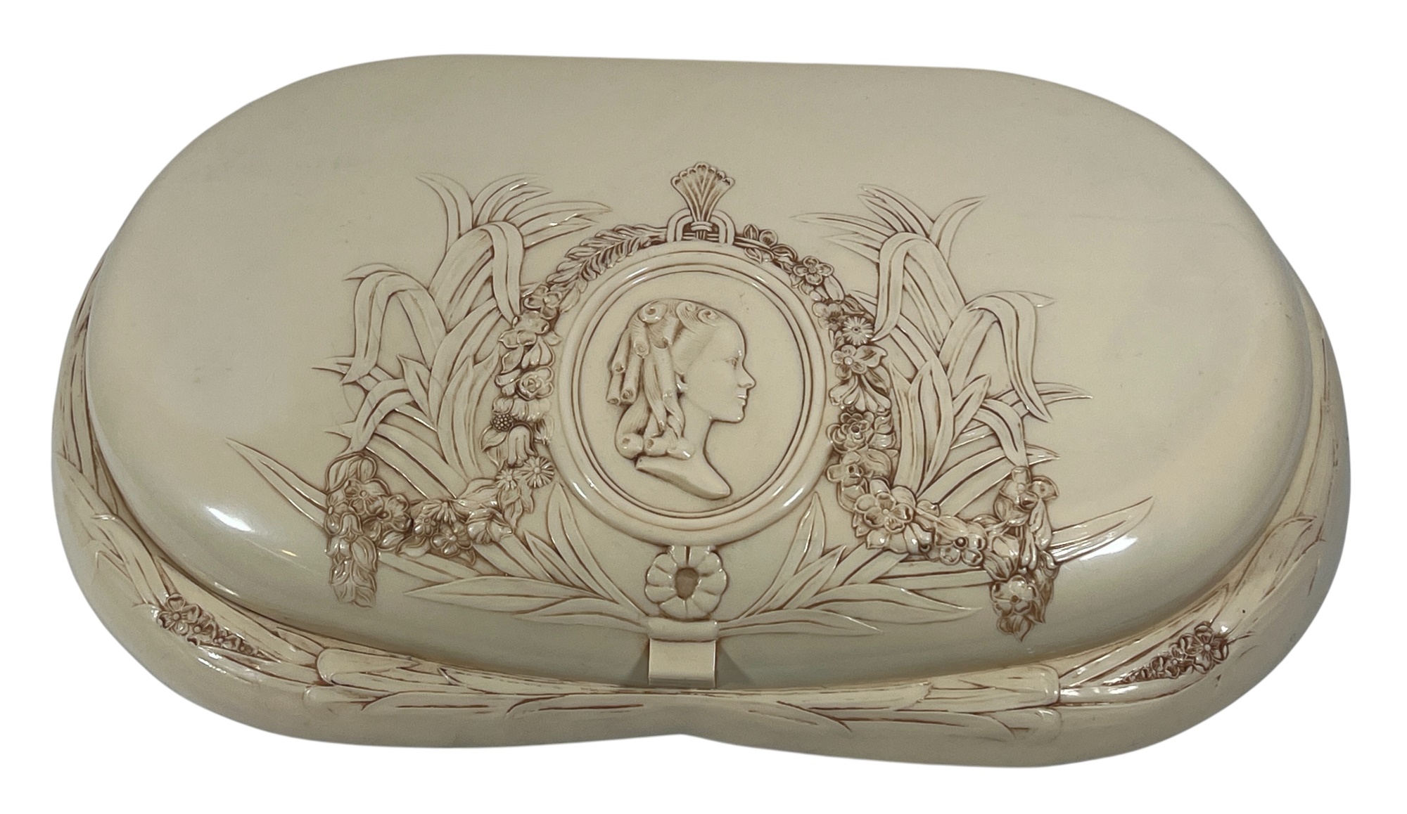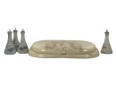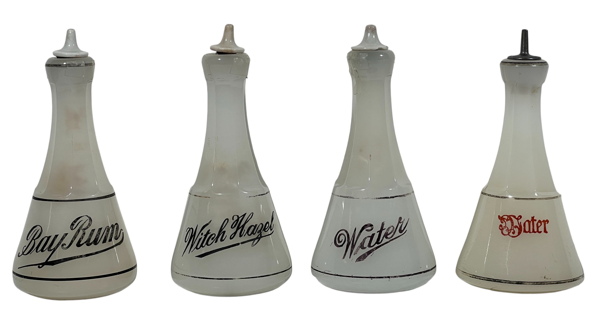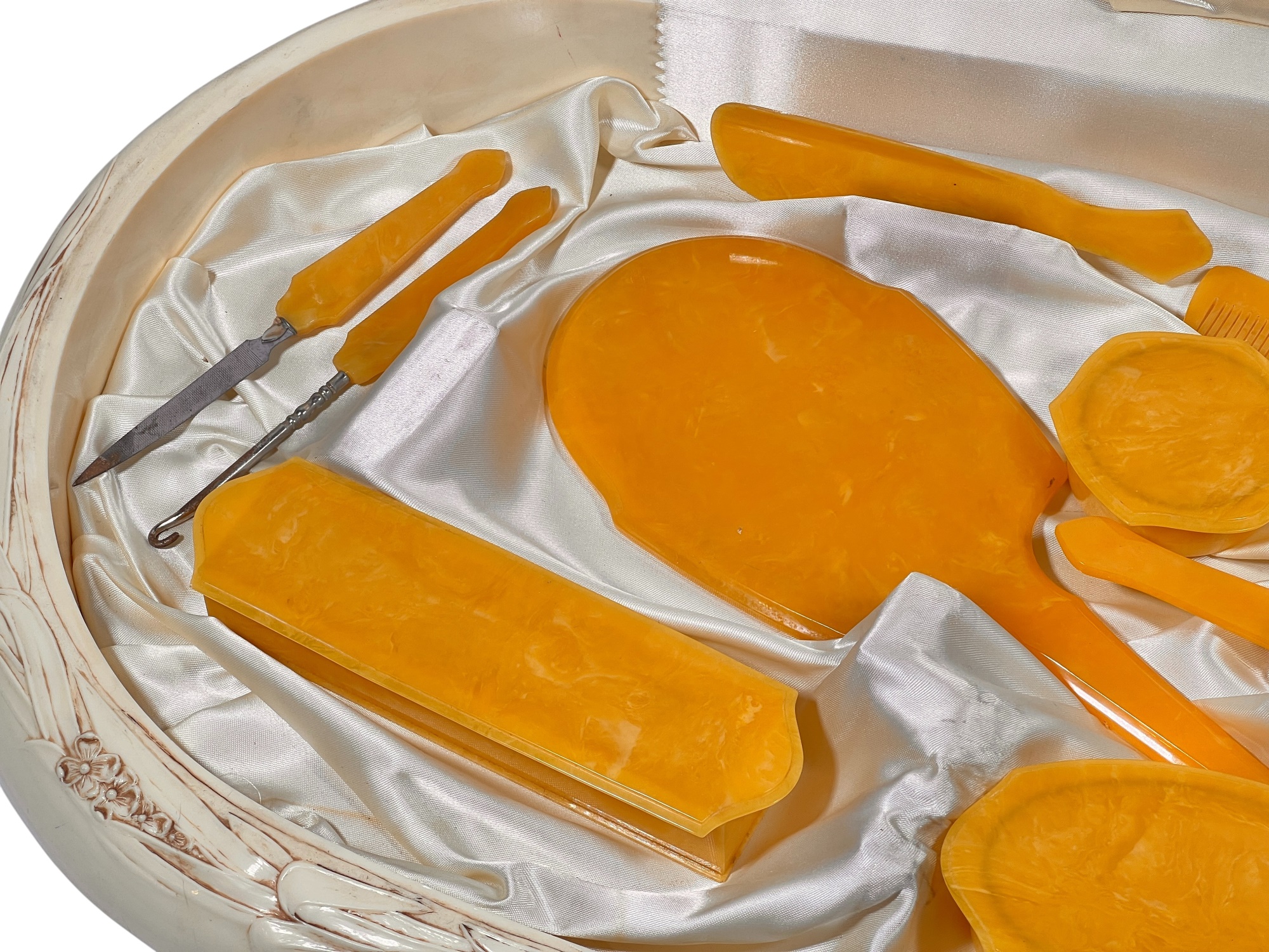 Art Deco vanity set in molded celluloid case with bakelite vanity items along with (4) barber bottles. 3 x 21 x 12 inches. Condition: Some wear to paint. Temp No 8629