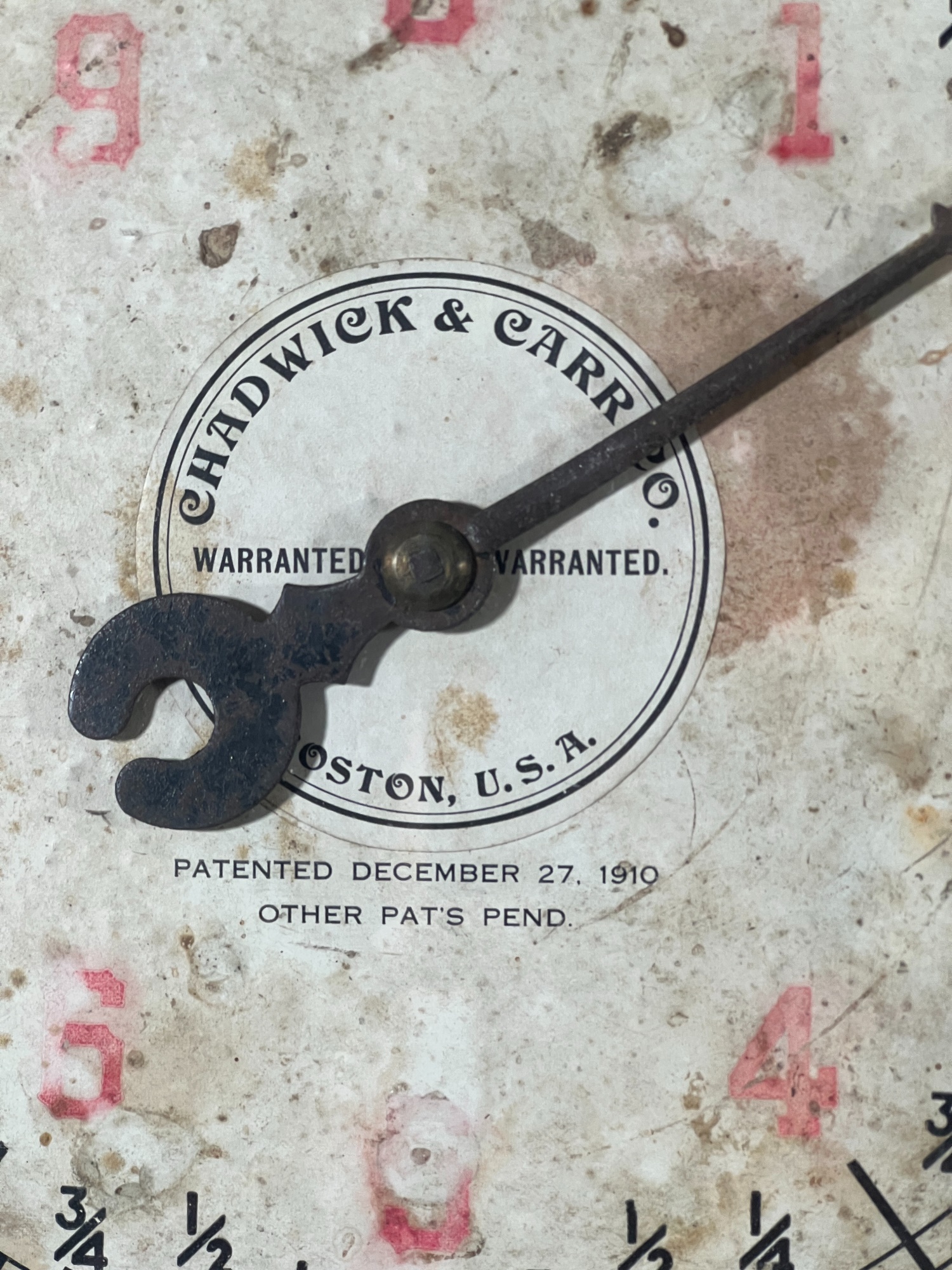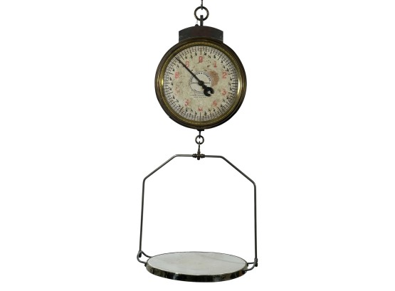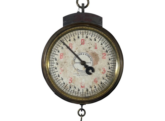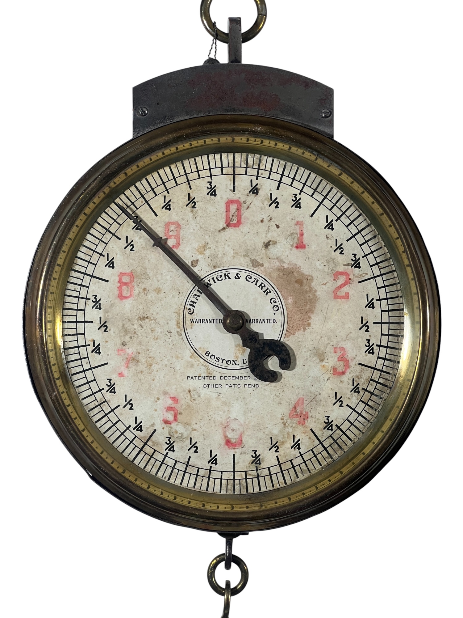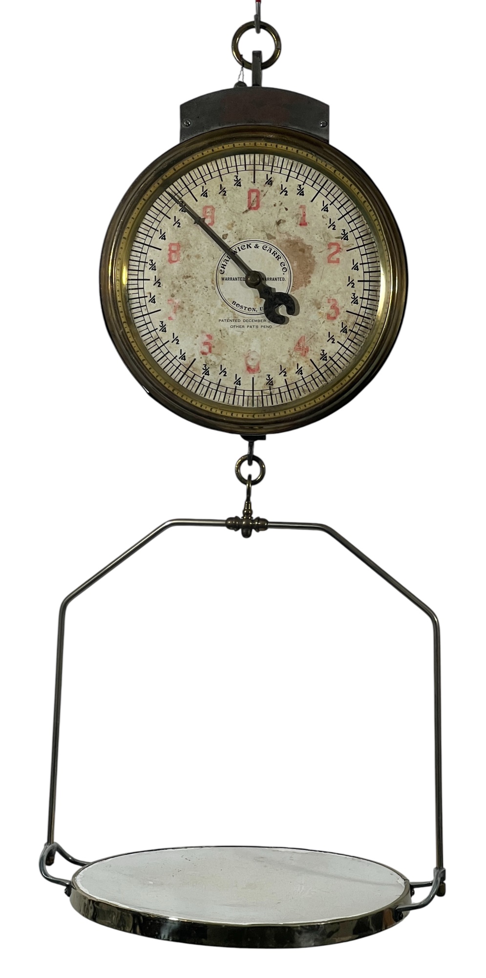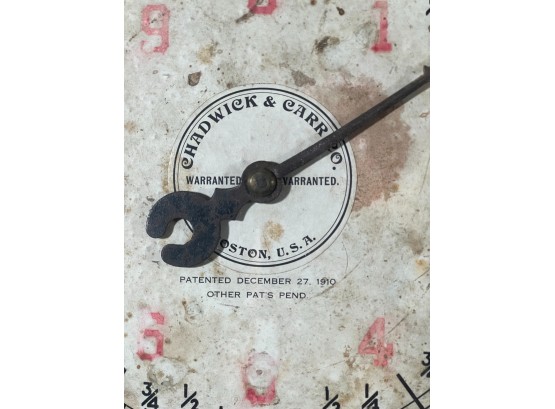 Chadwick & Carr Co. (Boston, MA) brass & iron produce spring scale with produce tray. 11 1/2 inches. Condition: Wear/fading to face. Please see photos. Temp No 8824