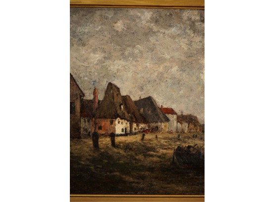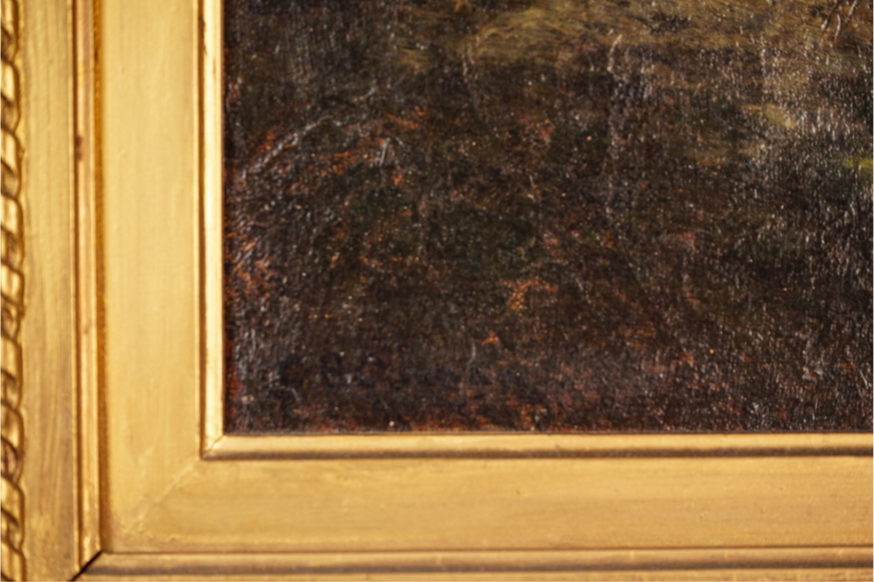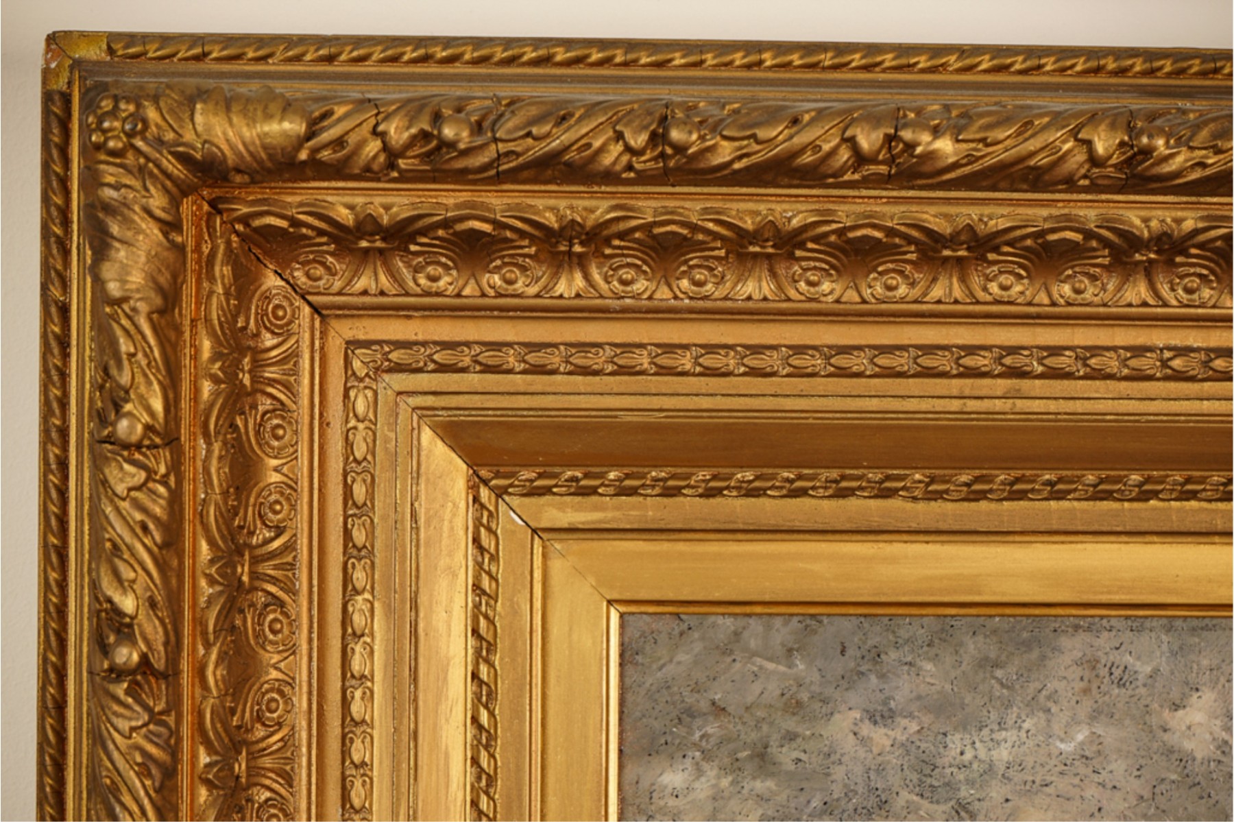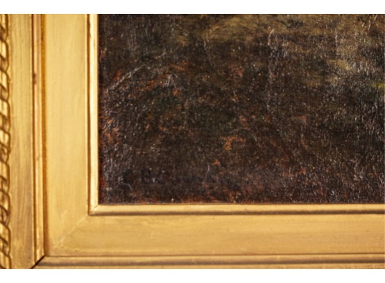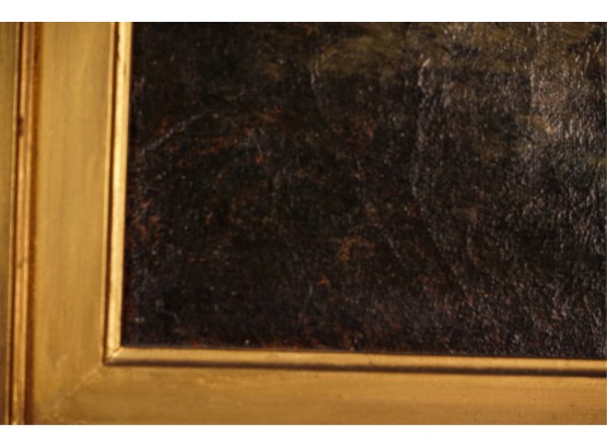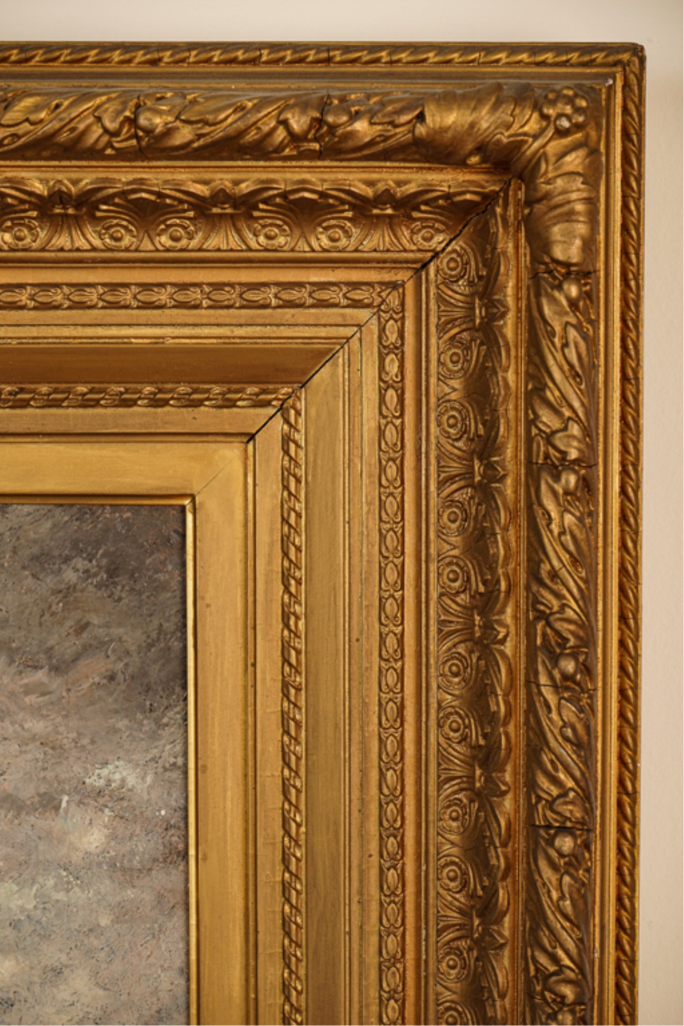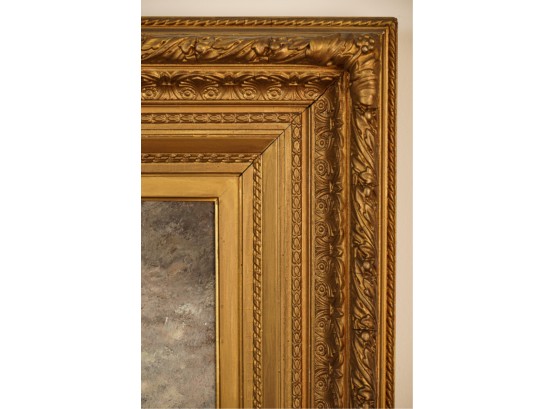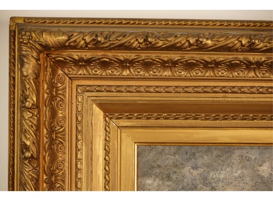 Housed in gilt frame. Oil on canvas. Signed bottom left. 23 1/2 x 29 1/2 inches.