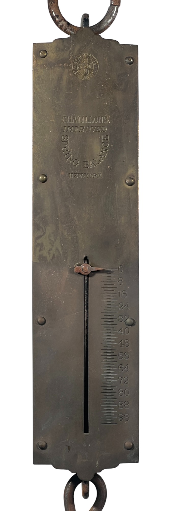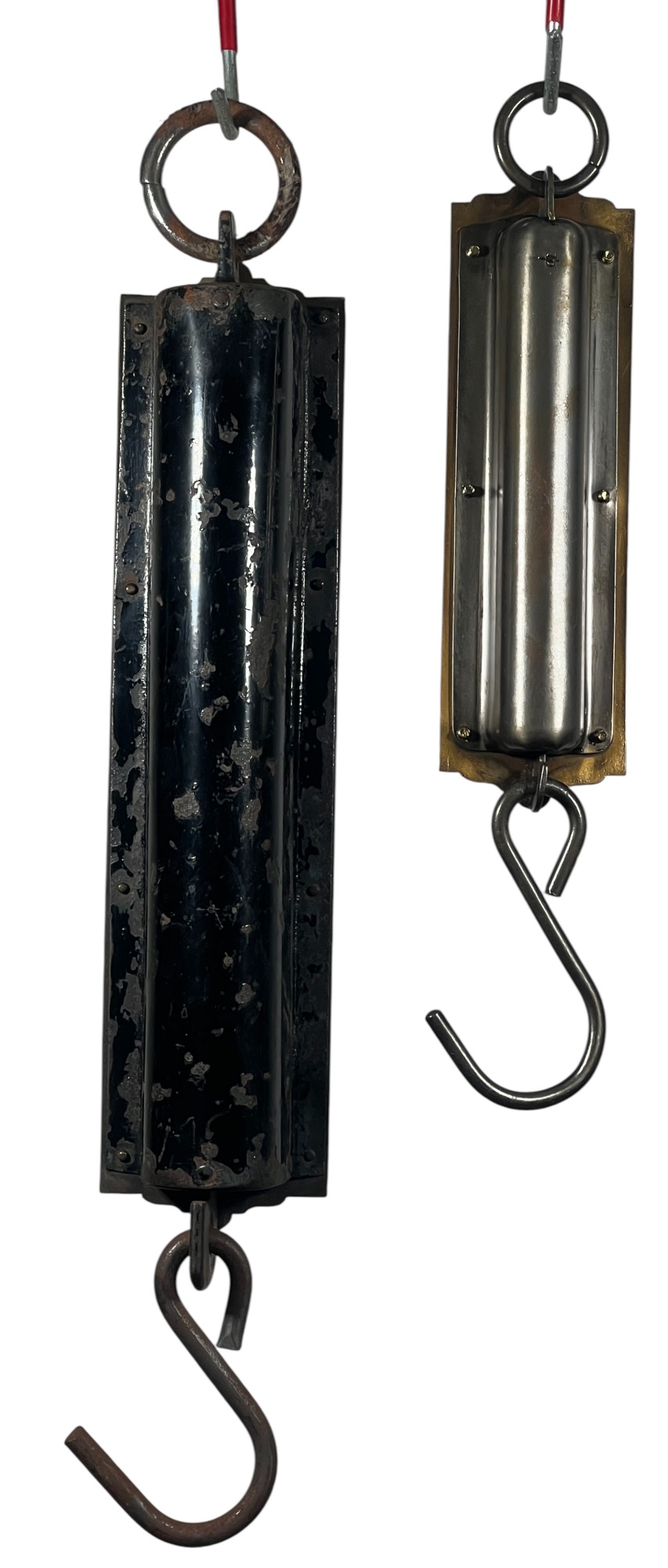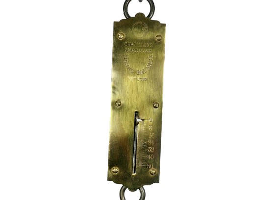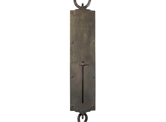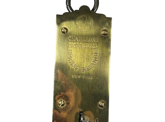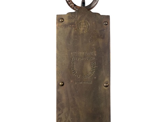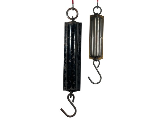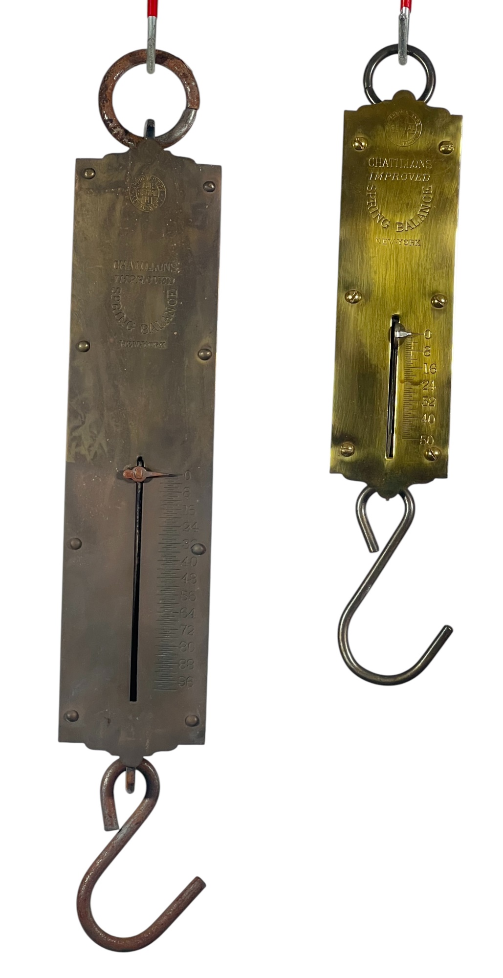 Chatillons brass & iron spring scales, (50) and (100) pound examples. 18 1/2 x 3 inches. Condition: Good. Temp No 8813