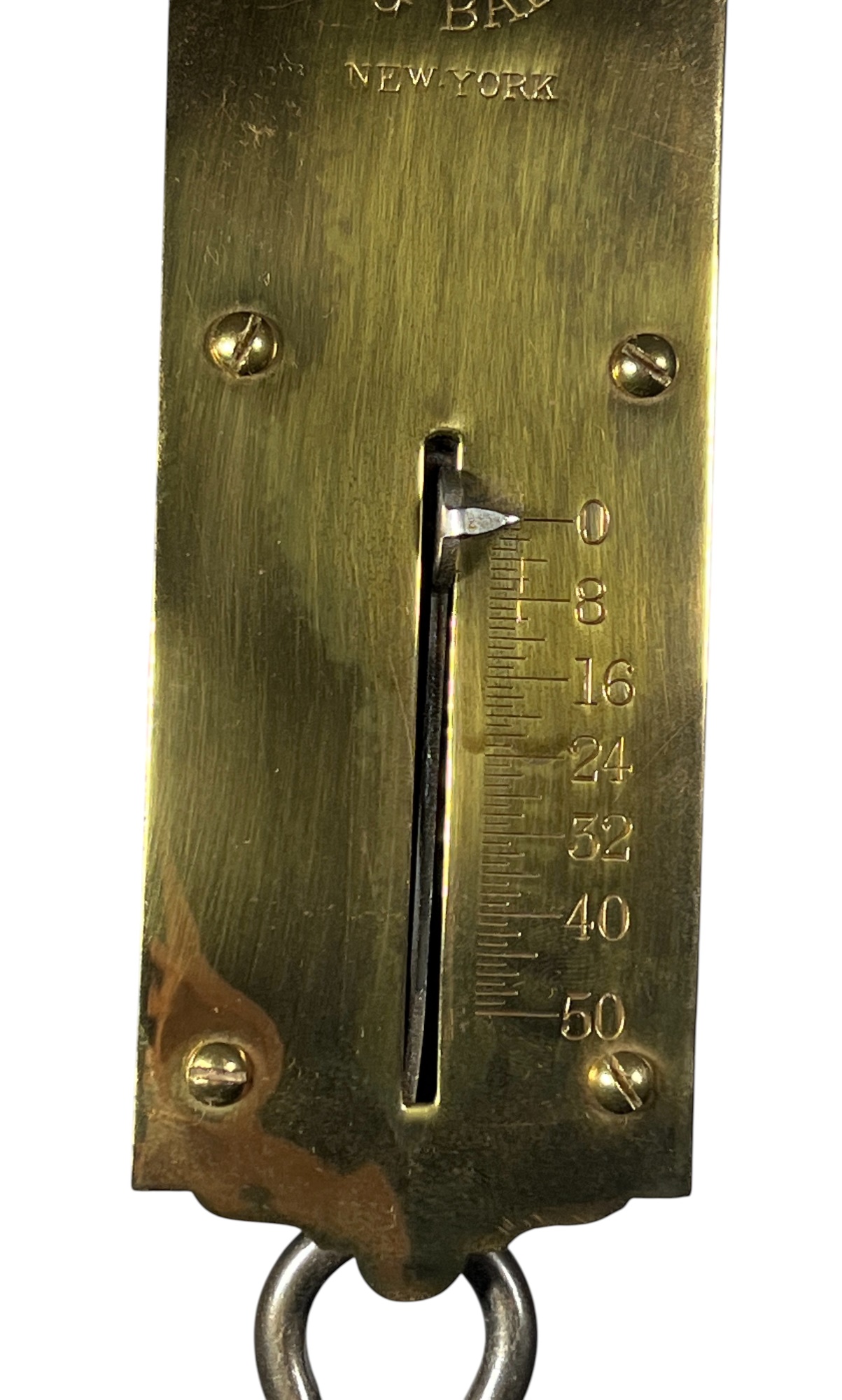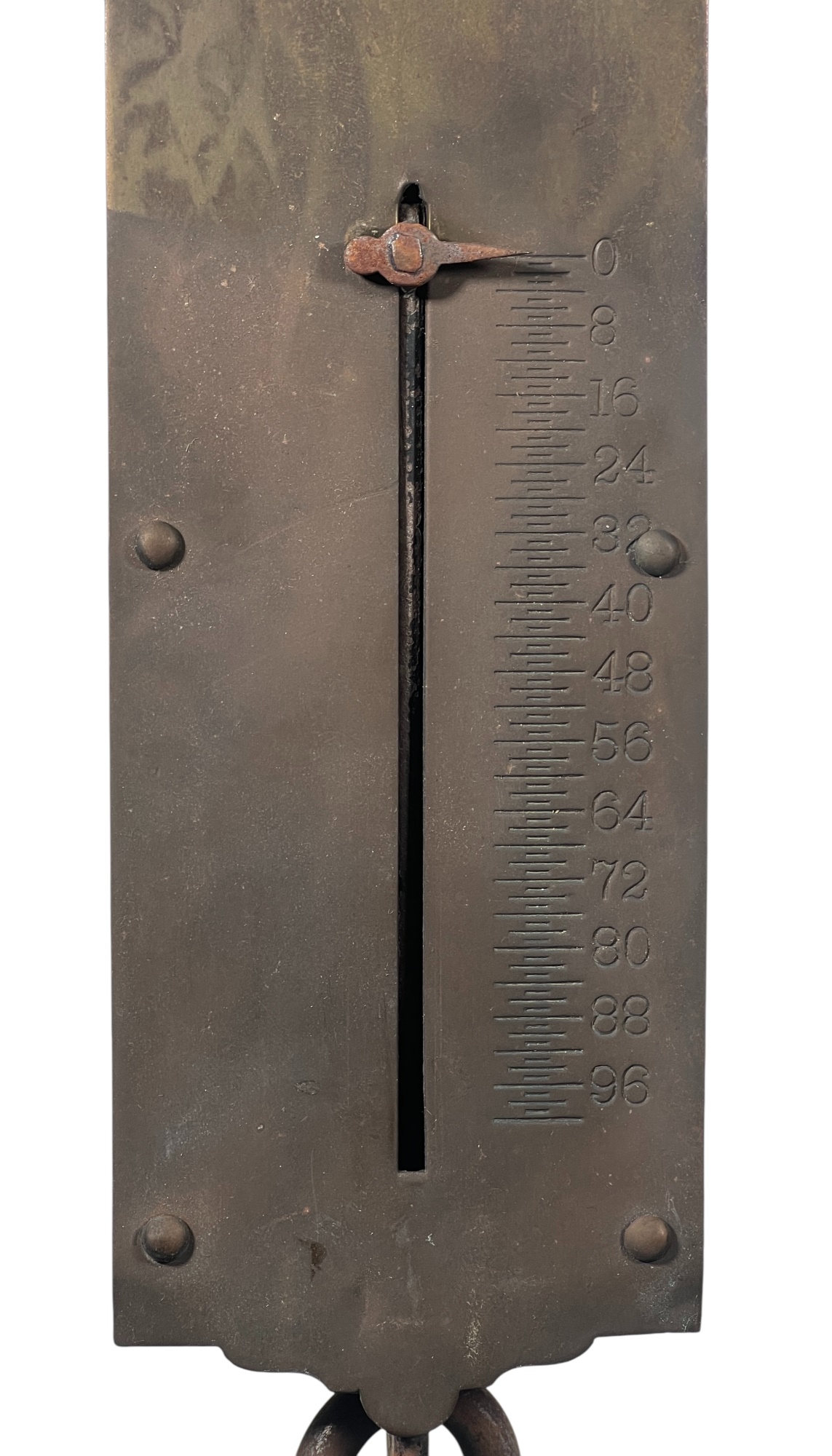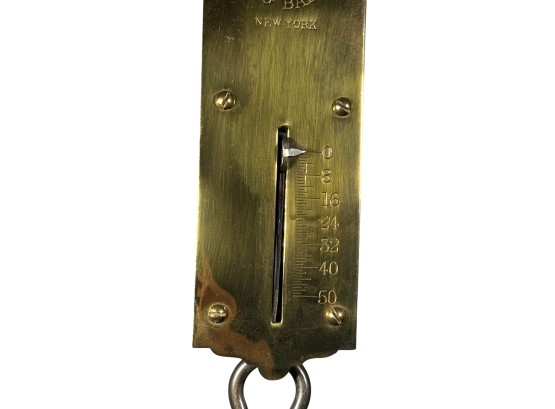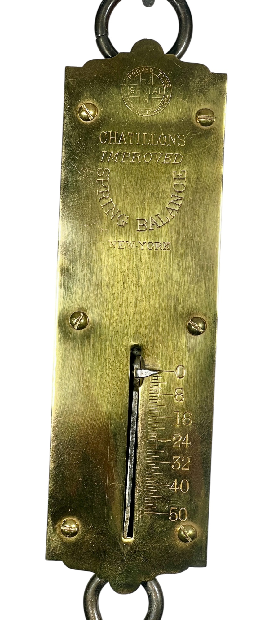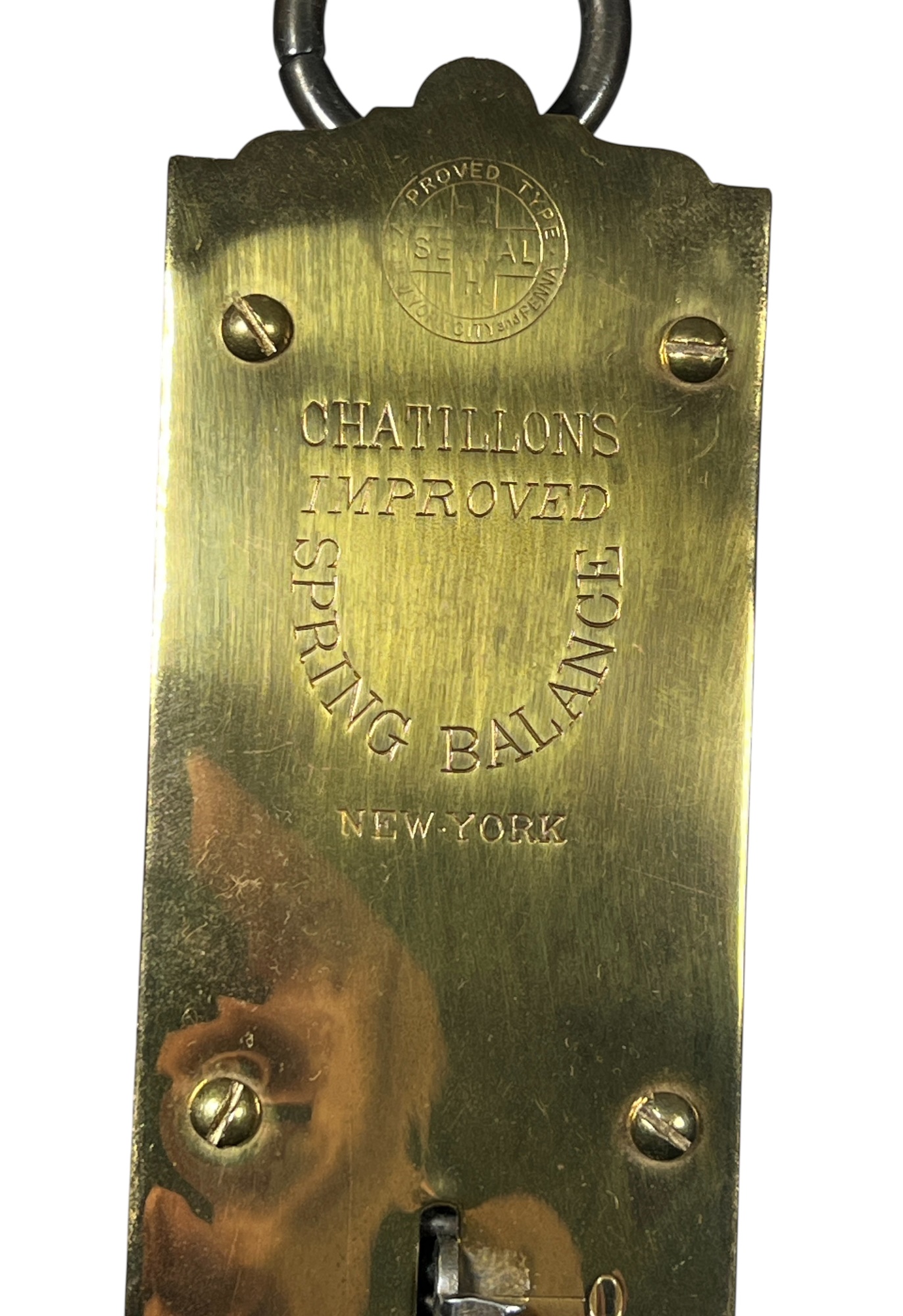 Chatillons brass & iron spring scales, (50) and (100) pound examples. 18 1/2 x 3 inches. Condition: Good. Temp No 8813