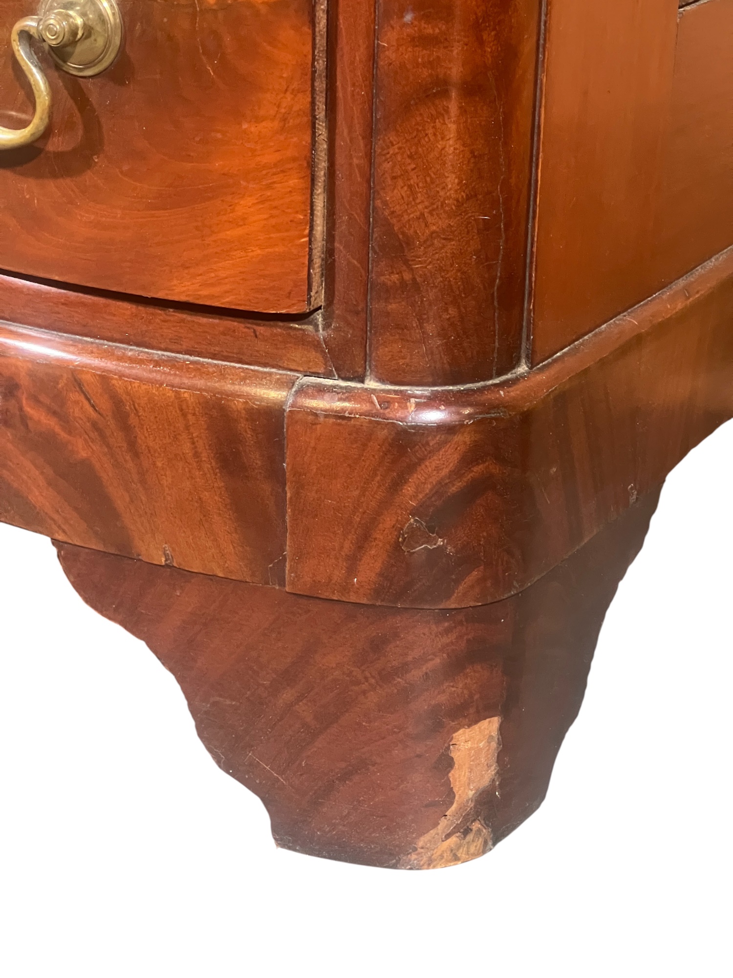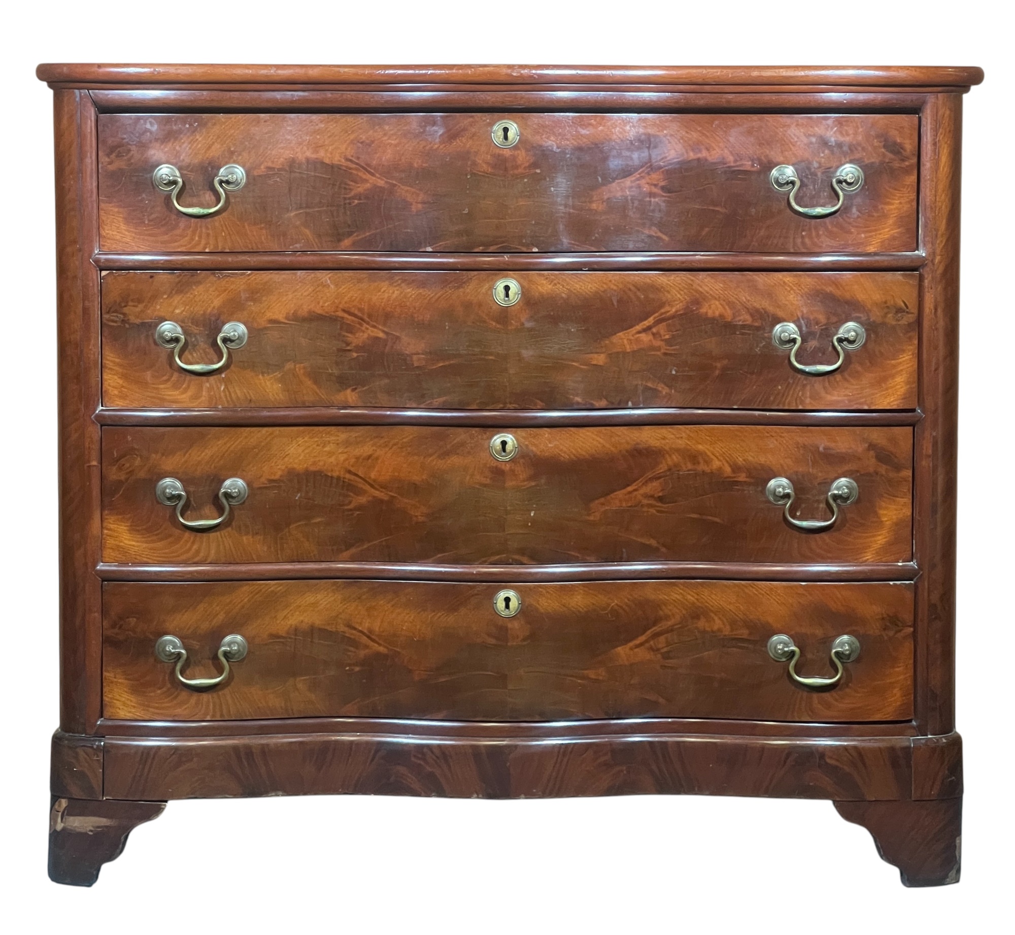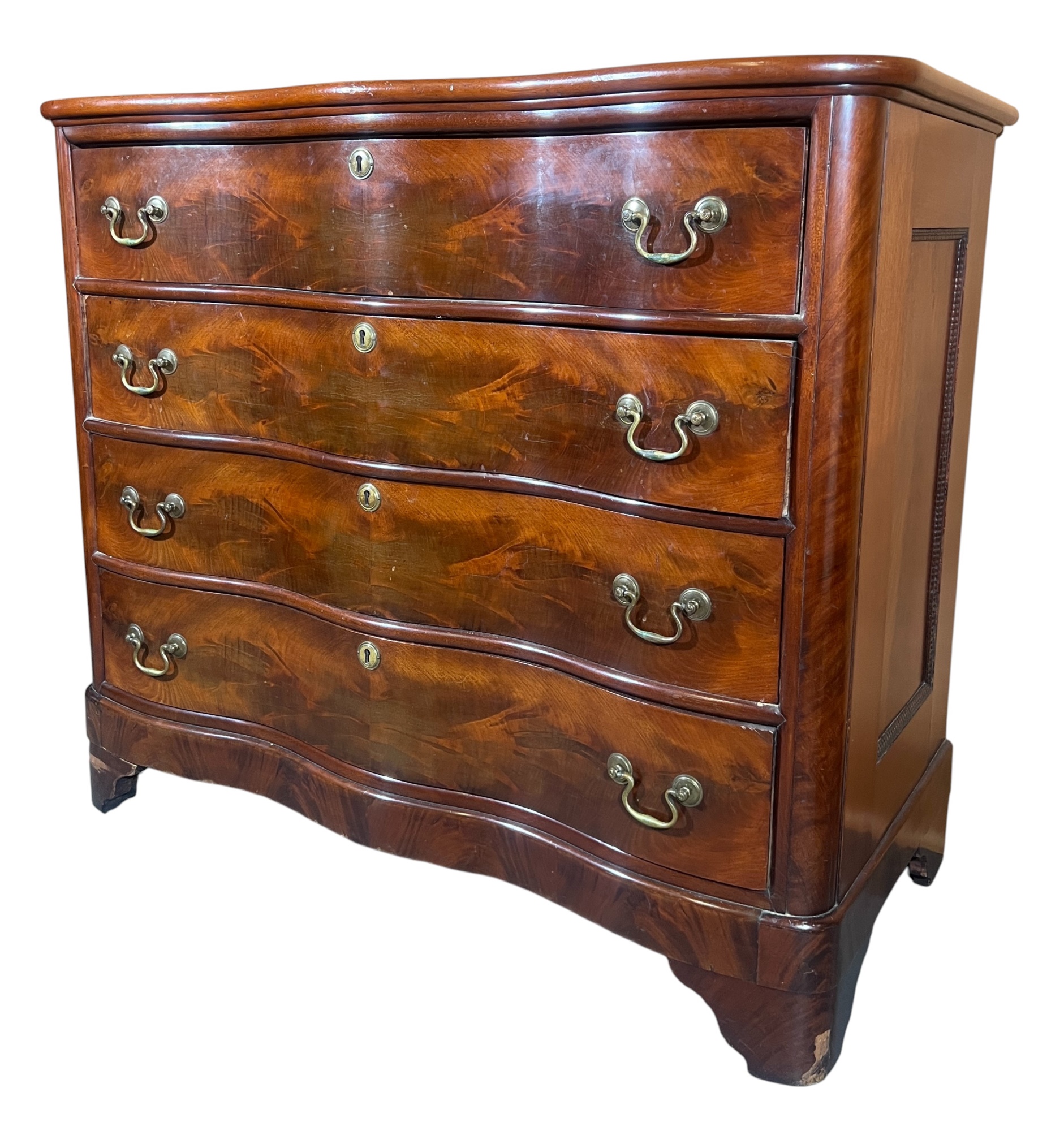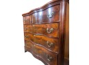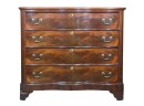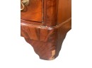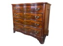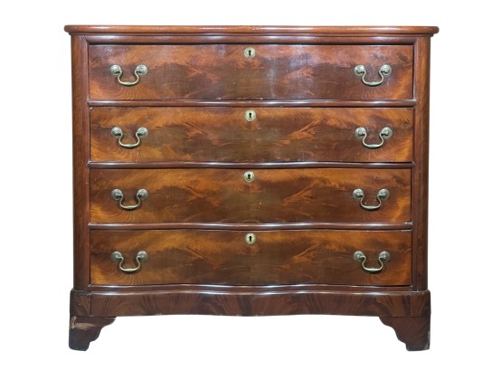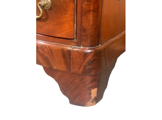 Shaped top, paneled sides, dovetail construction, ogee feet, figured mahogany. 36 1/2 x 42 x 20 inches. Condition: Base in need of repair, missing piece of veneer present in drawer. Temp No 8841