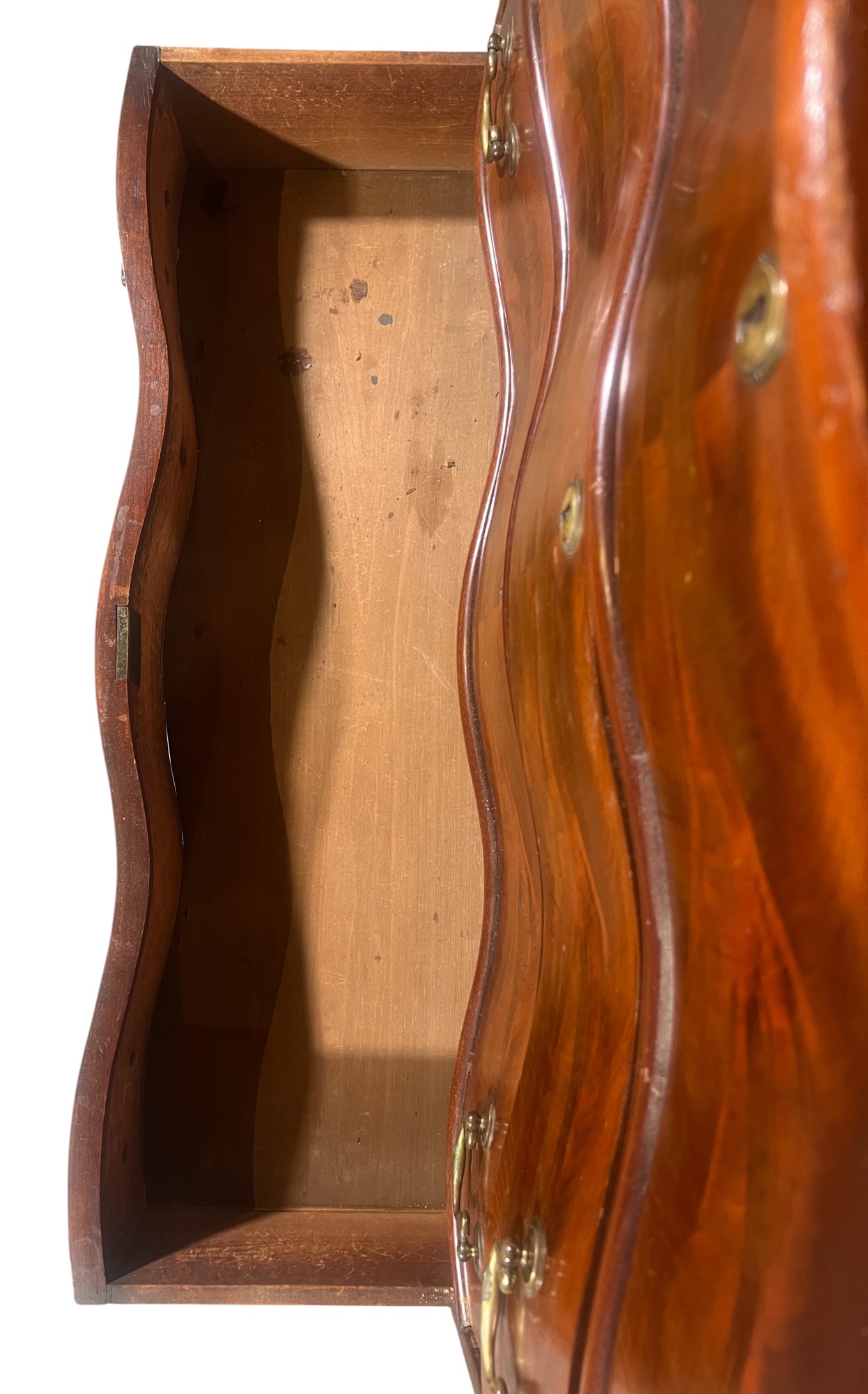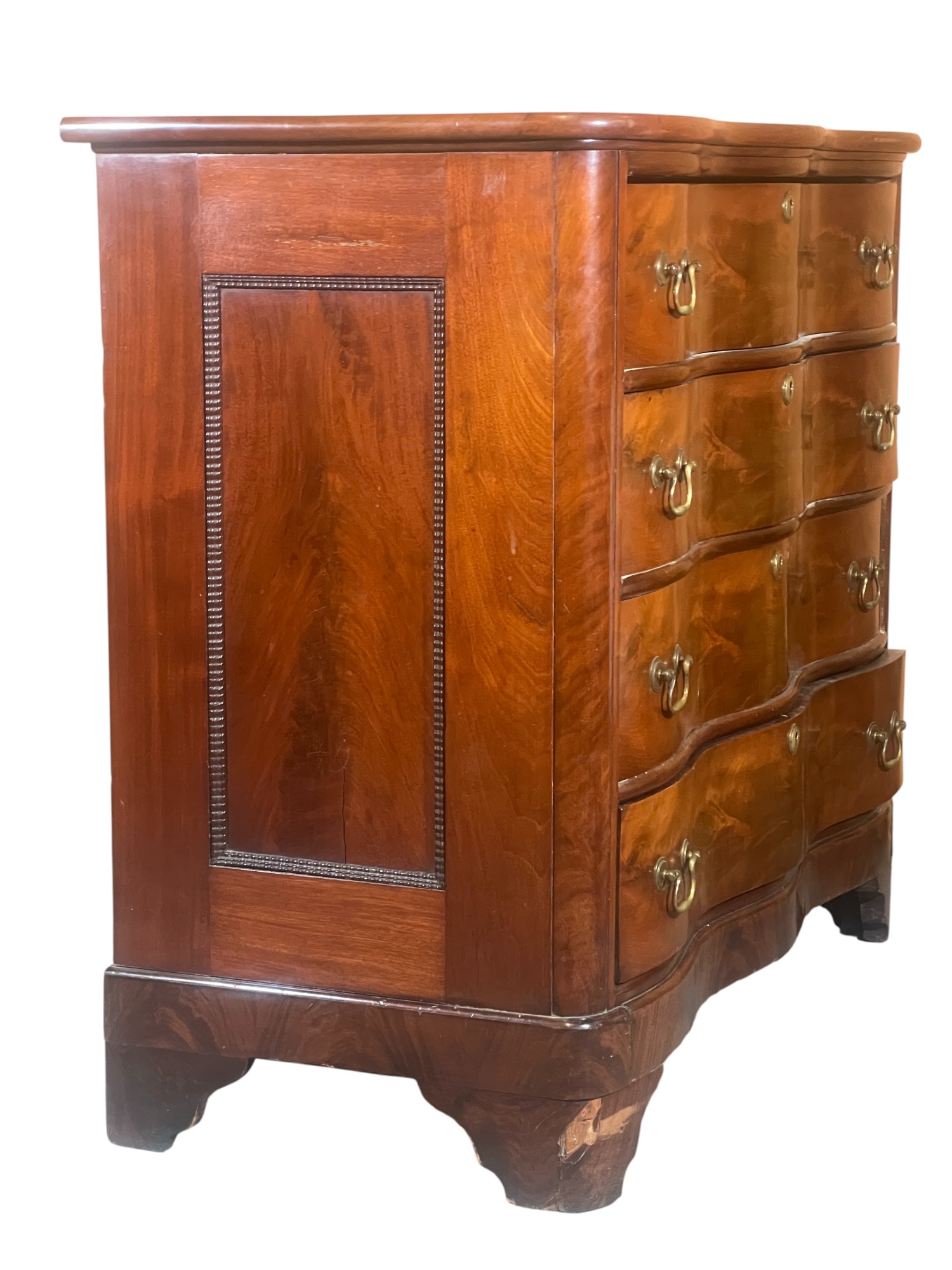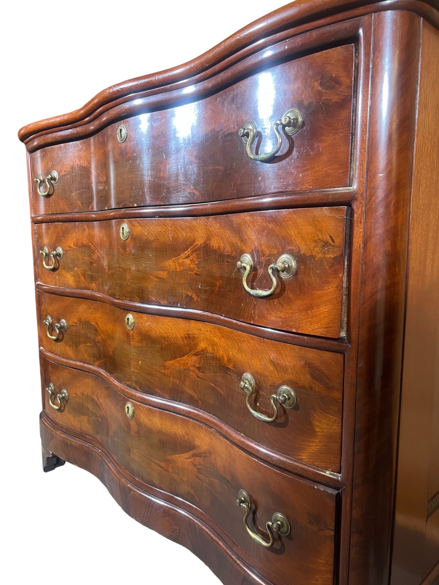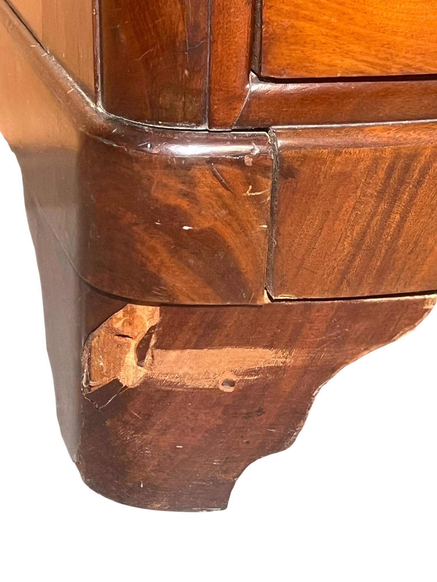 Shaped top, paneled sides, dovetail construction, ogee feet, figured mahogany. 36 1/2 x 42 x 20 inches. Condition: Base in need of repair, missing piece of veneer present in drawer. Temp No 8841