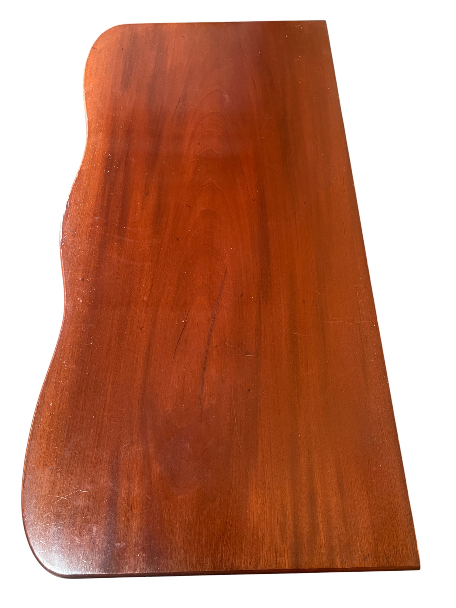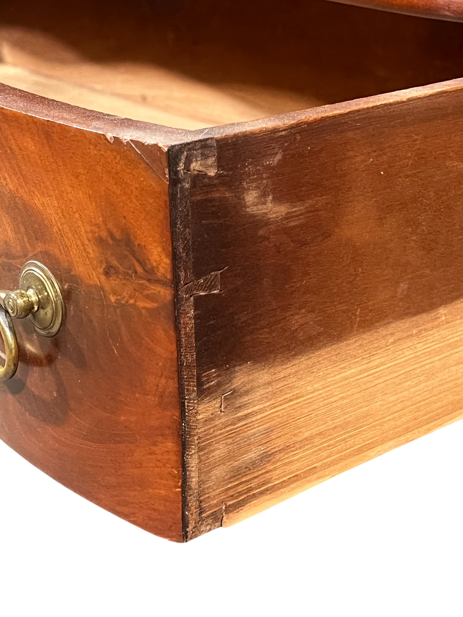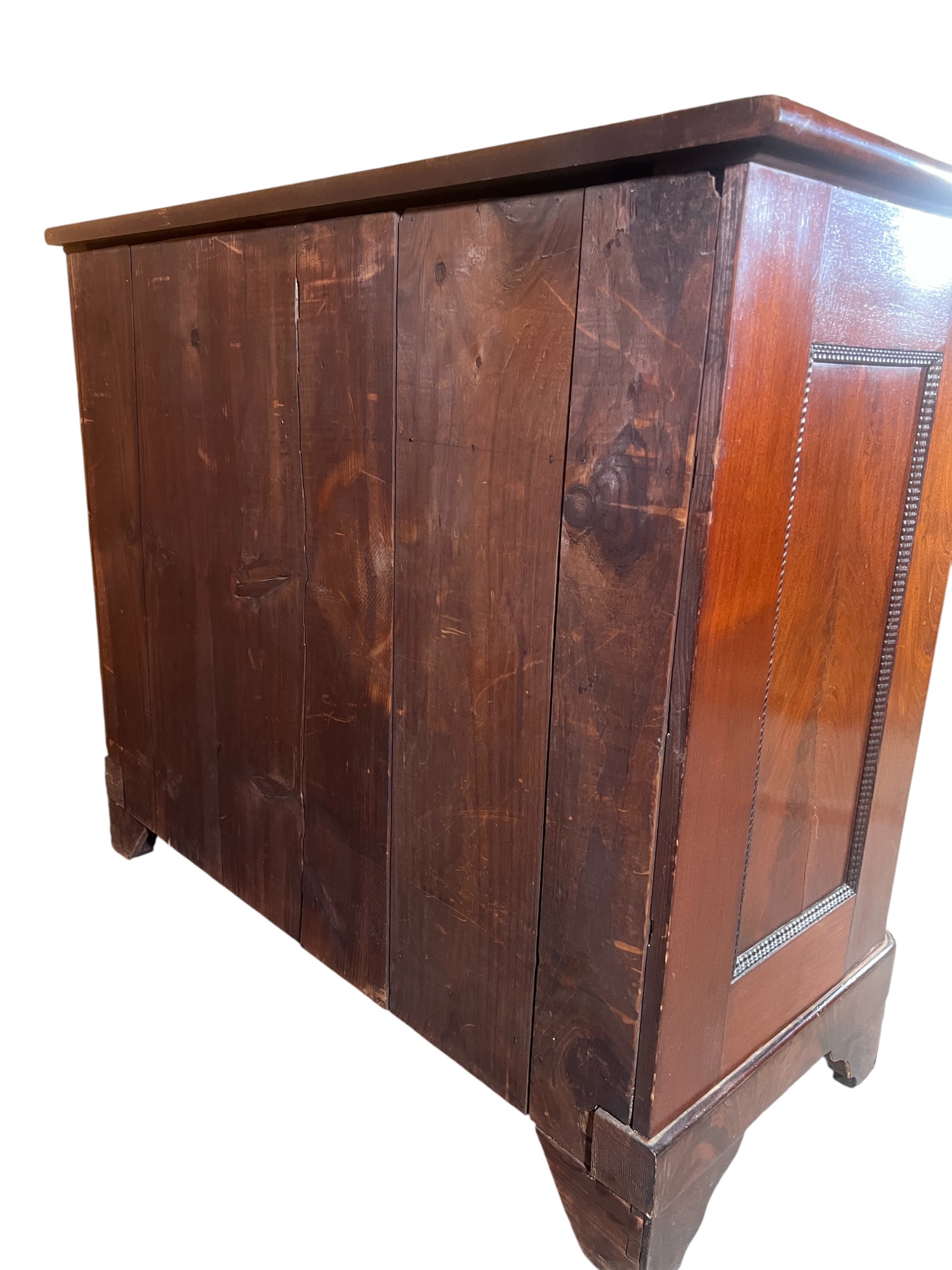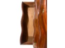 Shaped top, paneled sides, dovetail construction, ogee feet, figured mahogany. 36 1/2 x 42 x 20 inches. Condition: Base in need of repair, missing piece of veneer present in drawer. Temp No 8841