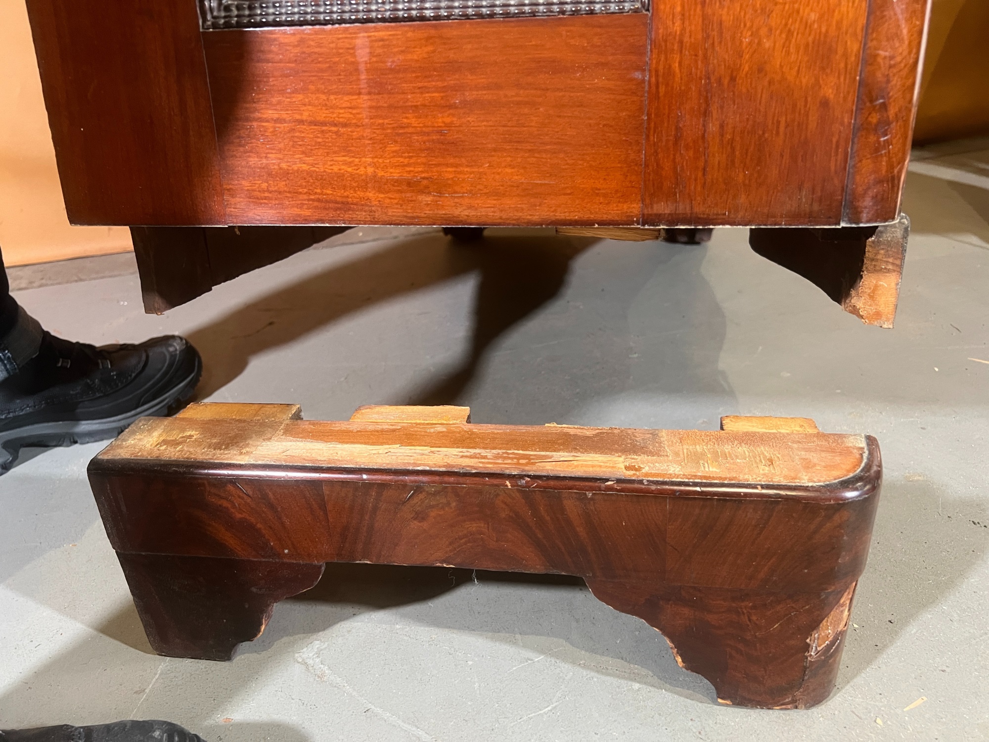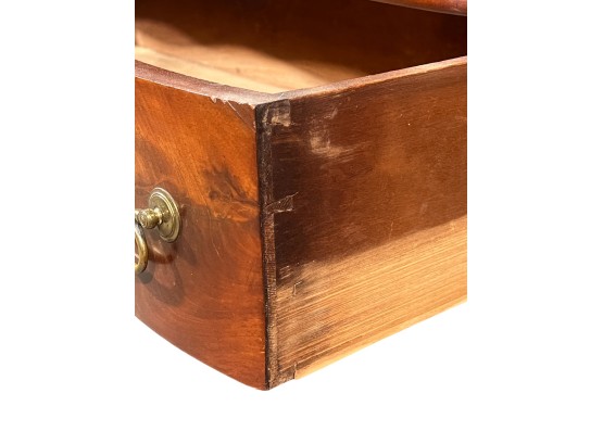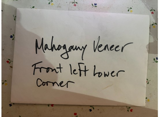 Notes: Base in need of repair, missing piece of veneer present in drawer.