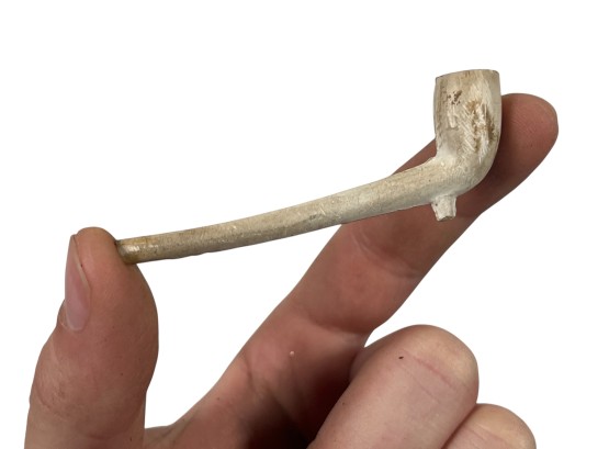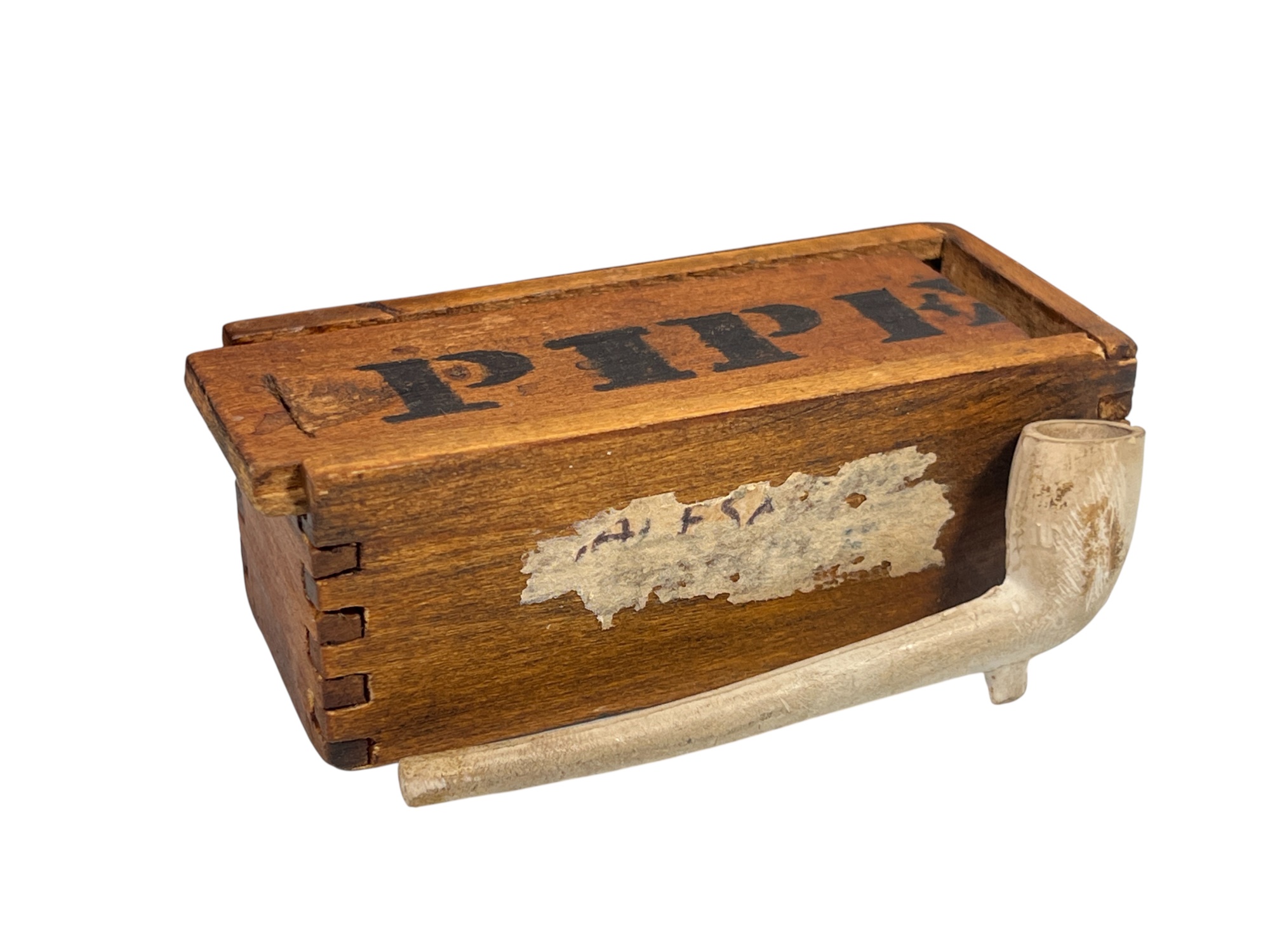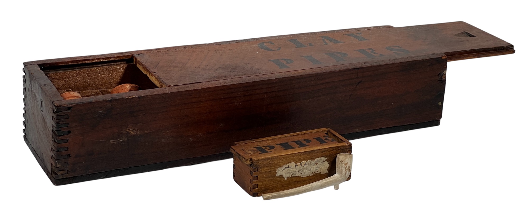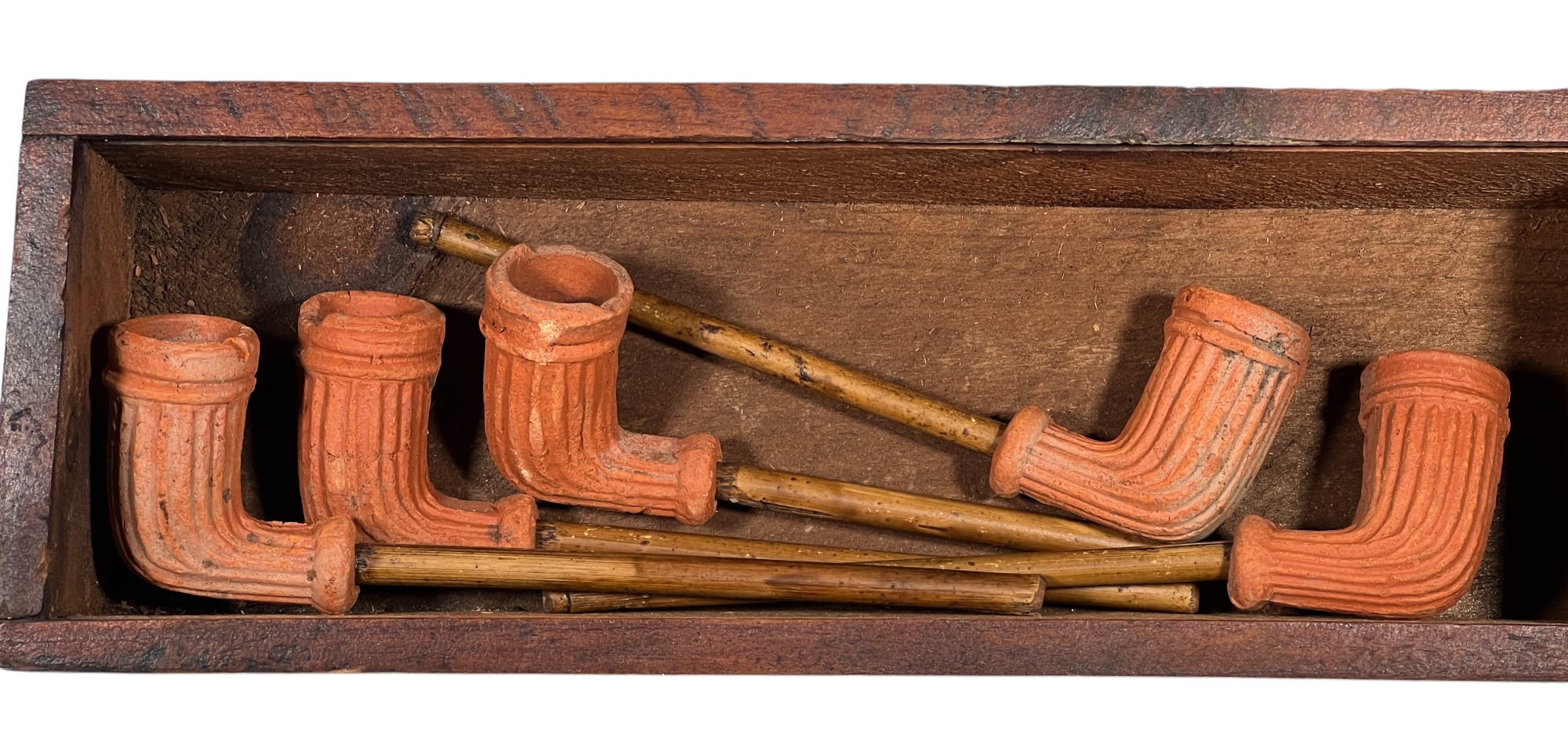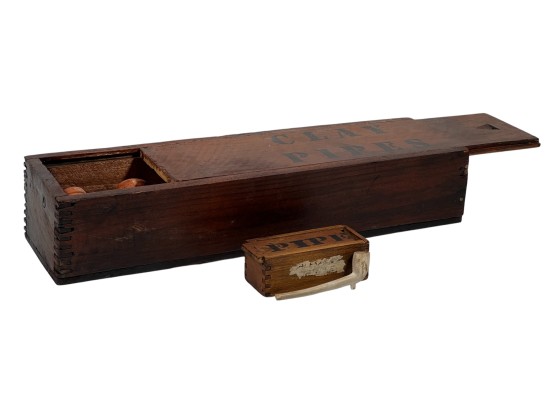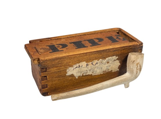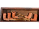 (5) clay pipes in custom wooden box with stenciled lettering and a miniature meerschaum pipe in similar box. 2 1/2 x 13 x 3 3/4 inches. Condition: Good, small loss to (1) pipe. Temp No 8568