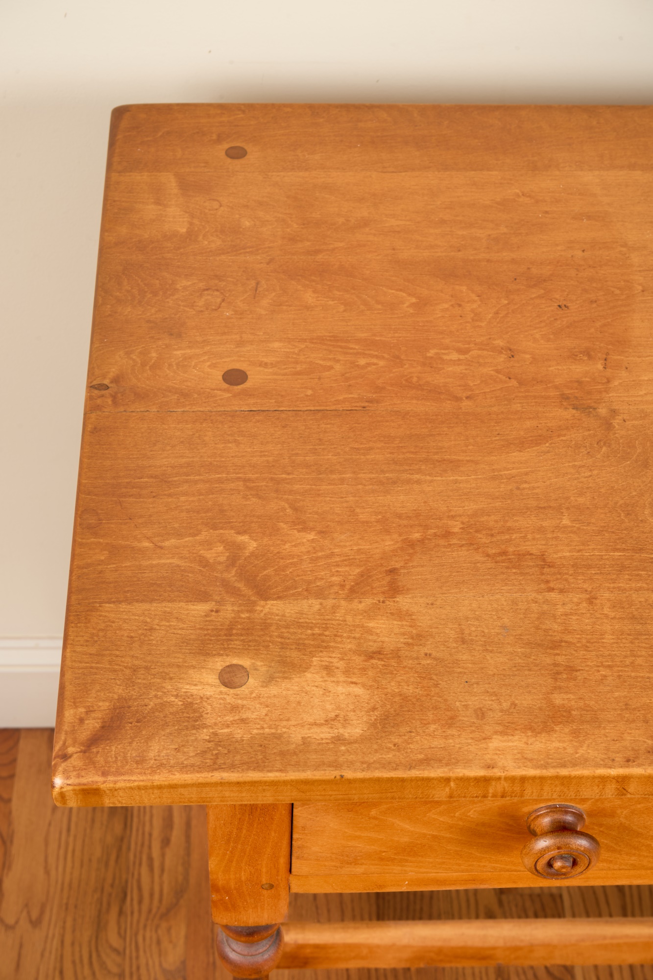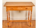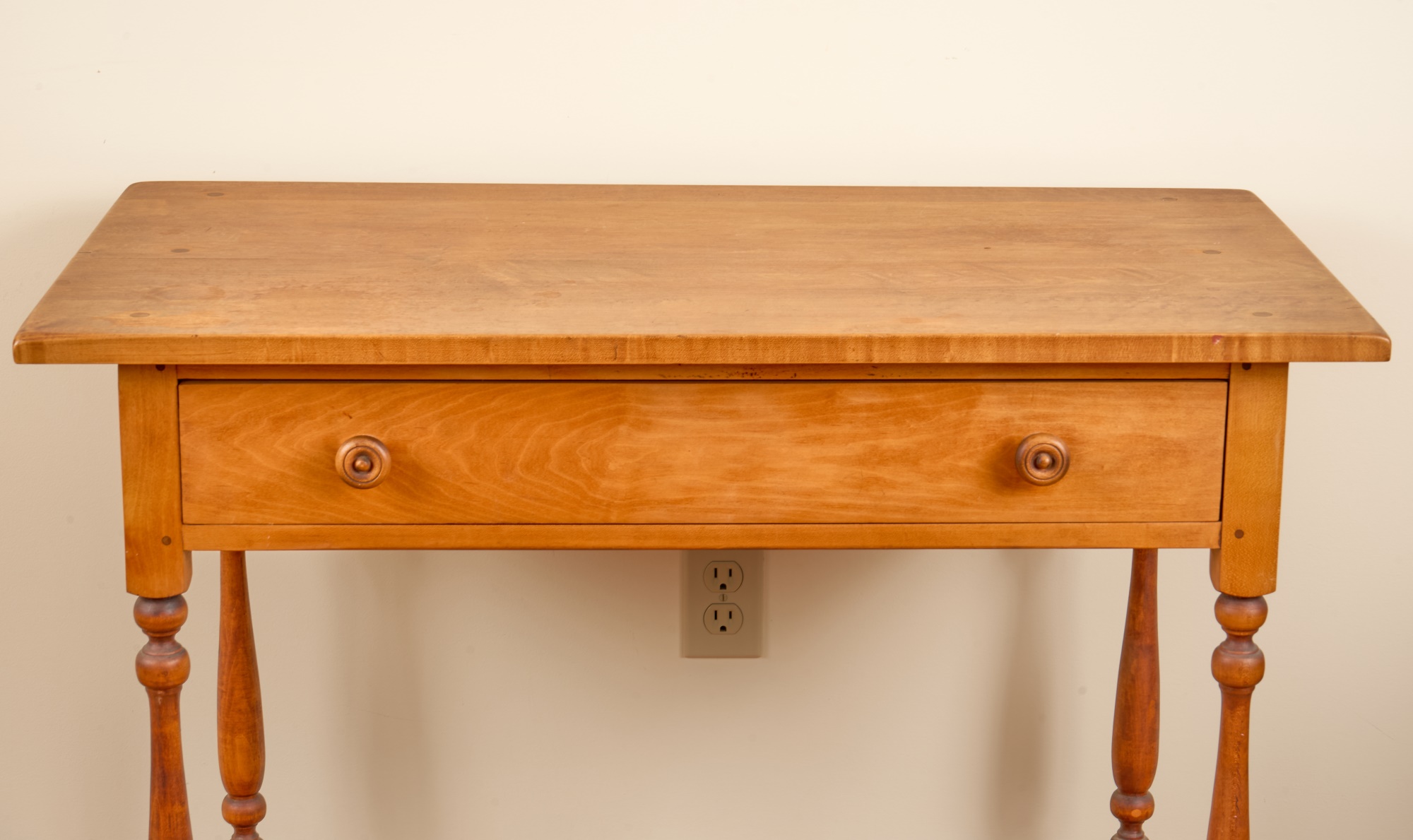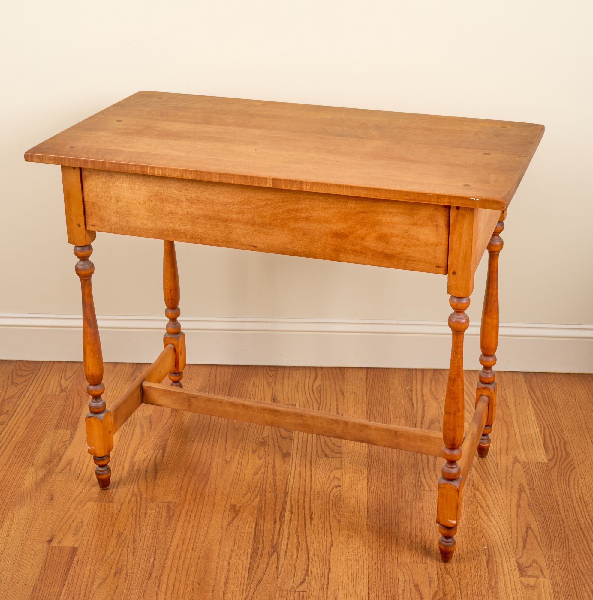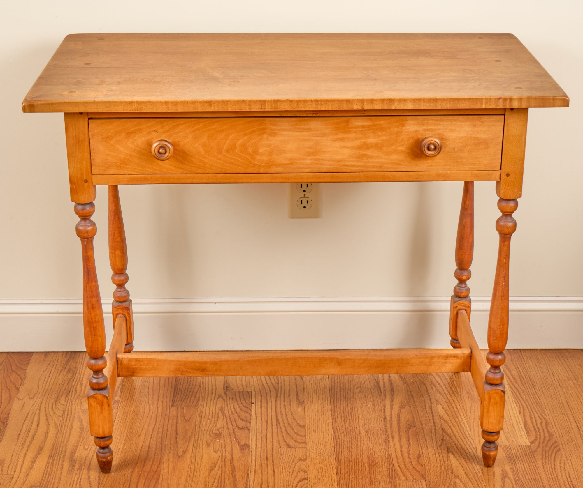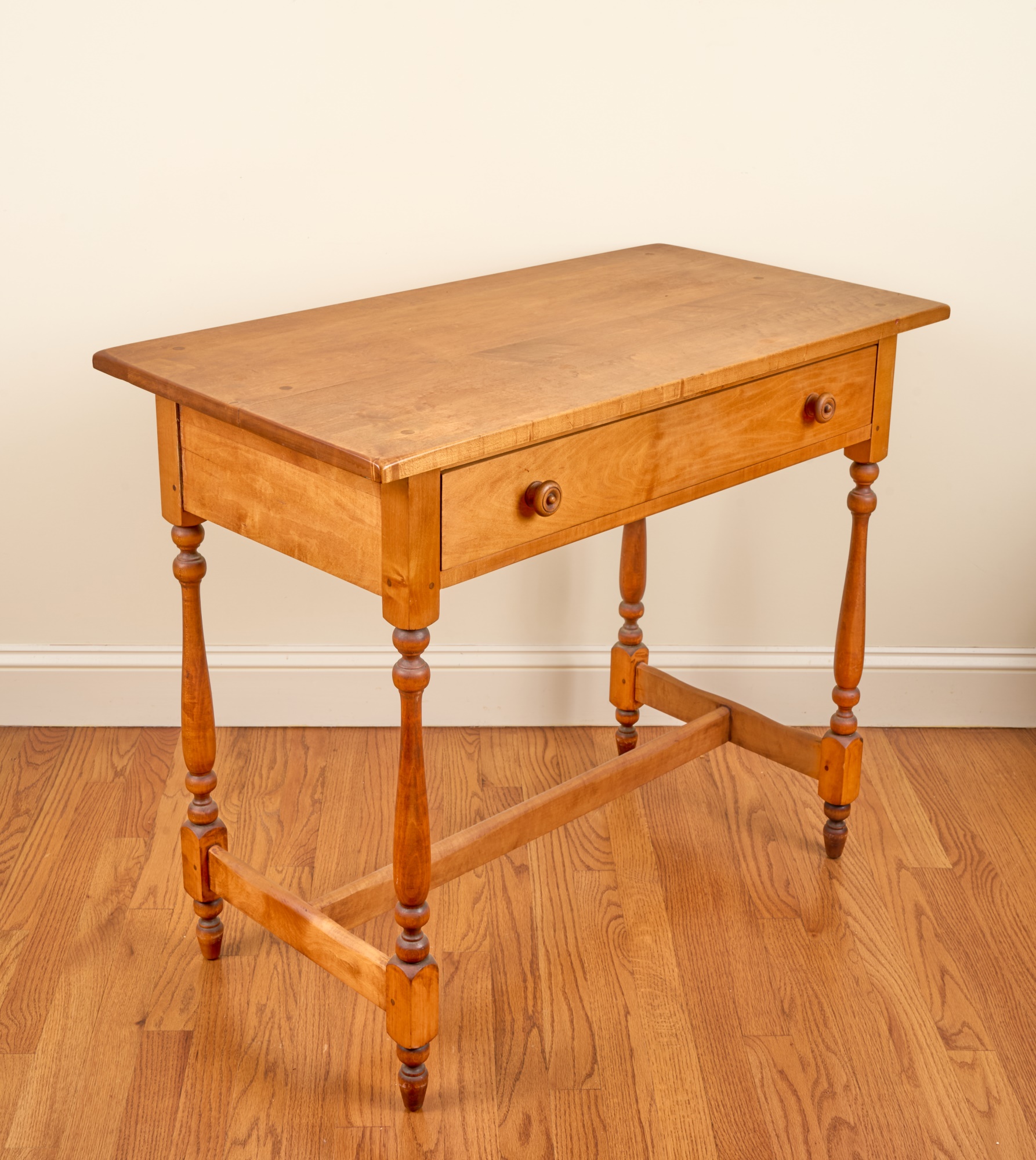Single drawer raised on turned legs which are supported by an H stretcher. 30 x 36 x 19 inches Condition: Finish inconsistencies