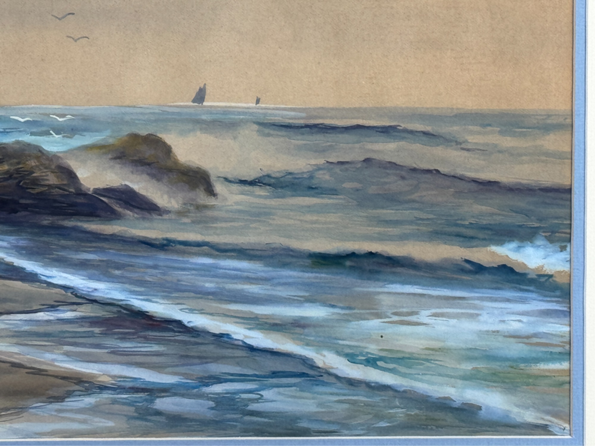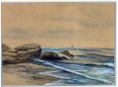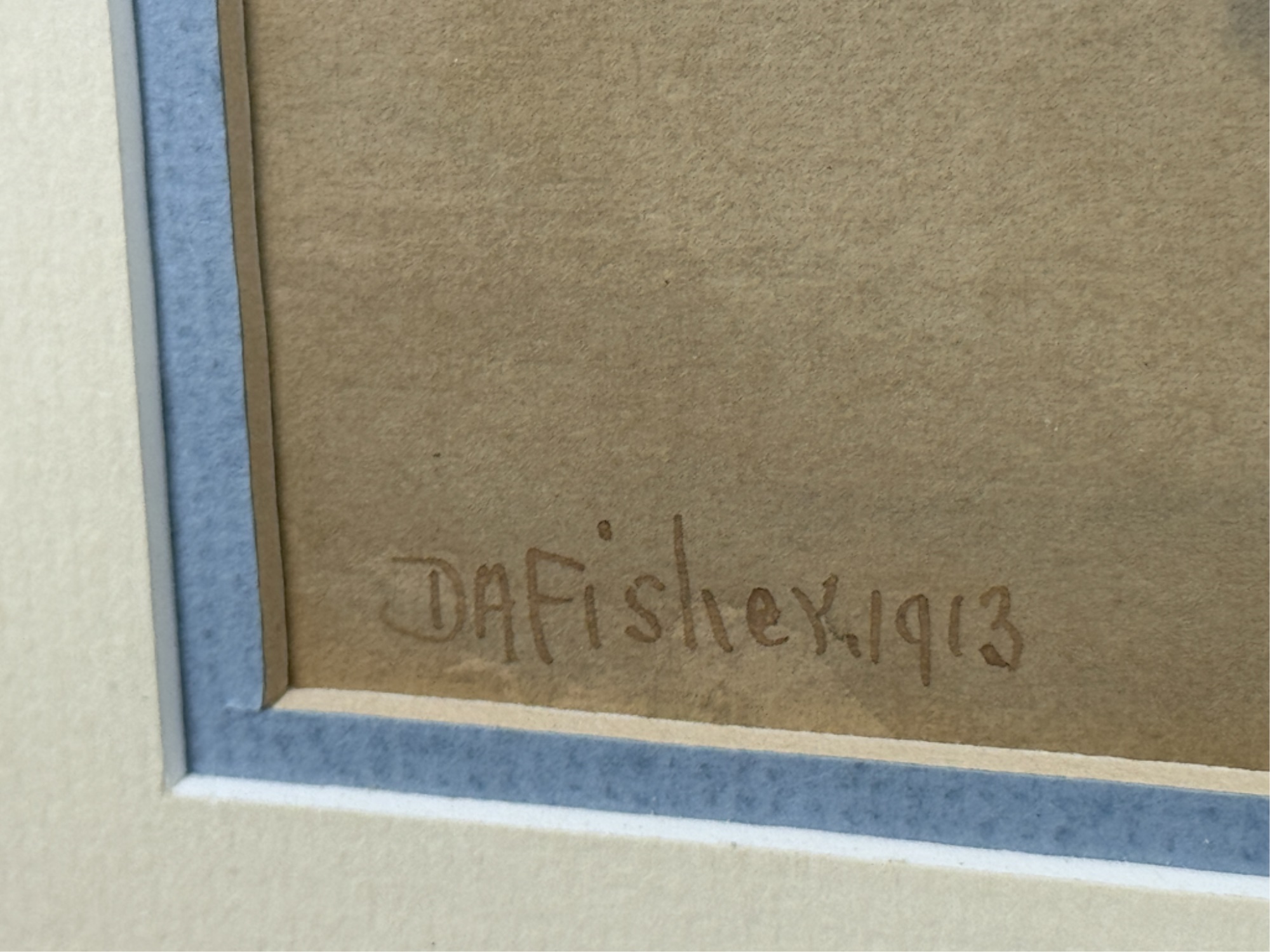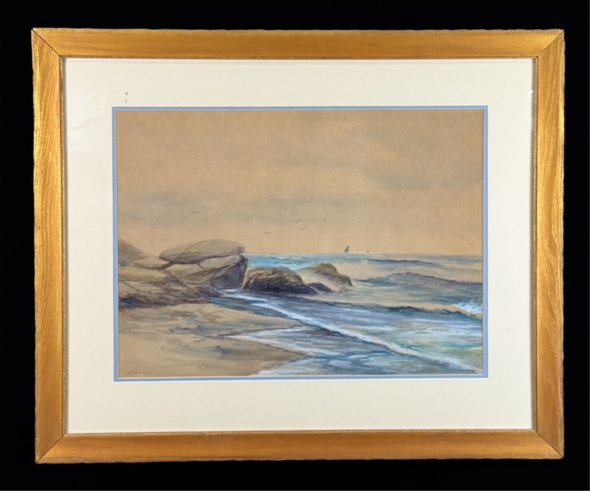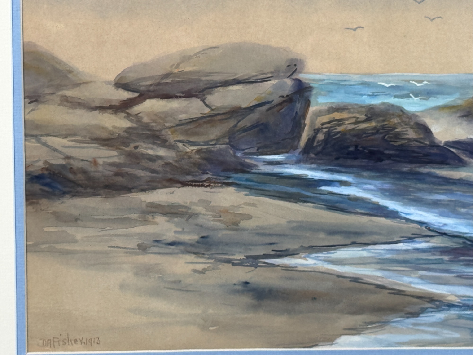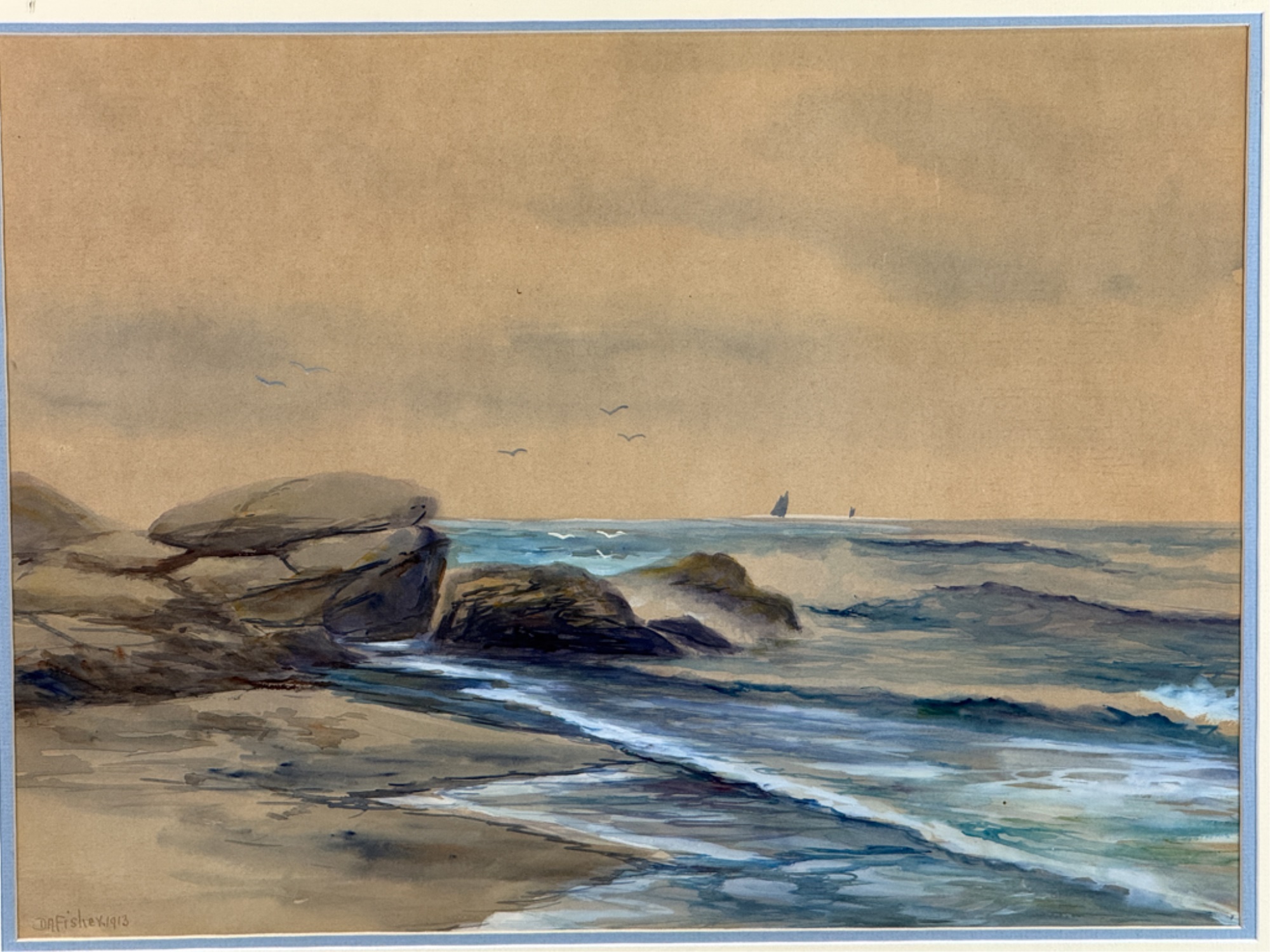 A landscape painter from Portland, Maine, D. A. Fisher was an employee of the Cumberland County Power and Light Company. Fisher appears to have spent most of his career in Portland, Maine. He was an itinerant artist who painted in the San Francisco Bay area in 1891 and at Mount Shasta in 1919. Water color on paper. Signed bottom left. Framed. 22 1/2 x 27 1/2 inches.