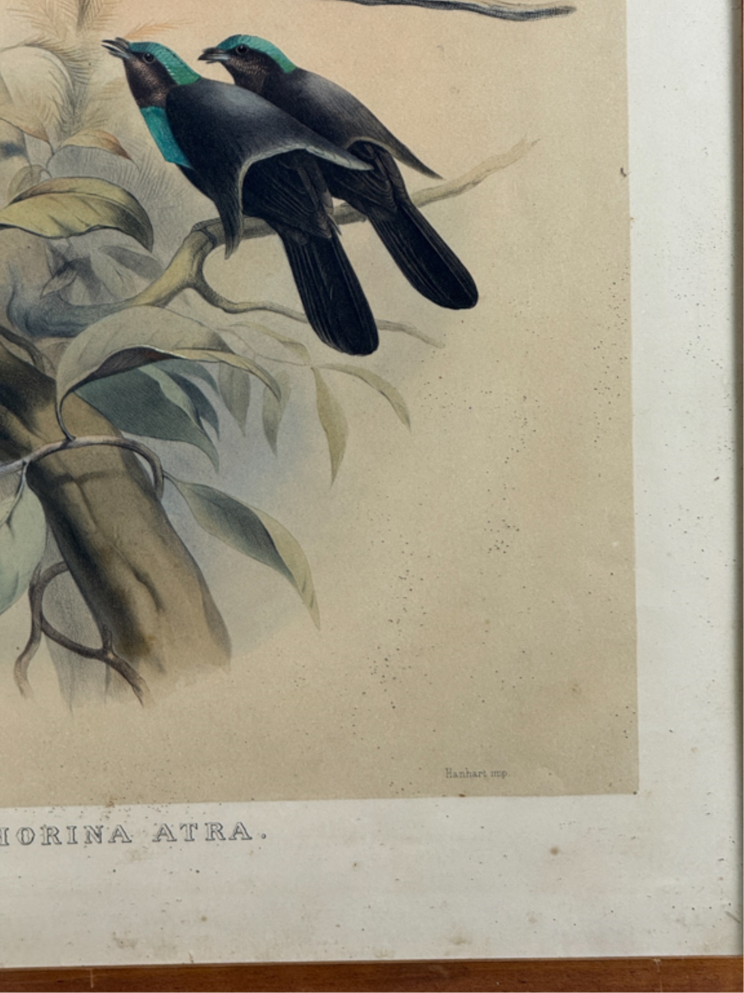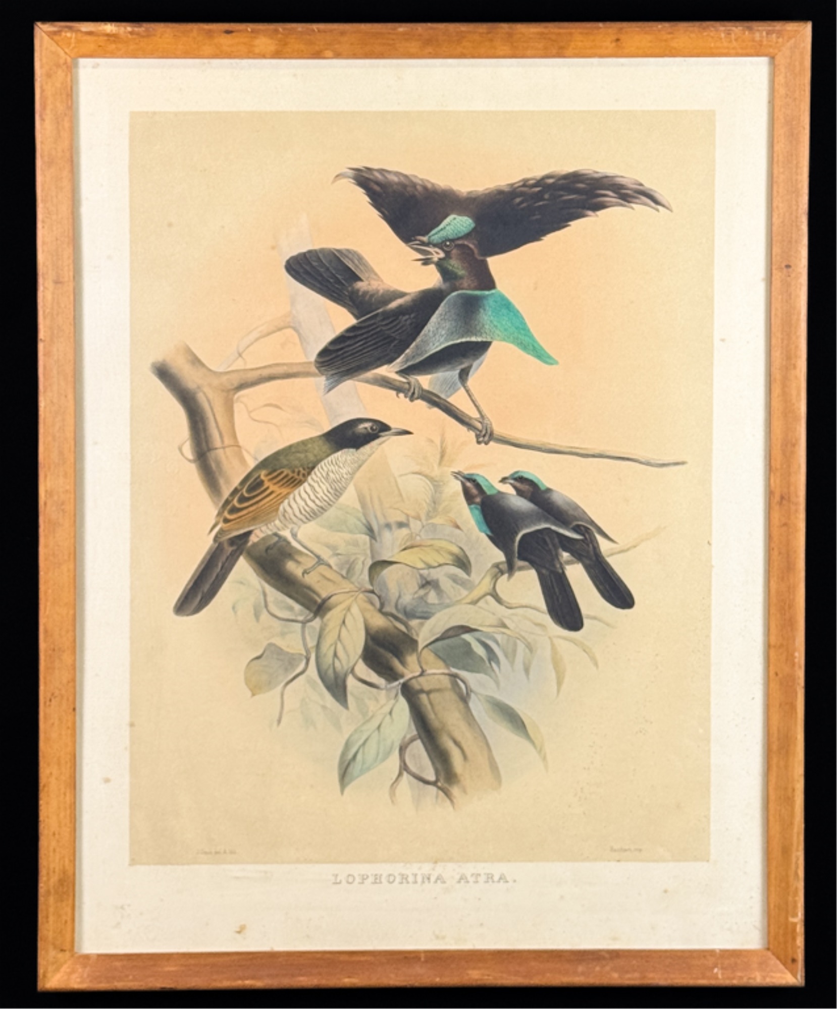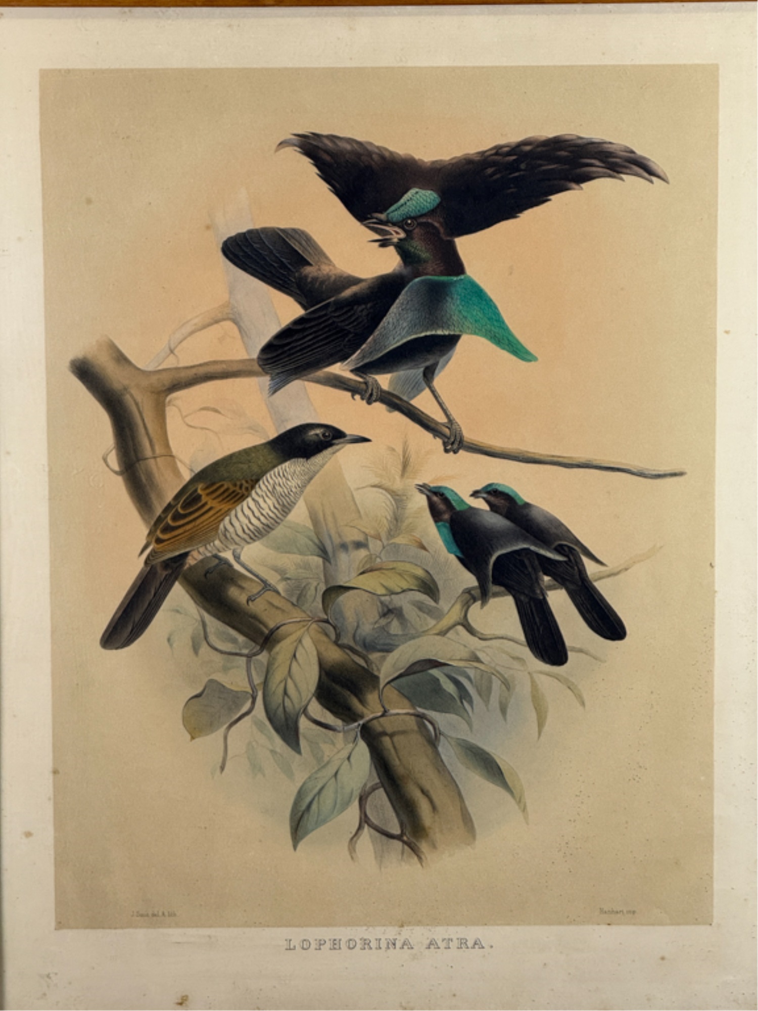 (19thc) Colored lithograph from "A Monograph of the Paradiseidae or Birds of Paradise". J. Wolf and J. Smith, del and lith; M and M Hanhart, imp. Framed. 27 1/2 x 21 3/4 inches. Condition: Dirt, grime. See photos.