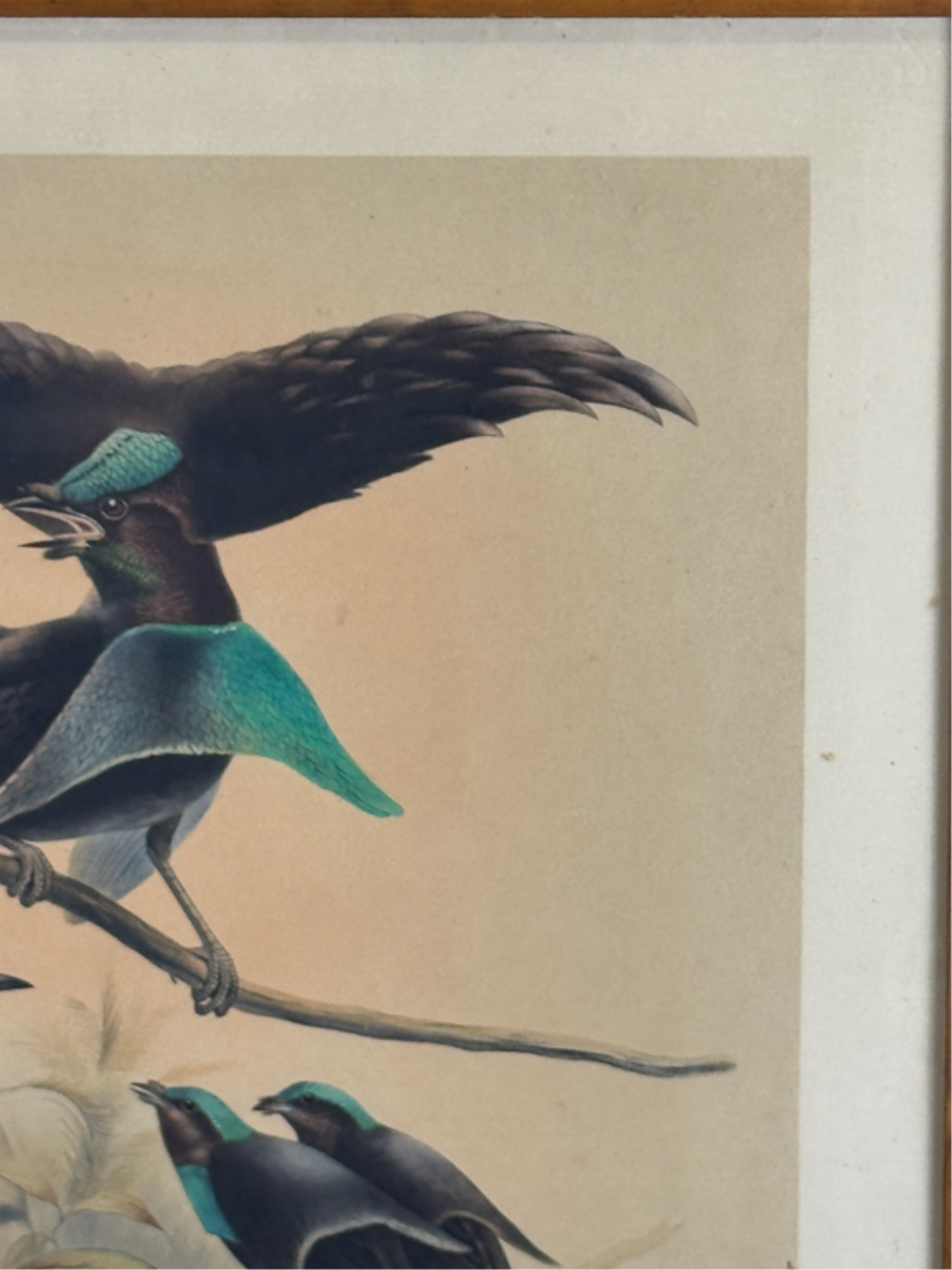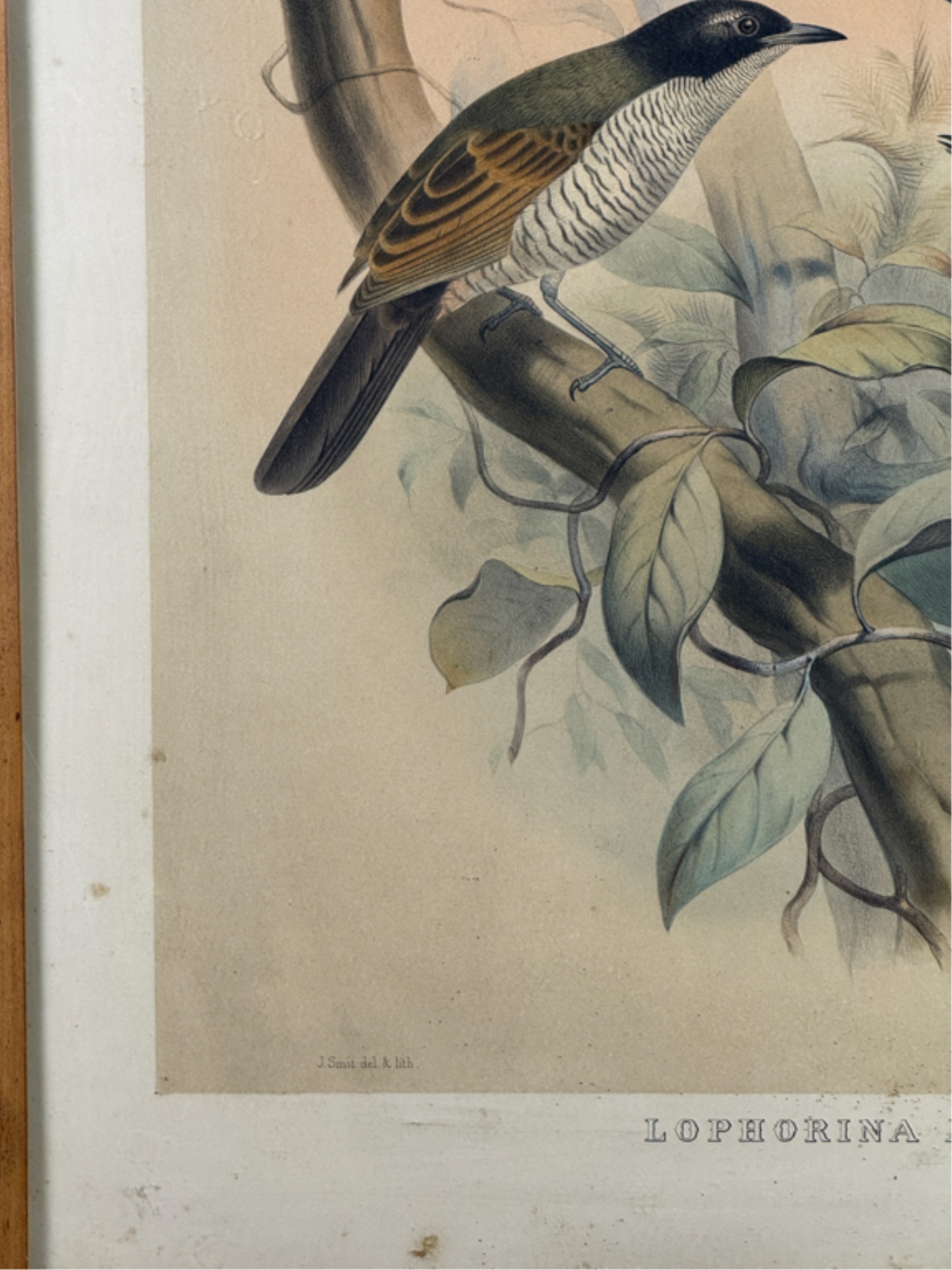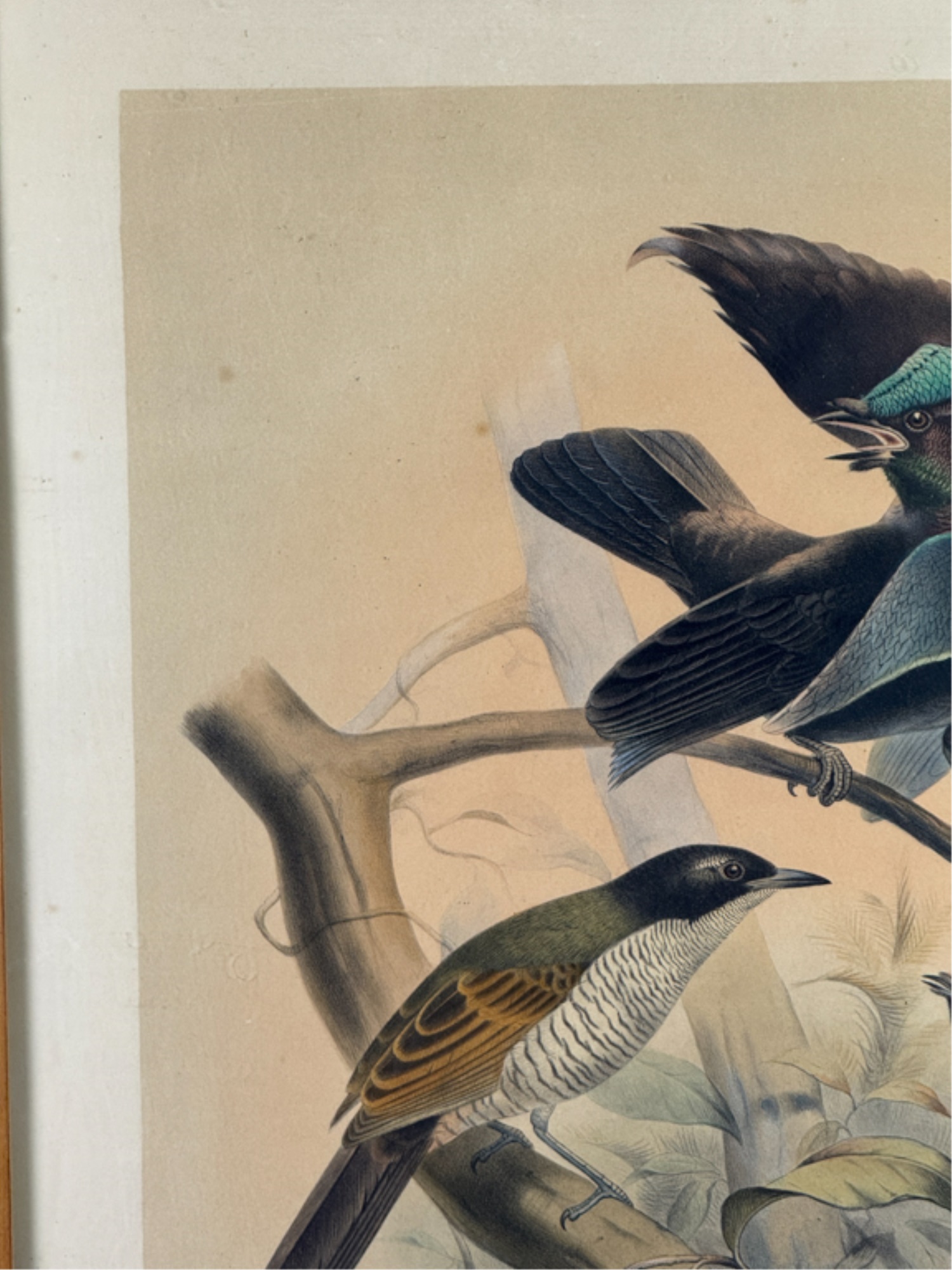 (19thc) Colored lithograph from "A Monograph of the Paradiseidae or Birds of Paradise". J. Wolf and J. Smith, del and lith; M and M Hanhart, imp. Framed. 27 1/2 x 21 3/4 inches. Condition: Dirt, grime. See photos.
