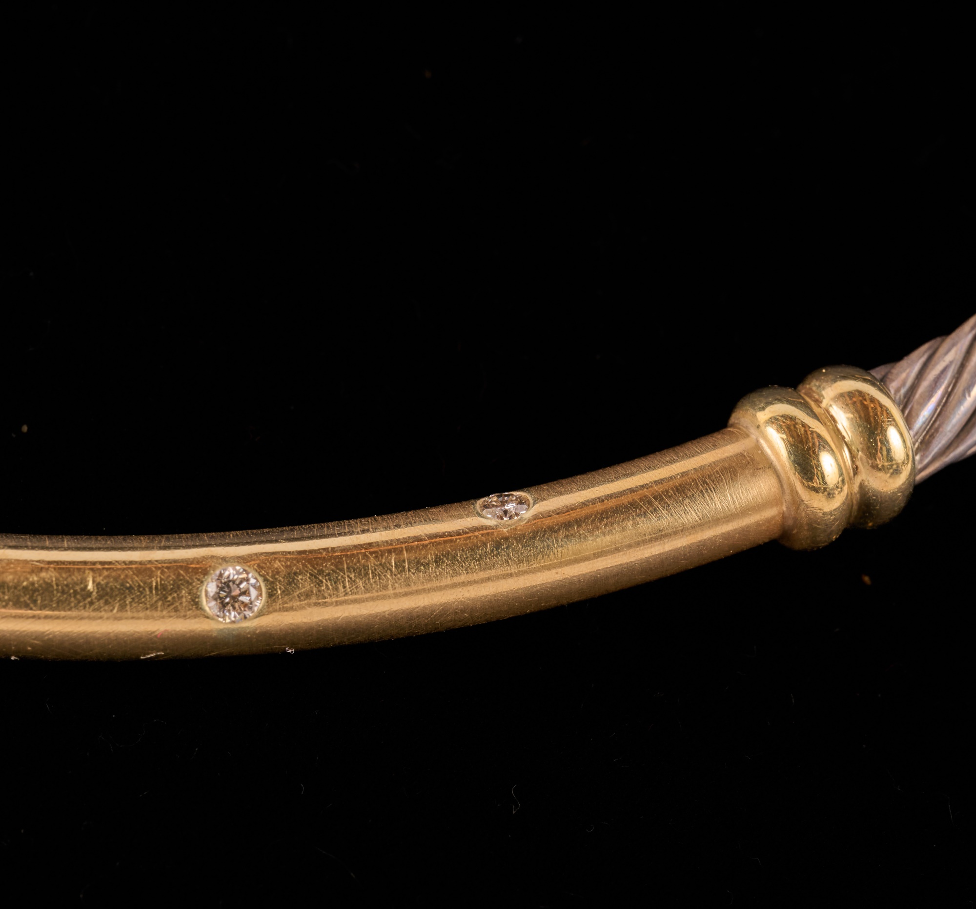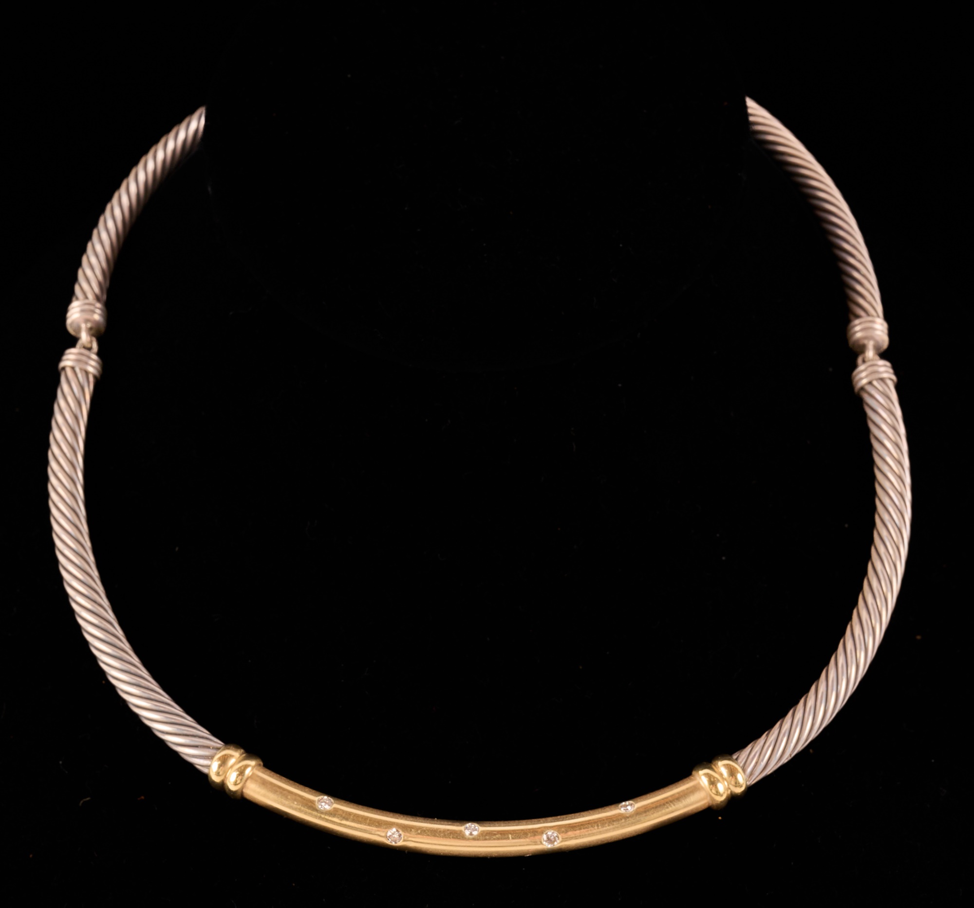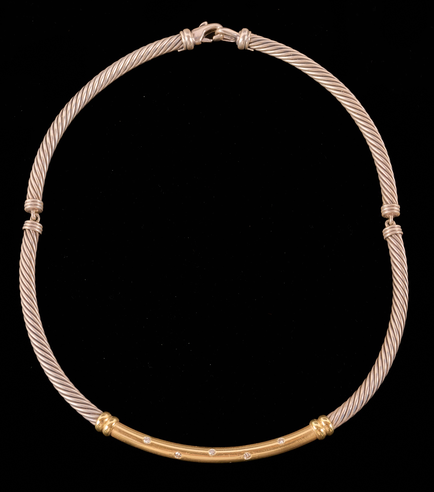Cable necklace / choker set with melee diamonds. (2) Quarters are linked. Approx 15 inches. Marked 925 and 585. 2.07 troy ounces (gross weight) Condition: Good