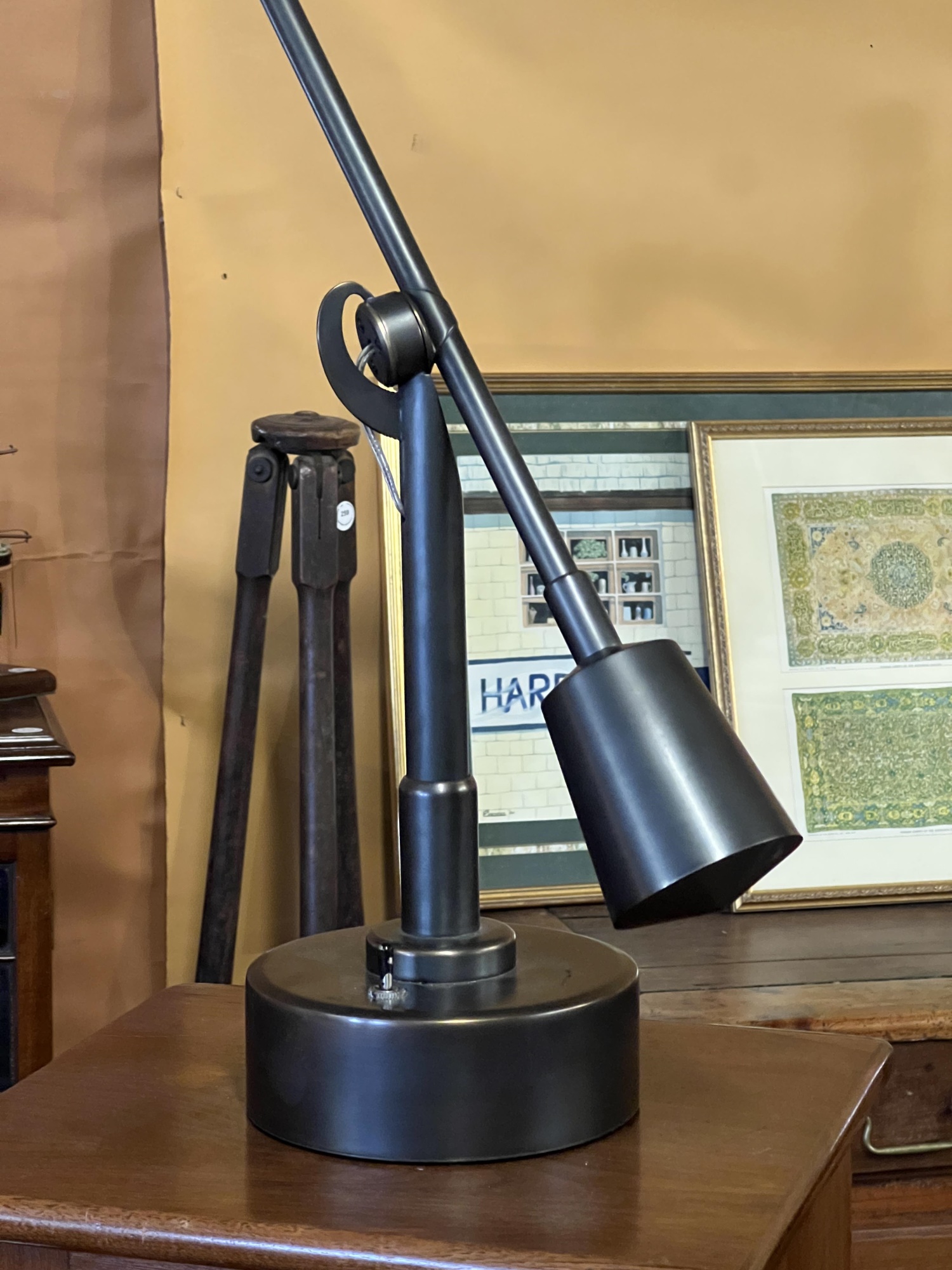 Adjustable. Two way bulb. 46" h down to 17" h x 6" dia base