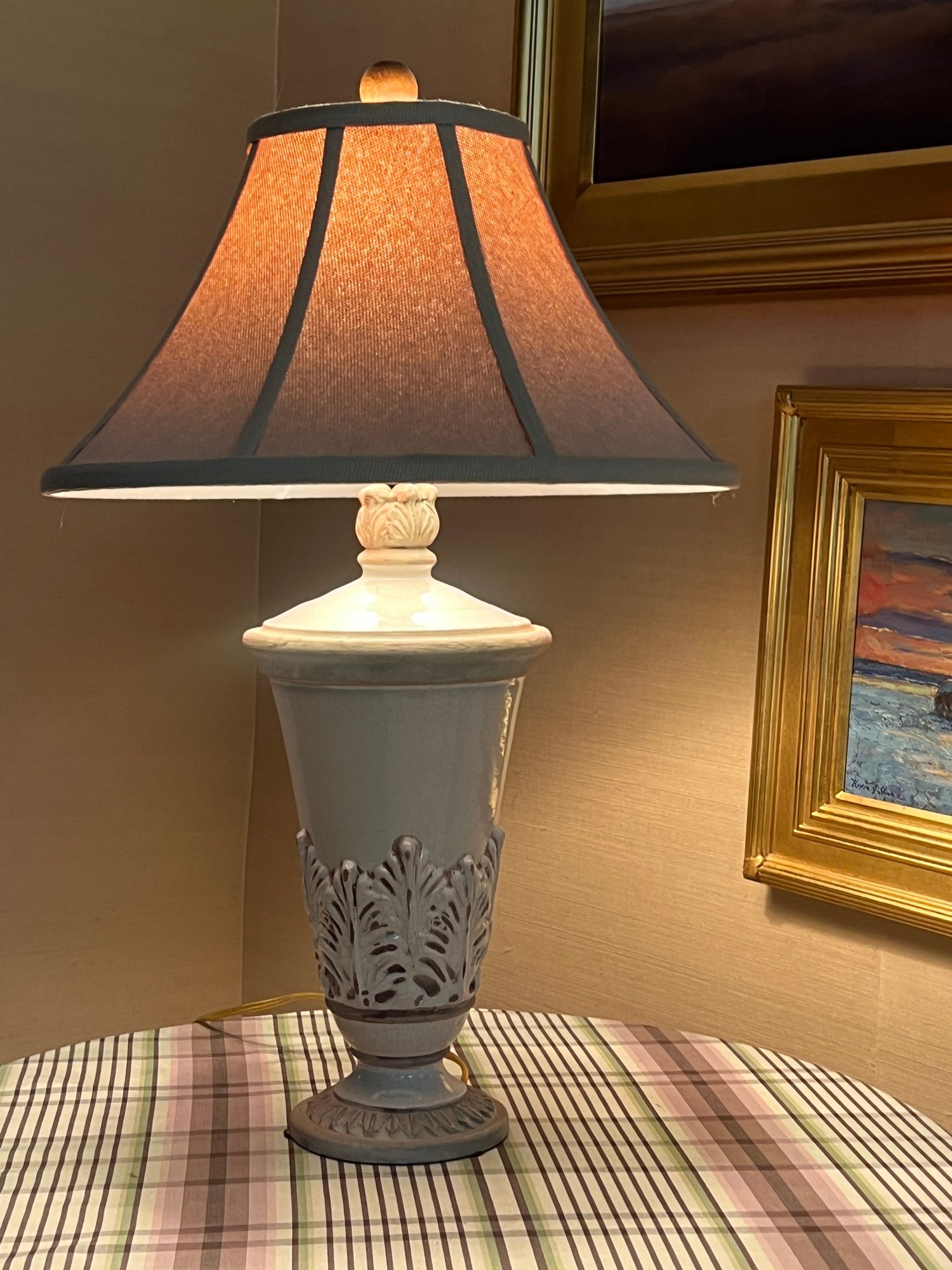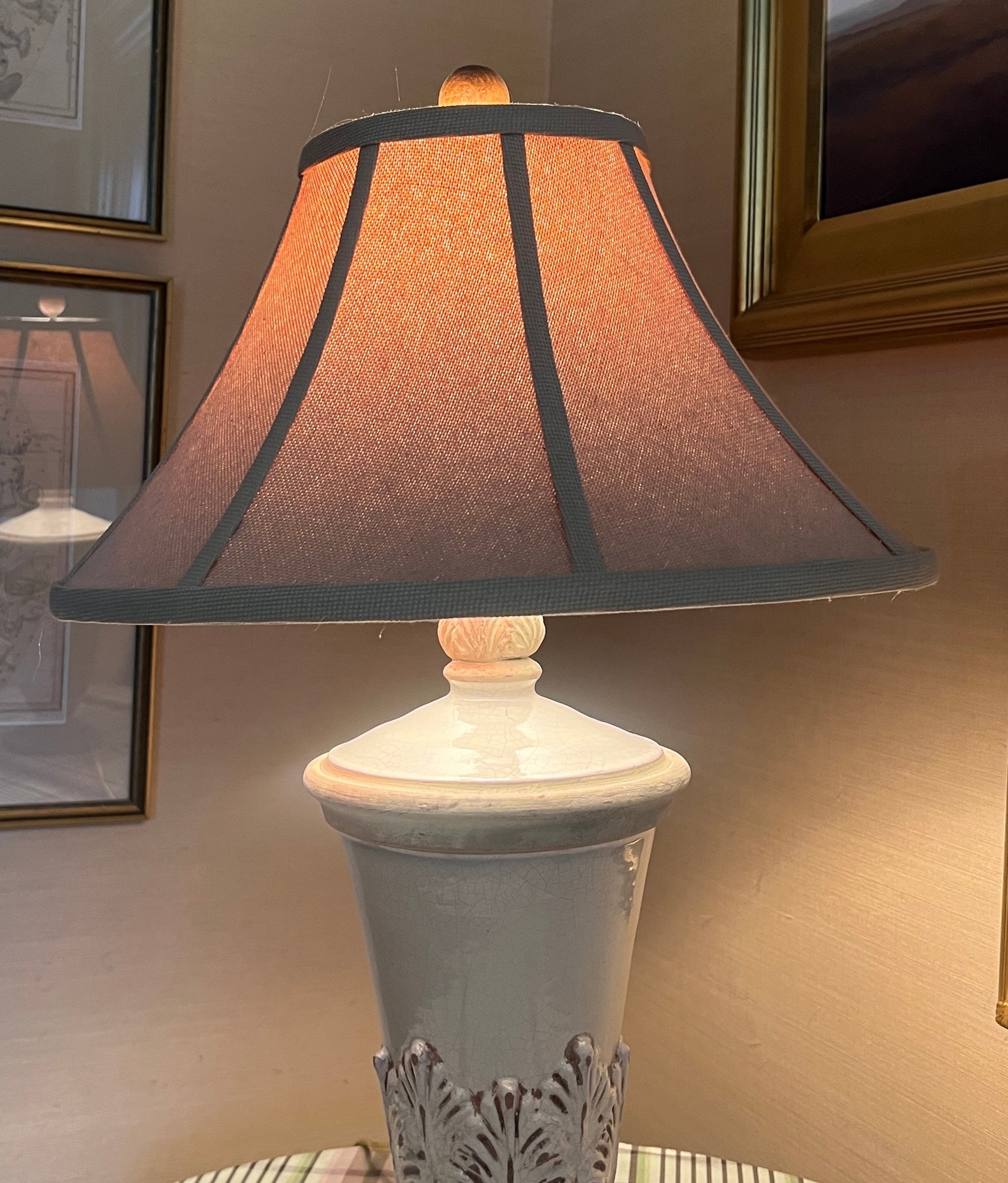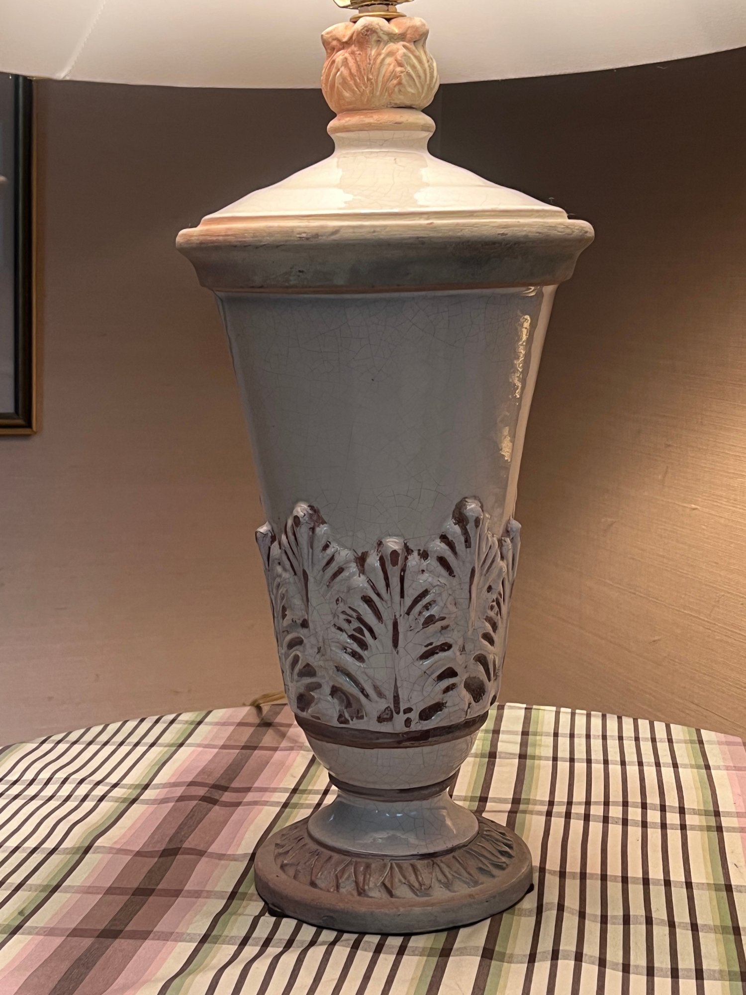 Glazed earthenware cast in low relief with acanthus leaves. 29 inches to top of finial.