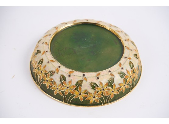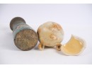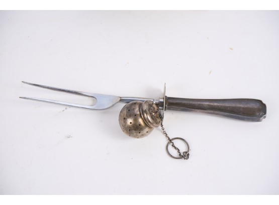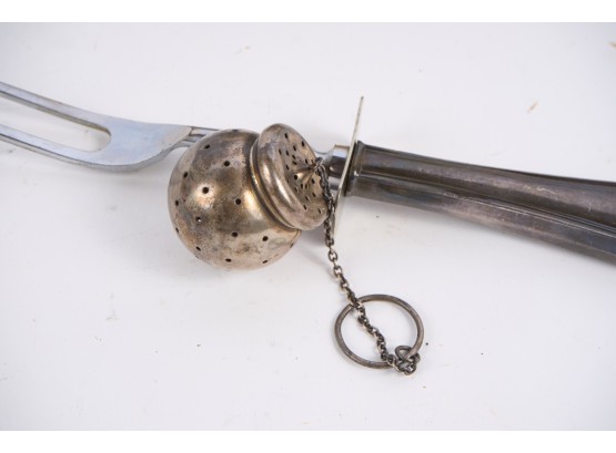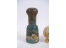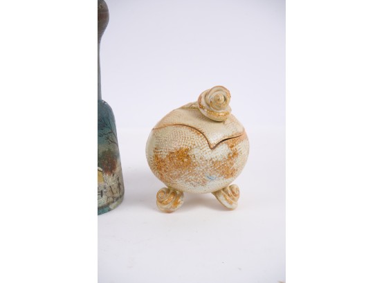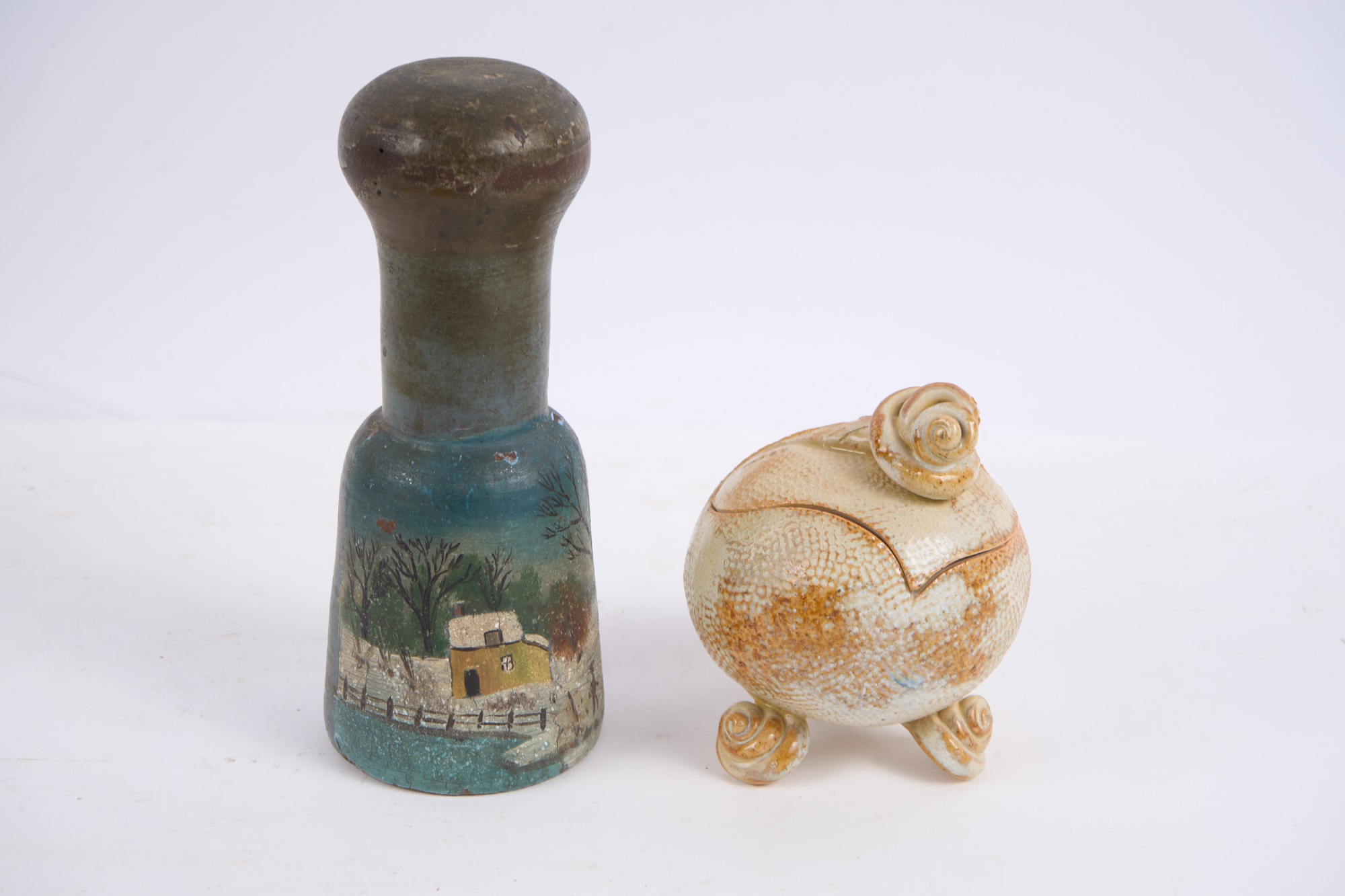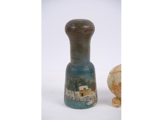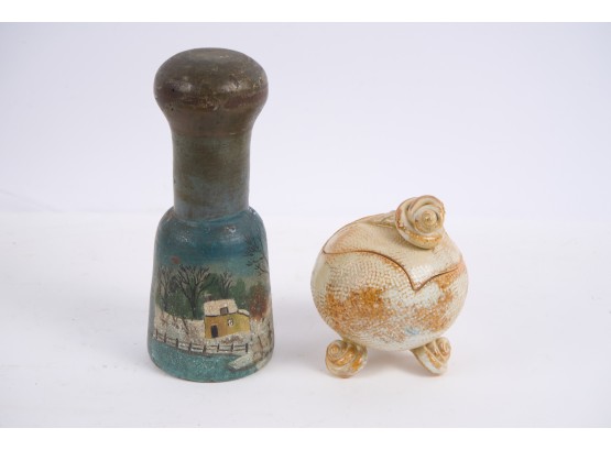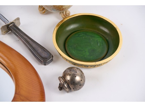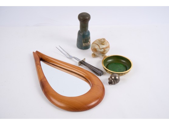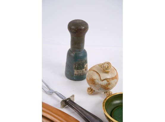 Including : Artisan crafted teardrop mirror, ceramic jar with periwinkle-form handle and feet, pestle painted with a folk art snow scene, enameled bowl, sterling handled carving fork and an unmarked tea ball. 17 inches (and smaller)