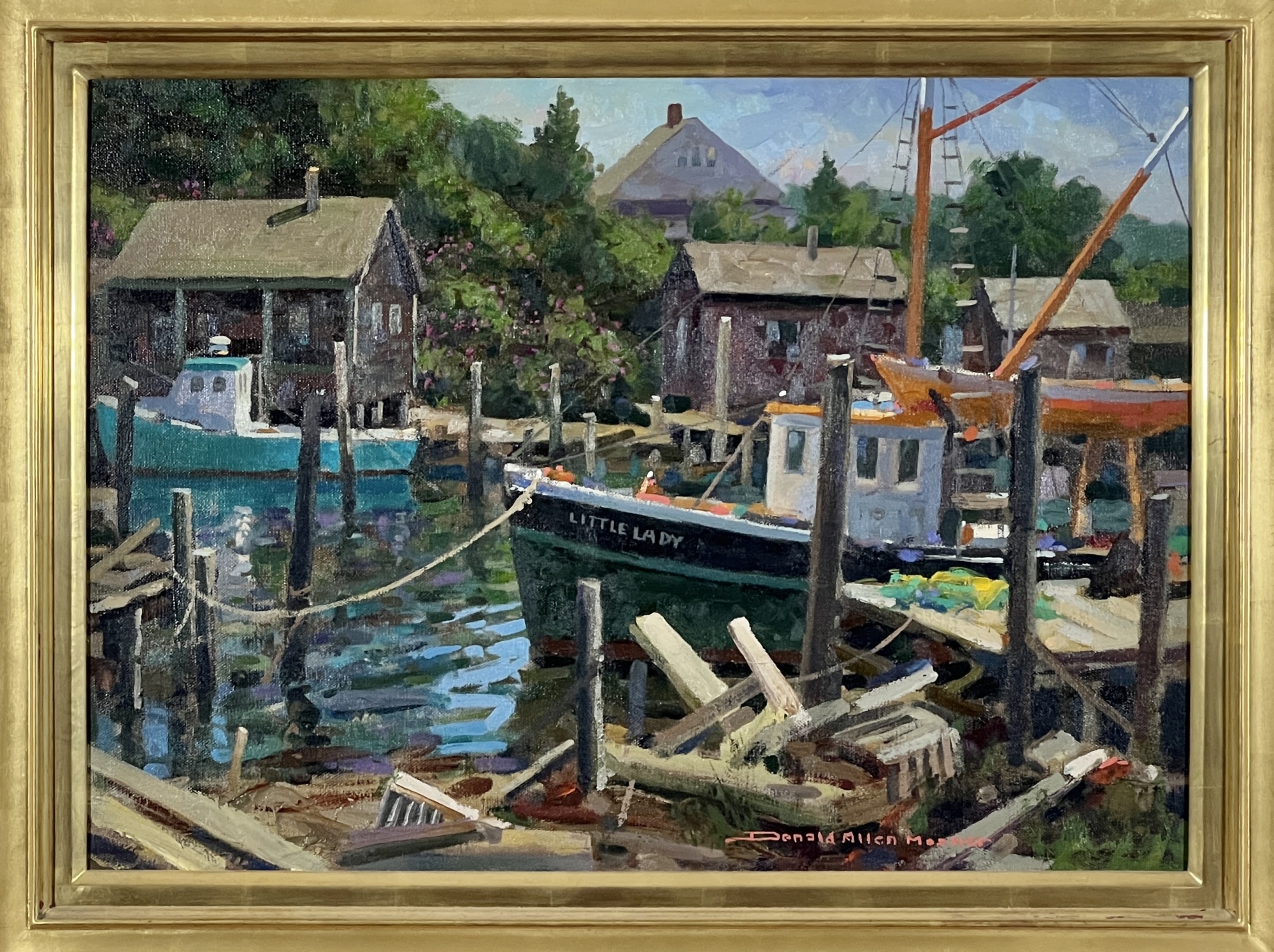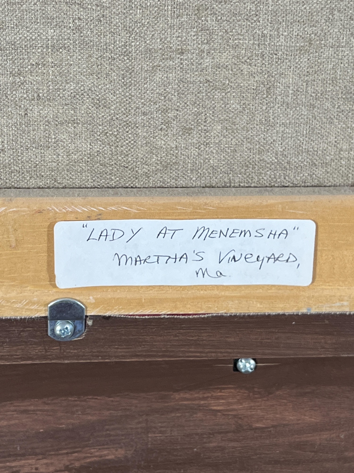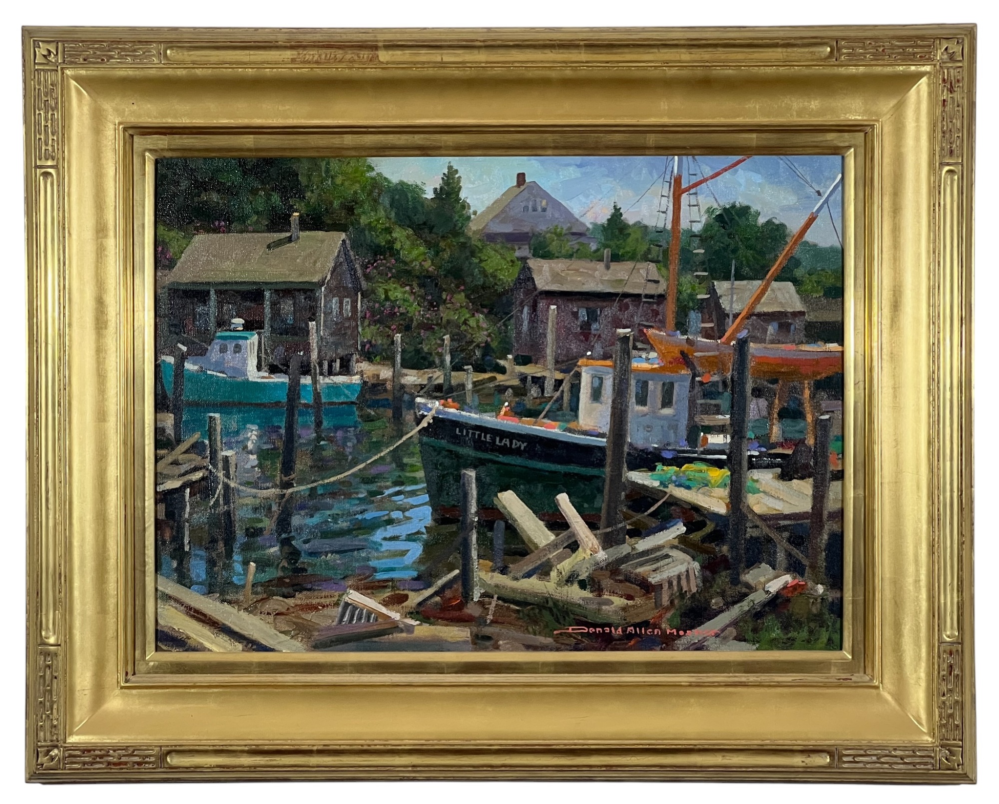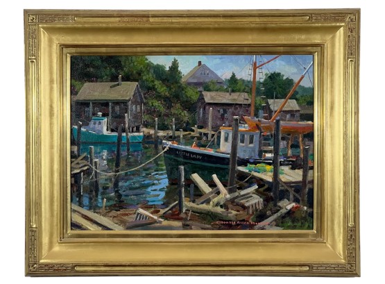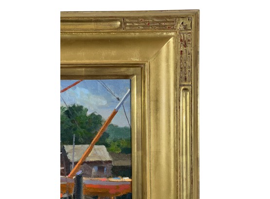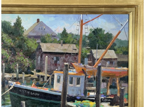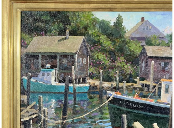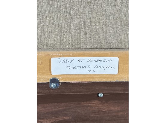 "Lady at Menemsha, Martha's Vineyard", oil on canvas 16 x 22 inches, signed lower right, housed in a nice carved & gilt frame, titled verso. 23 1/2 x 29 1/2 inches overall. Condition: Good.