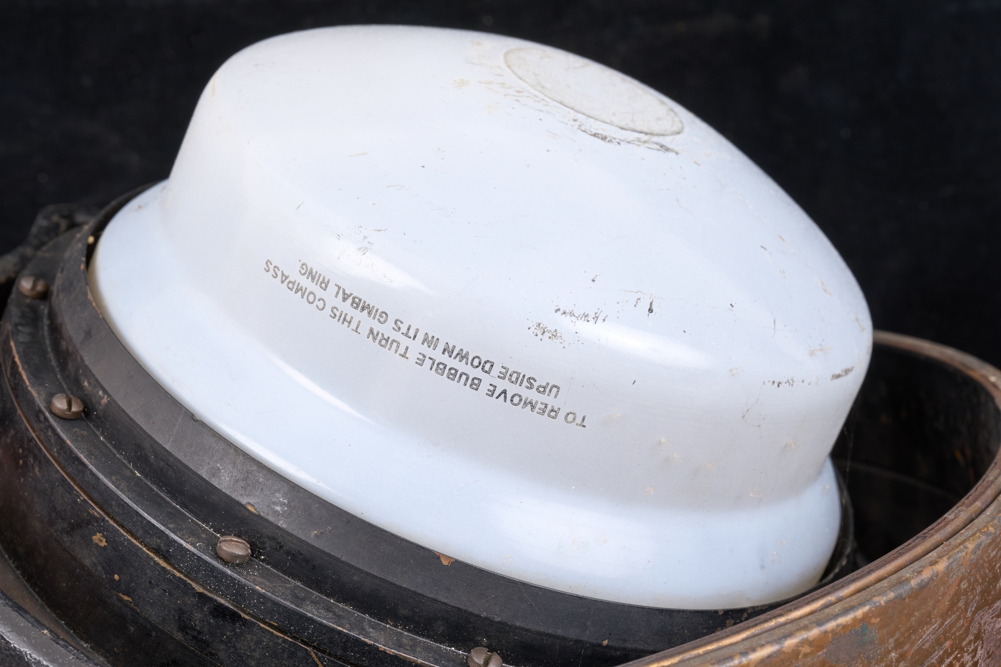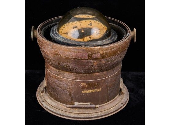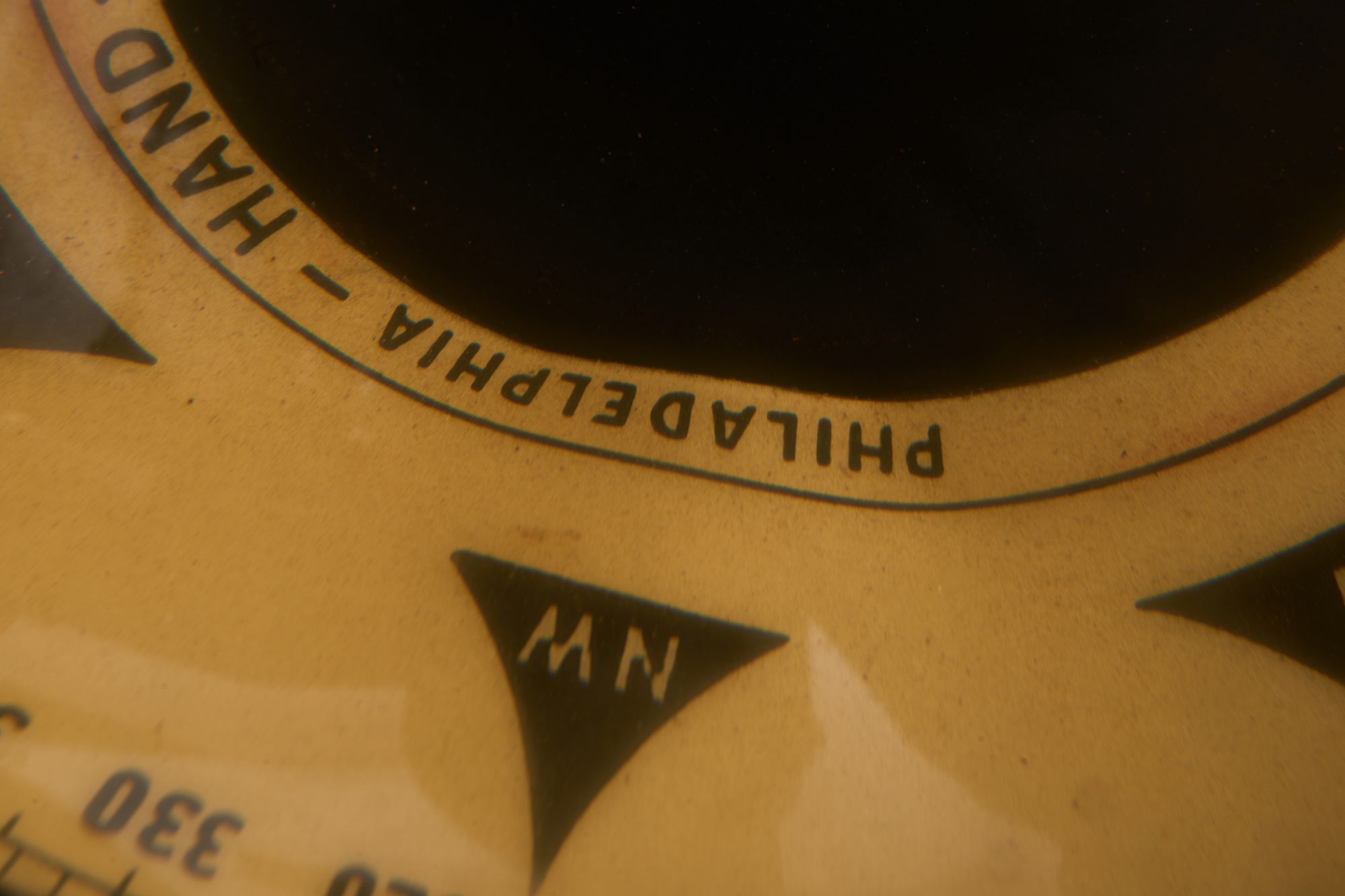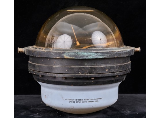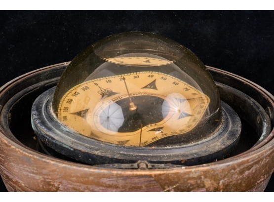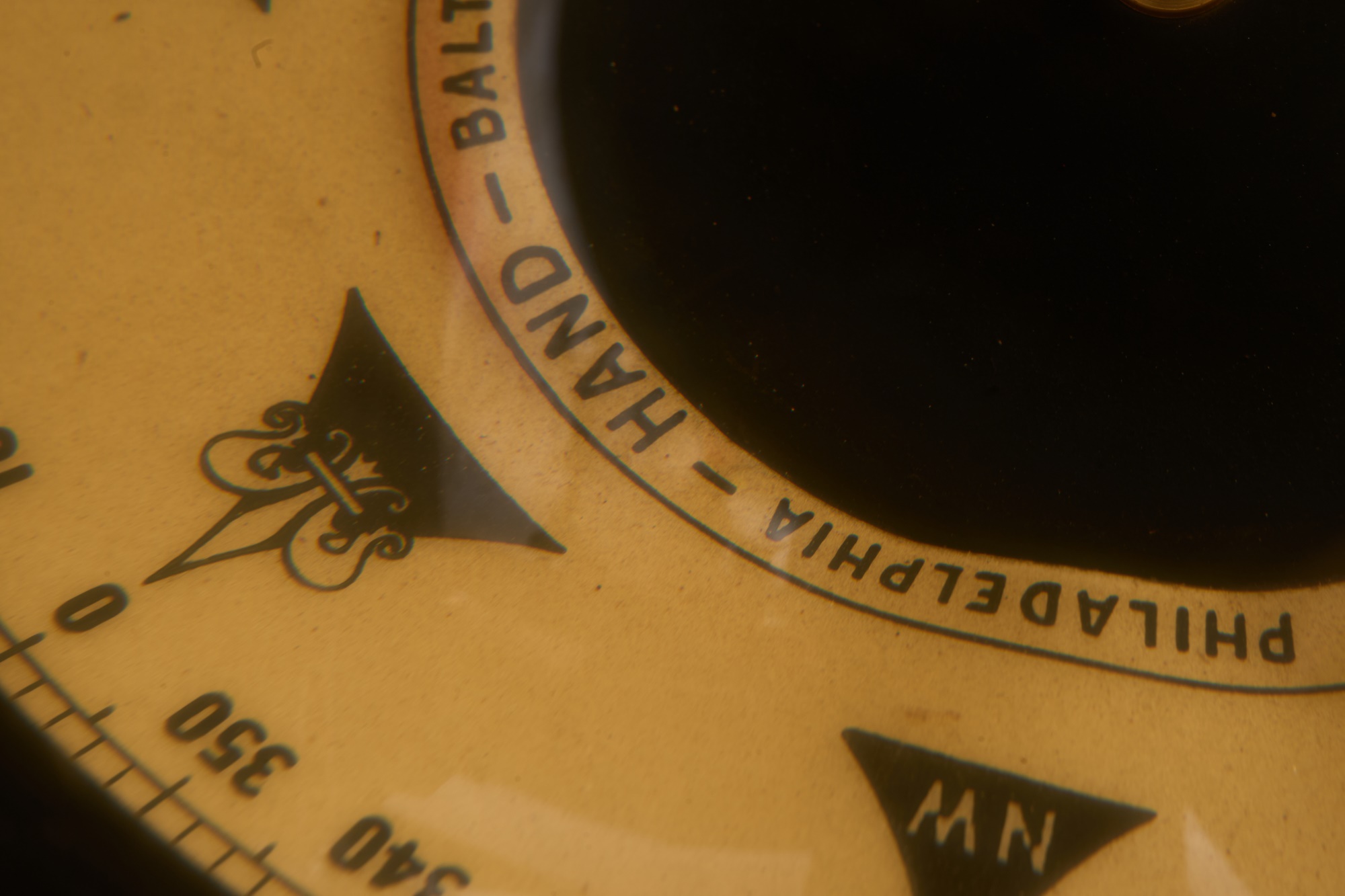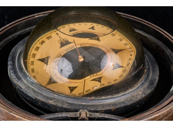 WWII Era gimbaled wet compass with 6 inch dial. Marked Philadelphia-Hand-Baltimore probably manufactured by E.S. Ritchie & Sons Inc 16 x 13 inches Condition: Tarnish, air bubble under lens