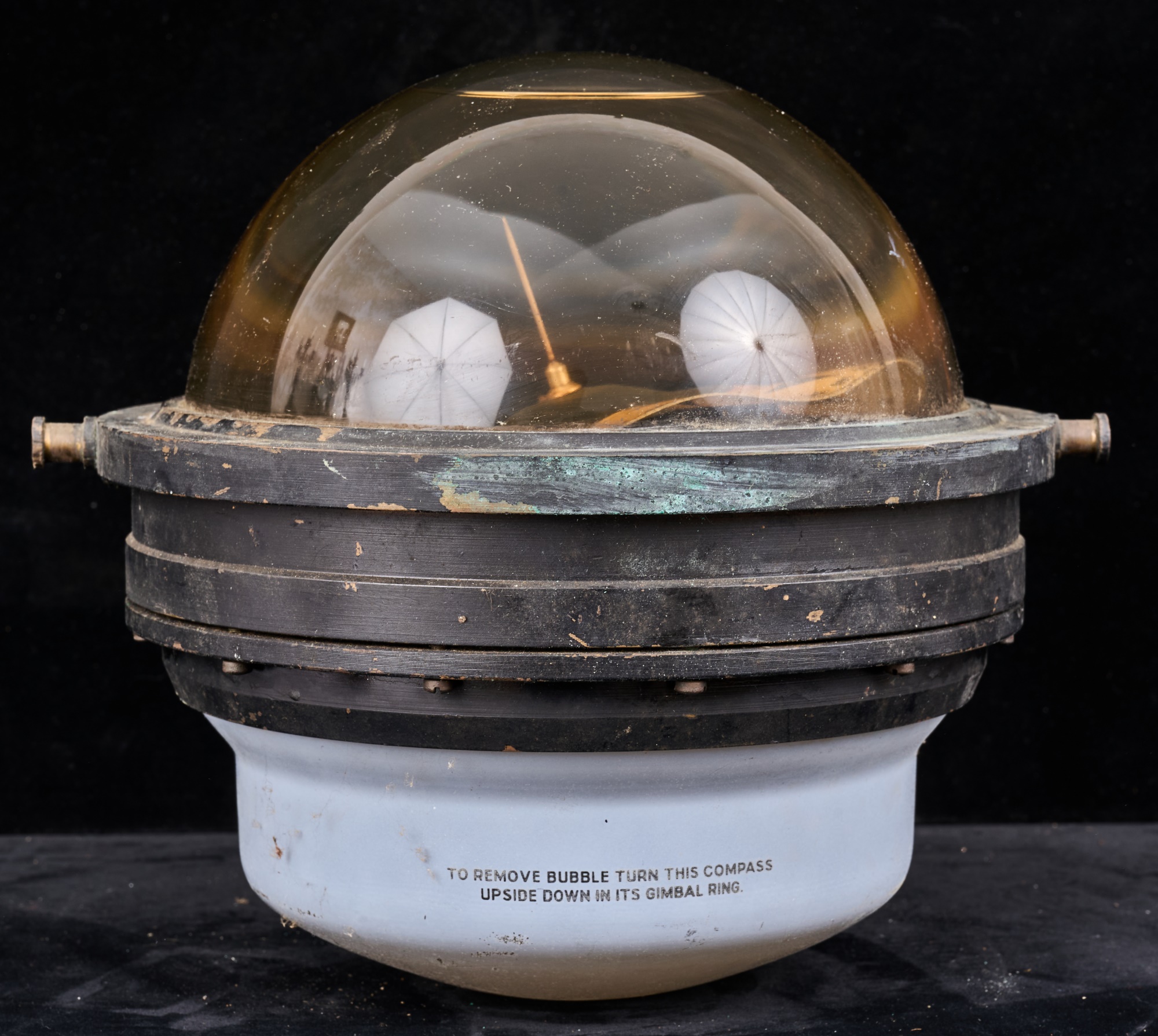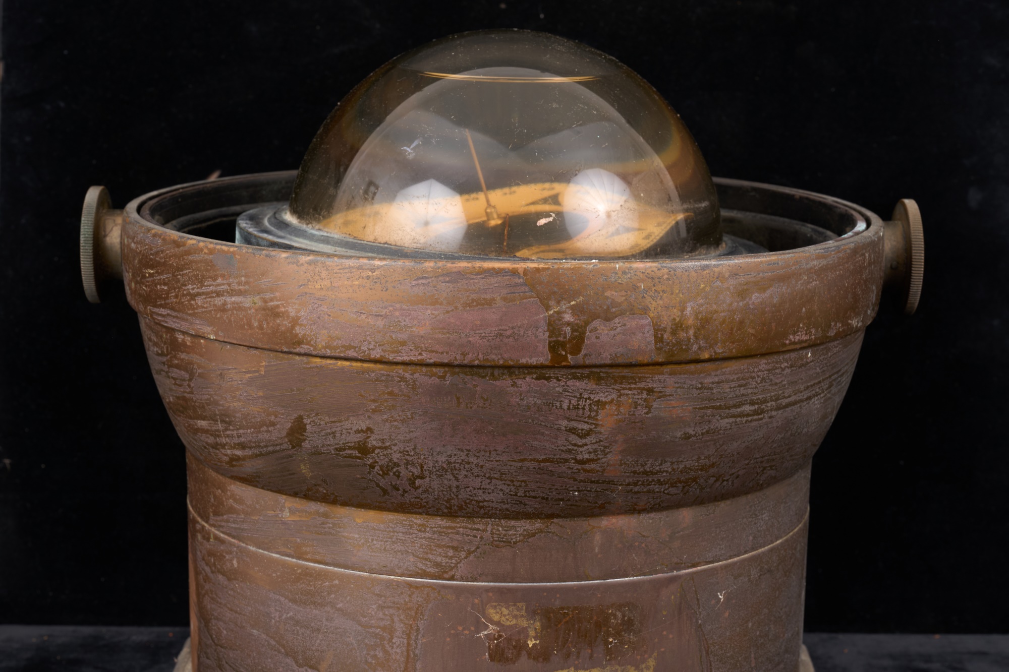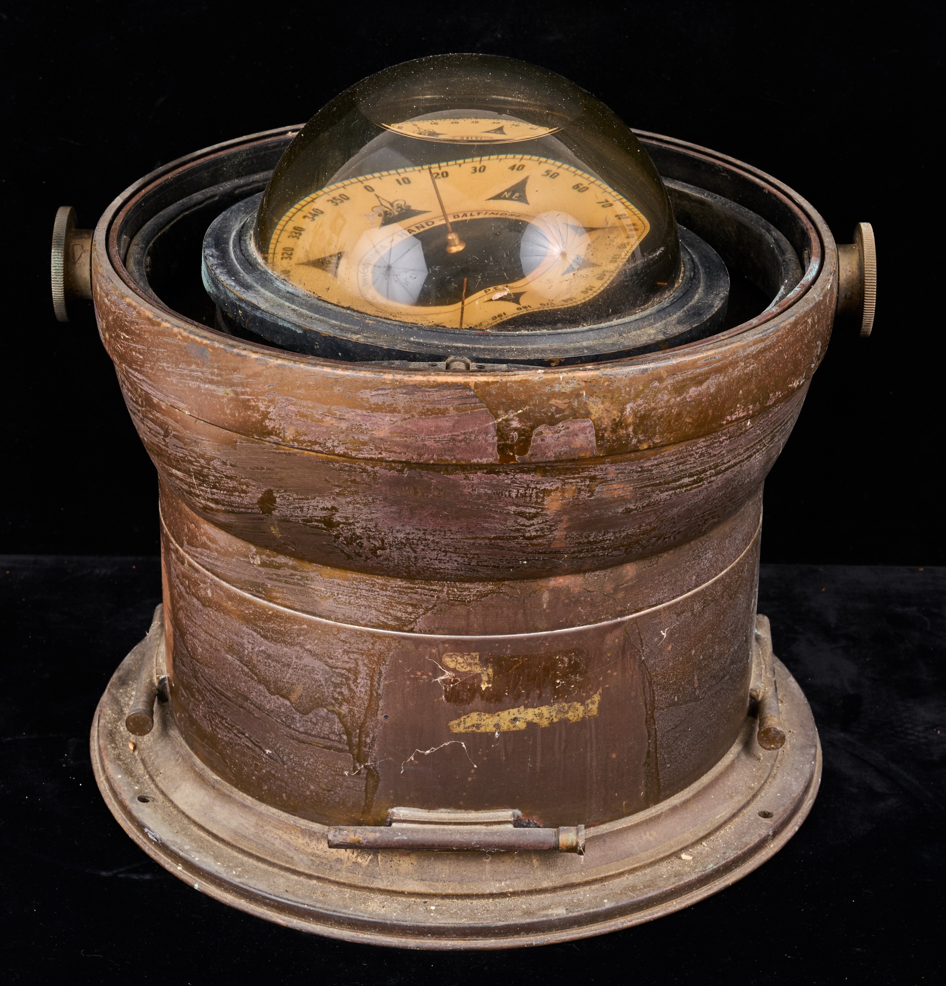 WWII Era gimbaled wet compass with 6 inch dial. Marked Philadelphia-Hand-Baltimore probably manufactured by E.S. Ritchie & Sons Inc 16 x 13 inches Condition: Tarnish, air bubble under lens