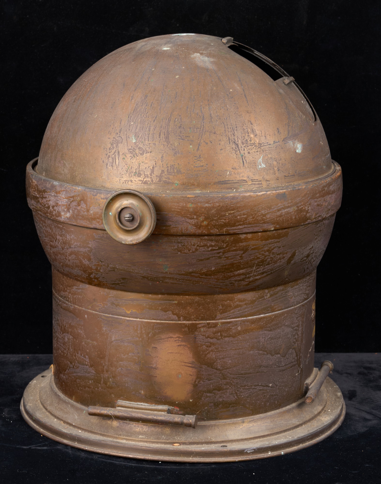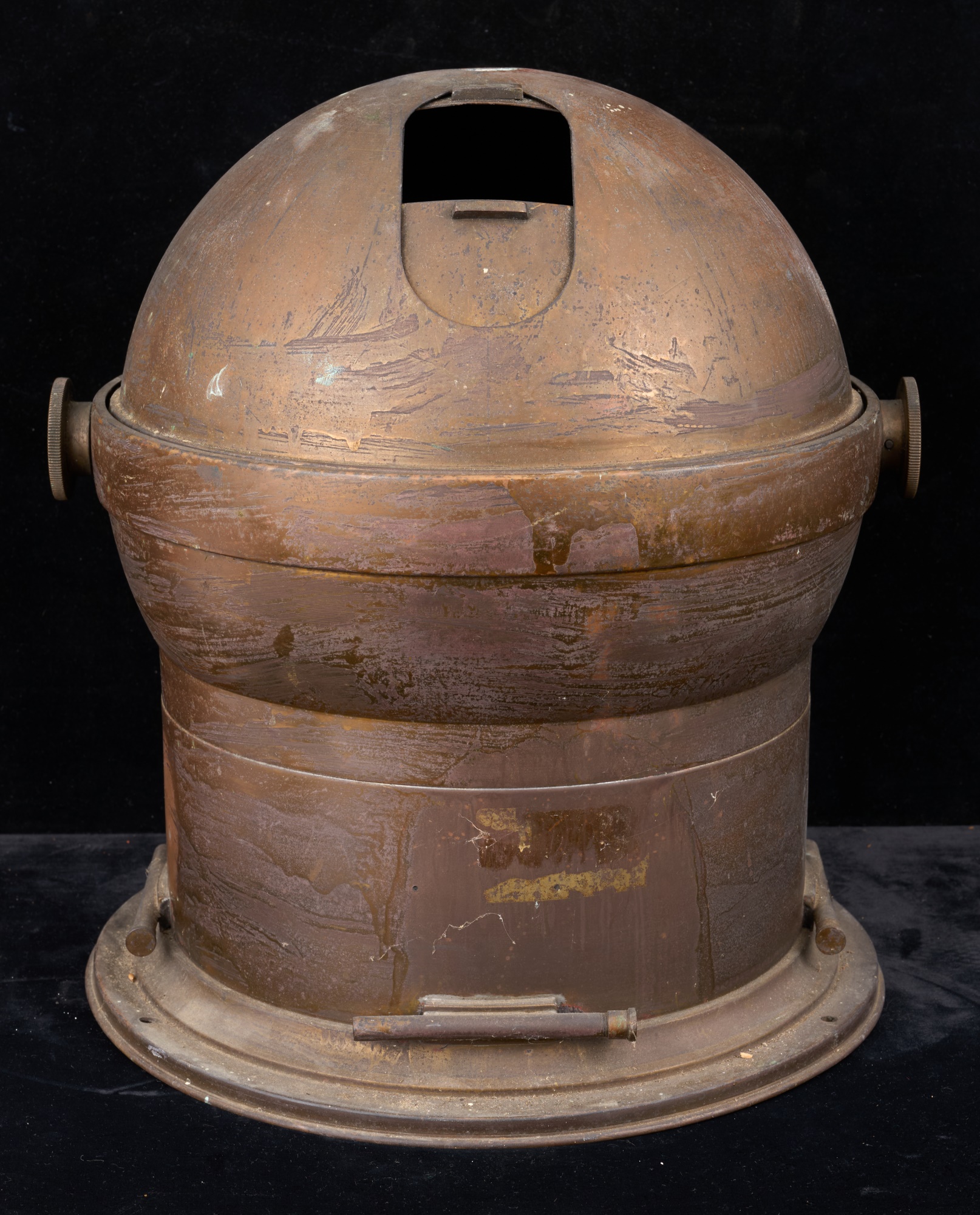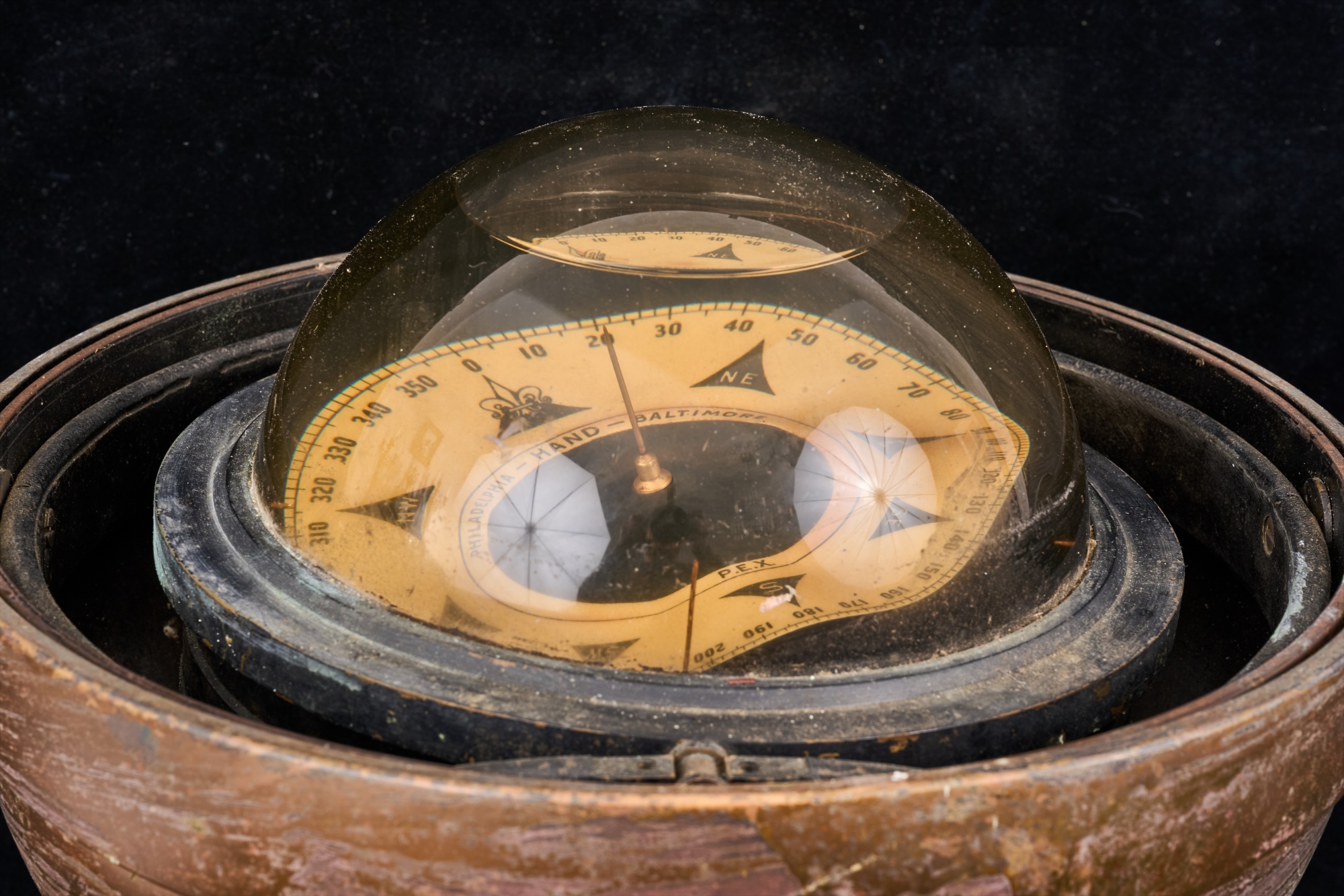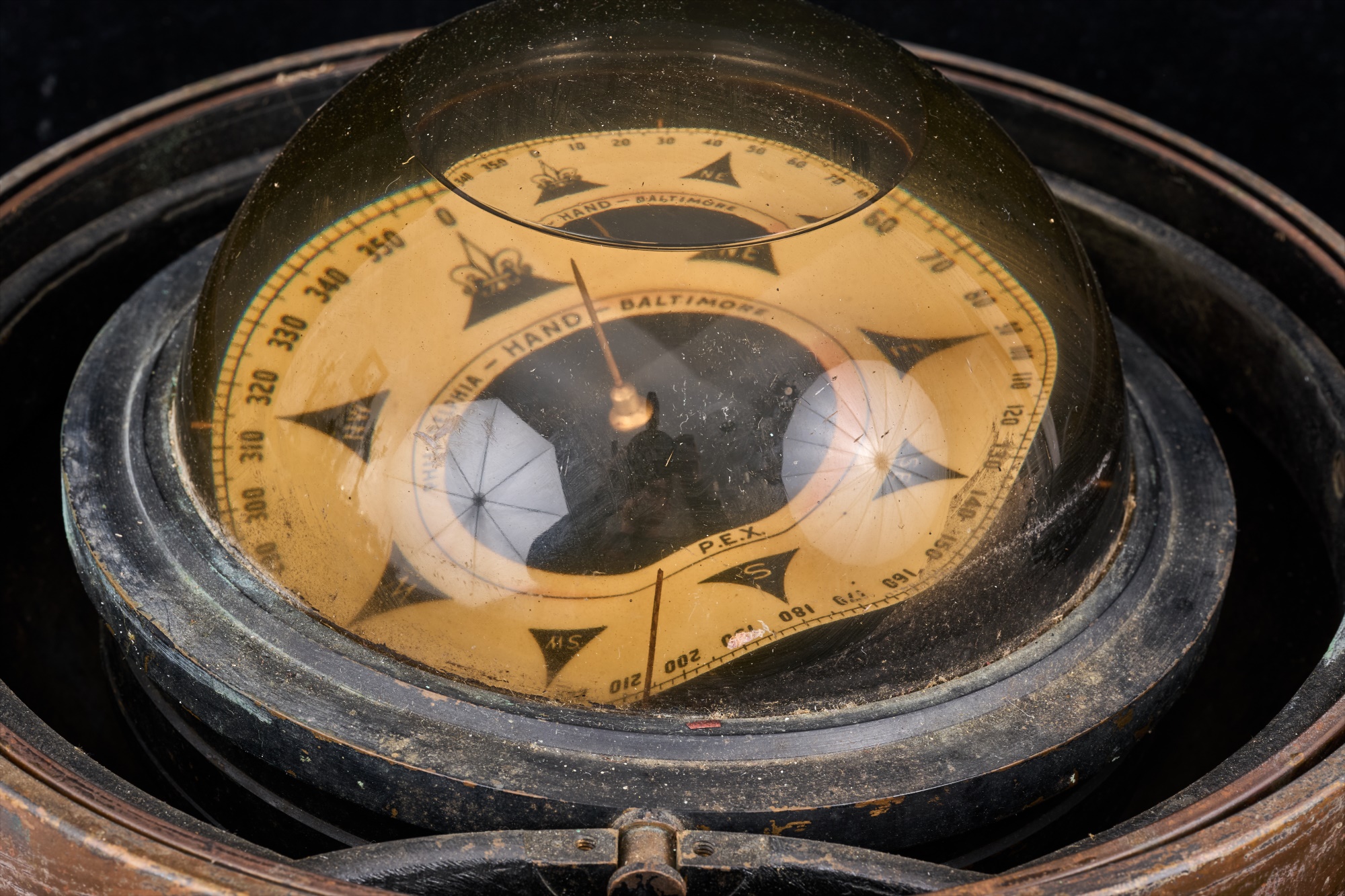 WWII Era gimbaled wet compass with 6 inch dial. Marked Philadelphia-Hand-Baltimore probably manufactured by E.S. Ritchie & Sons Inc 16 x 13 inches Condition: Tarnish, air bubble under lens