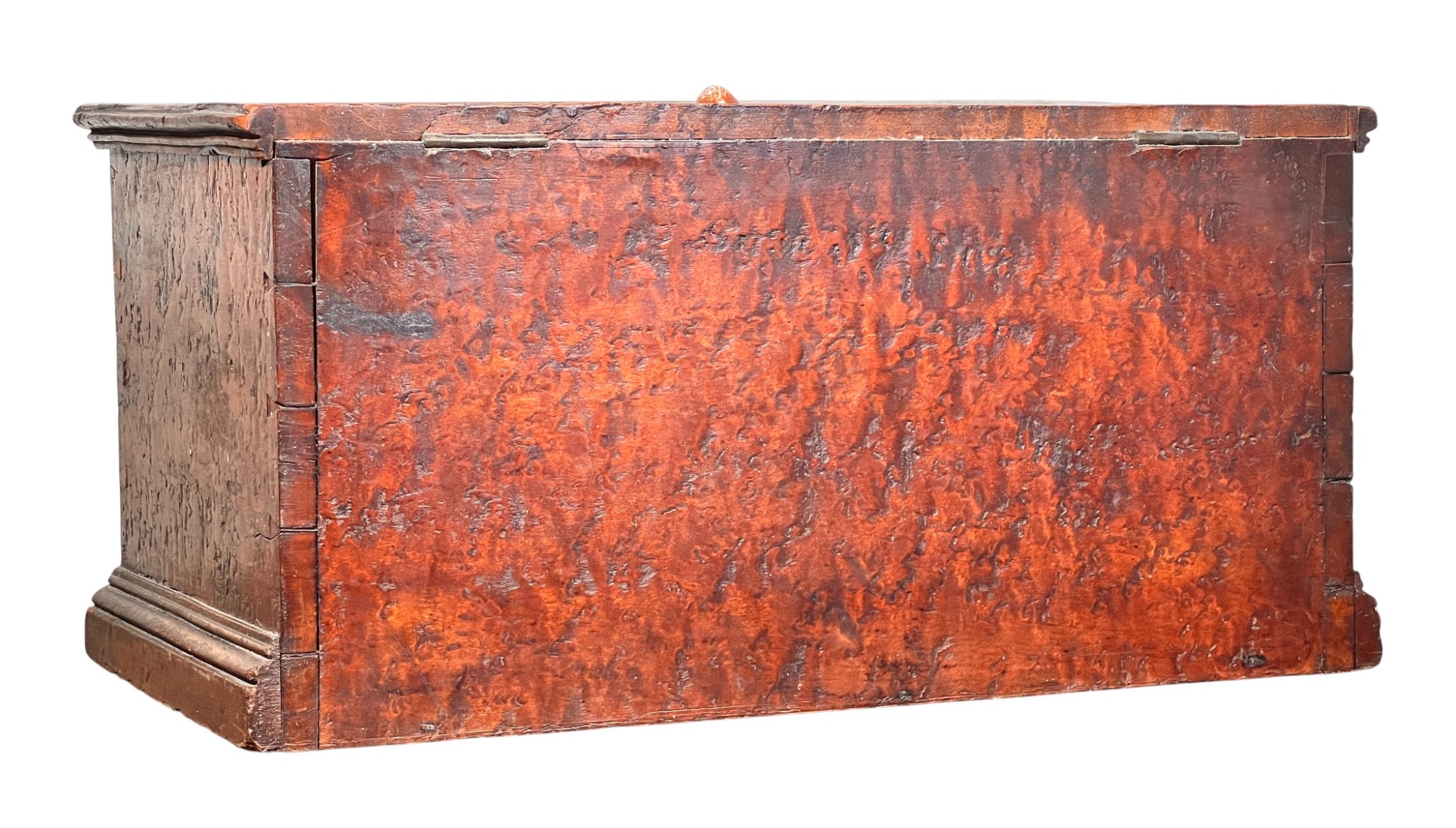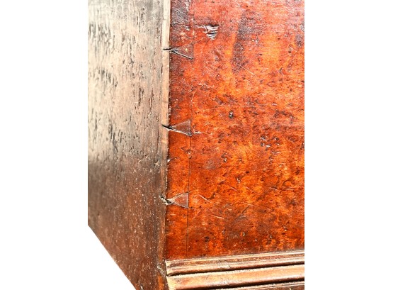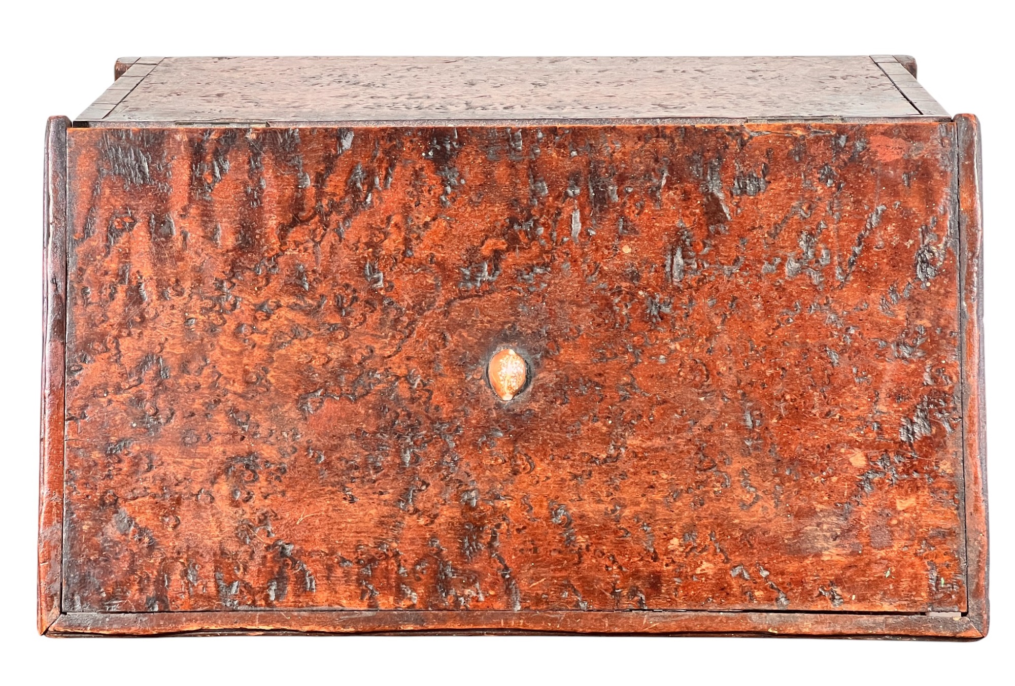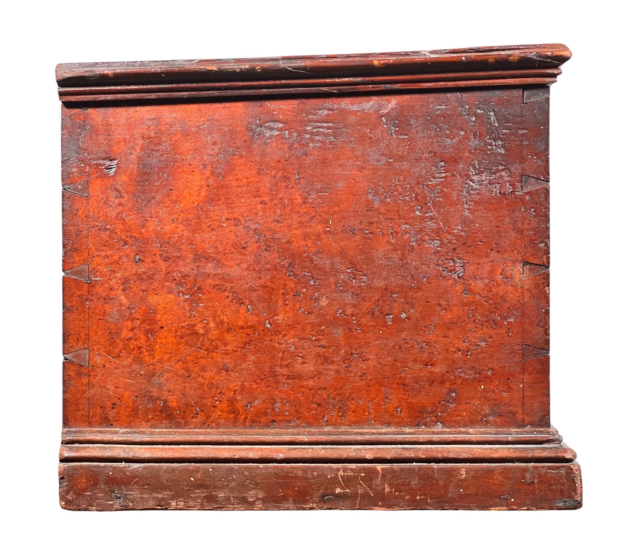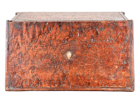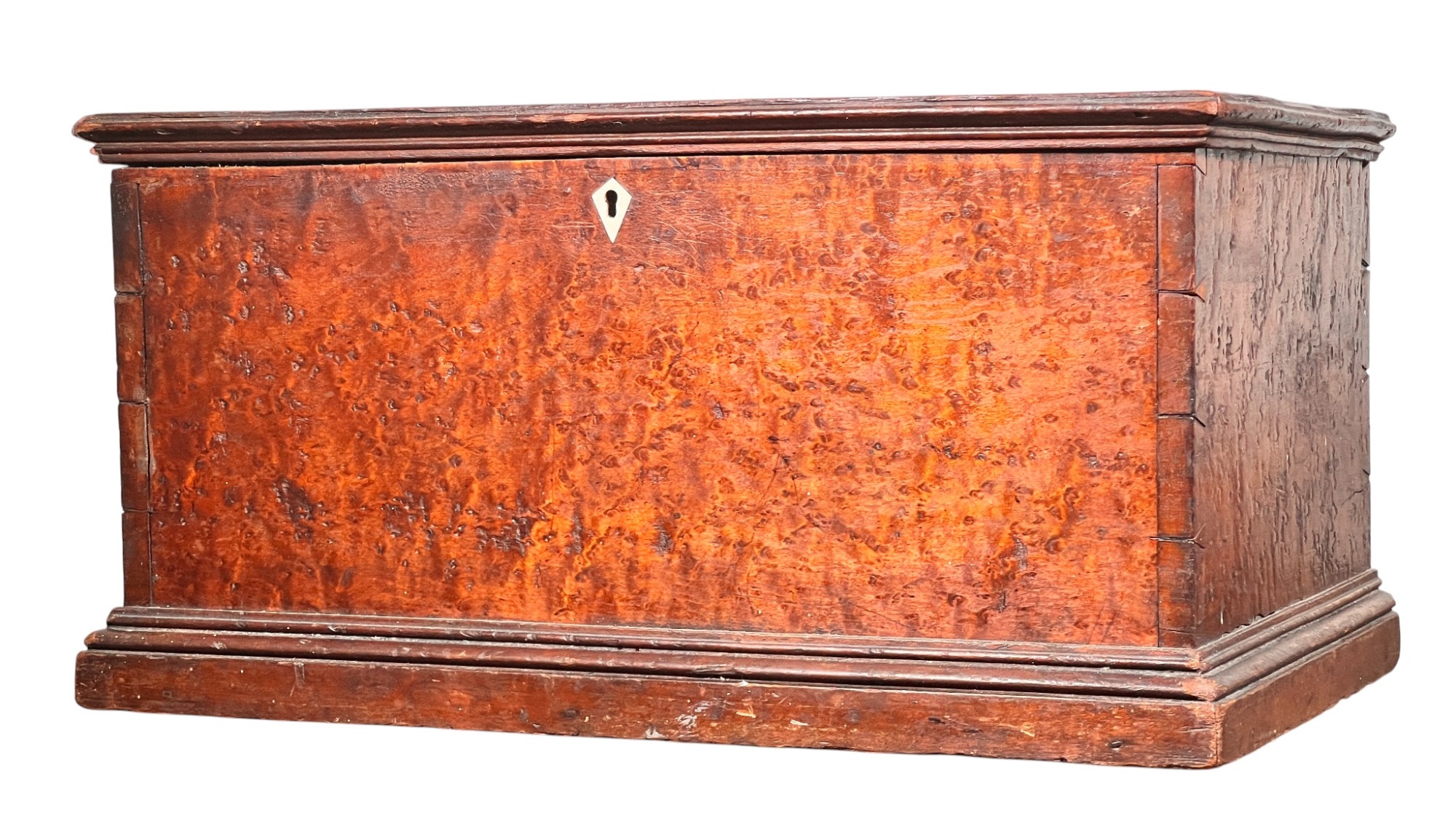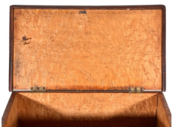 Early (19th c) lock box constructed from fabulous Birdseye maple with molded top and dovetail construction. Purchased from NH Antiques Show. 8 x 17 x 9 1/2 inches. Condition: Original surface, shell affixed to lid.