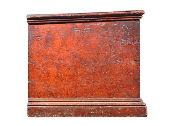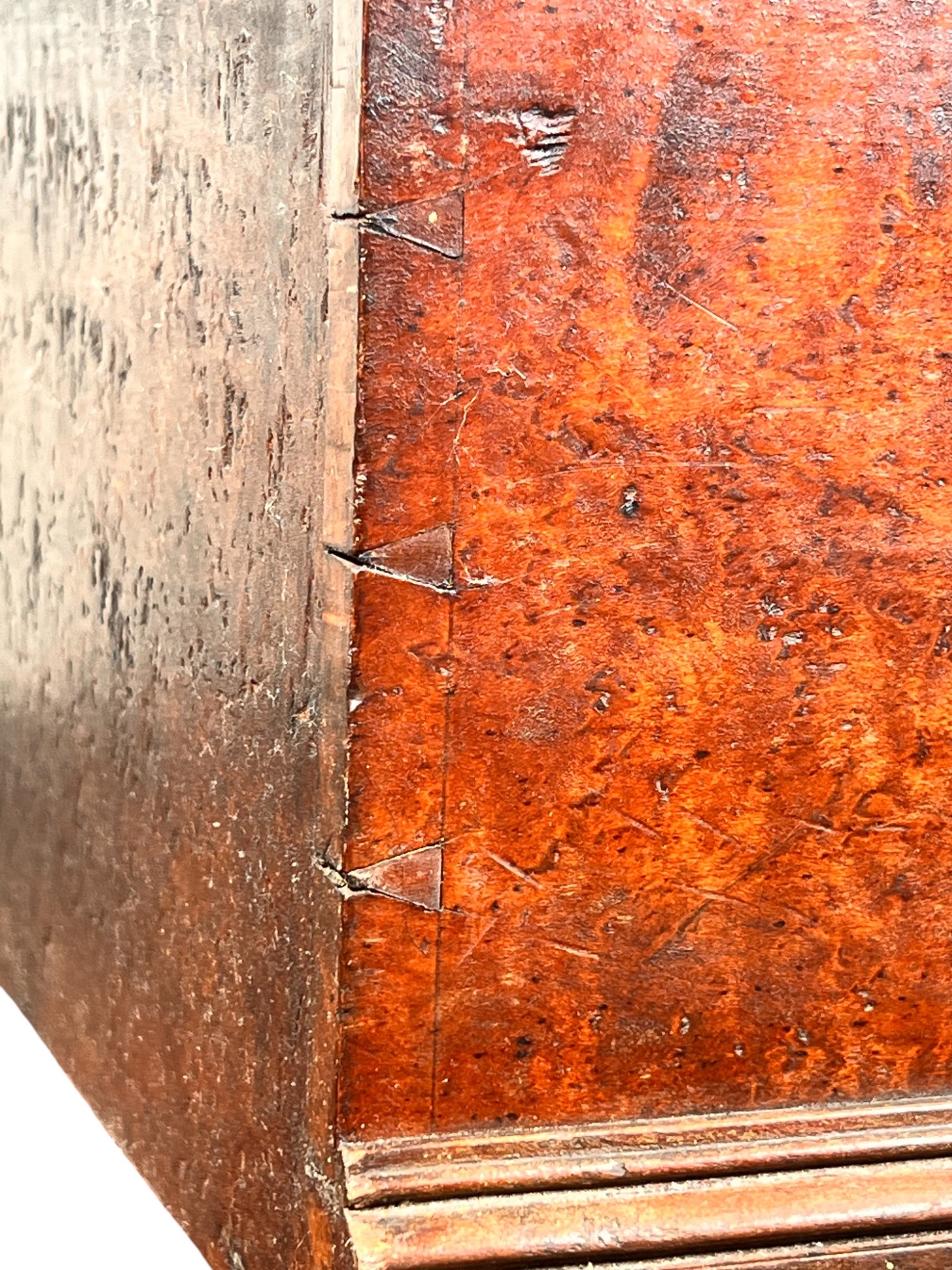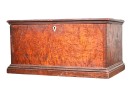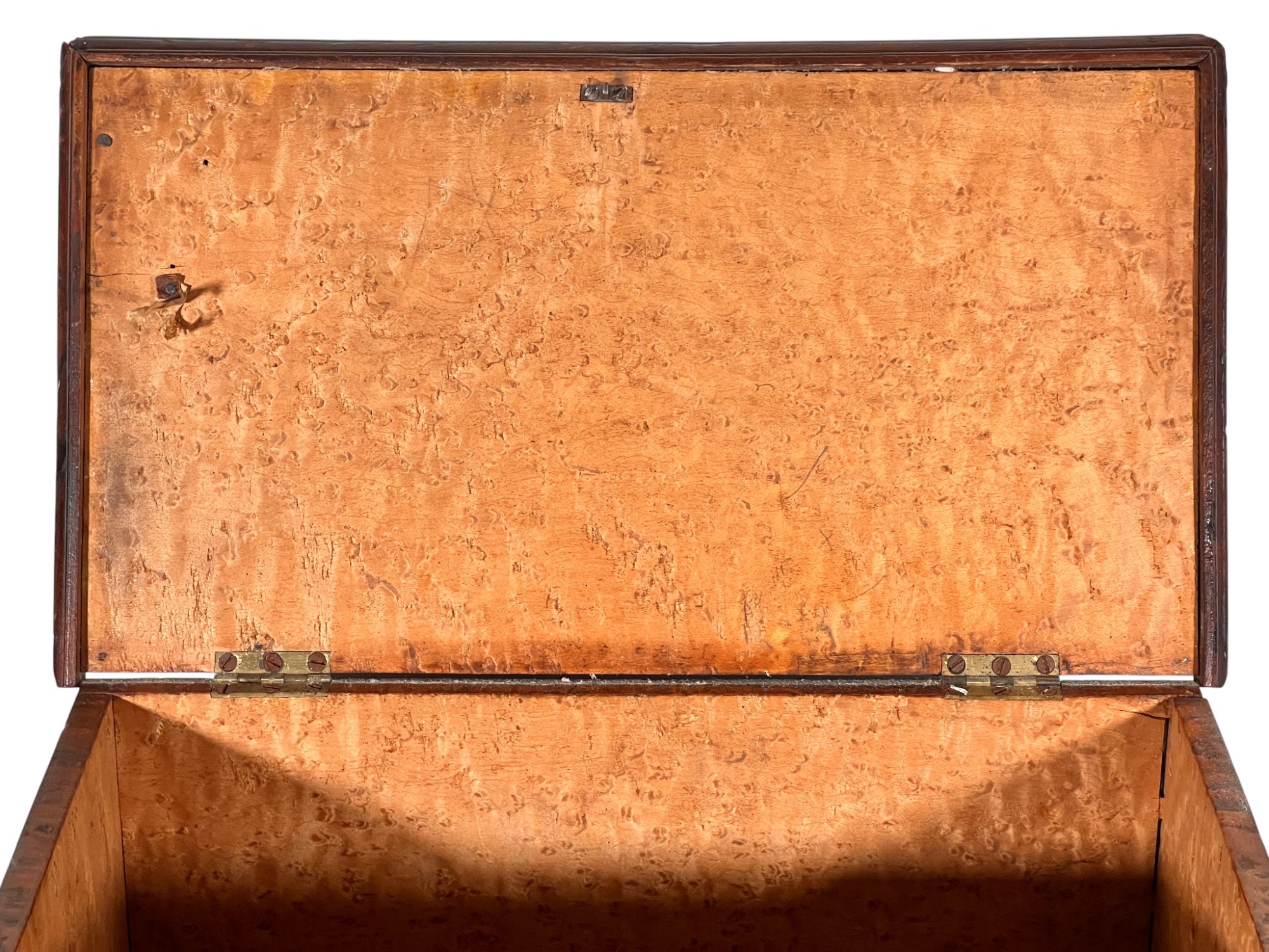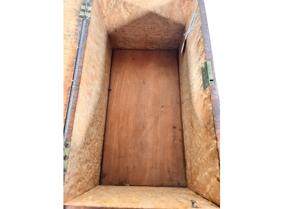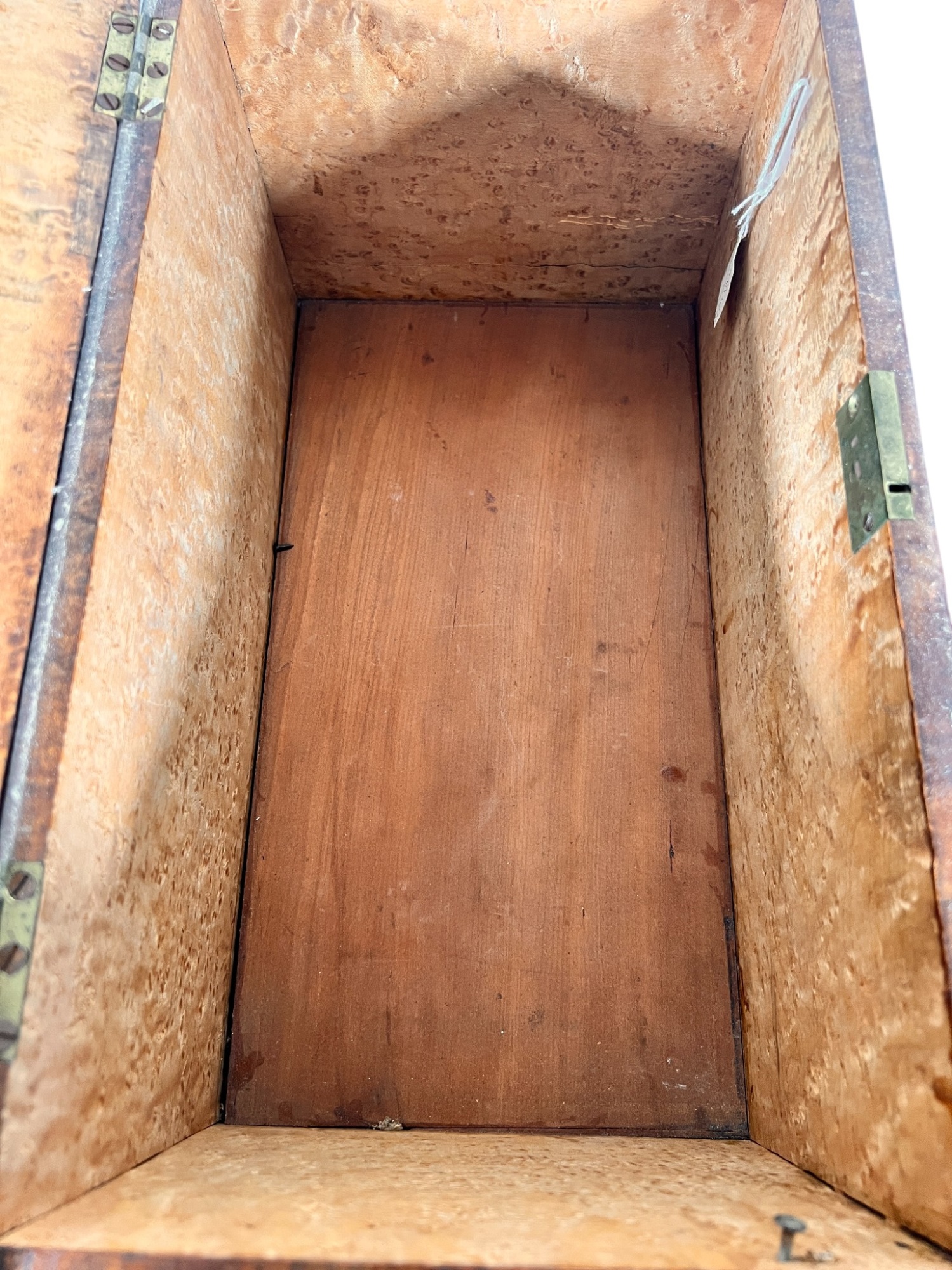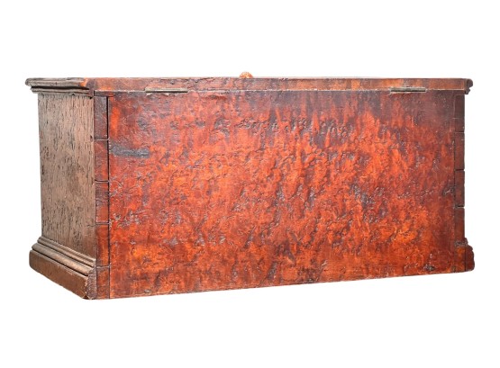 Early (19th c) lock box constructed from fabulous Birdseye maple with molded top and dovetail construction. Purchased from NH Antiques Show. 8 x 17 x 9 1/2 inches. Condition: Original surface, shell affixed to lid.