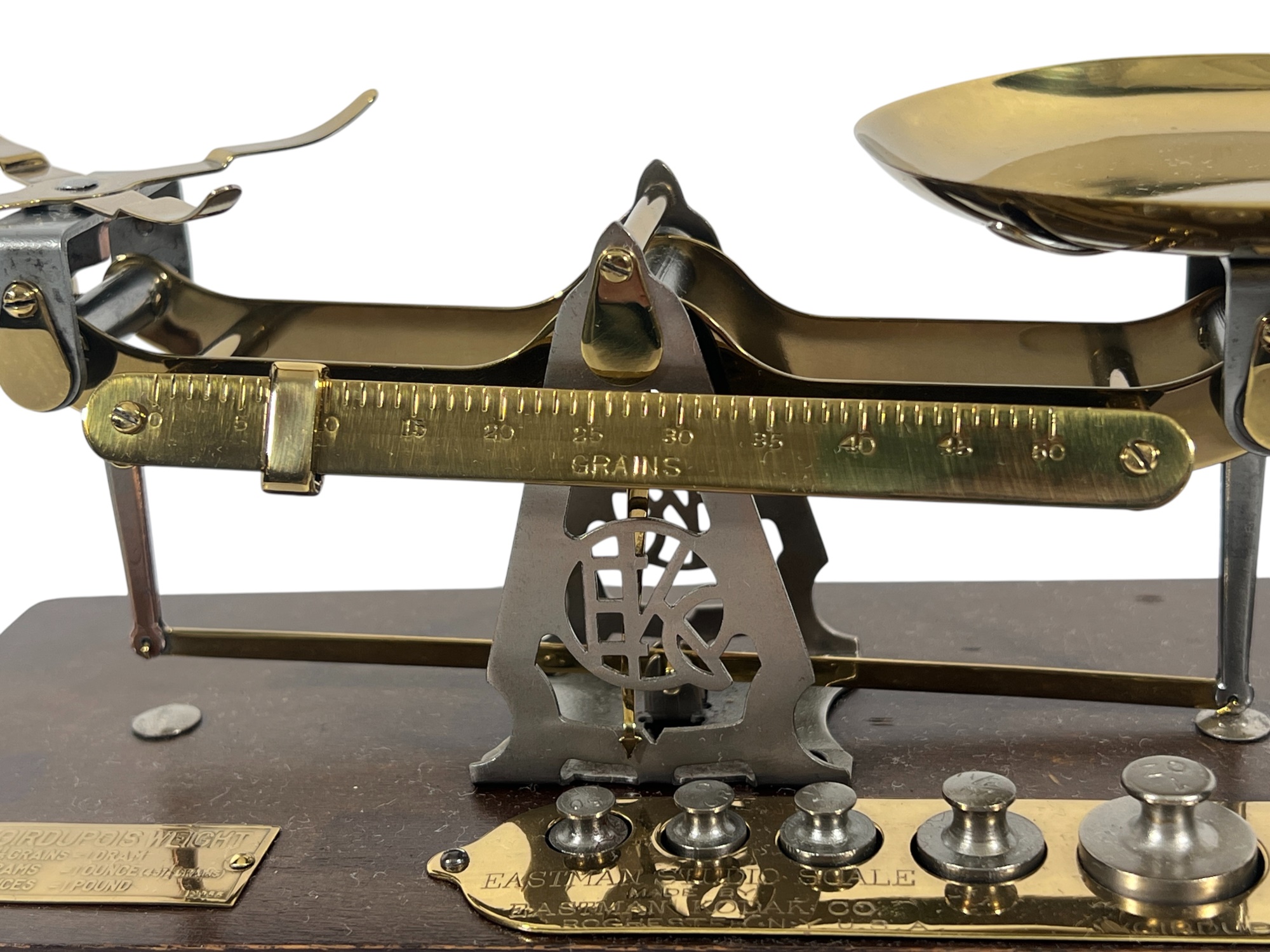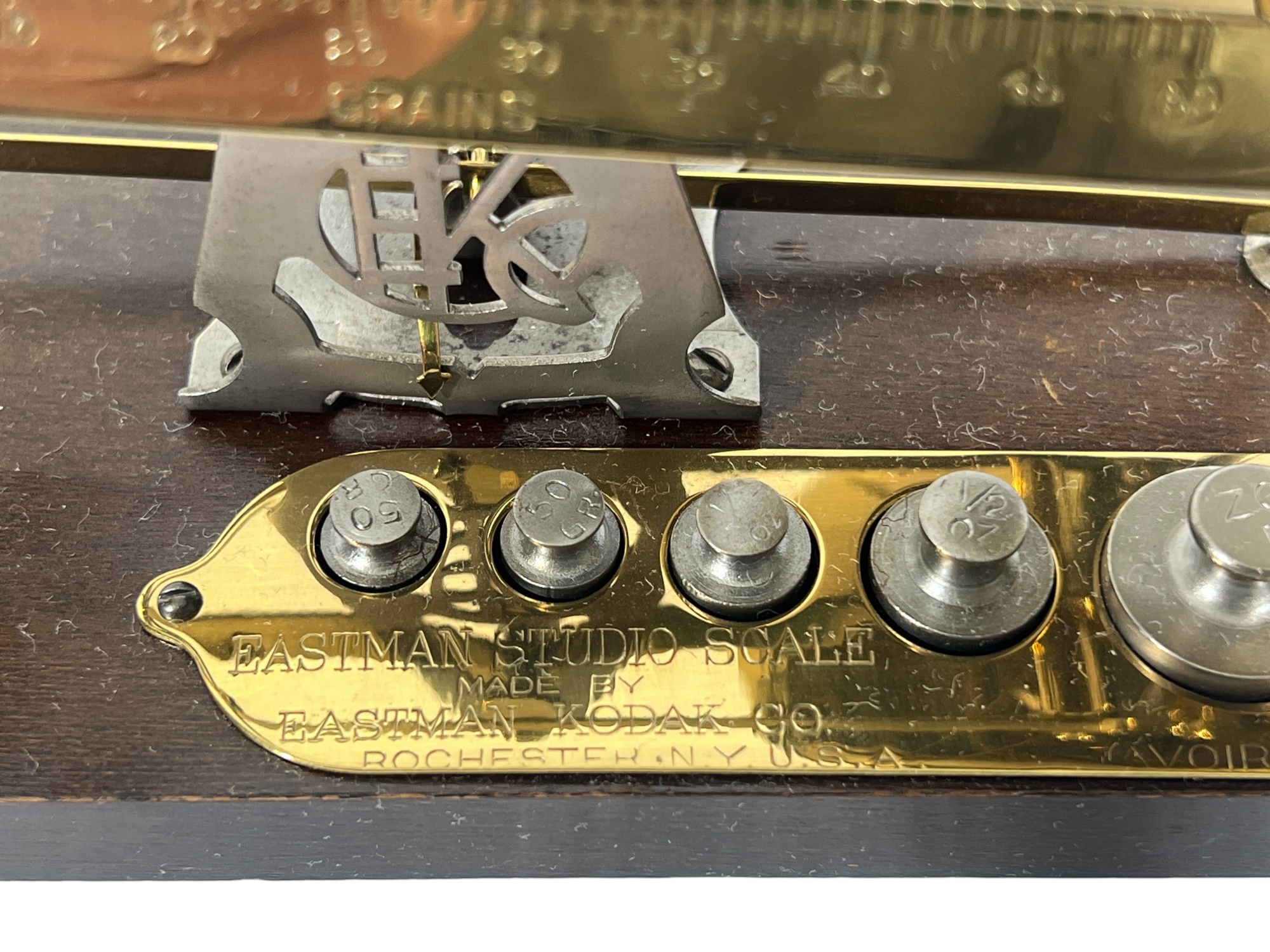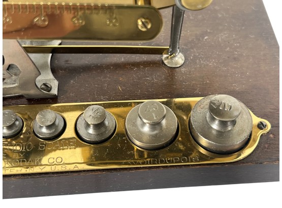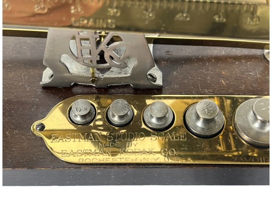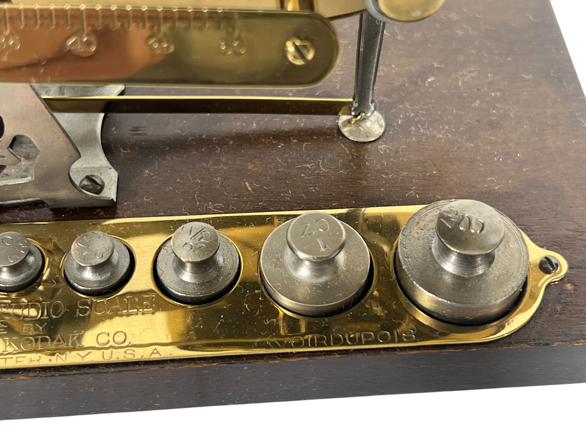 Early (20th c) Eastman Kodak Co. brass & iron studio balance scale on wooden base with weight set. Iron fulcrum pierced with Eastman Kodak logo. 4 x 9 x 4 inches. Condition: Good. Temp No 8833