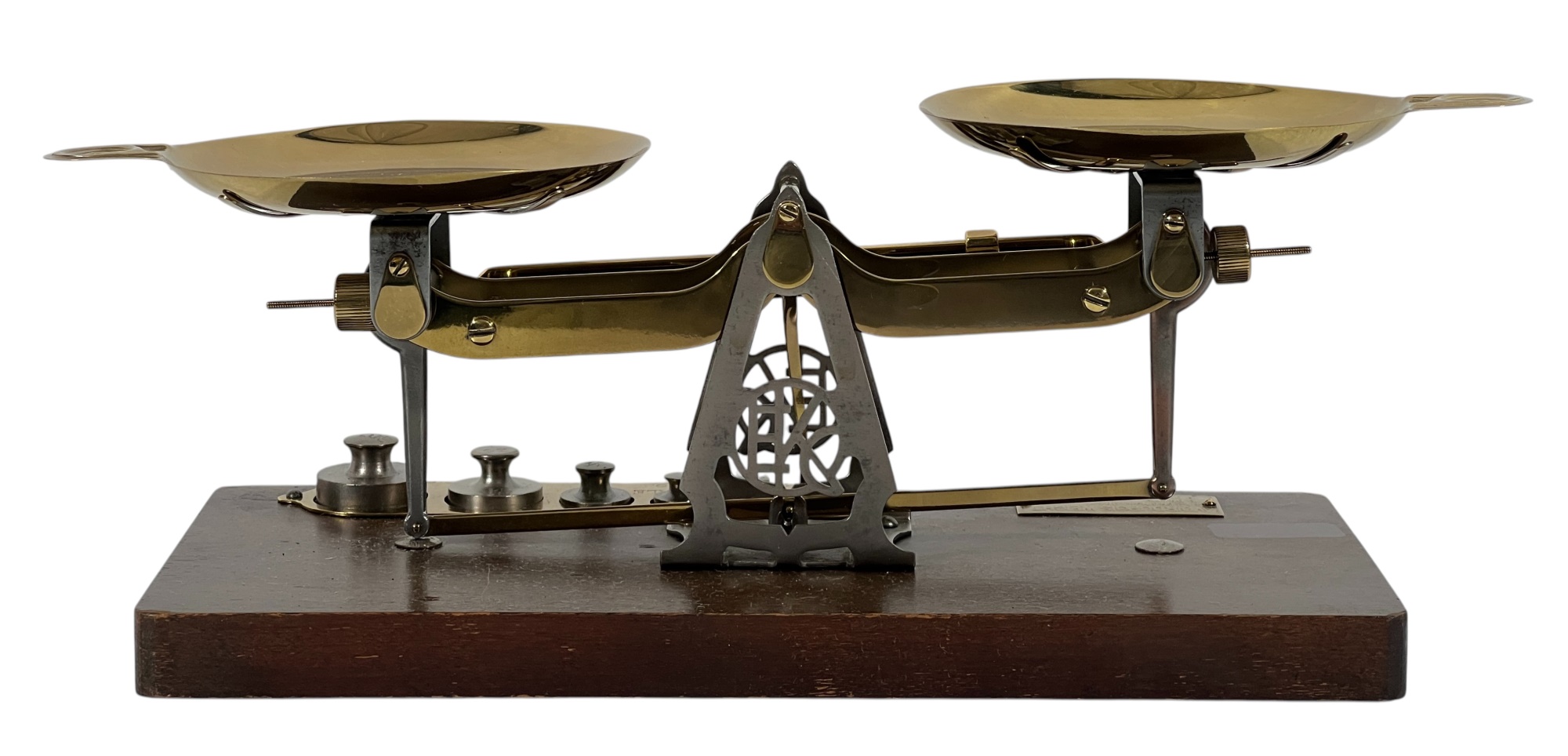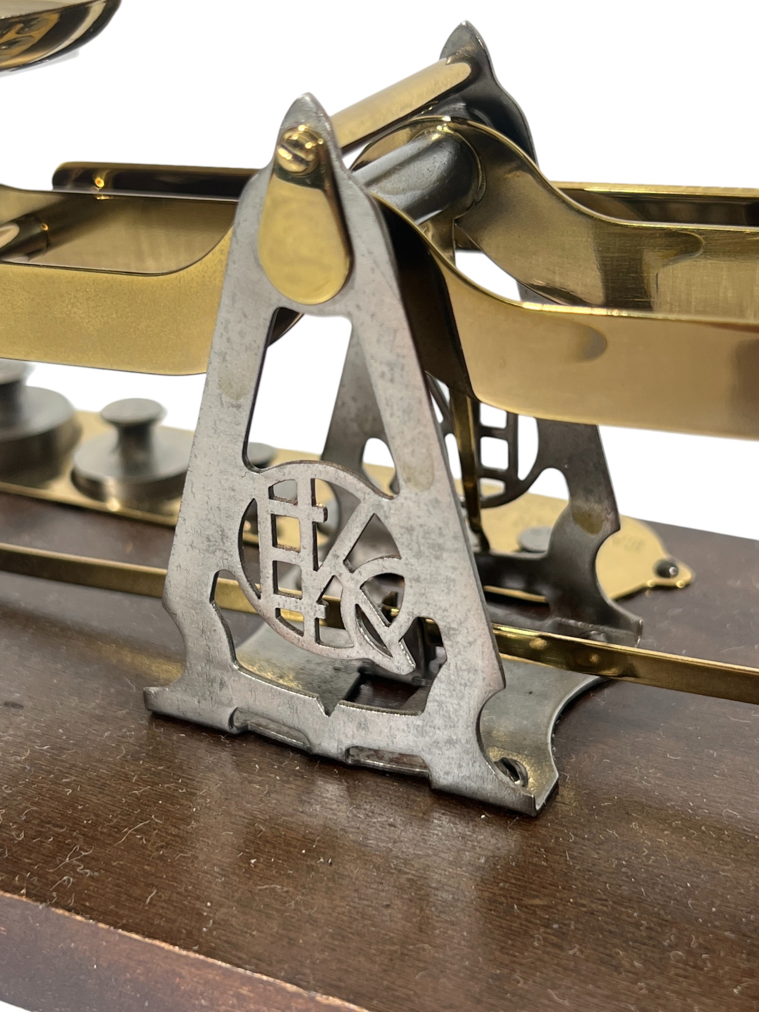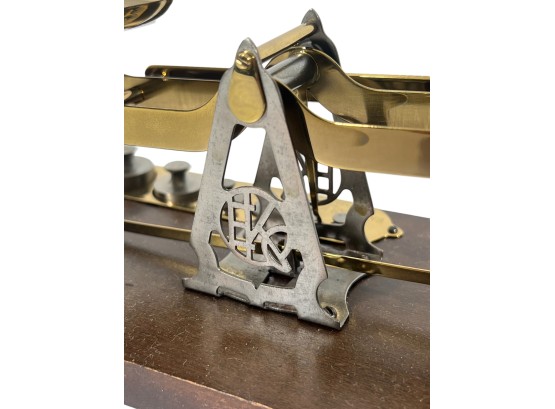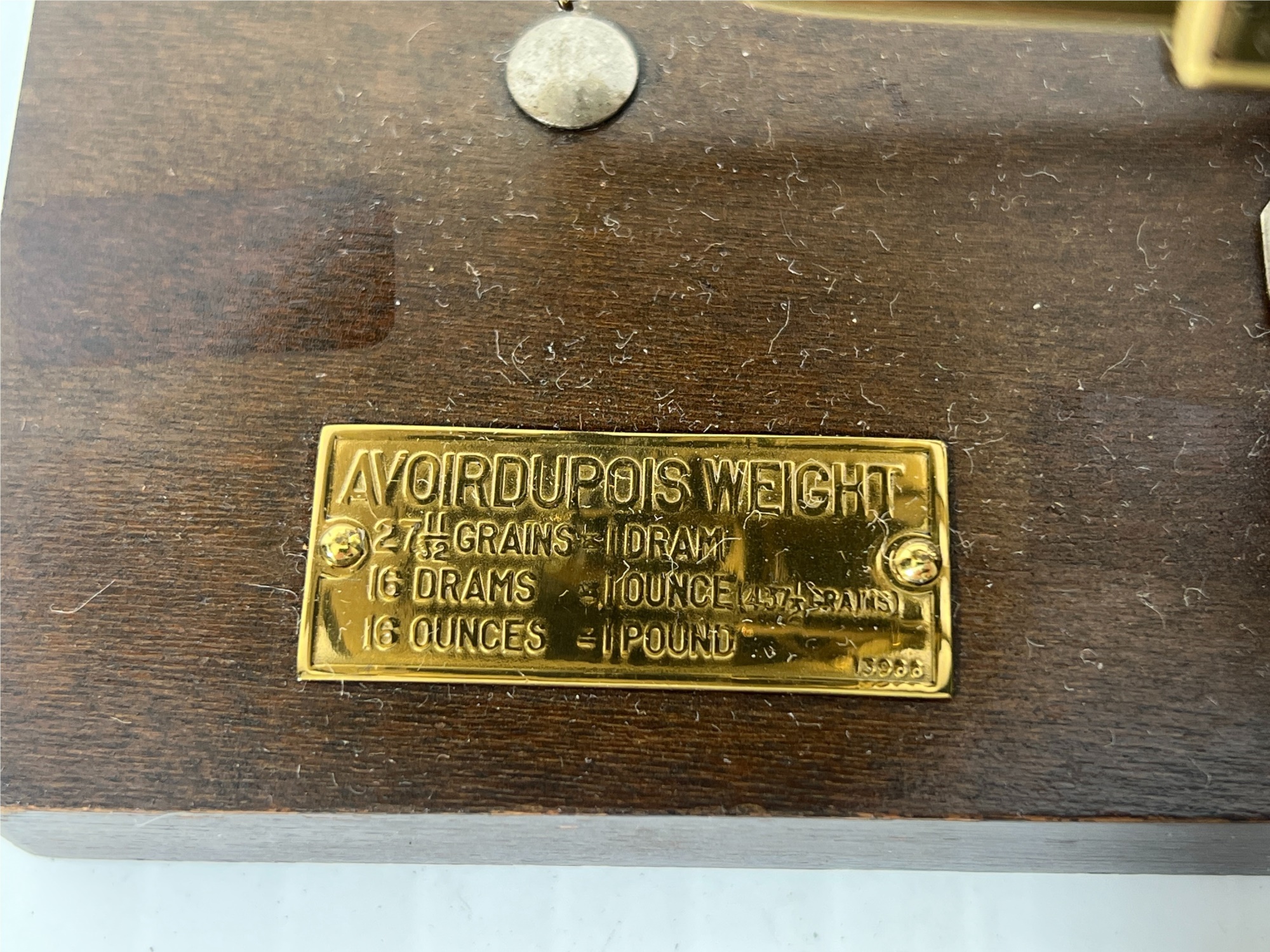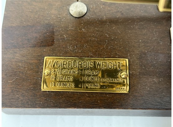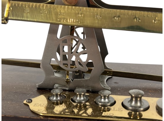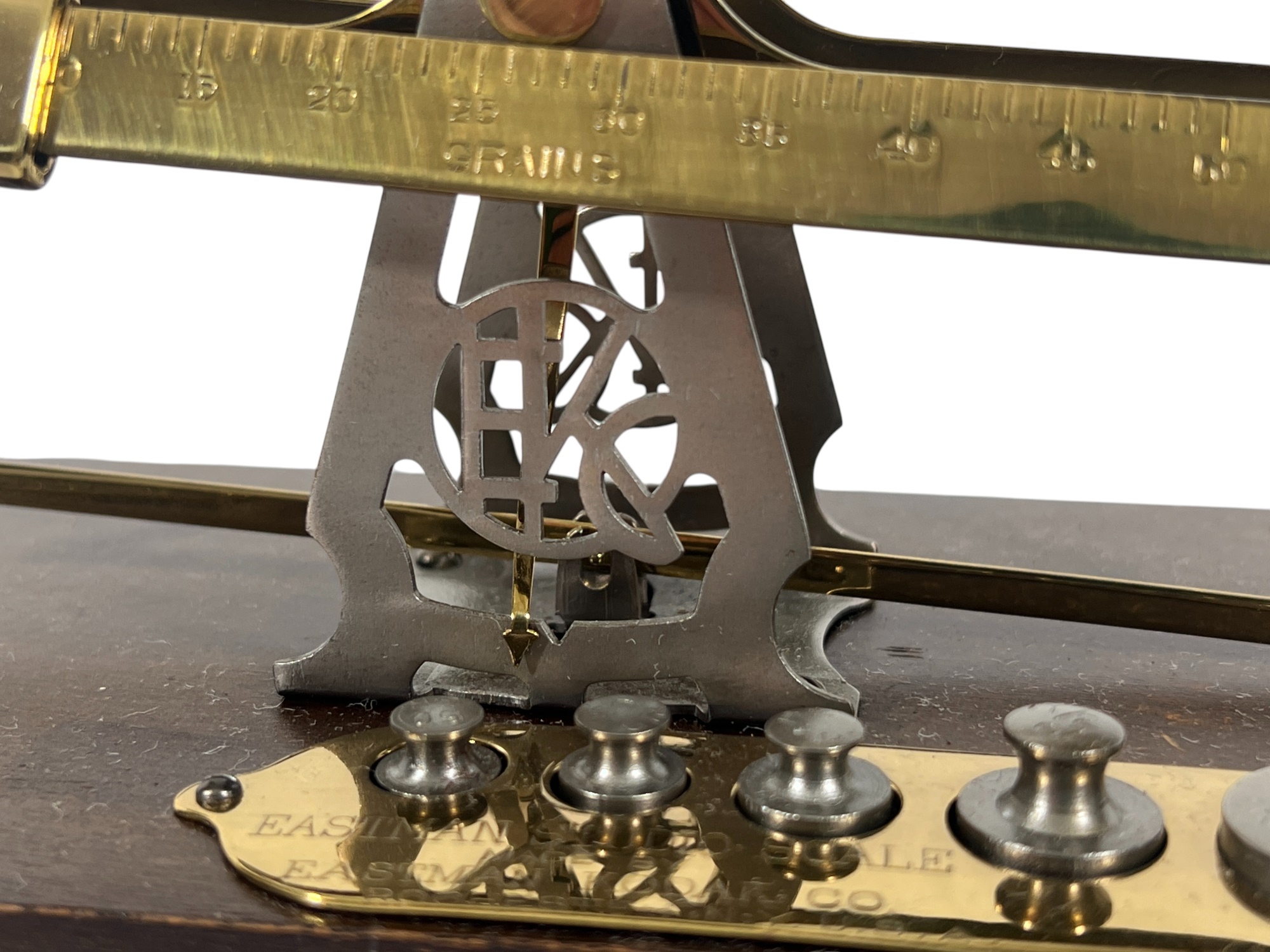 Early (20th c) Eastman Kodak Co. brass & iron studio balance scale on wooden base with weight set. Iron fulcrum pierced with Eastman Kodak logo. 4 x 9 x 4 inches. Condition: Good. Temp No 8833