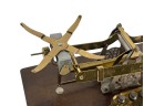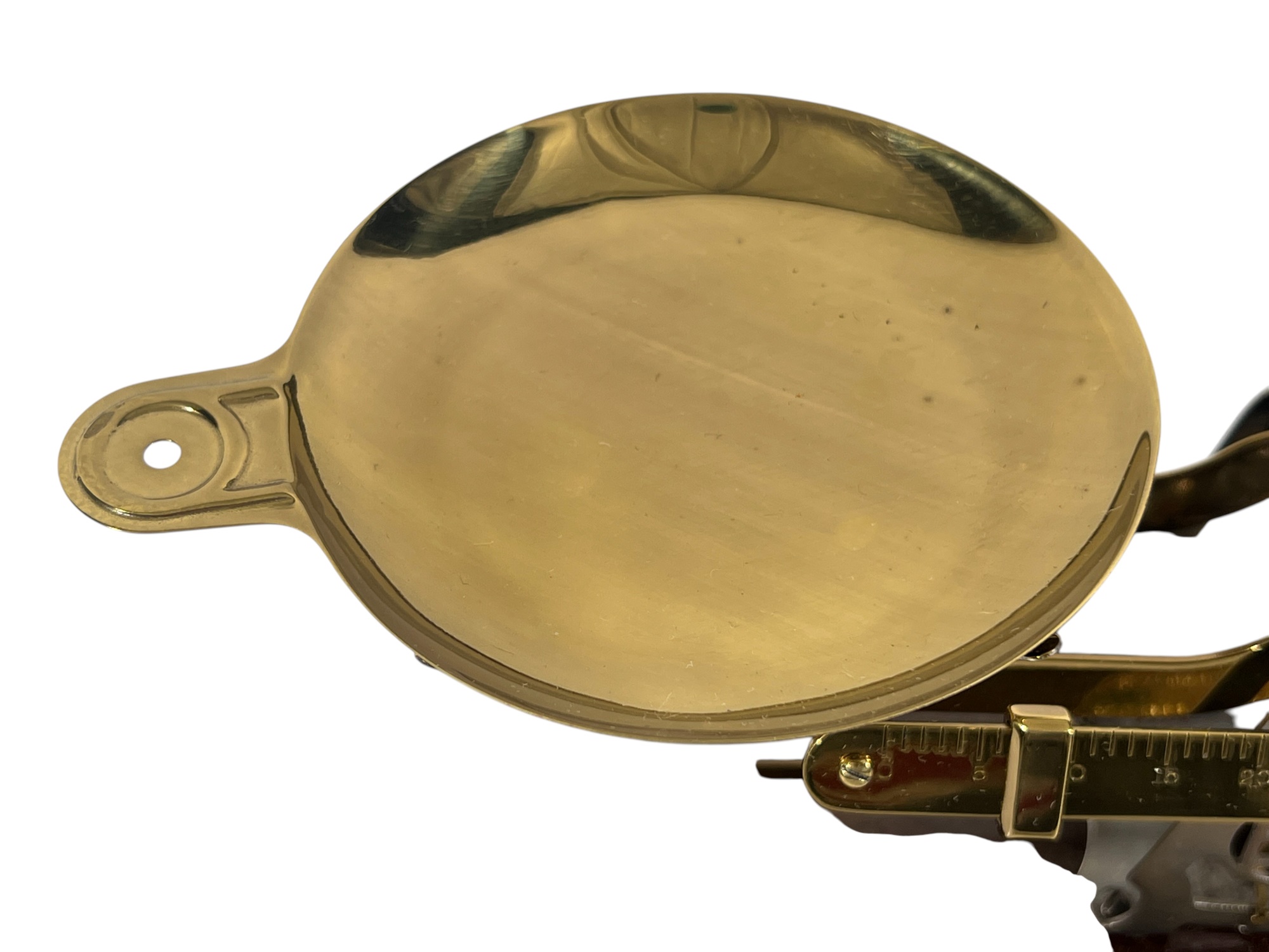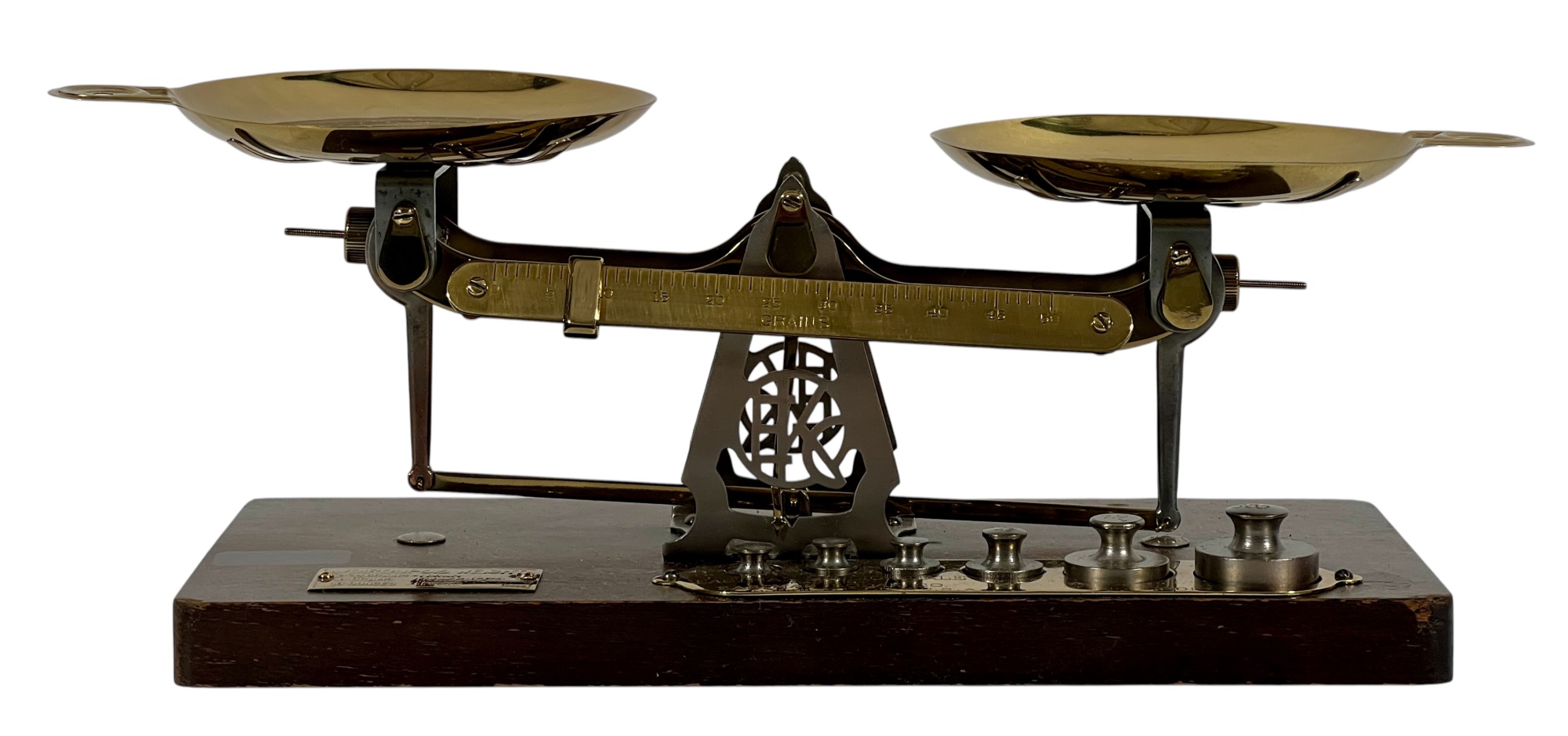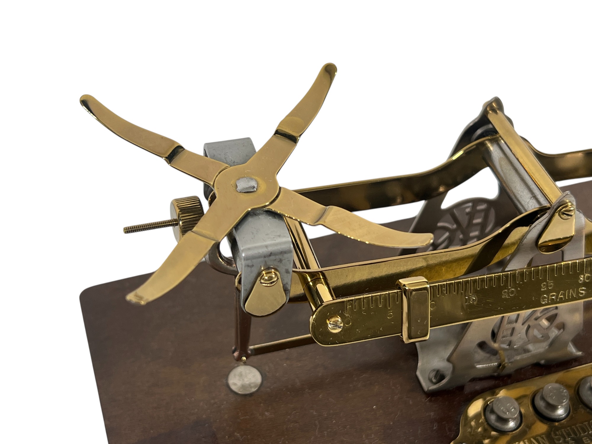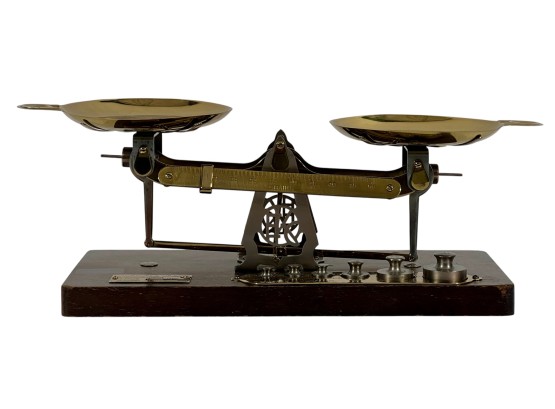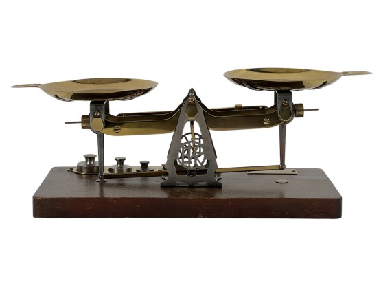Early (20th c) Eastman Kodak Co. brass & iron studio balance scale on wooden base with weight set. Iron fulcrum pierced with Eastman Kodak logo. 4 x 9 x 4 inches. Condition: Good. Temp No 8833
