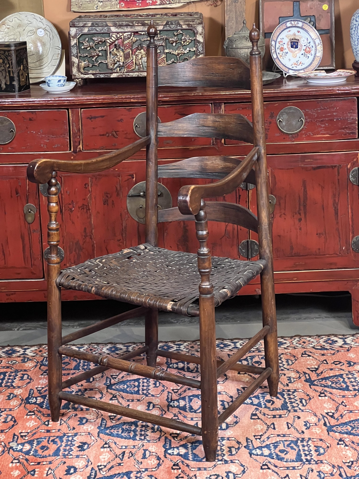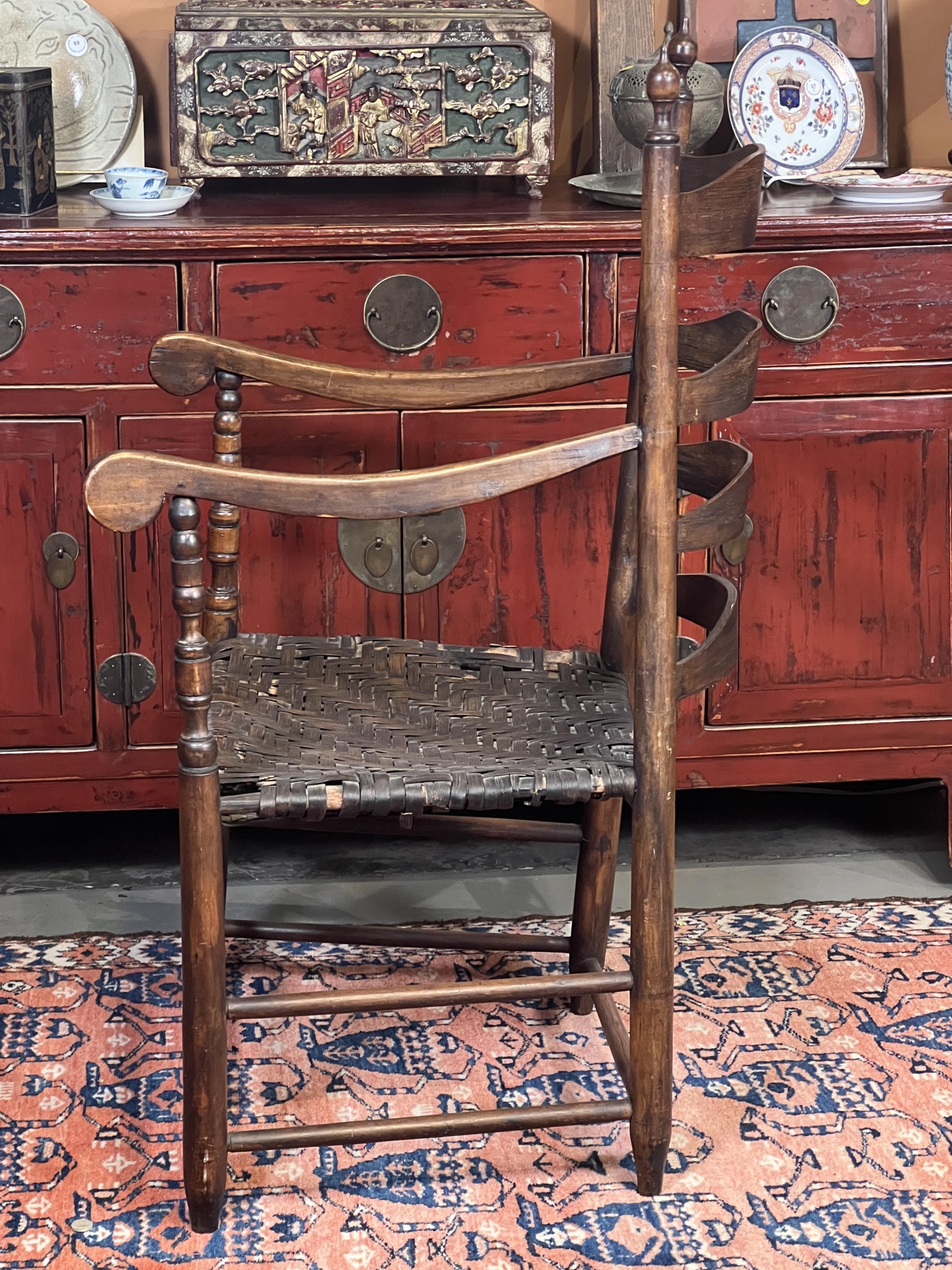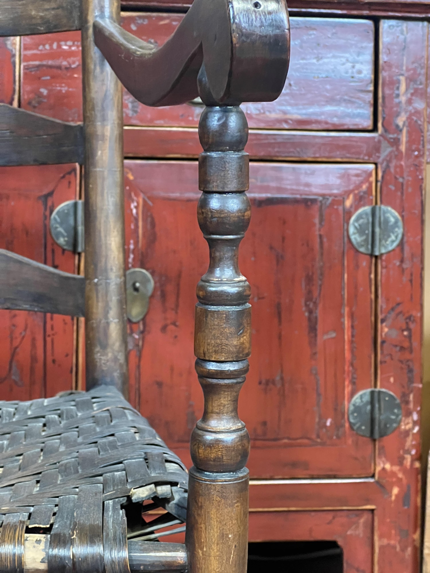 Old refinish, some losses to seat webbing. 42" x 20 1/2" x 24"