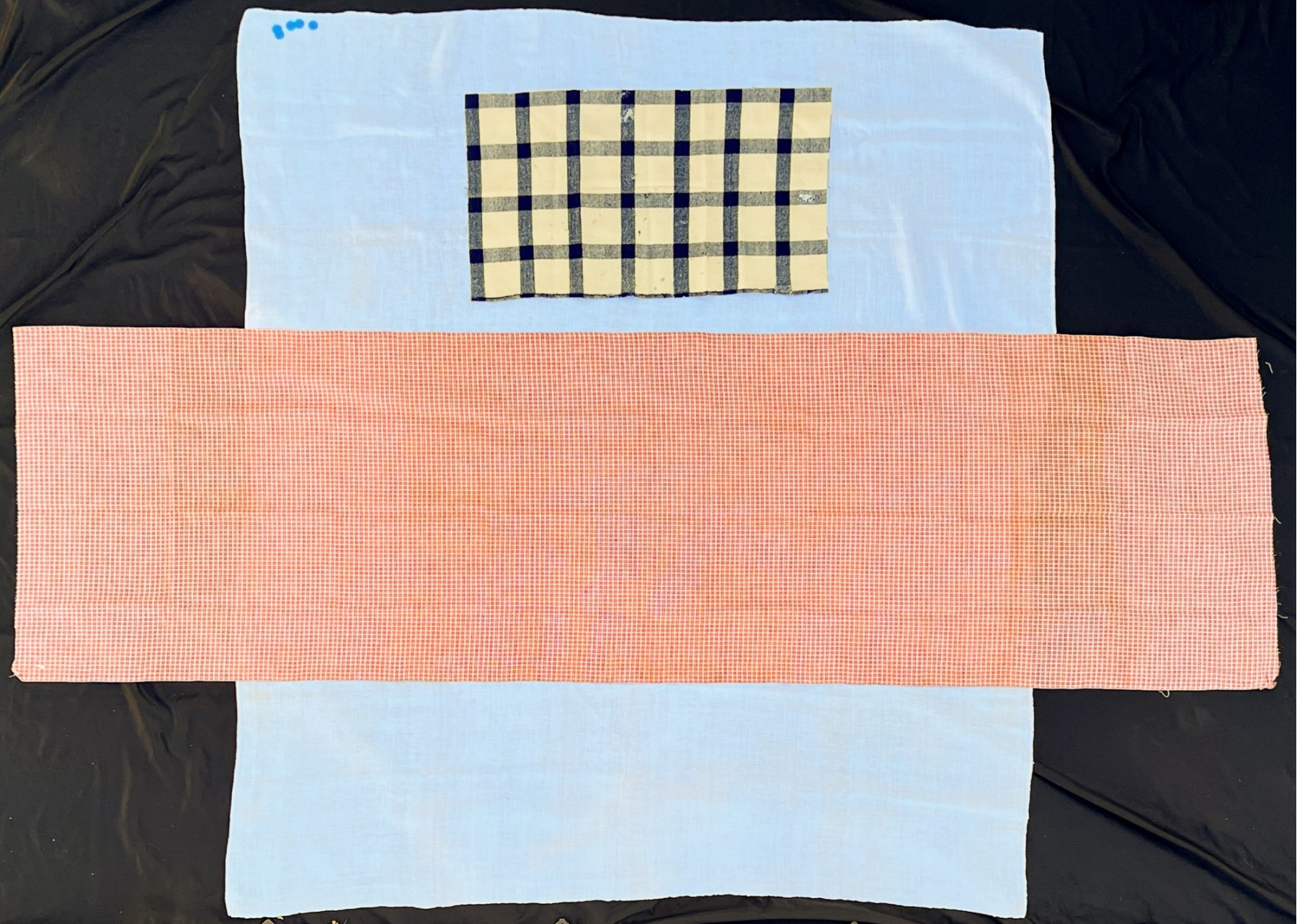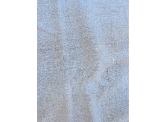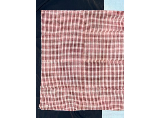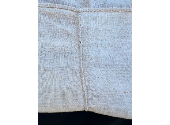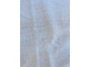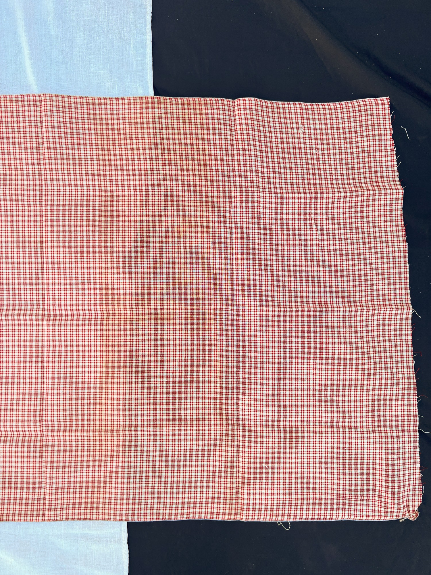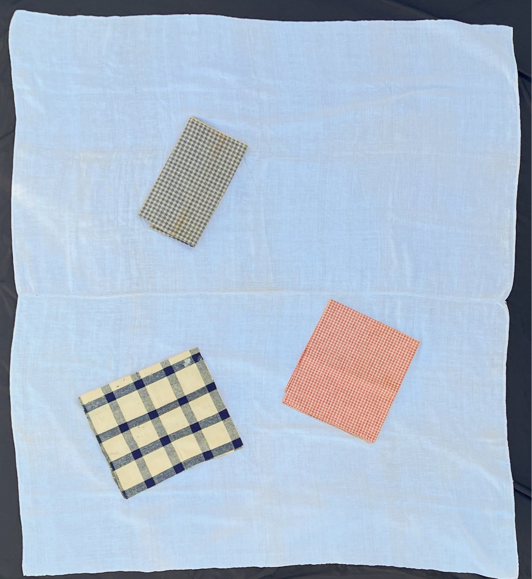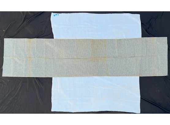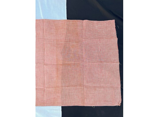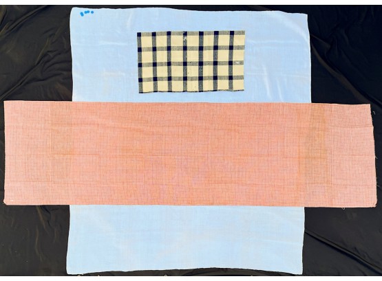 LINEN TABLE CLOTH, blue millwork fabric piece, red fabric millwork piece, and a blue and white wool fragment. Linen table cloth is approximately 70 x 60 inches with hand-stitched borders and seam.