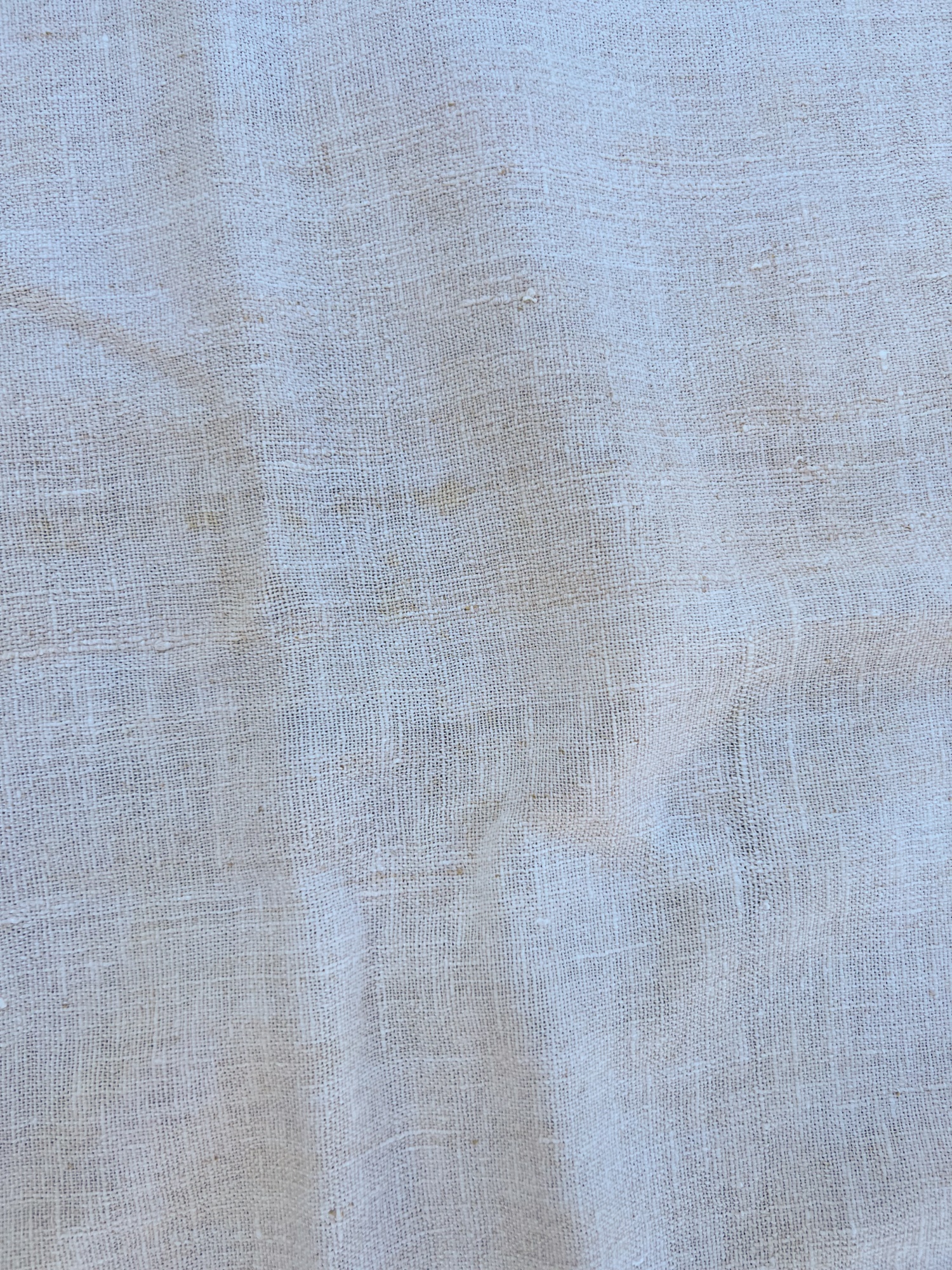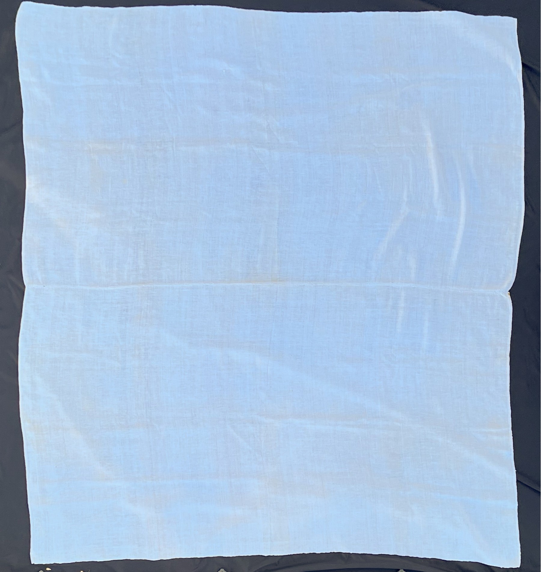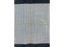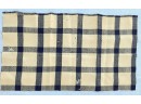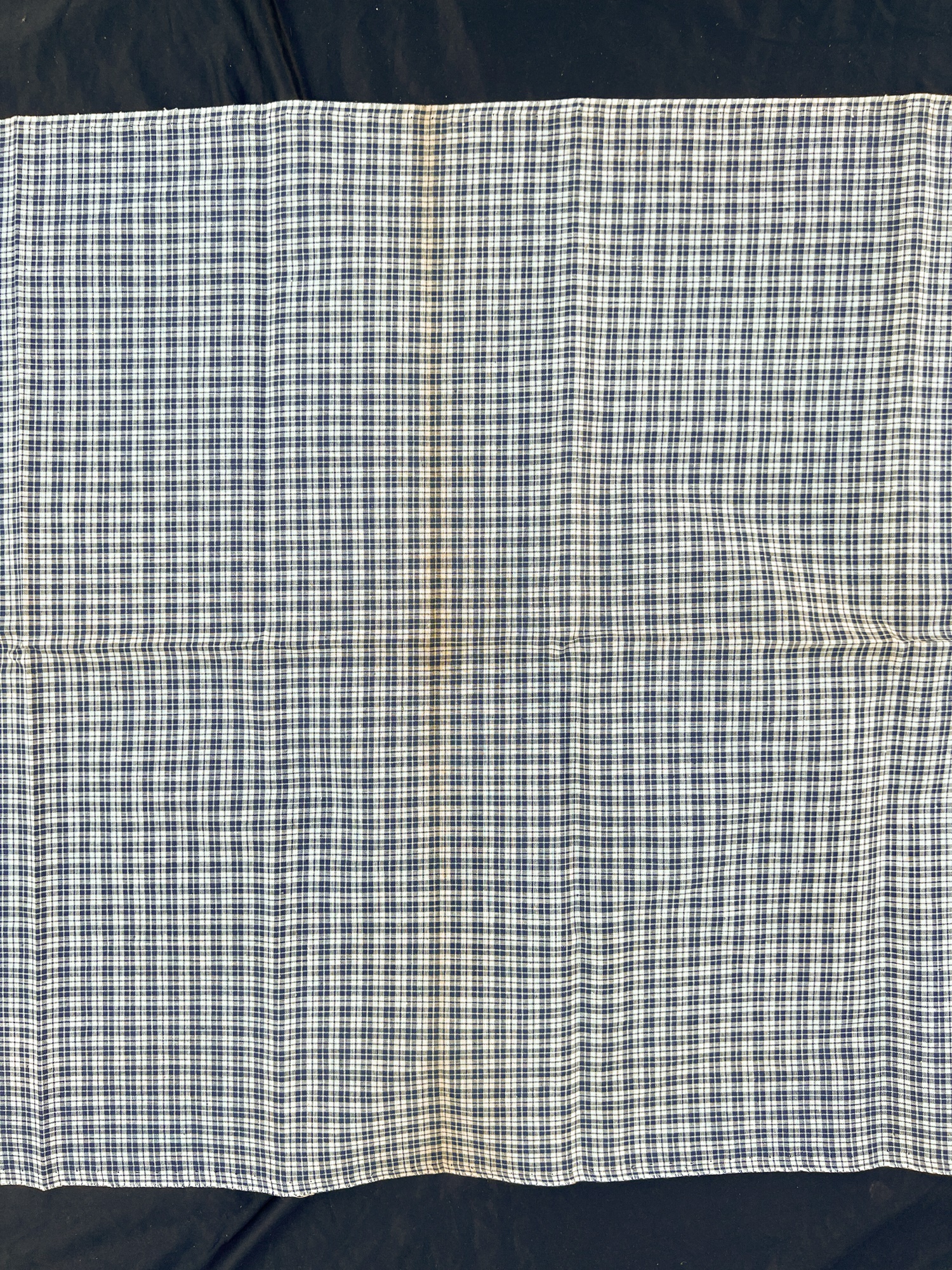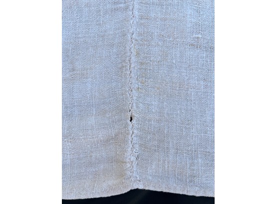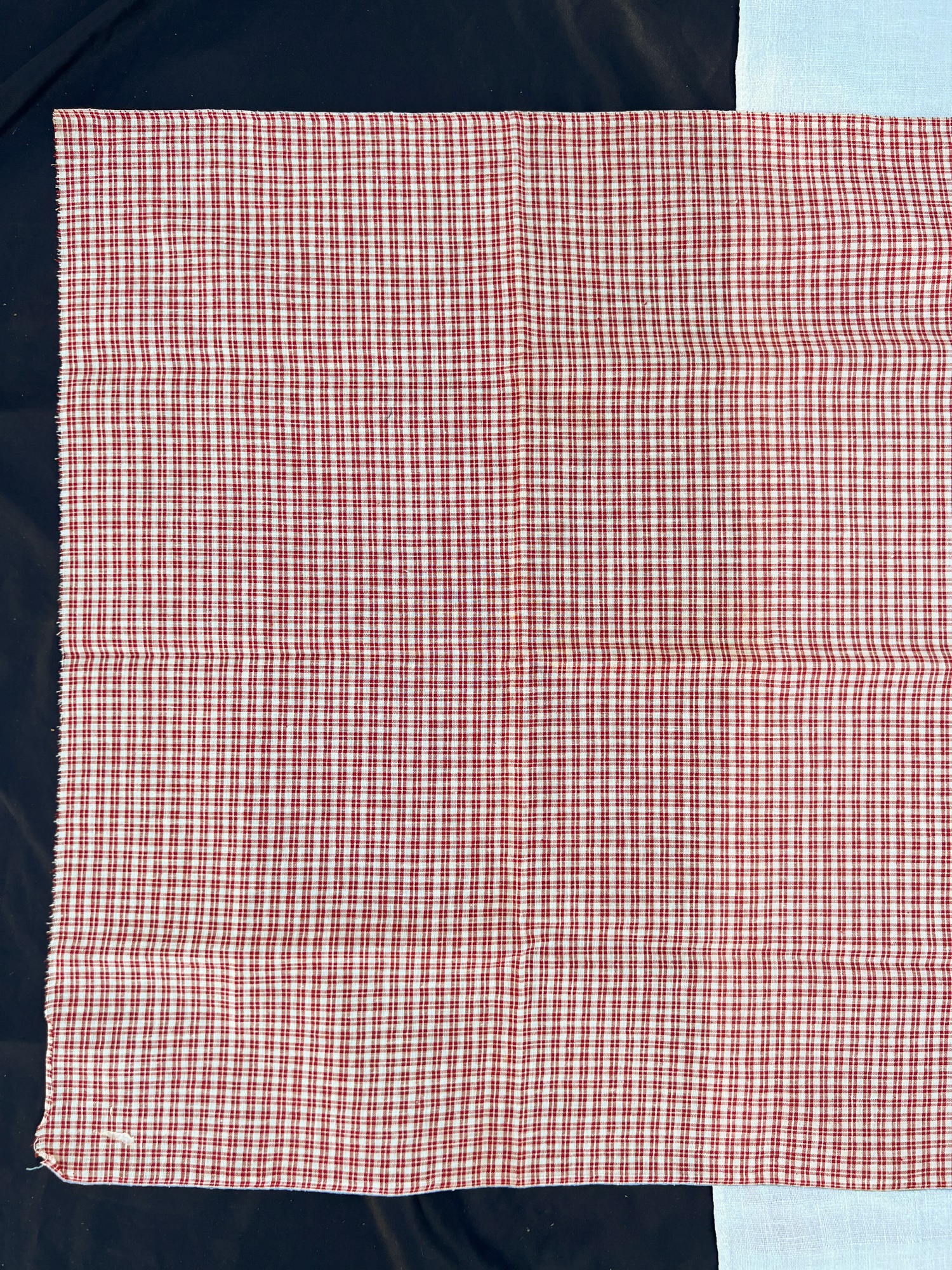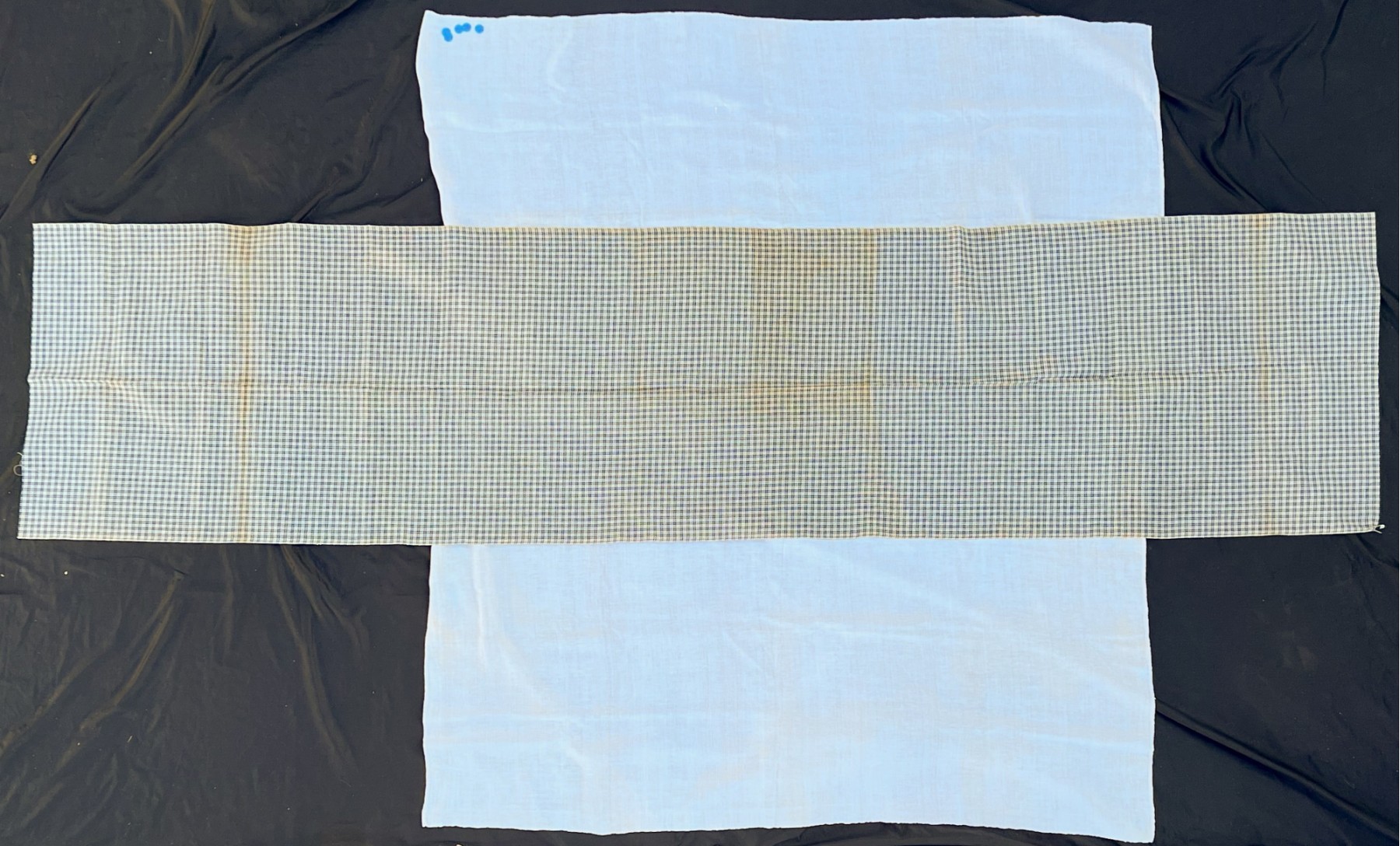 LINEN TABLE CLOTH, blue millwork fabric piece, red fabric millwork piece, and a blue and white wool fragment. Linen table cloth is approximately 70 x 60 inches with hand-stitched borders and seam.