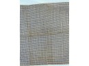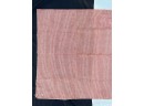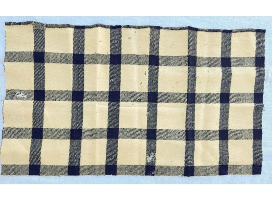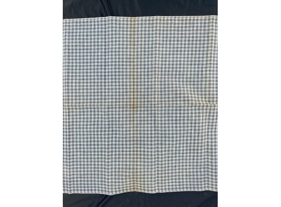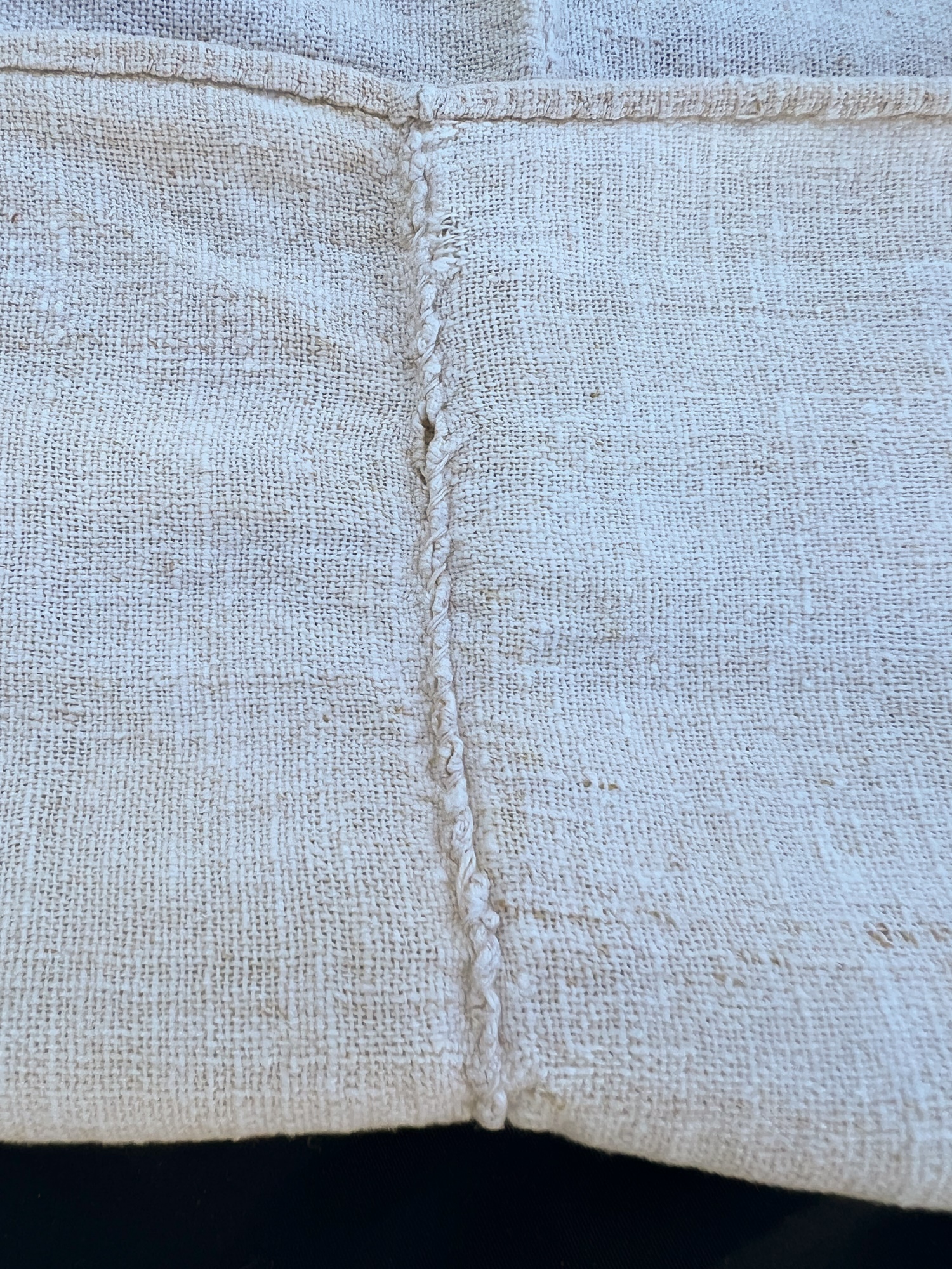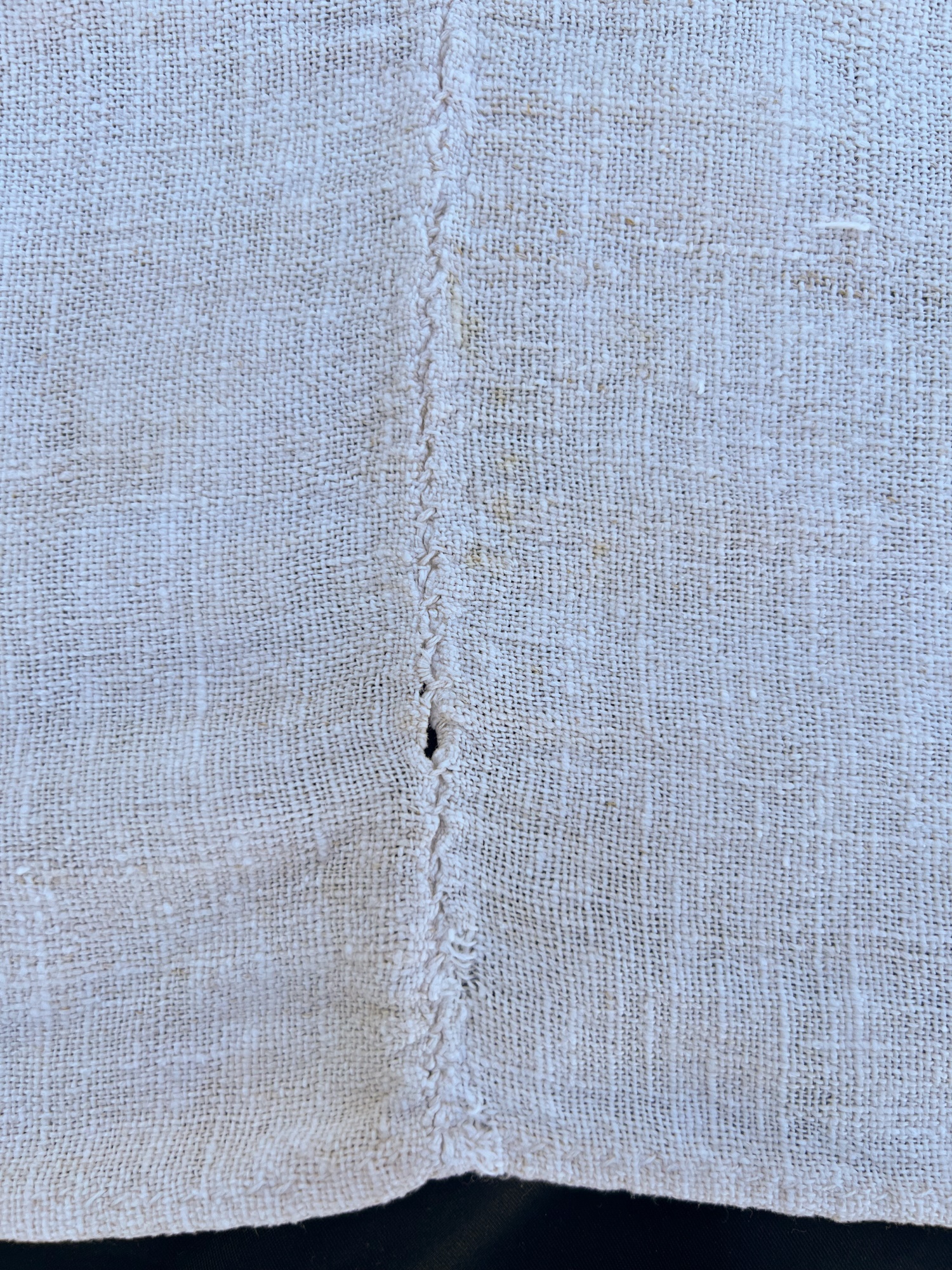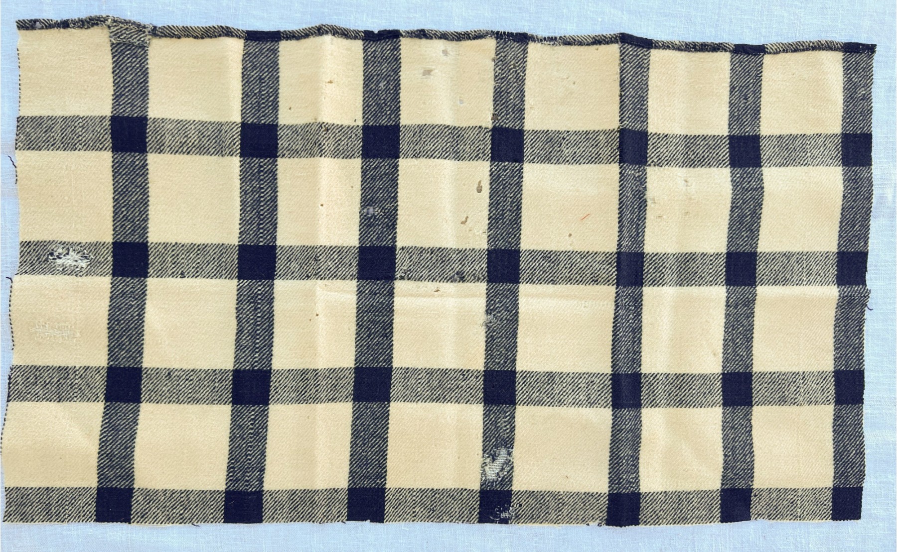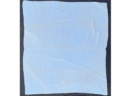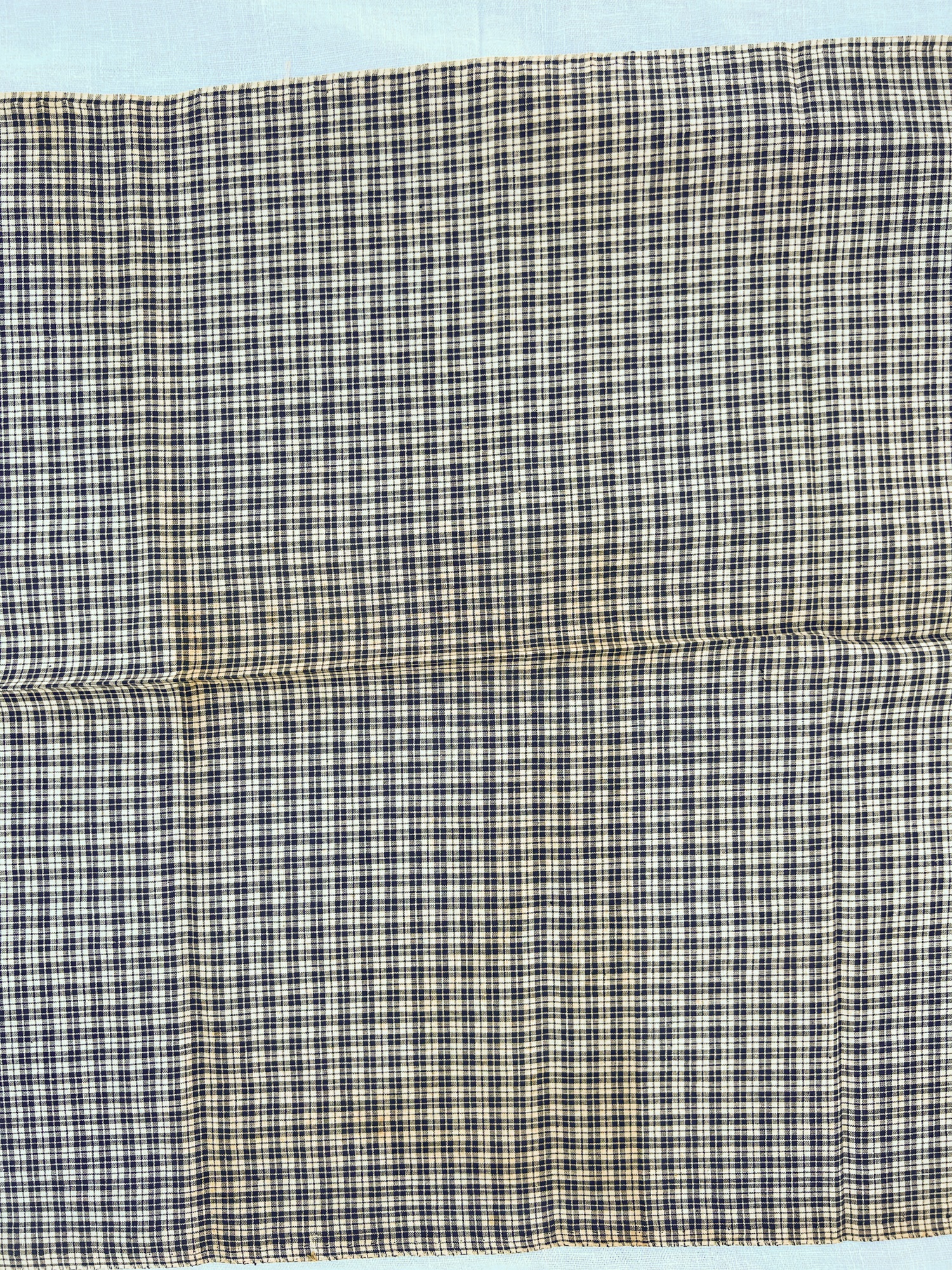 LINEN TABLE CLOTH, blue millwork fabric piece, red fabric millwork piece, and a blue and white wool fragment. Linen table cloth is approximately 70 x 60 inches with hand-stitched borders and seam.