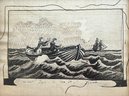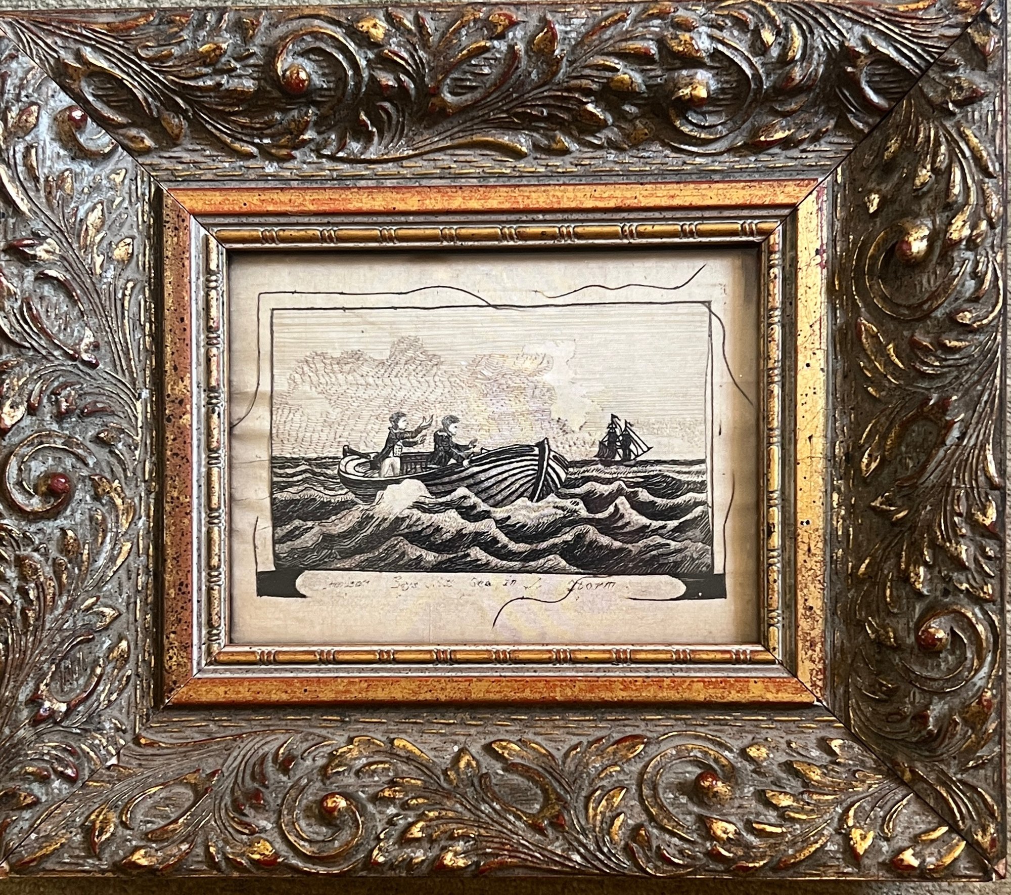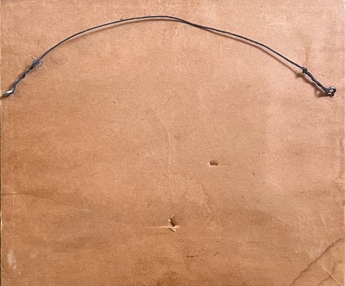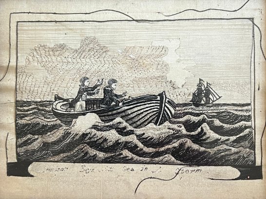 Finely embroidered on cloth. 3 x 4.5 inches. Framed 7.75 x 8.75 inches (overall)