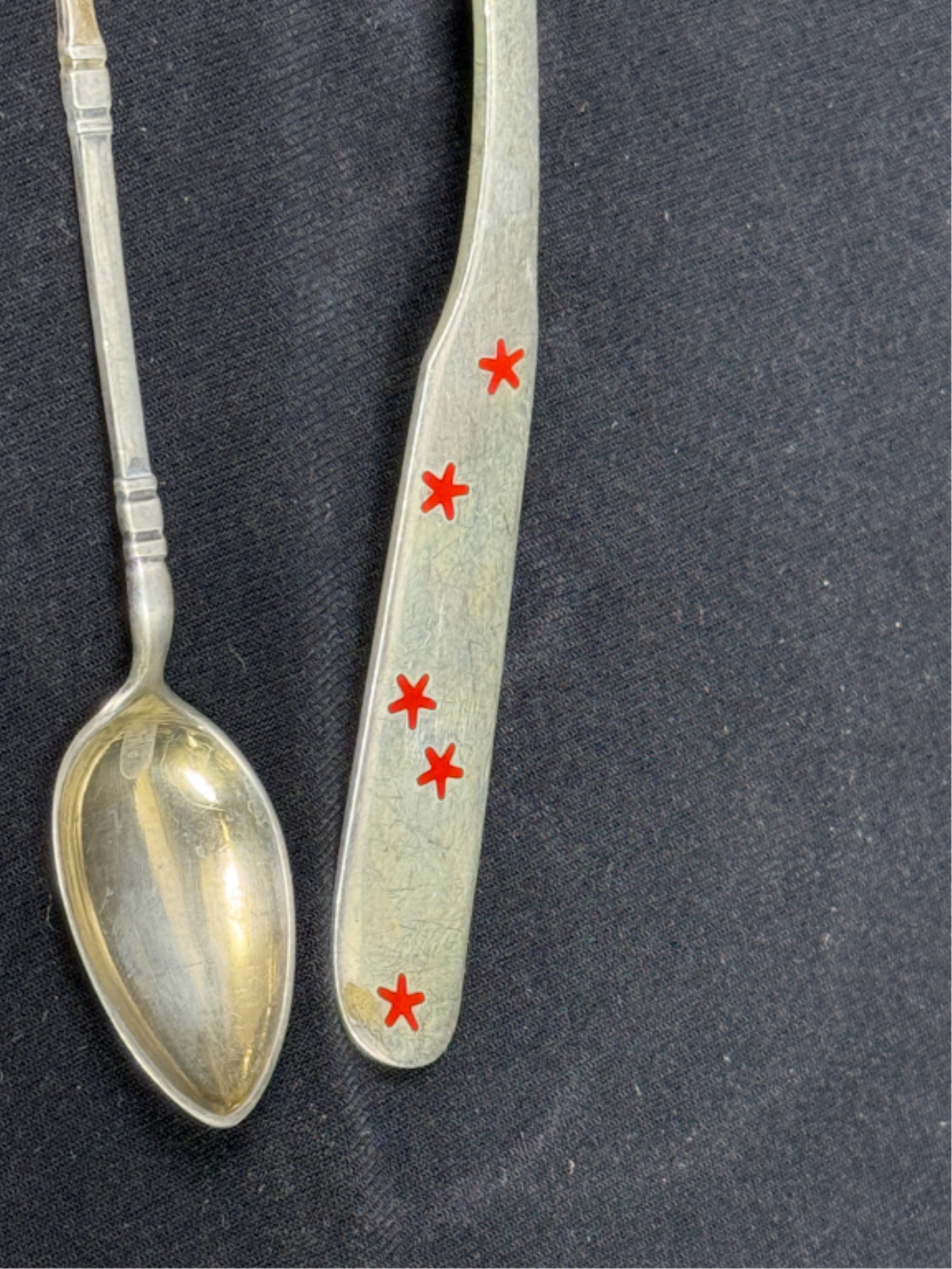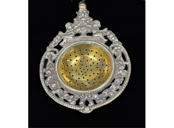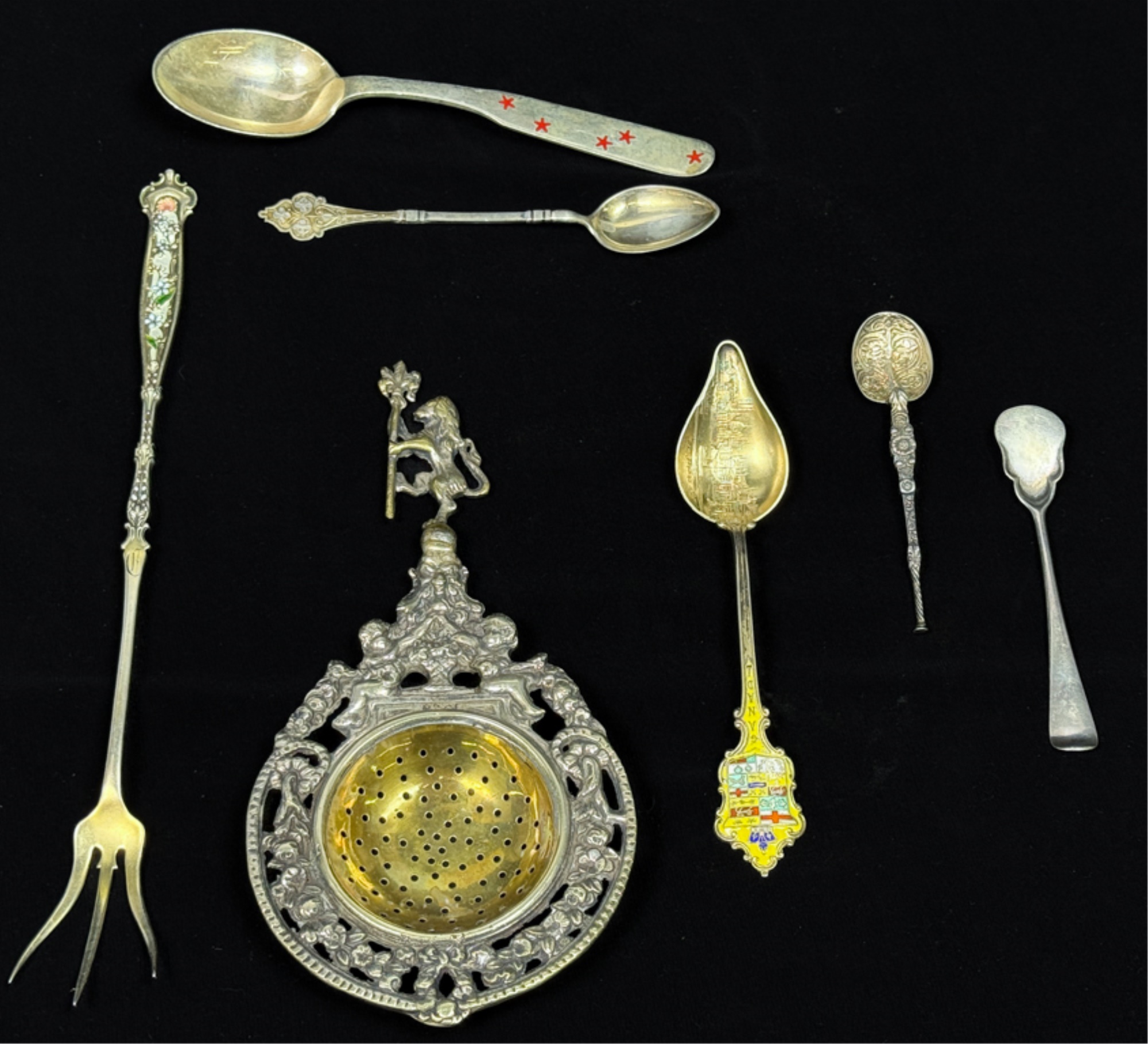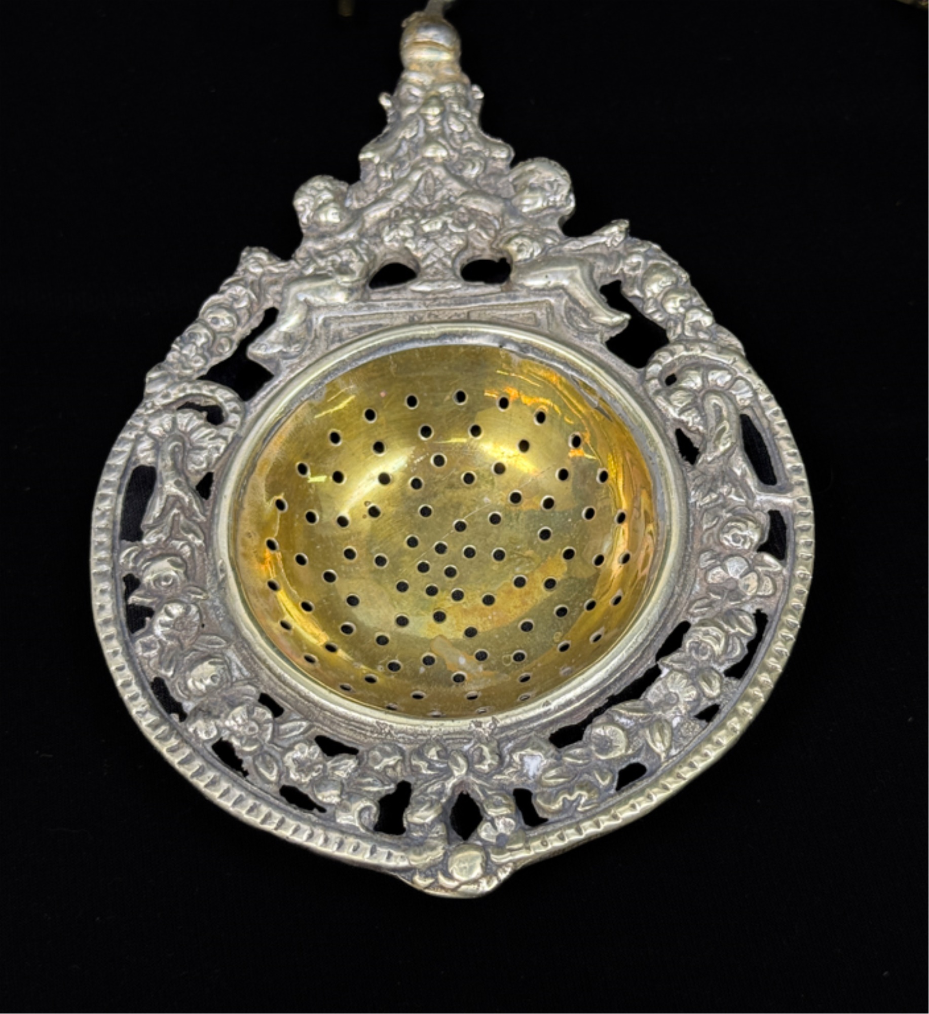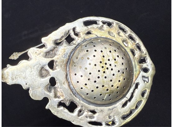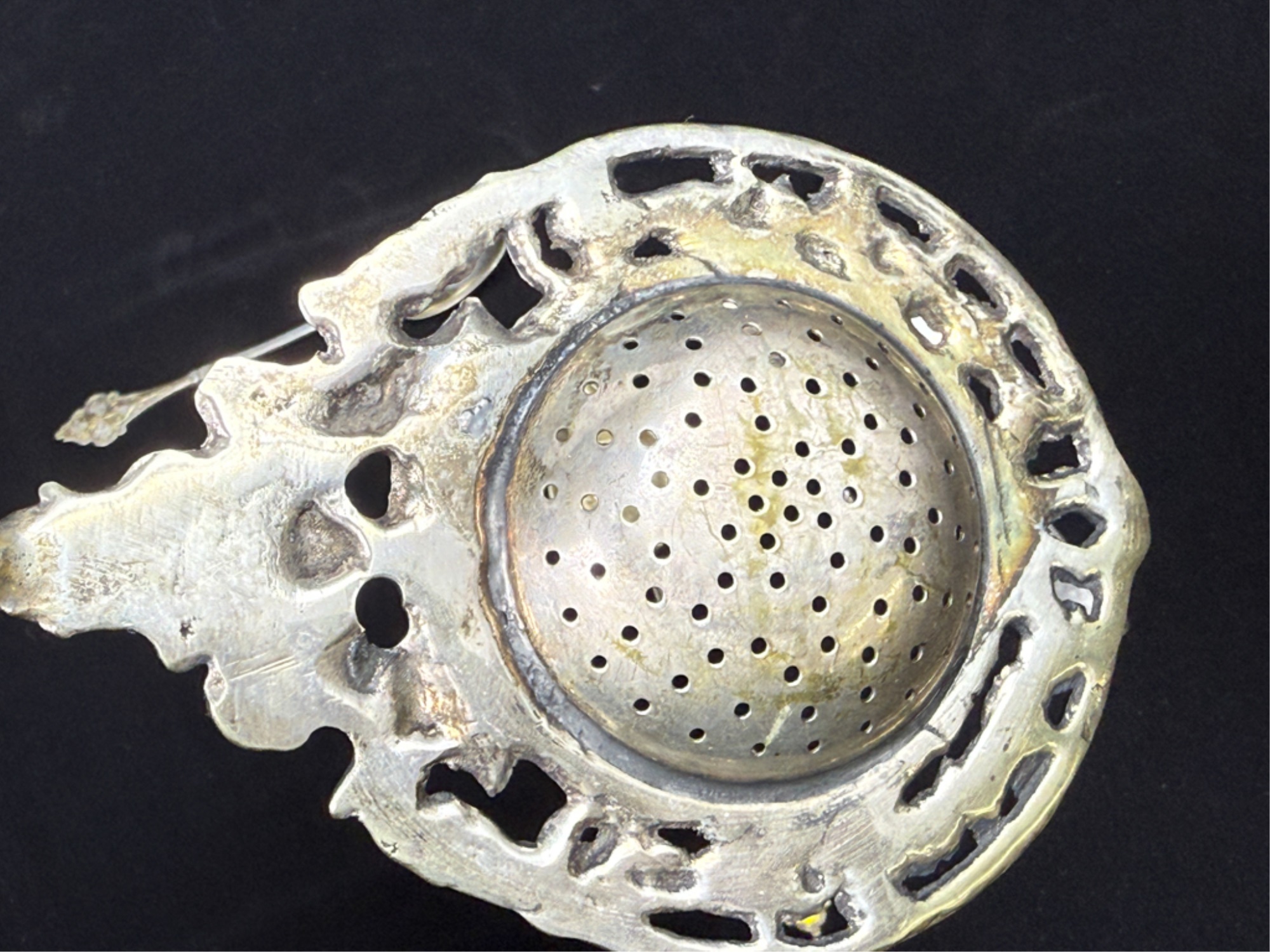 (1) 830 silver spoon, (2) spoons unmarked, strainer unmarked. 7 x 3 1/2 inches. Condition: Good. Temp No 2841