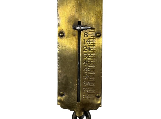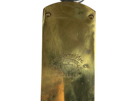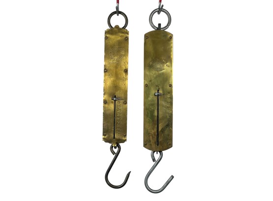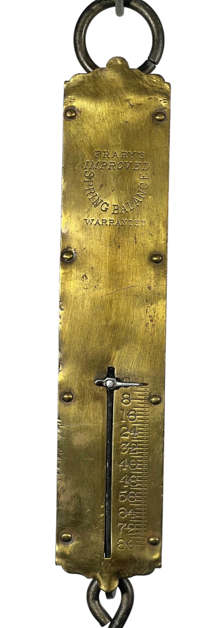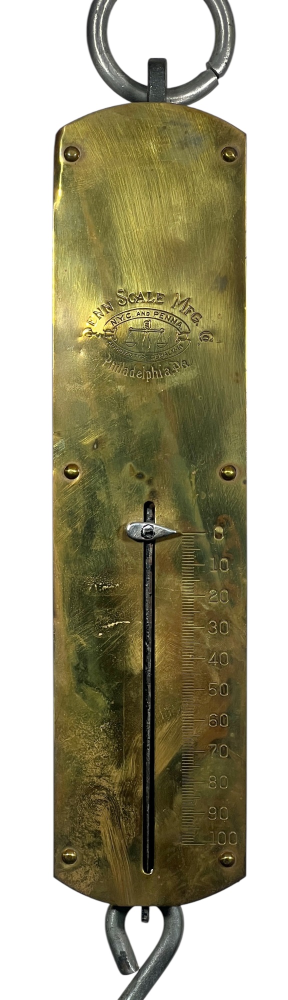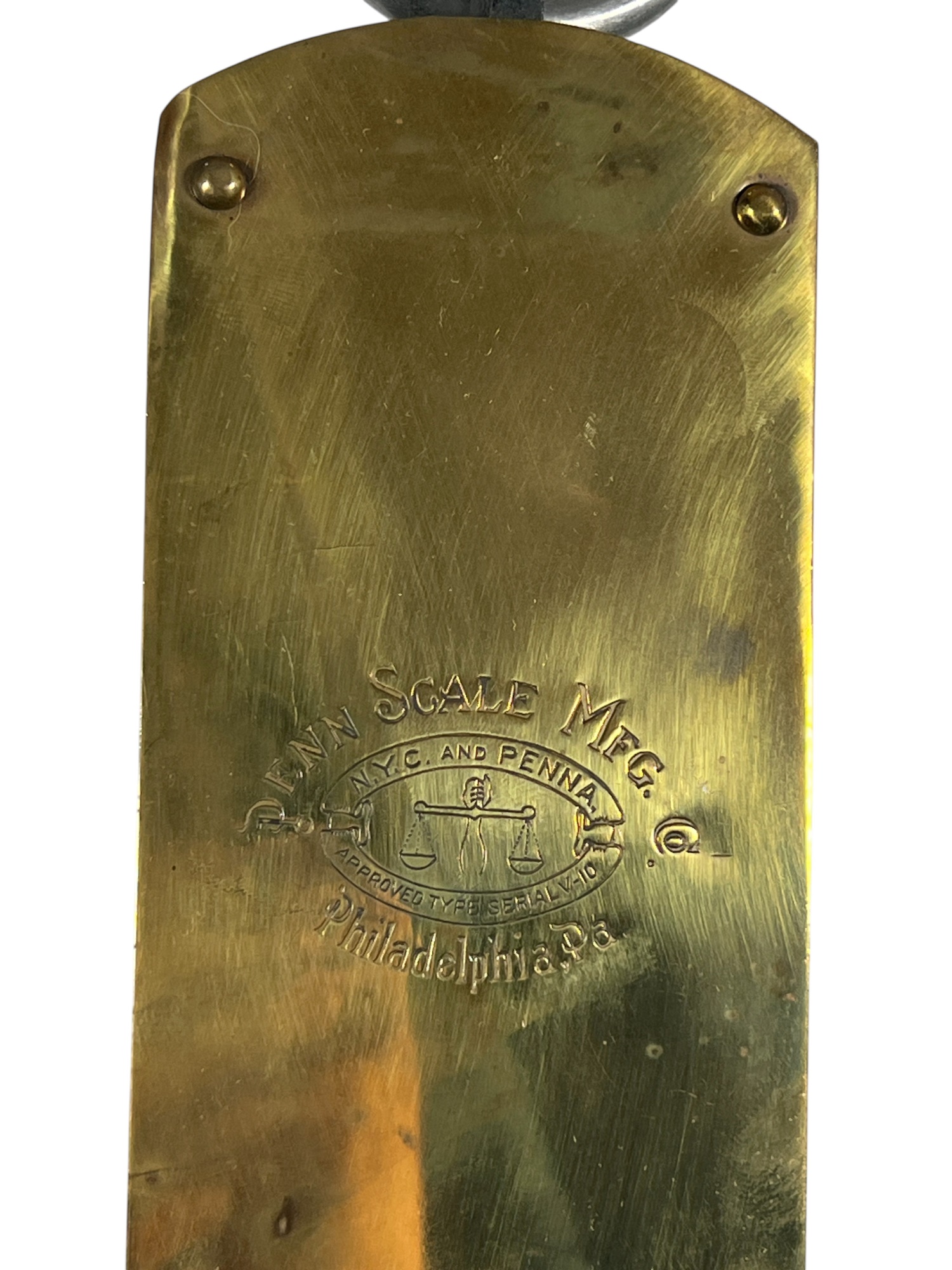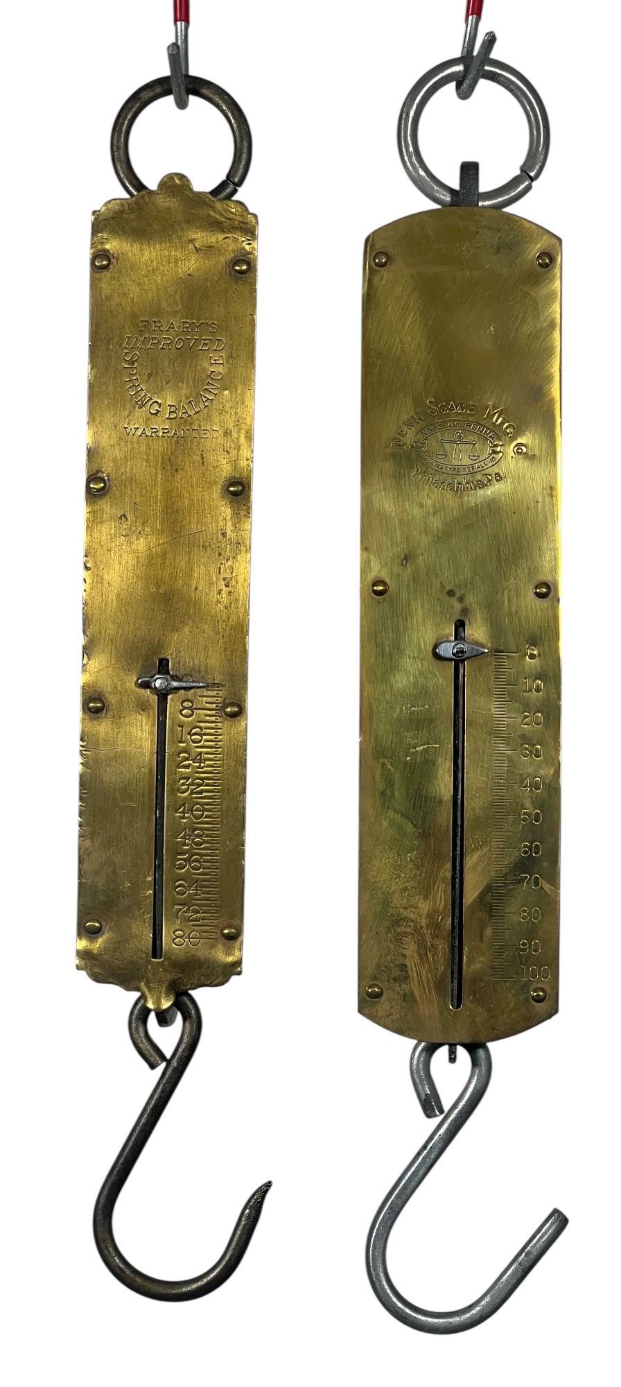 Frary's (80) pound brass & iron spring scale and Penn Scale Mfg. (100) pound brass & iron spring scale. 17 1/2 x 2 3/4 inches. Condition: Good. Temp No 8814